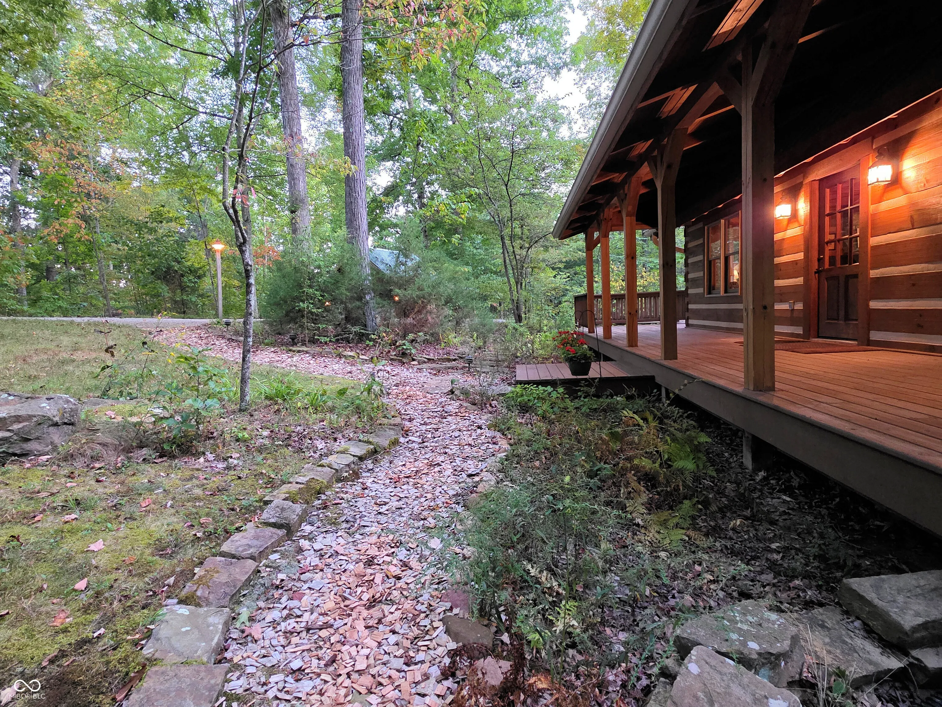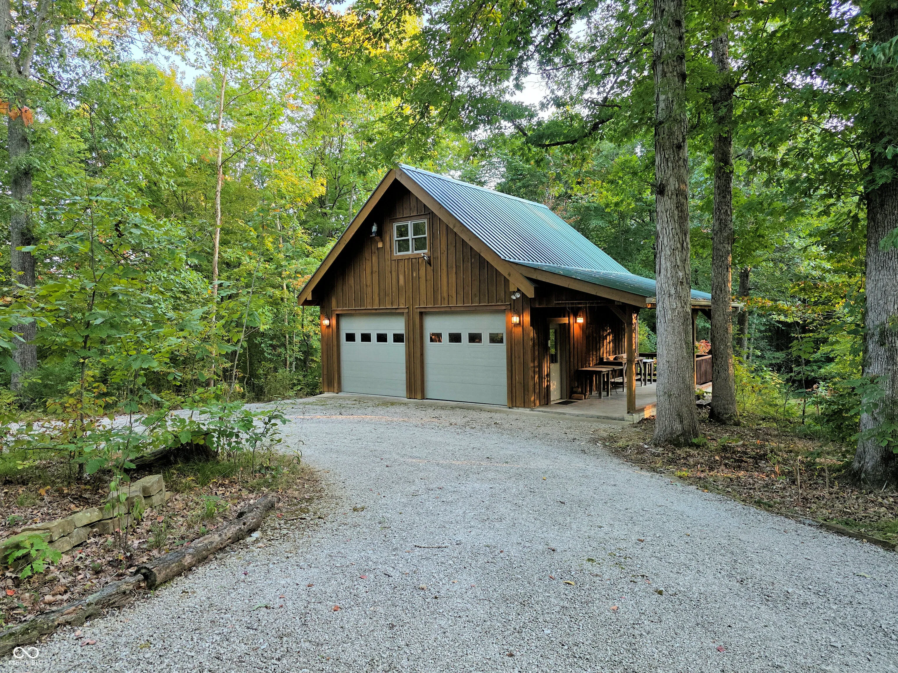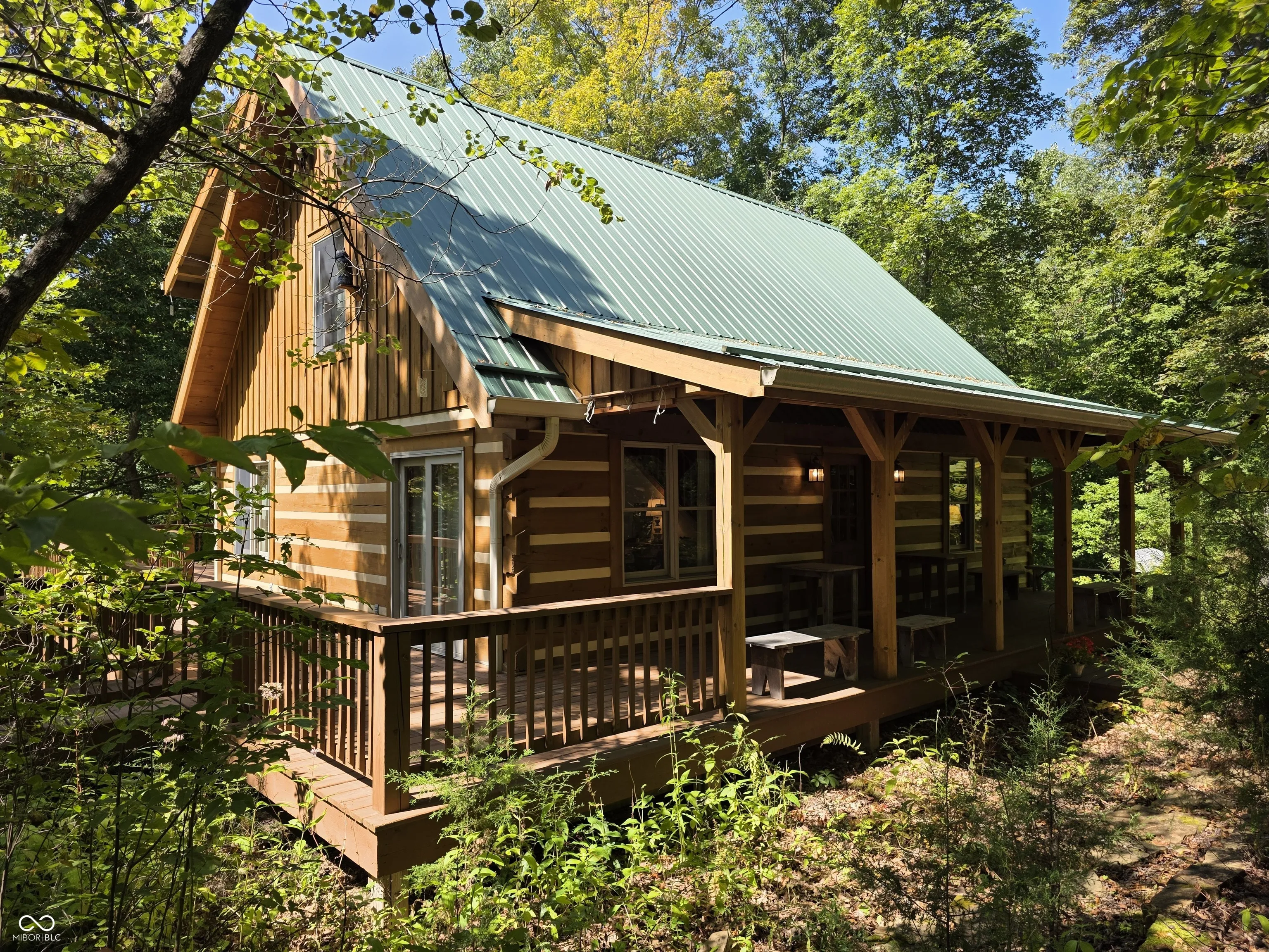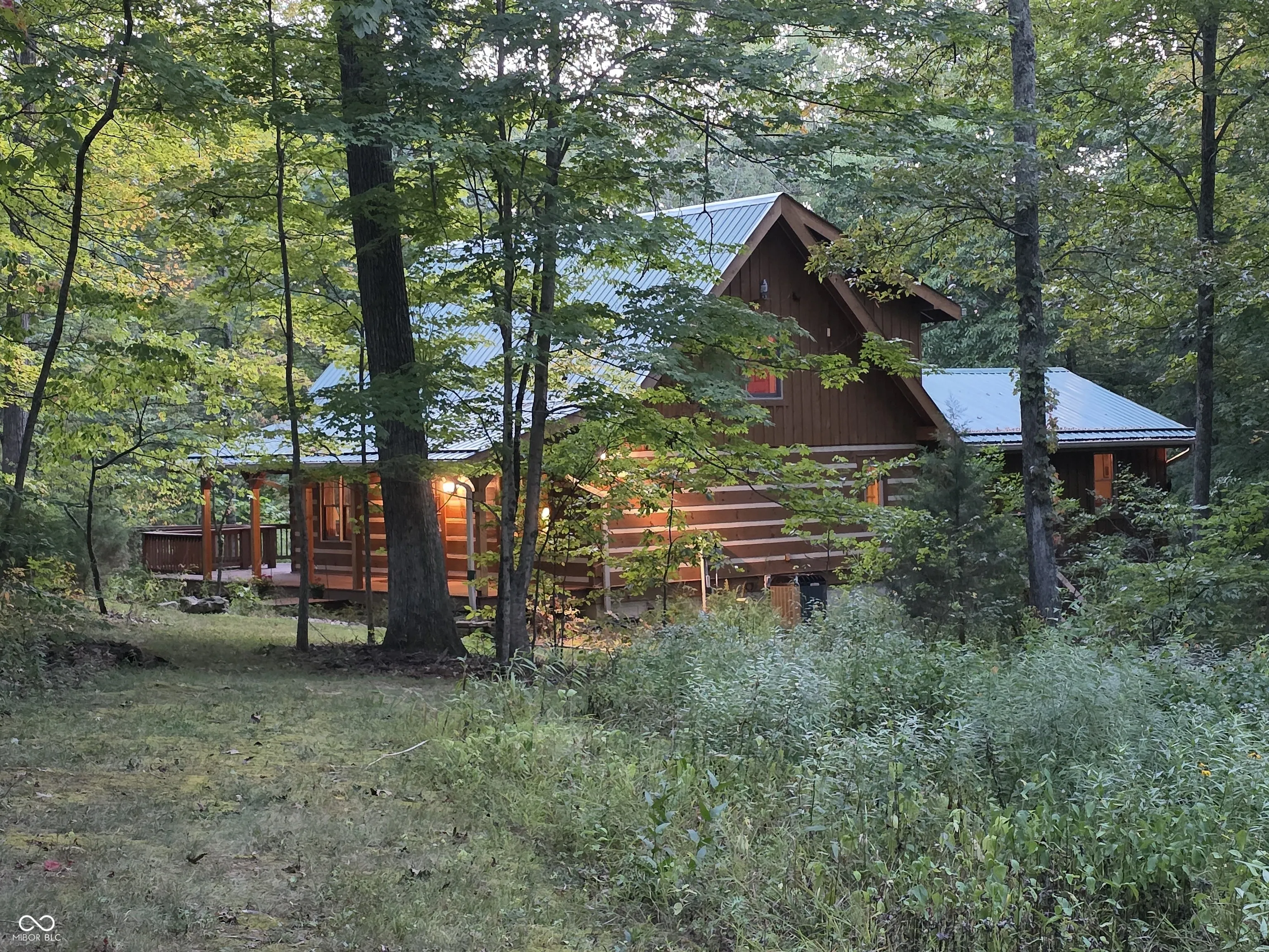 Welcome to a Brown County cabin retreat where comfort, craftsmanship, and conservation meet. This 3-bedroom, 3-bath square-log home with a metal roof is meticulously maintained and offers nearly 4,000 sq ft for relaxing or entertaining. Set on 10.71 acres on a private road, the property carries a “Classified Forest” designation that helps keep taxes low. The Seller has protected this land, planting natives, excluding invasives, and posting pollinator habitat signs to guide future stewards. There’s a circular drive to the home and a matching 24’x24′ garage with covered porch and loft storage. A pond with paths and a footbridge enhances the tranquil setting. Outdoor living includes a covered front porch for quiet mornings and expansive side decks for gatherings. Inside, the main level features an open living/dining/kitchen anchored by a Brown County Stone hearth with a gas stove. Hardwood floors, custom cabinetry, and an island with Corian countertops underscore quality. This level also includes a bedroom and a convenient laundry/full-bath combo. This original section of the cabin provides stairs to both the second floor and another to the finished basement. Upstairs, the primary suite’s bath also opens to the hall, serving the second bedroom. Both upper-level bedrooms have vaulted ceilings. In the back addition, you’ll find a light-filled family room with a beamed ceiling, windows, and deck access, a generous kitchenette/bar with custom cabinetry and Corian counters with plenty of room for a game table or extra dining. Stairs here also lead to the beautifully finished walk-out lower level. This poured-concrete basement is clean and dry, with a large family room, a guest area with a full bath, and an oversized utility room for mechanicals. From top to bottom, the home shows extraordinary care. Beyond the pristine walls, the land tells a story of stewardship and respect for nature, ready for new owners who will cherish both the home and the habitat it protects.