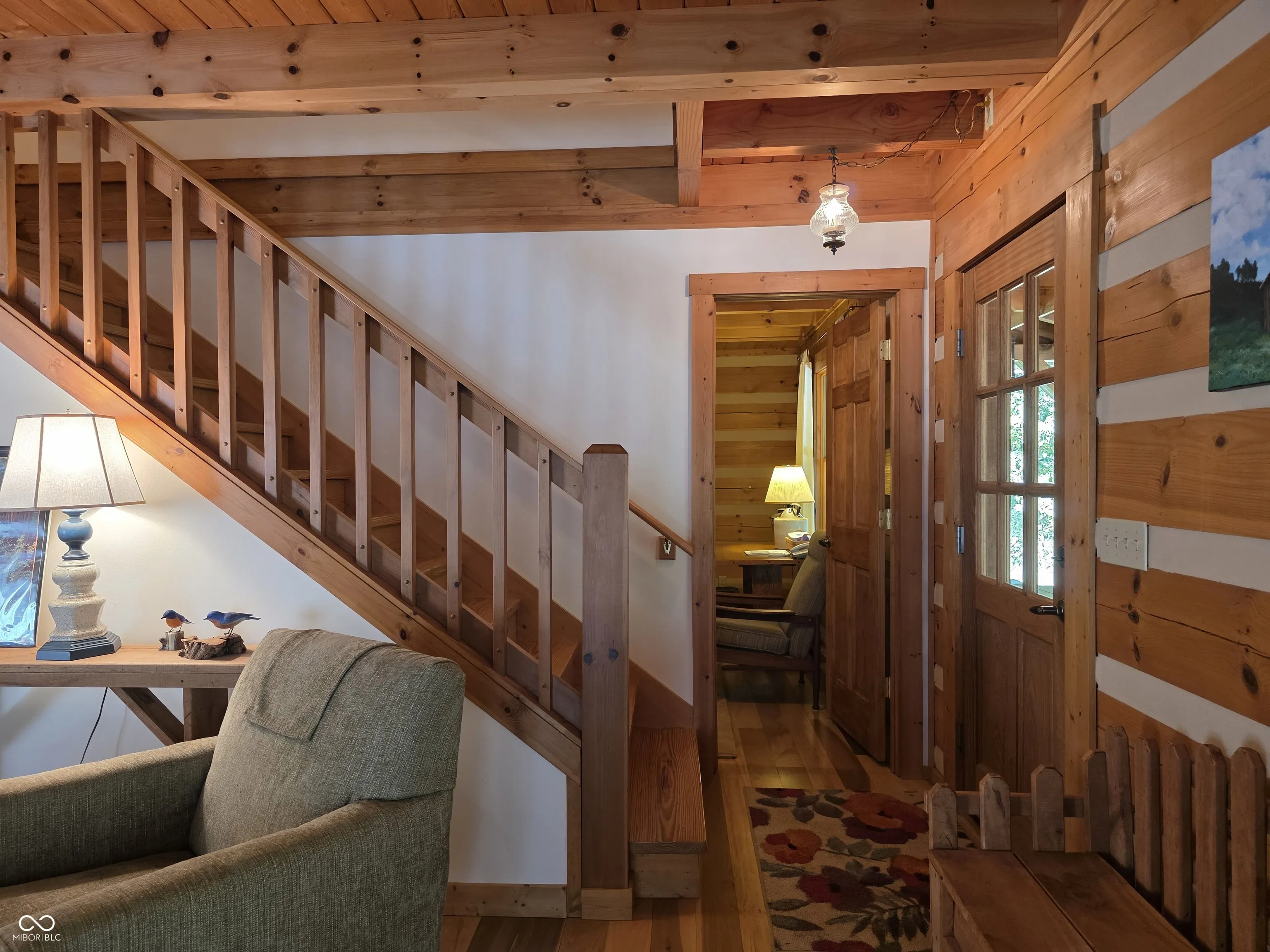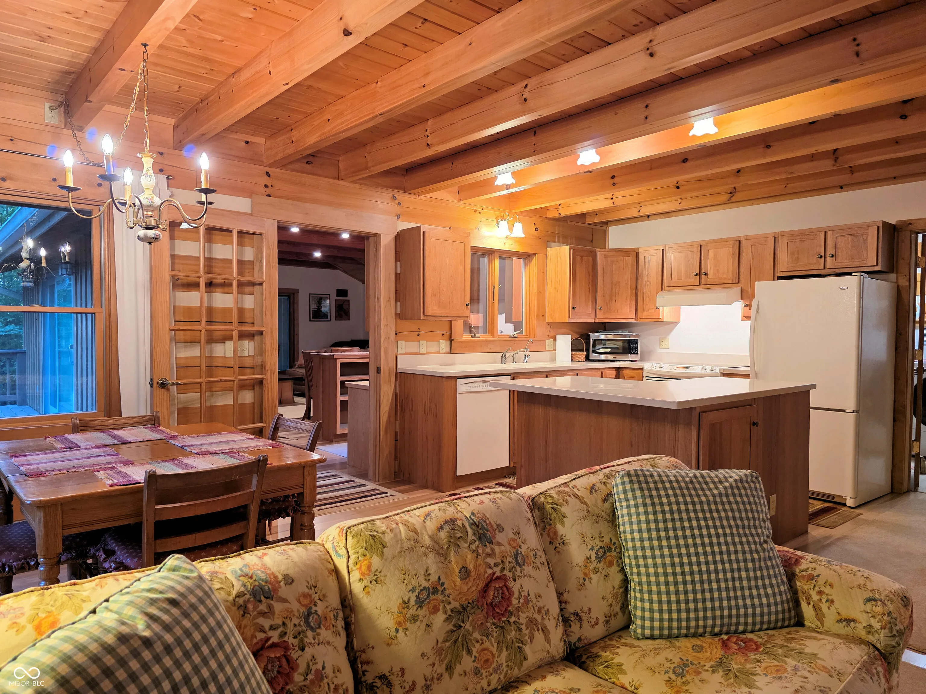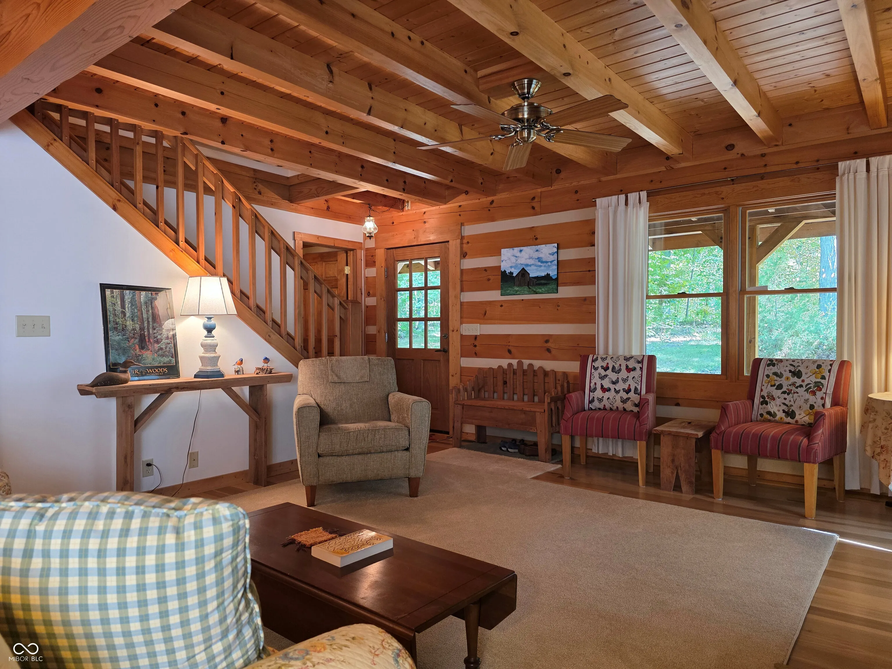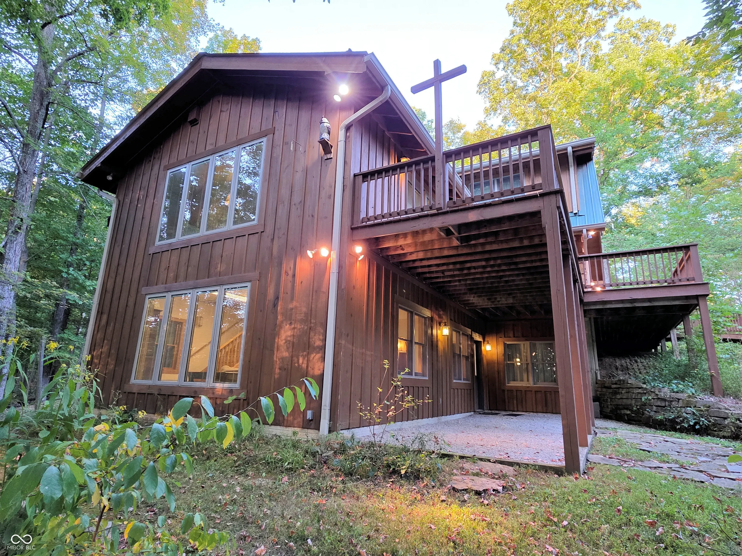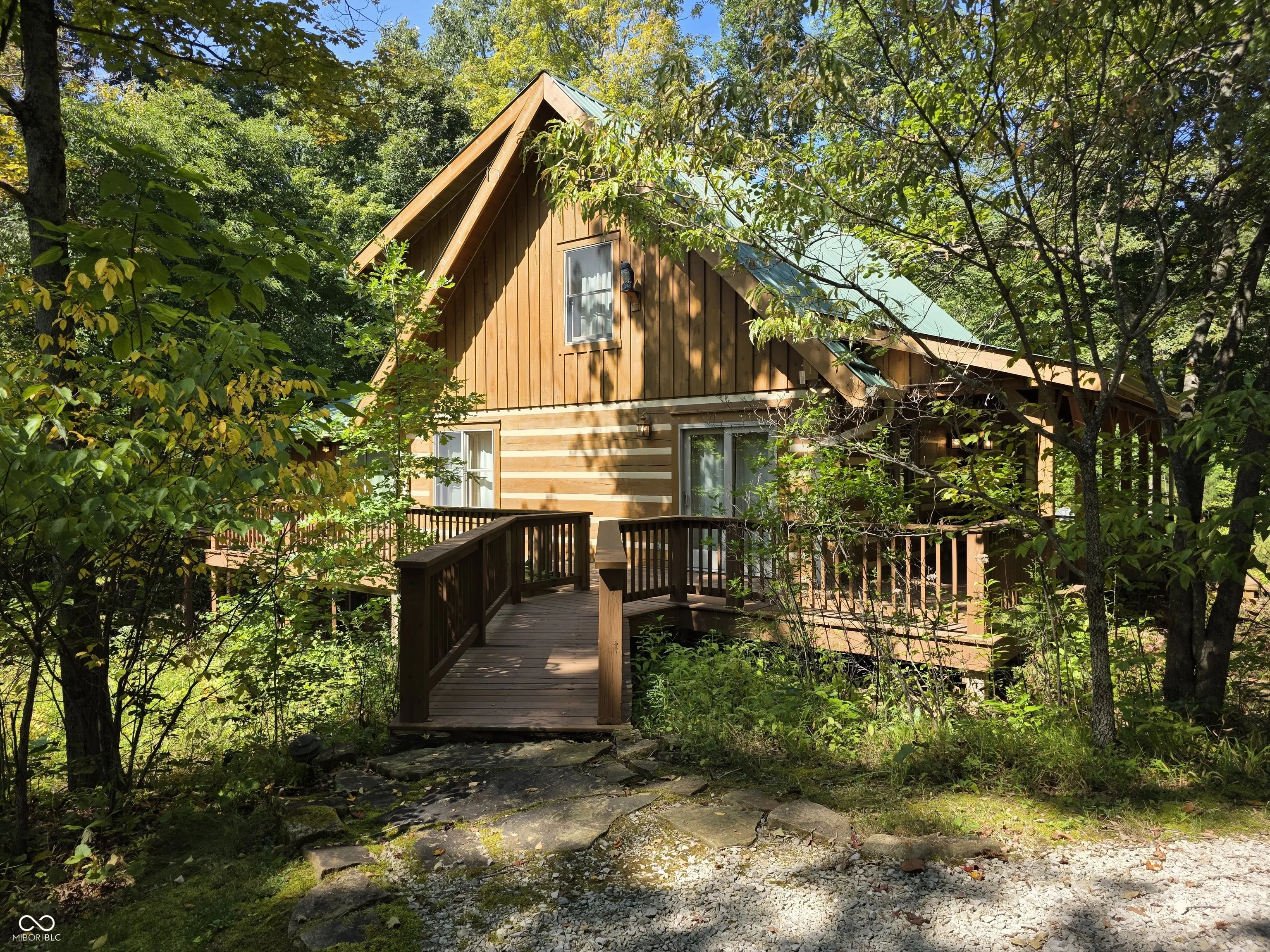 Welcome to a Brown County cabin retreat where comfort, craftsmanship, and conservation meet. This 3-bedroom, 3-bath square-log home with a metal roof is meticulously maintained and offers nearly 4,000 sq ft for relaxing or entertaining. Set on 10.71 acres on a private road, the property carries a “Classified Forest” designation that helps keep taxes low. The Seller has protected this land, planting natives, excluding invasives, and posting pollinator habitat signs to guide future stewards. There’s a circular drive to the home and a matching 24’x24′ garage with covered porch and loft storage. A pond with paths and a footbridge enhances the tranquil setting. Outdoor living includes a covered front porch for quiet mornings and expansive side decks for gatherings. Inside, the main level features an open living/dining/kitchen anchored by a Brown County Stone hearth with a gas stove. Hardwood floors, custom cabinetry, and an island with Corian countertops underscore quality. This level also includes a bedroom and a convenient laundry/full-bath combo. This original section of the cabin provides stairs to both the second floor and another to the finished basement. Upstairs, the primary suite’s bath also opens to the hall, serving the second bedroom. Both upper-level bedrooms have vaulted ceilings. In the back addition, you’ll find a light-filled family room with a beamed ceiling, windows, and deck access, a generous kitchenette/bar with custom cabinetry and Corian counters with plenty of room for a game table or extra dining. Stairs here also lead to the beautifully finished walk-out lower level. This poured-concrete basement is clean and dry, with a large family room, a guest area with a full bath, and an oversized utility room for mechanicals. From top to bottom, the home shows extraordinary care. Beyond the pristine walls, the land tells a story of stewardship and respect for nature, ready for new owners who will cherish both the home and the habitat it protects.