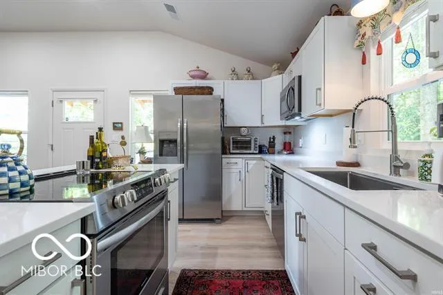 Light breezes whisper through the majestic oak, poplar, birch, maple, ash, and dogwood trees down to an enchanting cottage in the woods. Serenely tucked away on the 2.1 acres, an original workshop was converted into a fairytale homestead in 2022. A covered front porch opens into a great room, with light ash wood laminate flooring. The soaring cathedral ceiling, recessed lighting, off white walls, doors and trim add to the brightness of the room. Enjoy the well appointed kitchen with SS appliances, quartz countertops, white cabinetry, and custom island with built-in range and breakfast bar, overlooking the great room. Off the kitchen is a welcoming 19’6′ x 10′ screened porch, excellent for additional space with family, friends or for entertaining guests.. The outdoor carpeting, soft lighting, and access to a front and back deck add to this peaceful and relaxing space. The primary ensuite overlooks mature woods, with majestic trees, a cozy firepit and flower gardens. Enjoy his & her mirrored medicine cabinets, white vanity with quartz top and shower with a corner seat. Conveniently located next to the bathroom is the laundry room with a work counter and extra cabinets. Off the great room is a half bath, located next to a small study, workout room or possibly a tiny bedroom. This property is loaded with living opportunities. Live in the cottage while building your dream home, use it as an art or music studio, rent, lease or a possible airbnb. If you’re a snowbird this is the ideal 2nd home. Consider the spacious 13’6″ high x 20′ wide and 36′ long carport for storing cars, RV’s, boats & trailers. Or use that space for your new homesite, where the original home was located. Raise your own chickens with the well maintained 10′ x 6′ chicken coop. Revere in the amazing professional landscaping throughout the 2 acres. Retaining walls, planned flower beds, trees and outdoor living spaces illustrate the uniqueness of this quint Bloomington residence. Mini storag