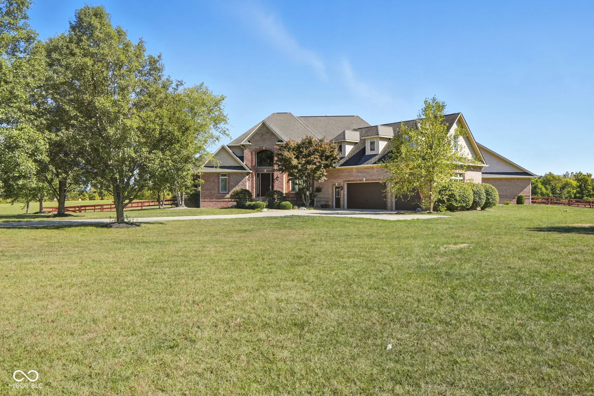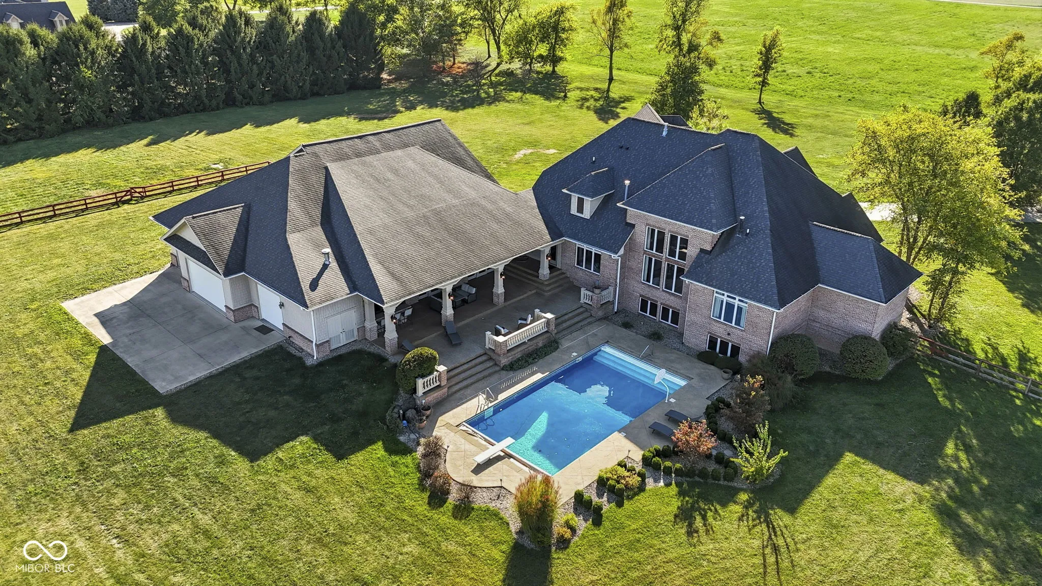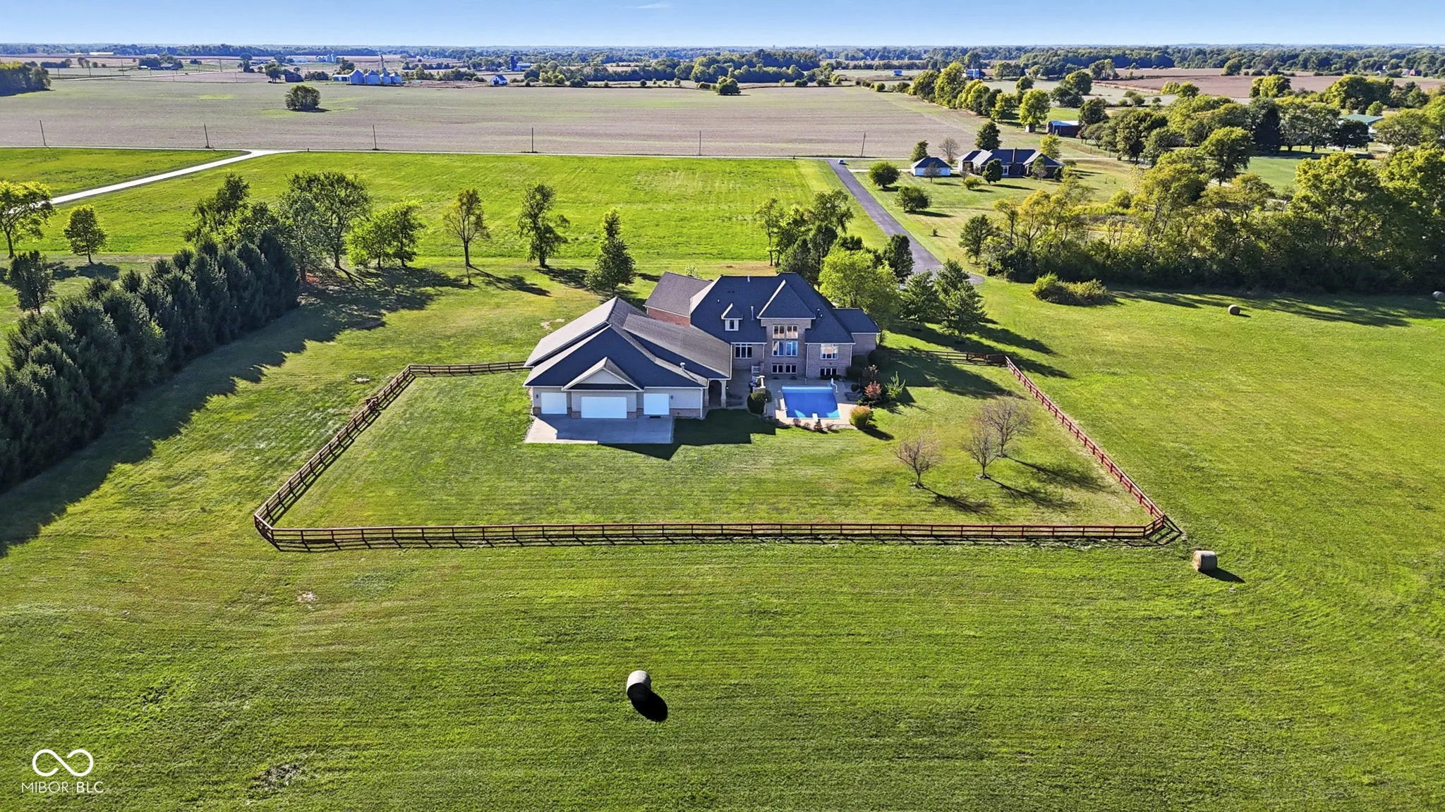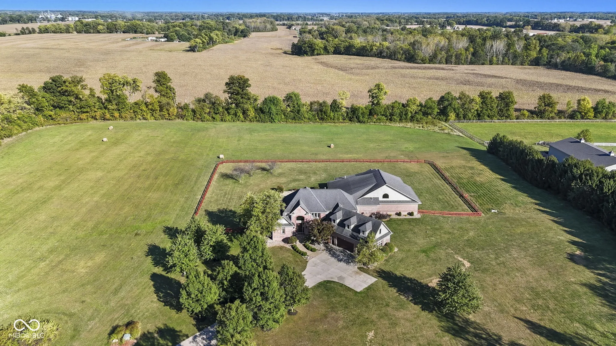 Welcome to 7590 S 25 E, a stunning executive estate offering over 10,000 square feet of luxury living on more than 10 acres in the peaceful Pendleton countryside. Built in 2002, this custom home was designed with both elegance and comfort in mind, featuring exceptional craftsmanship and an array of resort-style amenities. The grand two-story foyer sets the tone, leading into the great room with cathedral ceilings, a wall of windows overlooking the property, and a dramatic double-sided stone fireplace. The gourmet kitchen is a chef’s dream with granite counters, a center island, breakfast bar, walk-in pantry, and custom finishes, opening to a hearth room with its own fireplace. Formal dining and gathering areas provide the perfect setting for entertaining. The main-level owner’s retreat is a true sanctuary, highlighted by tray ceilings, a stone fireplace, a huge custom walk-in closet with center island, and a spa-inspired bath with dual vanities, soaking tub, and walk-in shower. Upstairs offers three spacious bedrooms, each with walk-in closets and private baths, plus a large bonus room. The fully finished lower level is designed for fun and entertainment with a second kitchen and bar, home theater, family spaces, guest bedroom, and full bath. One of the best features is the indoor basketball court. Step outside to enjoy your private outdoor oasis featuring a covered patio with entertainment, full outdoor kitchen with tiled bar, and a heated in-ground pool with an electric cover and basketball goal. Partial area of the 10+ acreage is fenced for convenience, while the expansive garages provide space for up to seven vehicles and abundant storage. This property offers the rare combination of privacy, luxury, and recreation, all while being conveniently located near schools, services, and the charm of Pendleton. Truly a one-of-a-kind country estate built for living and entertaining at the highest level.