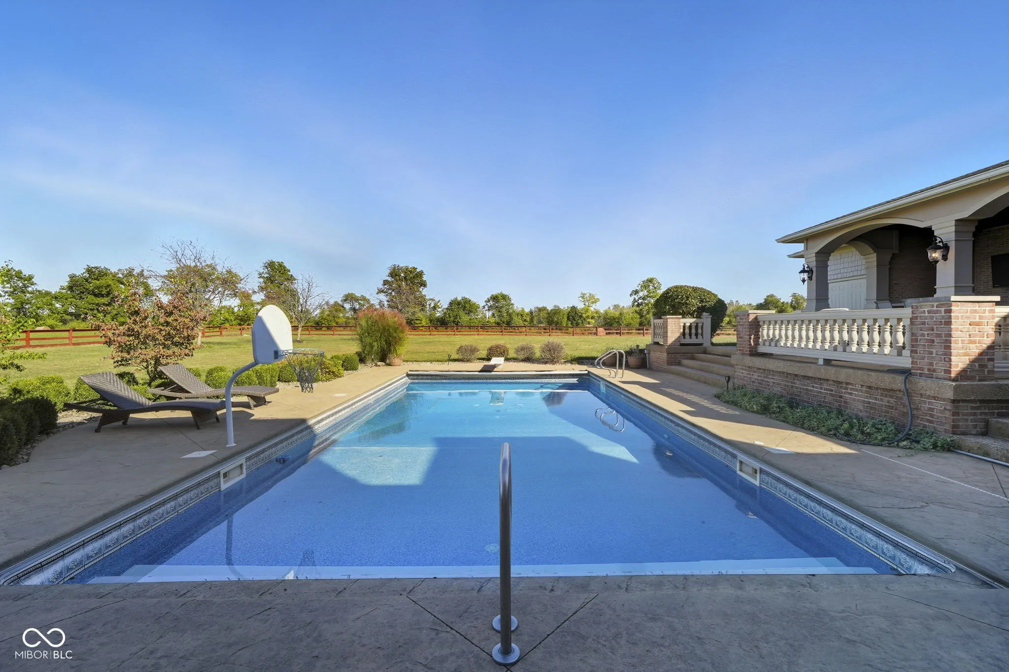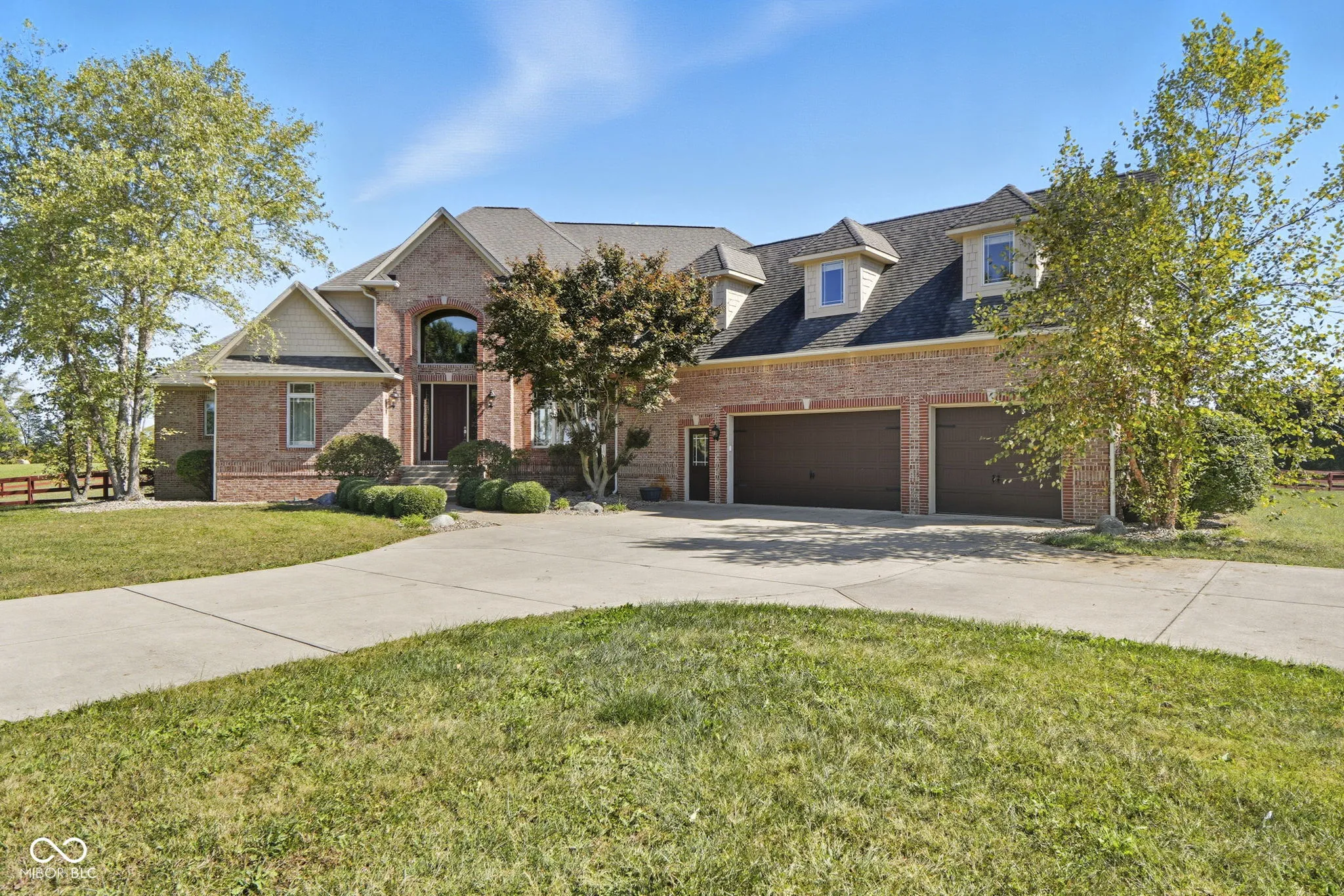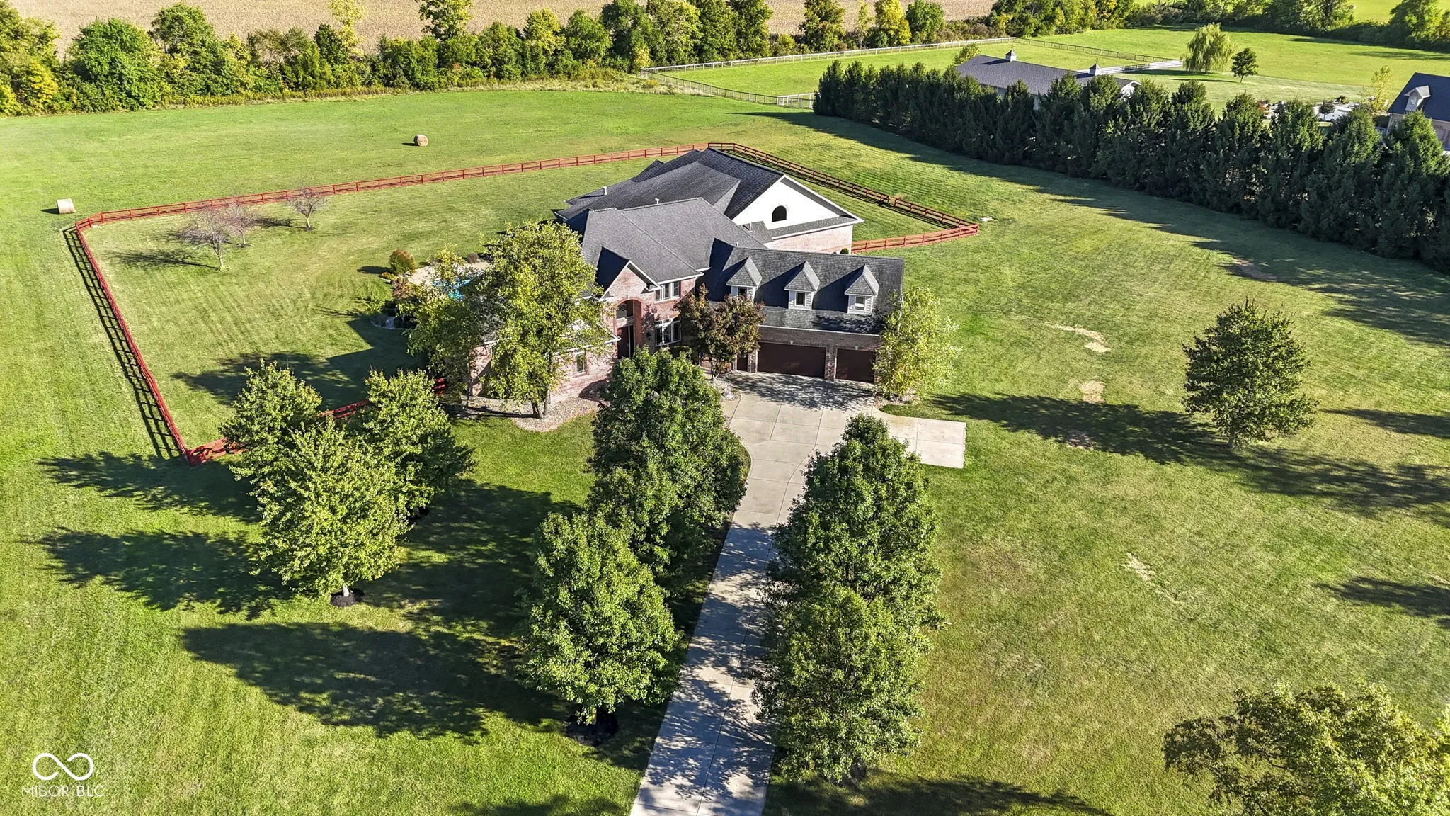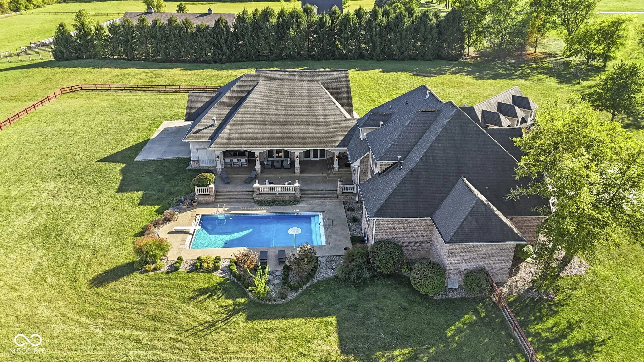 Welcome to 7590 S 25 E, a stunning executive estate offering over 10,000 square feet of luxury living on more than 10 acres in the peaceful Pendleton countryside. Built in 2002, this custom home was designed with both elegance and comfort in mind, featuring exceptional craftsmanship and an array of resort-style amenities. The grand two-story foyer sets the tone, leading into the great room with cathedral ceilings, a wall of windows overlooking the property, and a dramatic double-sided stone fireplace. The gourmet kitchen is a chef’s dream with granite counters, a center island, breakfast bar, walk-in pantry, and custom finishes, opening to a hearth room with its own fireplace. Formal dining and gathering areas provide the perfect setting for entertaining. The main-level owner’s retreat is a true sanctuary, highlighted by tray ceilings, a stone fireplace, a huge custom walk-in closet with center island, and a spa-inspired bath with dual vanities, soaking tub, and walk-in shower. Upstairs offers three spacious bedrooms, each with walk-in closets and private baths, plus a large bonus room. The fully finished lower level is designed for fun and entertainment with a second kitchen and bar, home theater, family spaces, guest bedroom, and full bath. One of the best features is the indoor basketball court. Step outside to enjoy your private outdoor oasis featuring a covered patio with entertainment, full outdoor kitchen with tiled bar, and a heated in-ground pool with an electric cover and basketball goal. Partial area of the 10+ acreage is fenced for convenience, while the expansive garages provide space for up to seven vehicles and abundant storage. This property offers the rare combination of privacy, luxury, and recreation, all while being conveniently located near schools, services, and the charm of Pendleton. Truly a one-of-a-kind country estate built for living and entertaining at the highest level.
