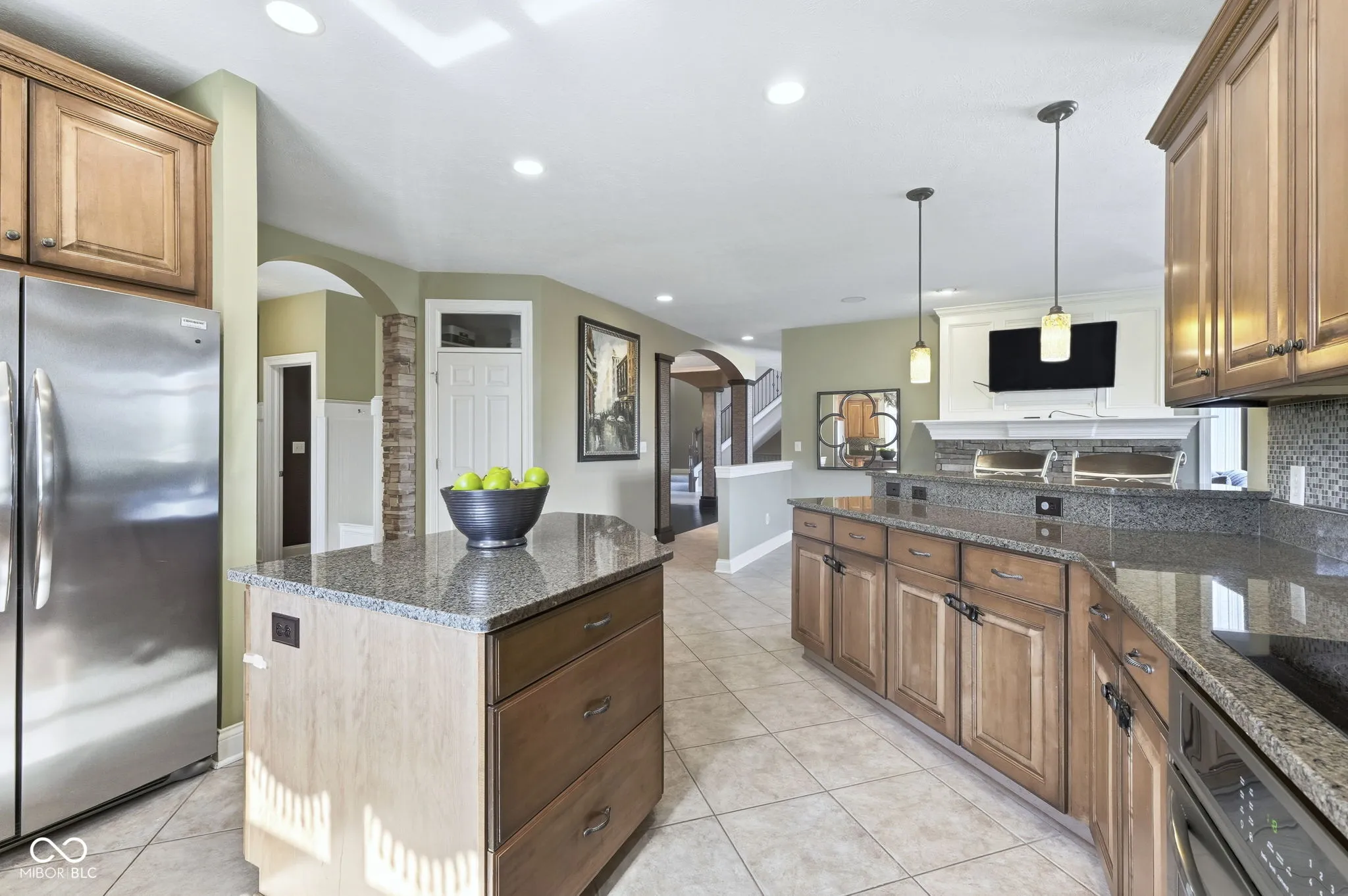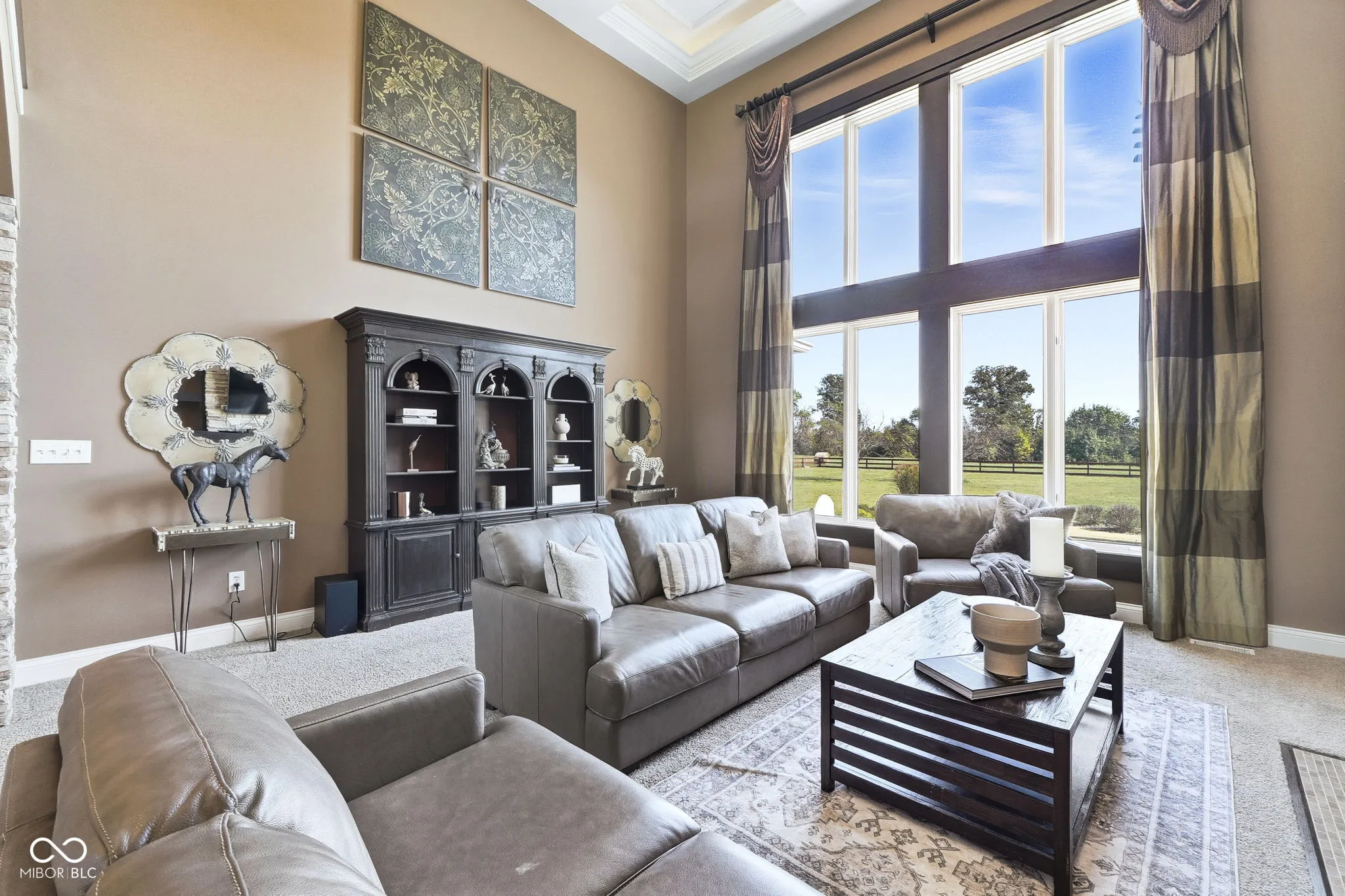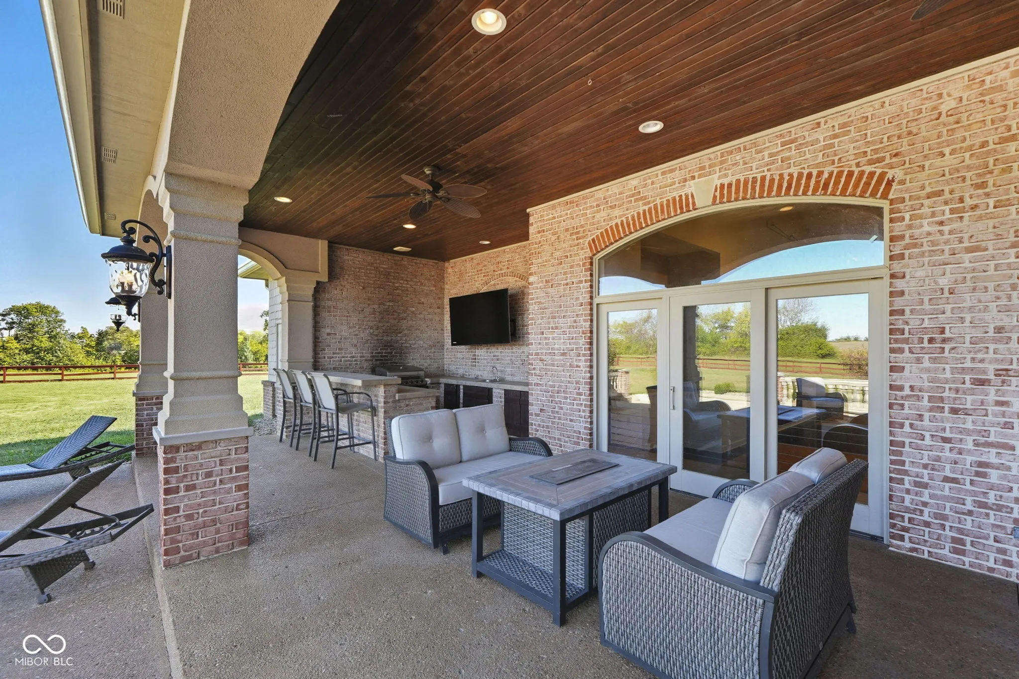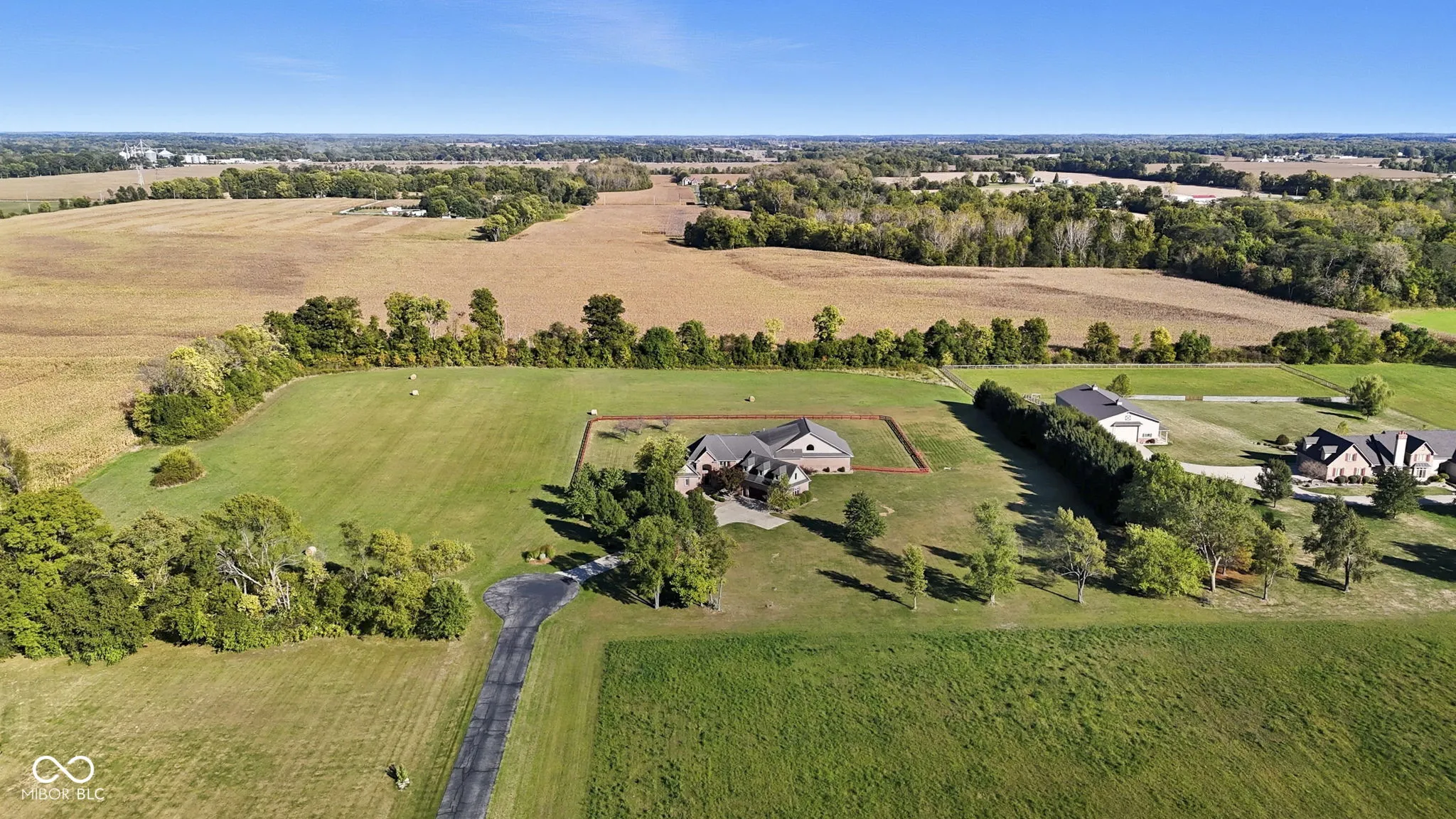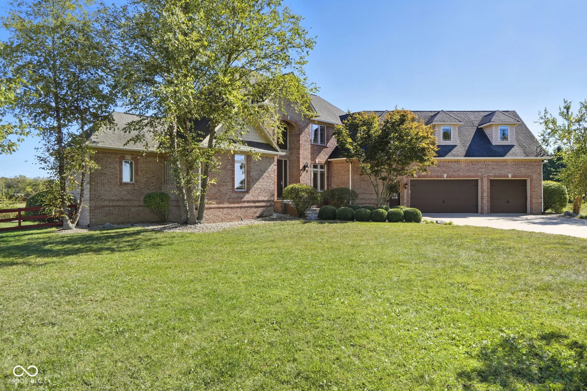 Welcome to 7590 S 25 E, a stunning executive estate offering over 10,000 square feet of luxury living on more than 10 acres in the peaceful Pendleton countryside. Built in 2002, this custom home was designed with both elegance and comfort in mind, featuring exceptional craftsmanship and an array of resort-style amenities. The grand two-story foyer sets the tone, leading into the great room with cathedral ceilings, a wall of windows overlooking the property, and a dramatic double-sided stone fireplace. The gourmet kitchen is a chef’s dream with granite counters, a center island, breakfast bar, walk-in pantry, and custom finishes, opening to a hearth room with its own fireplace. Formal dining and gathering areas provide the perfect setting for entertaining. The main-level owner’s retreat is a true sanctuary, highlighted by tray ceilings, a stone fireplace, a huge custom walk-in closet with center island, and a spa-inspired bath with dual vanities, soaking tub, and walk-in shower. Upstairs offers three spacious bedrooms, each with walk-in closets and private baths, plus a large bonus room. The fully finished lower level is designed for fun and entertainment with a second kitchen and bar, home theater, family spaces, guest bedroom, and full bath. One of the best features is the indoor basketball court. Step outside to enjoy your private outdoor oasis featuring a covered patio with entertainment, full outdoor kitchen with tiled bar, and a heated in-ground pool with an electric cover and basketball goal. Partial area of the 10+ acreage is fenced for convenience, while the expansive garages provide space for up to seven vehicles and abundant storage. This property offers the rare combination of privacy, luxury, and recreation, all while being conveniently located near schools, services, and the charm of Pendleton. Truly a one-of-a-kind country estate built for living and entertaining at the highest level.