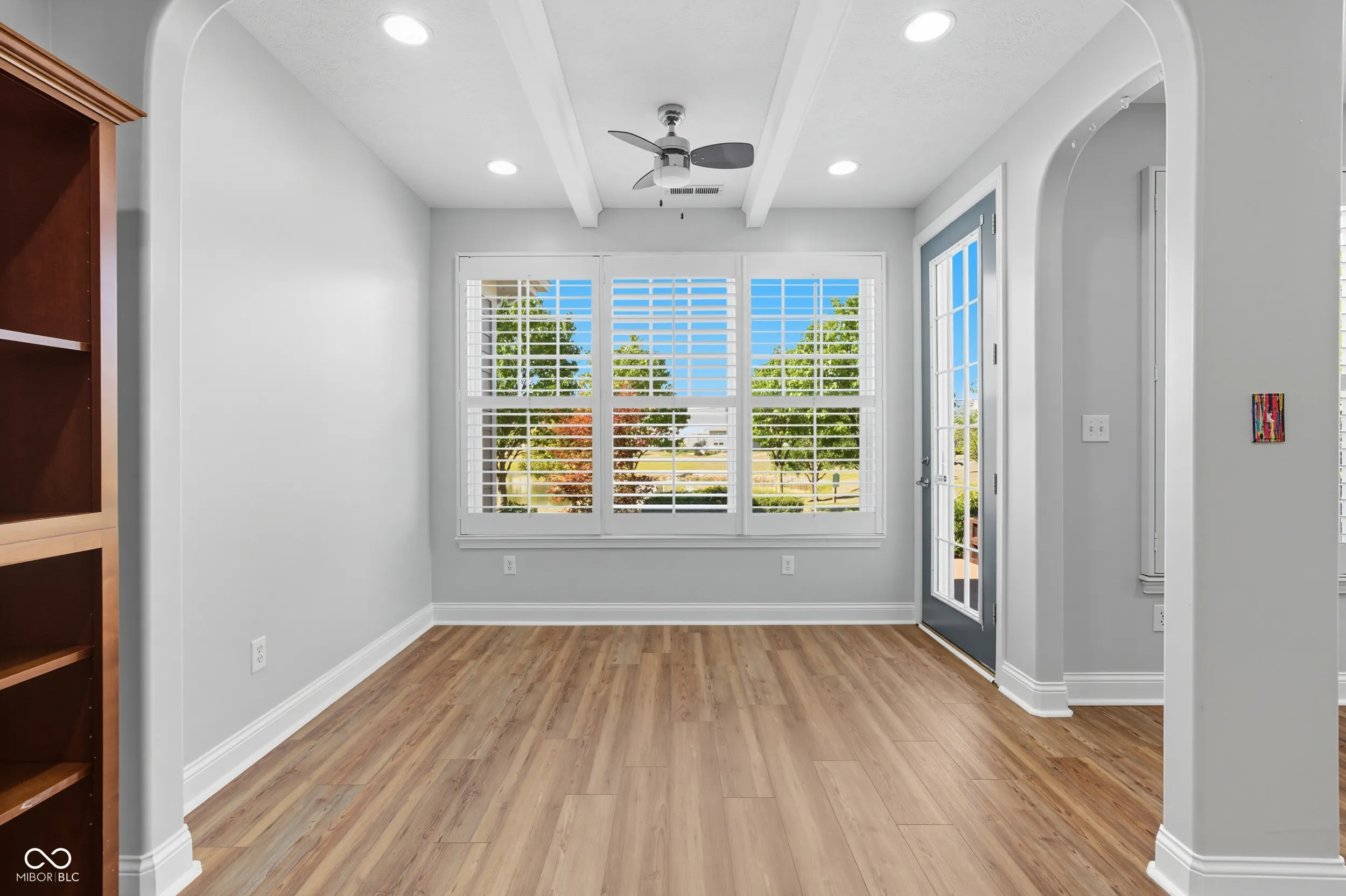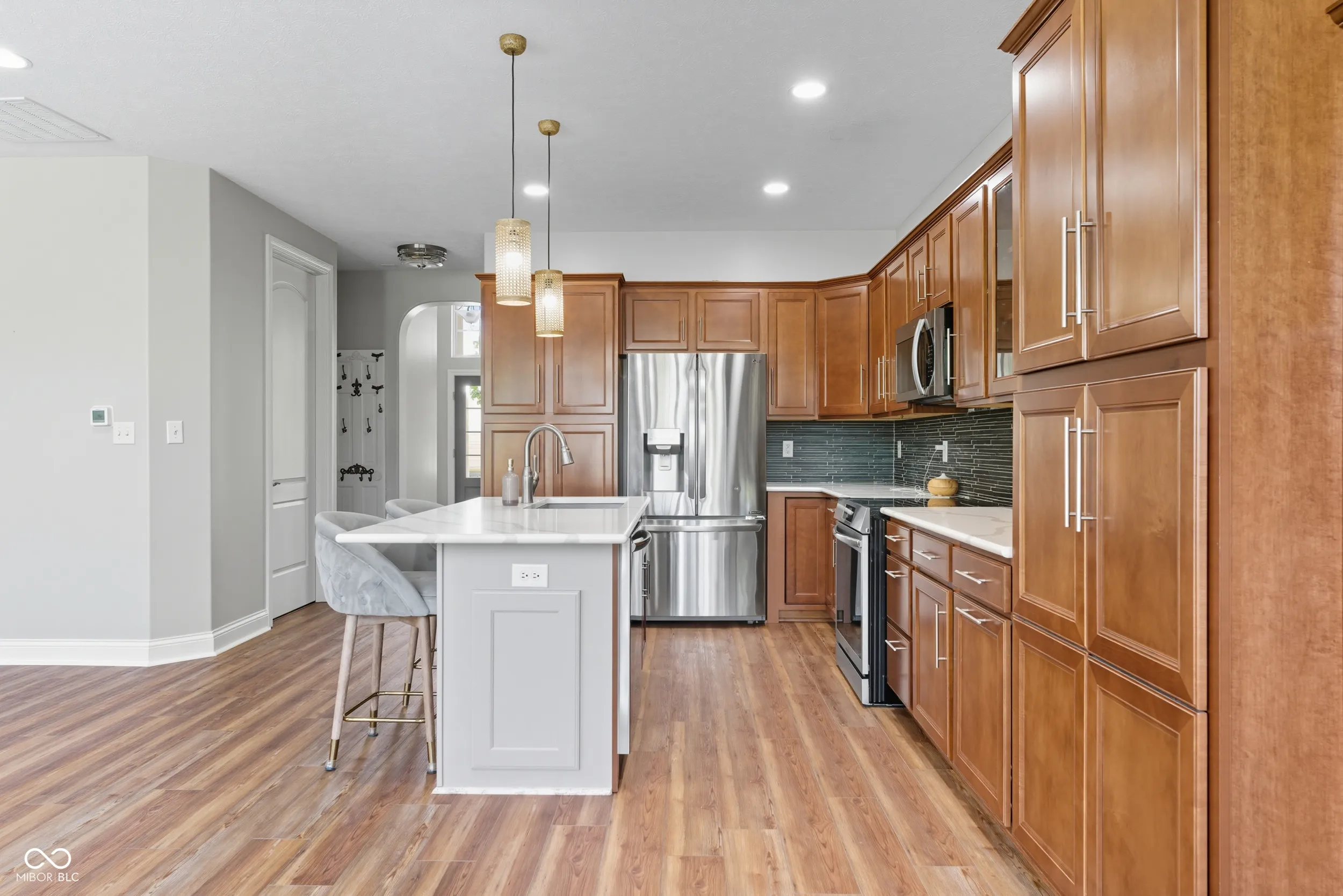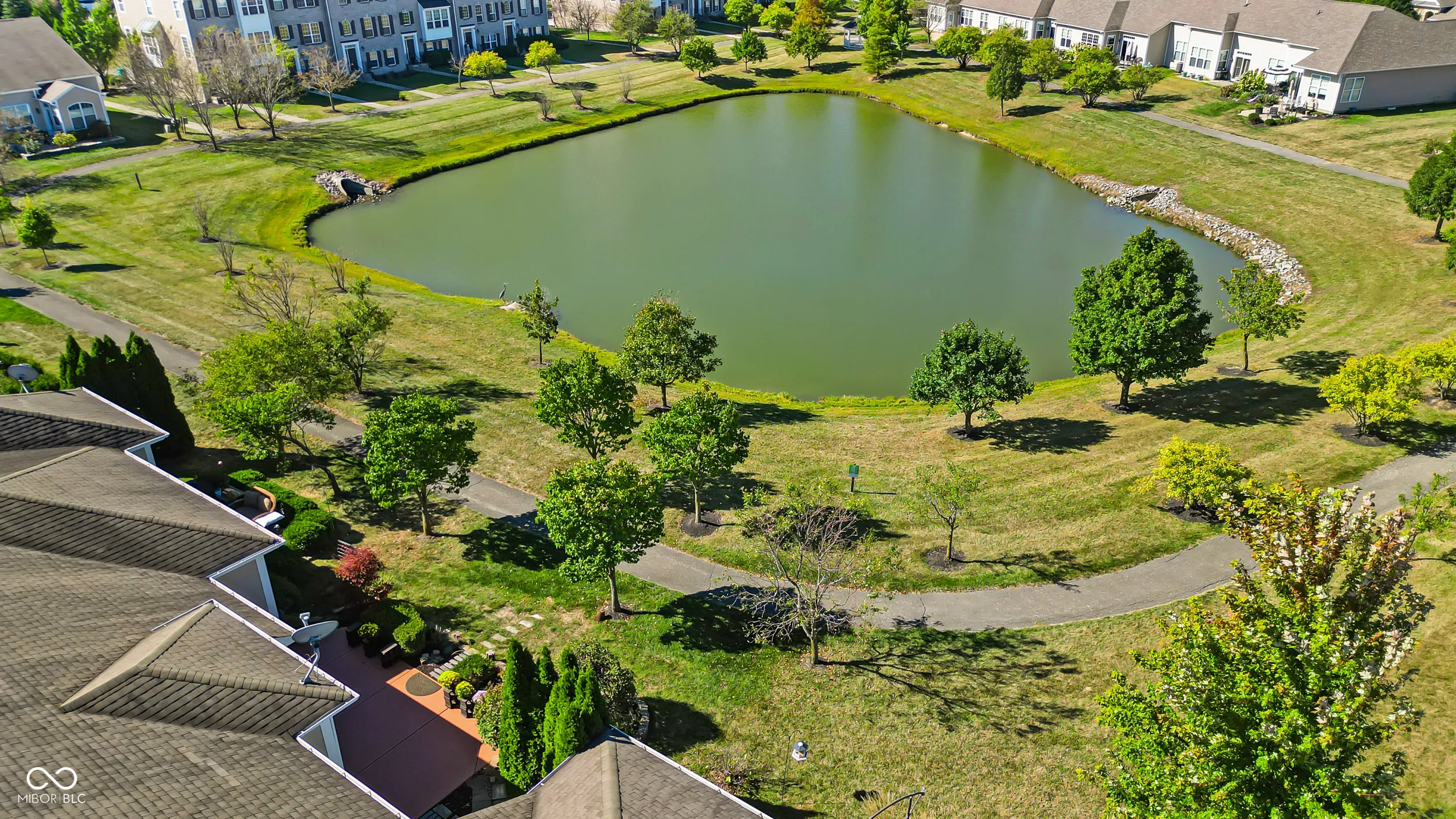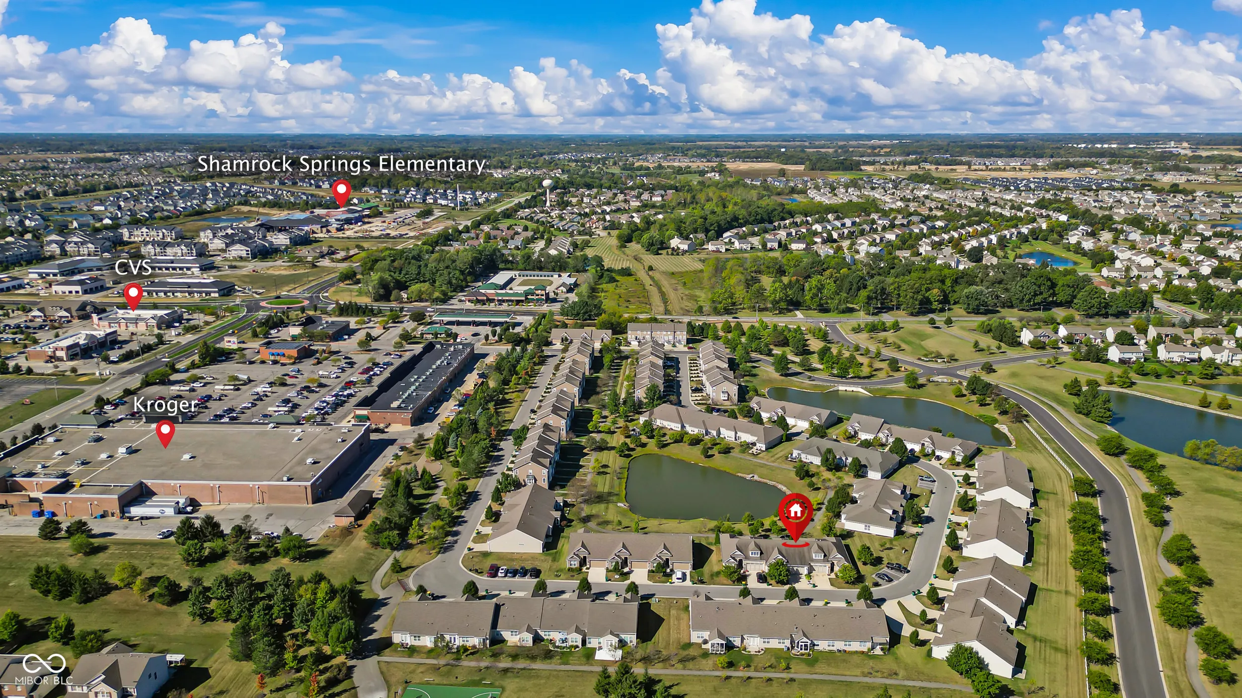 Welcome to this immaculate 2-bed/2-bath condo that is truly move-in ready. The welcoming stone front entry with/ dormer detail gives this home exceptional curb appeal. Step inside to find 9-foot ceilings, 8-foot doors, and new luxury vinyl plank flooring. NEW in the past 1 to 5 years: HVAC, humidifier, bathrooms, custom closet shelving, electrical and lighting upgrades, paint, and security system. The 2024 standout kitchen refresh gives a big bang for entertaining with additional cabinets, a bookcase, an enlarged island, quartz tops, and SS appliances. Whew, all that and a 300+ sqft outdoor oasis with privacy landscaping, a peaceful pond, and a scenic walking trail-perfect for morning coffee or relaxing anytime. Seller is sad to leave this peaceful patio! Attached finished two-car garage with additional built-in storage. The location could not be better, with walkability to a grocery store, shopping, a plethora of dining options, and easy biking. All this with no yard work! This is a must-see!
