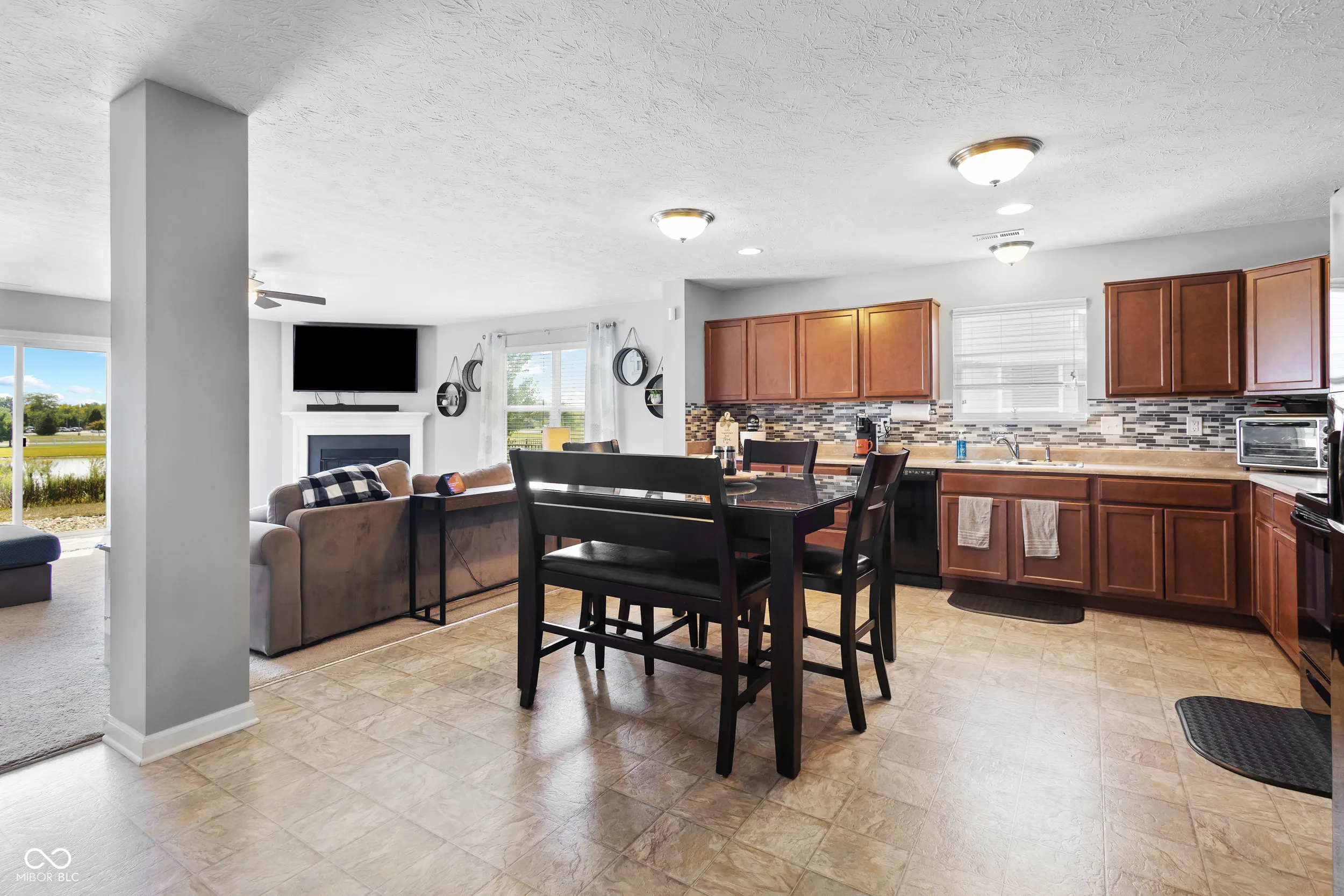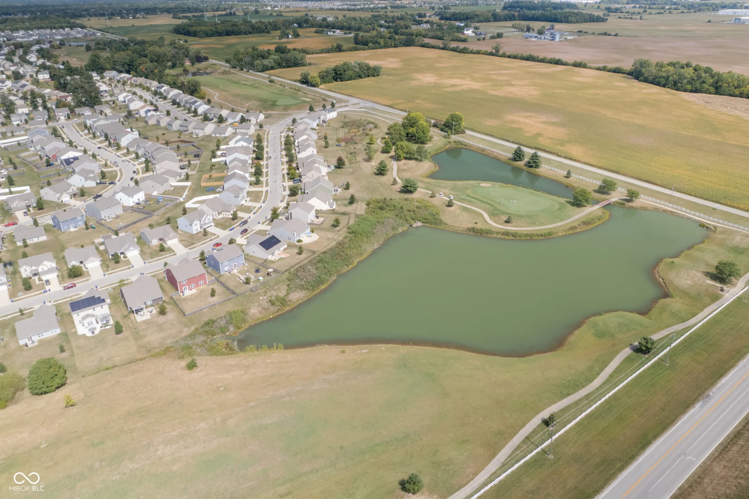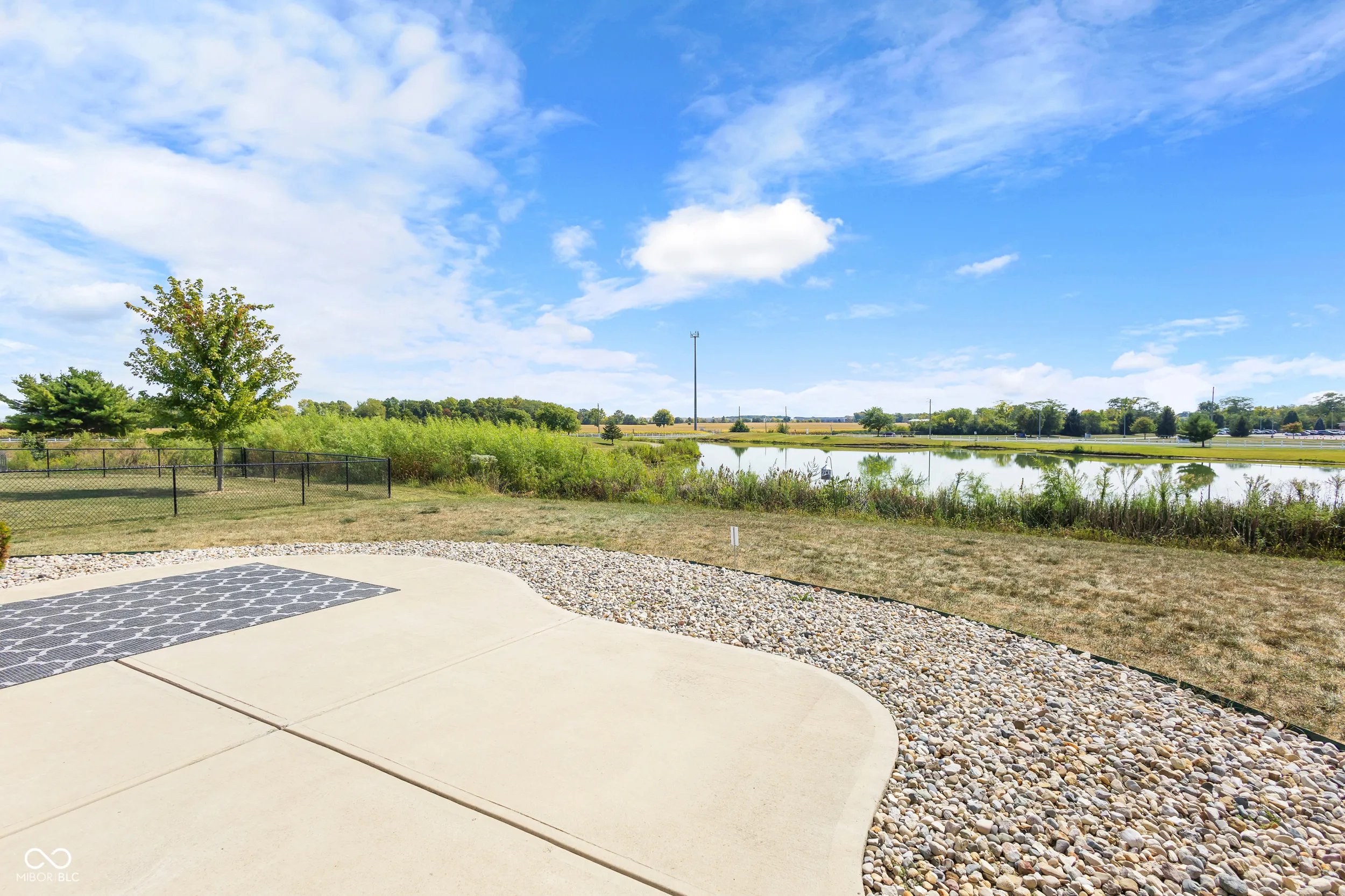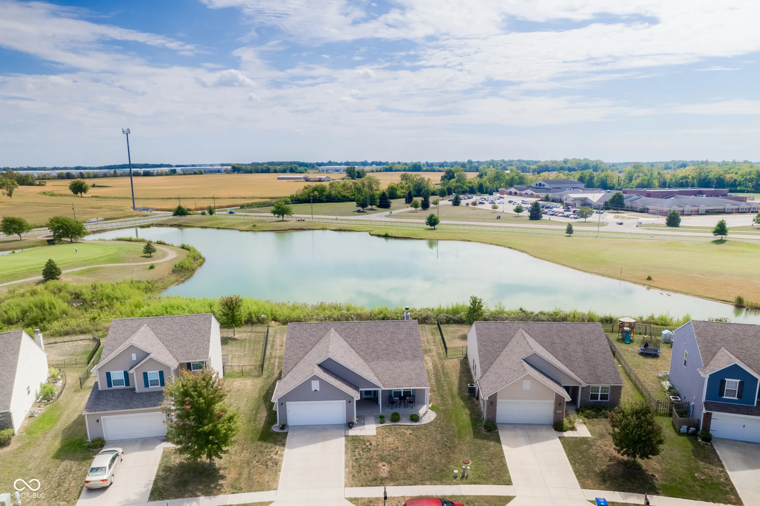Charming 3BR, 2BA ranch on an oversized lot with serene pond and golf course views. Spacious living room features a wood-burning fireplace. Open kitchen comes with all appliances included. Flooring includes ceramic tile in kitchen/laundry and carpet in bedrooms. Primary suite offers a walk-in closet and double vanity. Two additional bedrooms plus a versatile flex room-ideal as a 4th bedroom, office, or additional space. Outdoor patio overlooks the pond, perfect for relaxing or entertaining. Finished 2-car garage, water softener, and electric dog fence included. Great community amenities: pool, park, tennis, and basketball courts. Perfect starter home in a desirable neighborhood!
