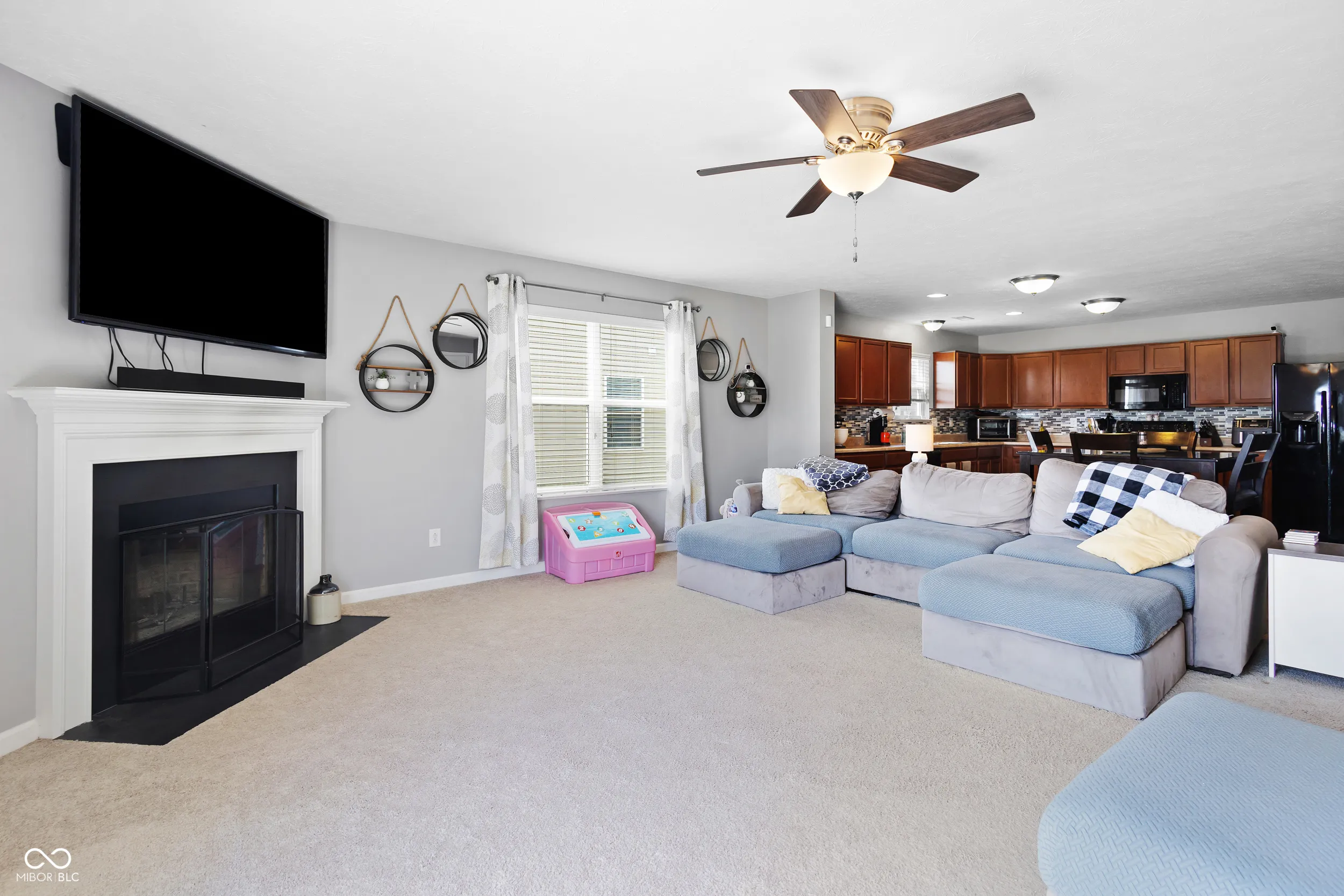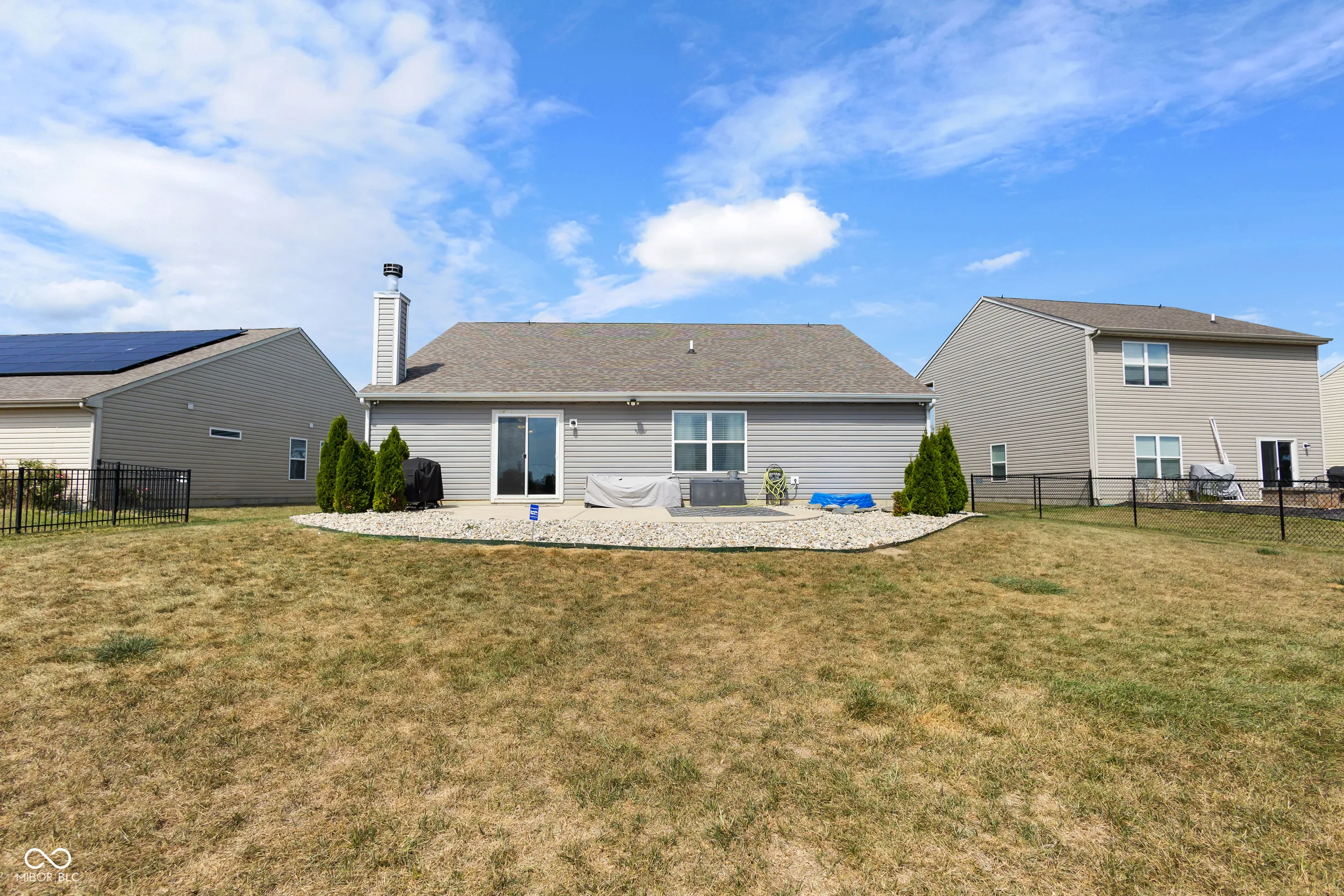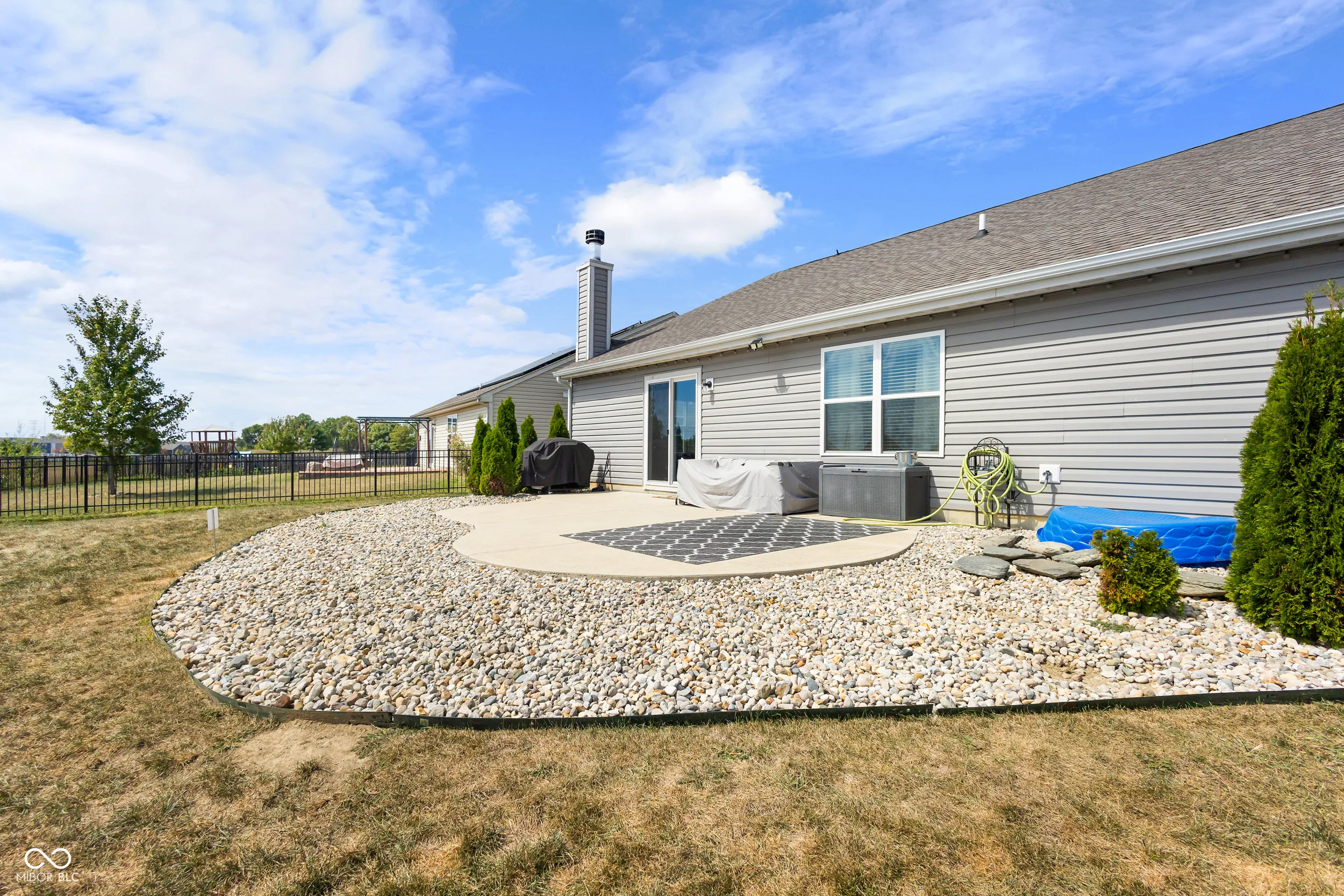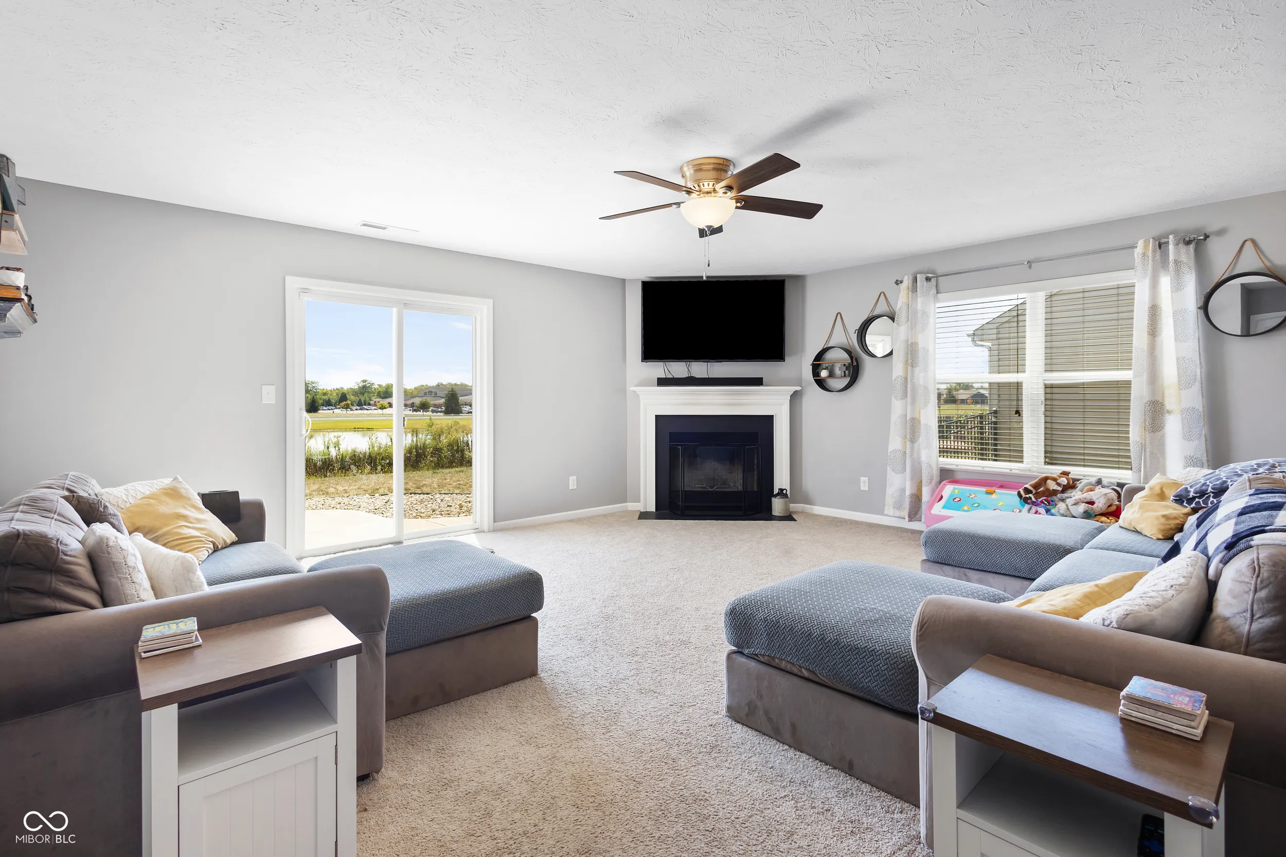 Charming 3BR, 2BA ranch on an oversized lot with serene pond and golf course views. Spacious living room features a wood-burning fireplace. Open kitchen comes with all appliances included. Flooring includes ceramic tile in kitchen/laundry and carpet in bedrooms. Primary suite offers a walk-in closet and double vanity. Two additional bedrooms plus a versatile flex room-ideal as a 4th bedroom, office, or additional space. Outdoor patio overlooks the pond, perfect for relaxing or entertaining. Finished 2-car garage, water softener, and electric dog fence included. Great community amenities: pool, park, tennis, and basketball courts. Perfect starter home in a desirable neighborhood!