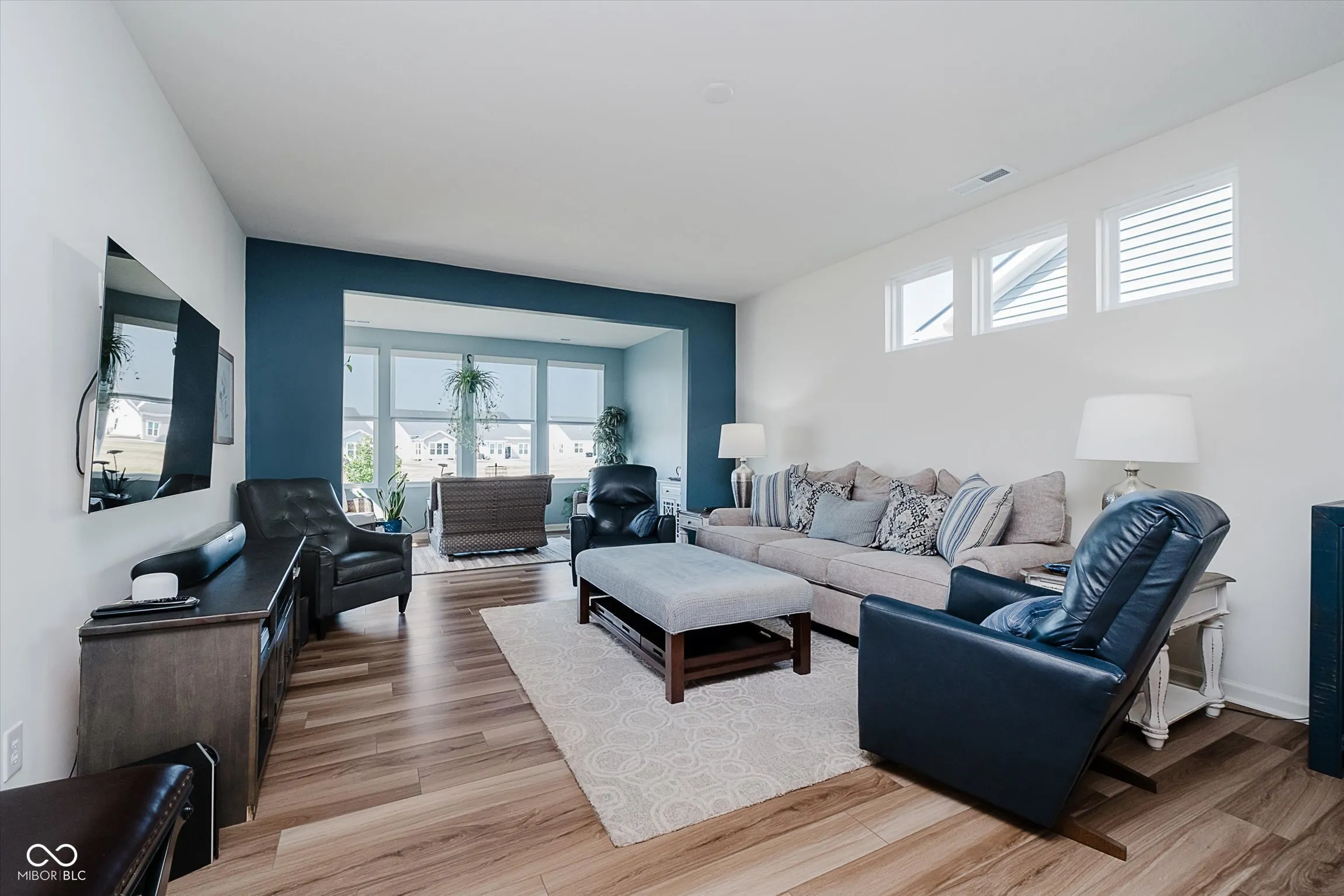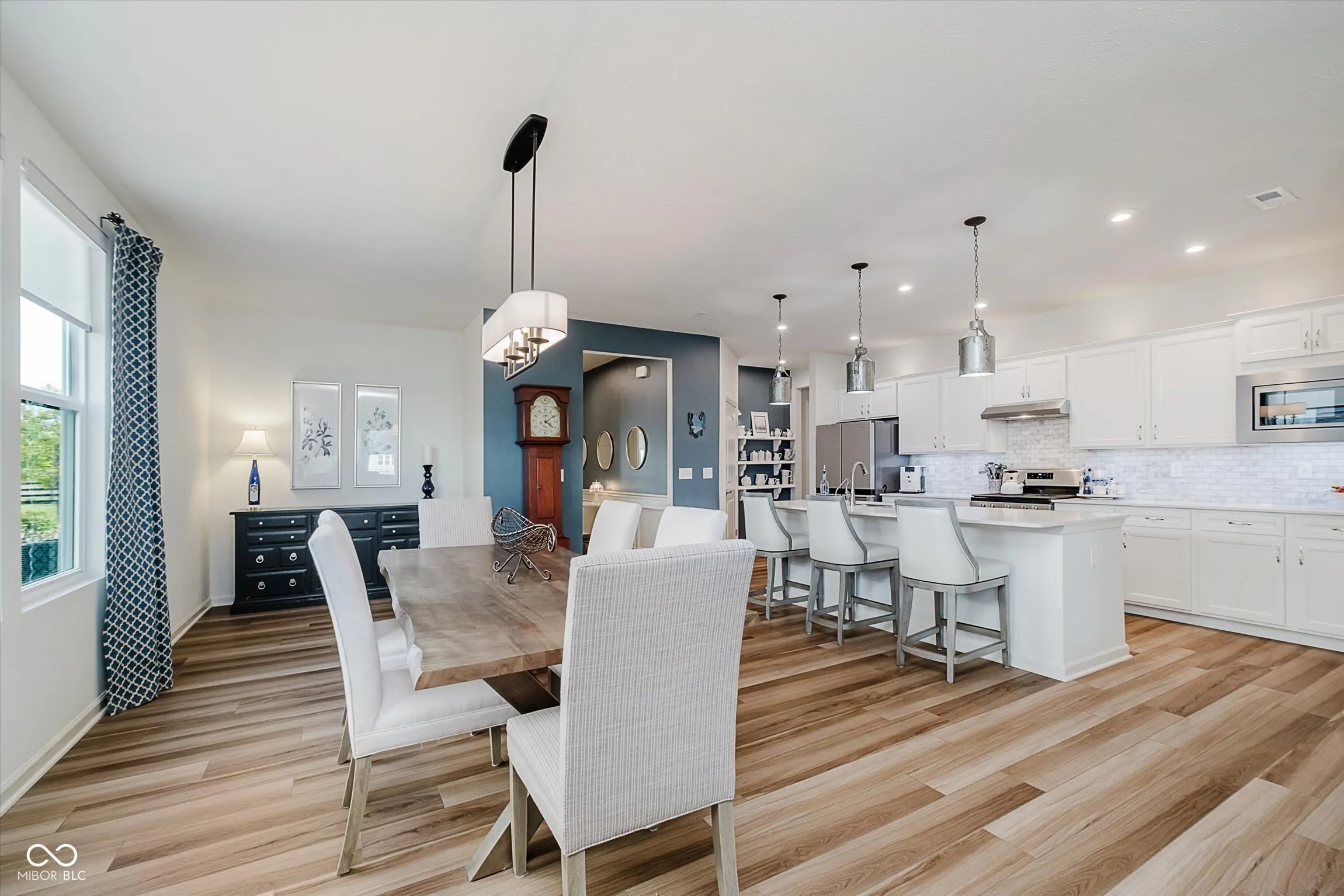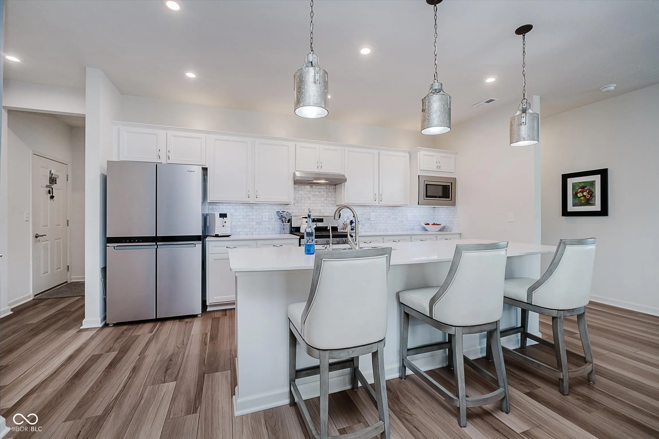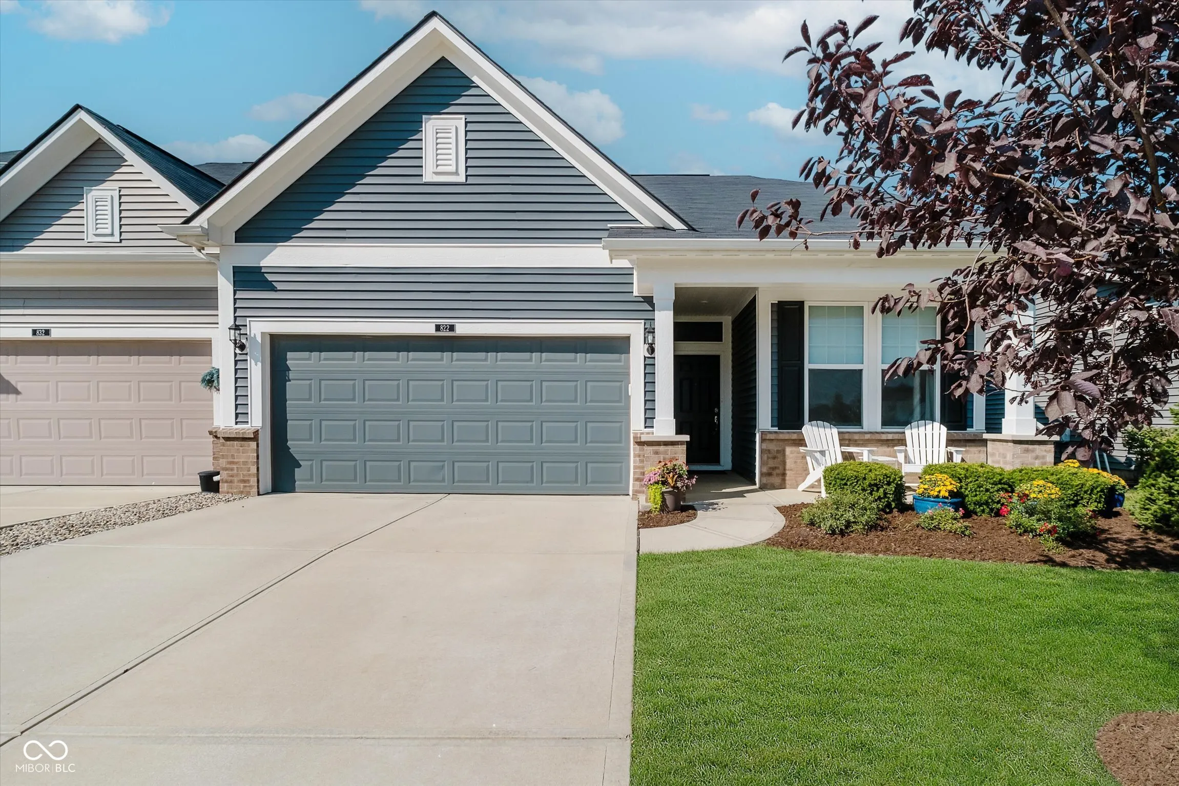 Step into a thoughtfully designed paired patio home that blends modern finishes with a comfortable single-level layout. Built in 2021, this end-unit residence offers an open floor plan with abundant natural light and a relaxing pond view, all within close walking distance to Grand Park. The updated kitchen showcases white cabinetry with both upper and lower cabinet lighting, stainless steel appliances, a decorative backsplash, and a large center island with breakfast bar seating. Seamlessly connected are the dining area, great room, and a sunroom overlooking the water, creating a welcoming flow for both everyday living and entertaining. The primary suite includes a walk-in closet and private bath with dual sinks and a walk-in shower. A second bedroom and full bath provide flexible space for guests or a home office. Window treatments throughout, durable luxury vinyl plank flooring, upgraded lighting, and added attic insulation further enhance comfort and efficiency. Practical upgrades include an insulated two-car garage, water softener, and reverse osmosis system. Outdoors, enjoy the open patio and the low-maintenance lifestyle provided by the HOA, which covers lawncare, snow removal, and exterior upkeep. Neighborhood amenities include a clubhouse, pool, pickleball courts, playground, and walking paths.