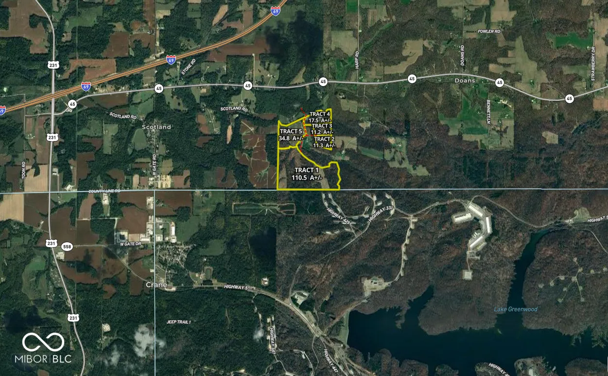 Located just minutes from the Crane Naval Base North Entrance and only 3 miles from I-69, this property offers a prime opportunity with a great building site. This area is well known for its trophy whitetail deer and turkey hunting, making it an outdoorsman’s dream. Trails and roads throughout provide easy access to the property, and with electricity and fiber already on site, it’s ready for your next home, retreat, or investment.