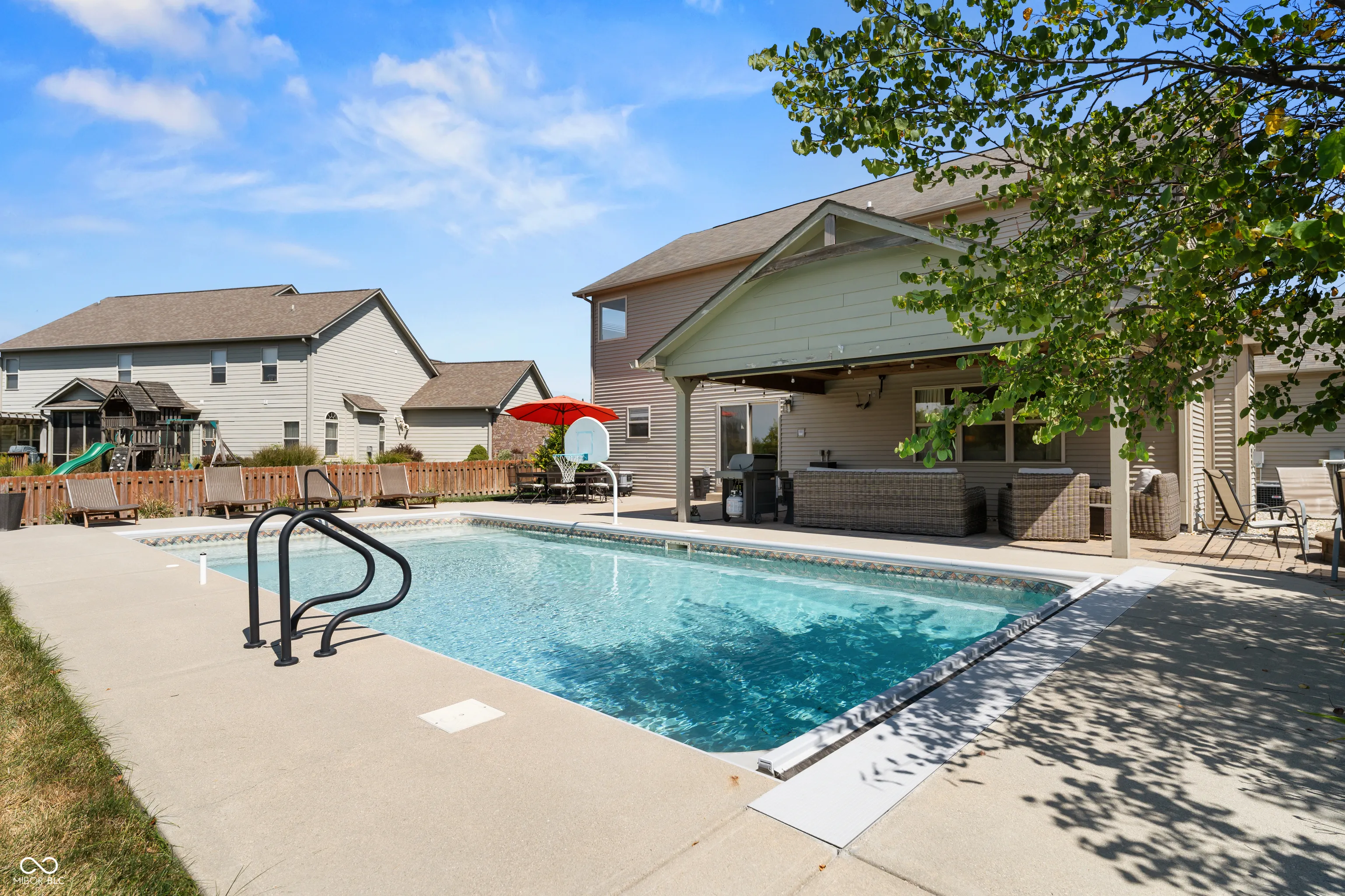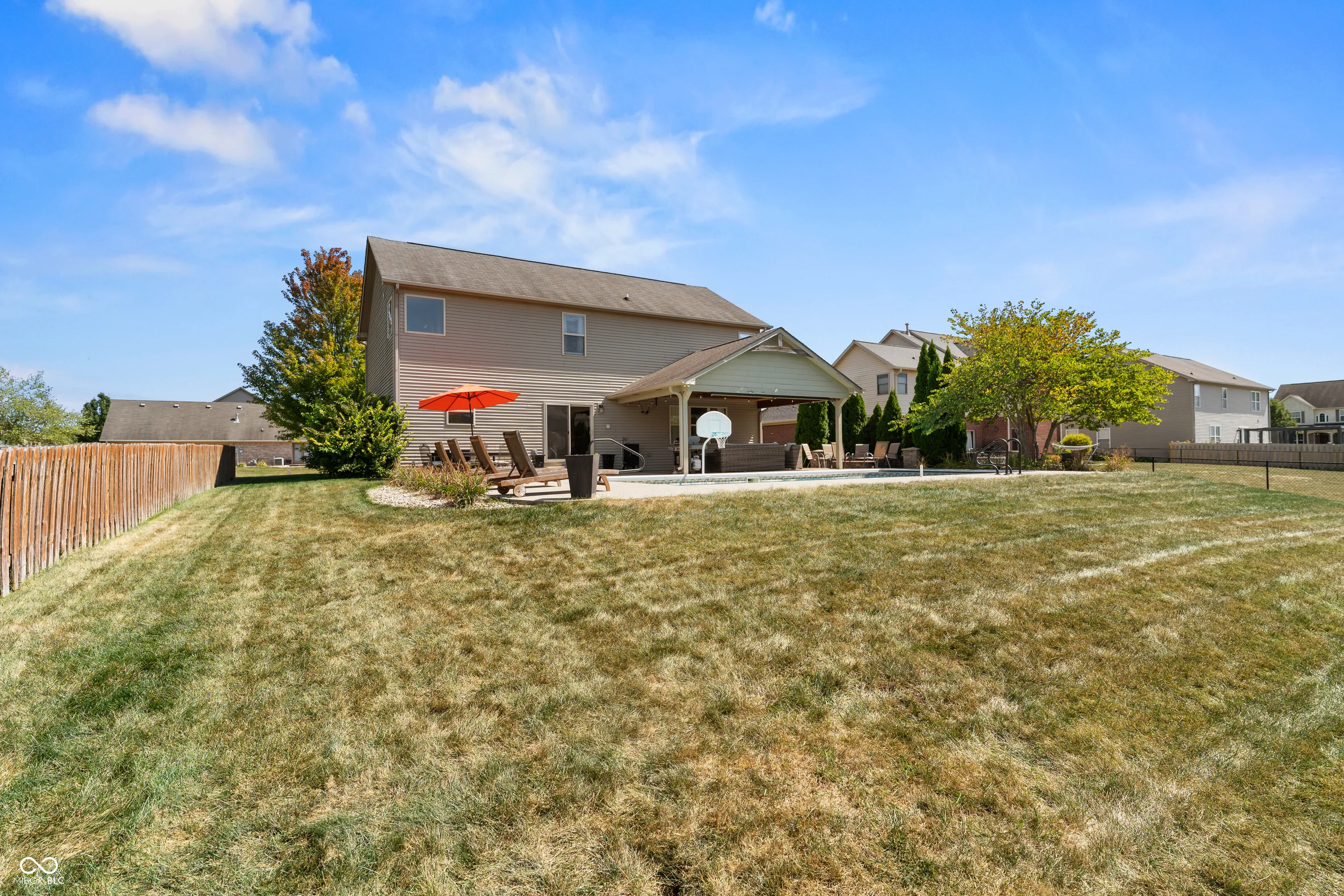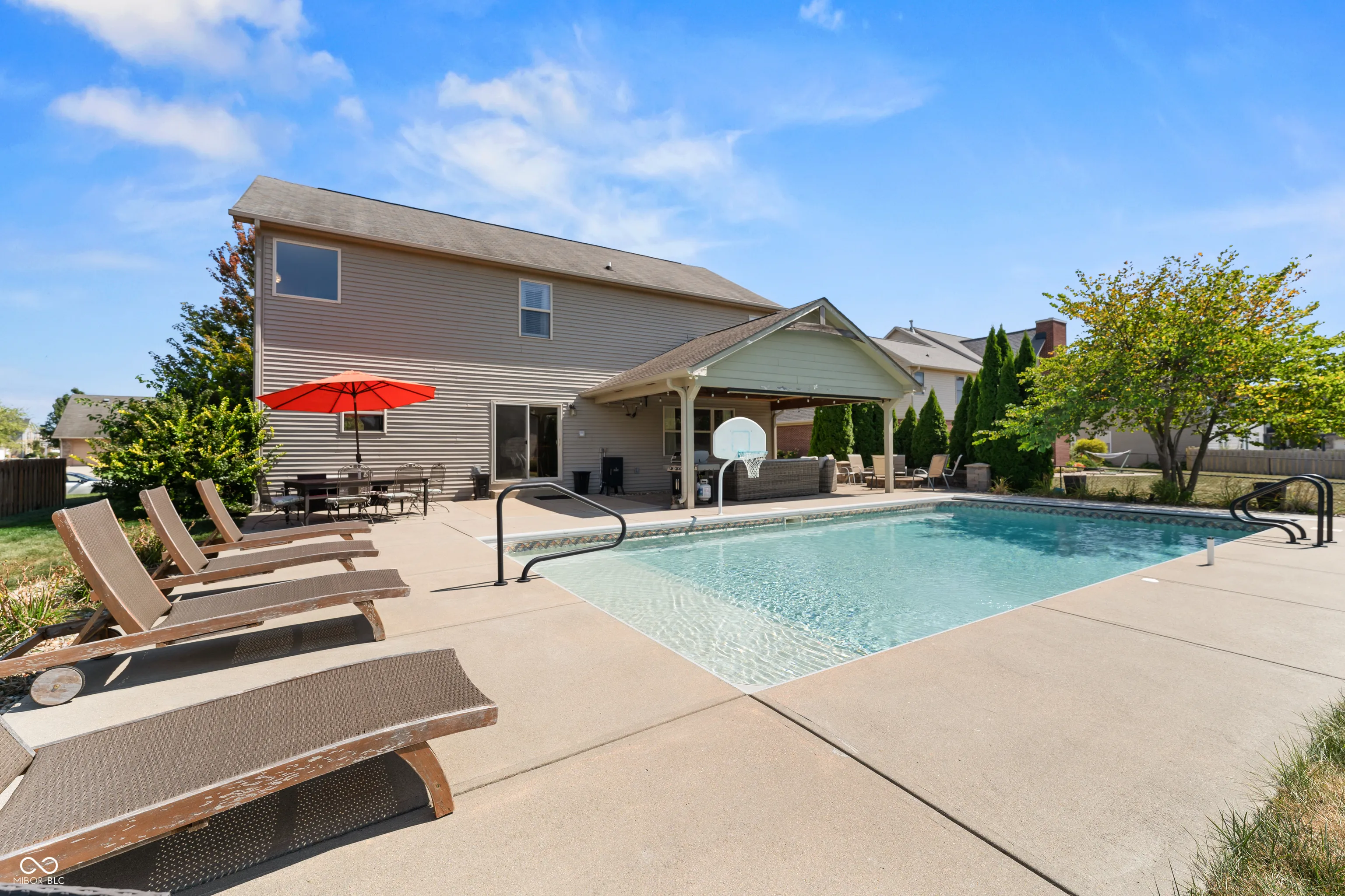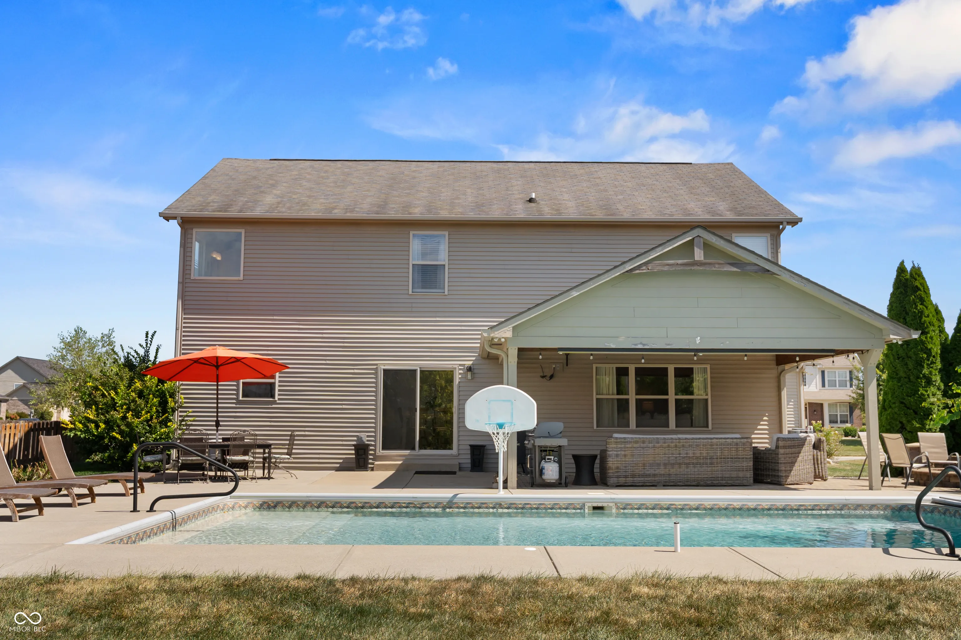 Located at 2086 Woodfield Dr., Greenwood, this single-family residence in great condition offers an exceptional opportunity for refined living. The heart of this home resides in its thoughtfully designed kitchen, where culinary aspirations take center stage; imagine preparing gourmet meals atop the stone countertops, with the backsplash adding a touch of elegance, while guests gather at the kitchen bar or peninsula, creating an inviting atmosphere for conversation and connection. In the living room, a fireplace provides a natural focal point, offering warmth and ambiance, perfect for quiet evenings spent in contemplation or lively gatherings with friends. The primary bathroom is a sanctuary, a private retreat featuring a tiled walk-in shower, where you can rejuvenate and refresh. For entertaining, the bar in the basement offers a dedicated space to craft and enjoy your favorite beverages. Beyond the main residence, the property extends into a private outdoor oasis, where a heated pool shimmers under the sun, inviting refreshing dips on warm days. The patio and outdoor dining area create a seamless extension of the living space, perfect for al fresco meals and entertaining. The outdoor living space offers a spot to relax and unwind, while the fire pit promises cozy evenings spent under the stars. An invisible fence allows for the safety of pets to be contained to the yard. The five bedrooms offer ample space for rest and rejuvenation, with the added luxury of an ensuite bathroom in one of the bedrooms. The home features a new water softener and a new sump pump with battery backup. Further enhancing the home’s appeal is a walk-in closet, providing generous storage. With three full bathrooms and one-half bathroom, convenience is paramount. Located in the highly desirable Center Grove School District.