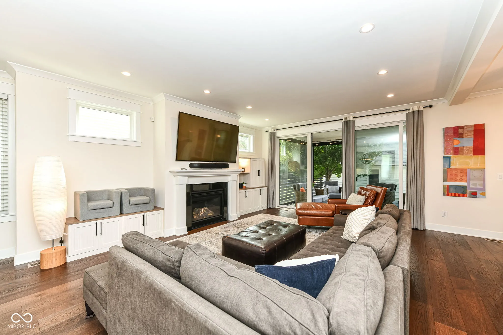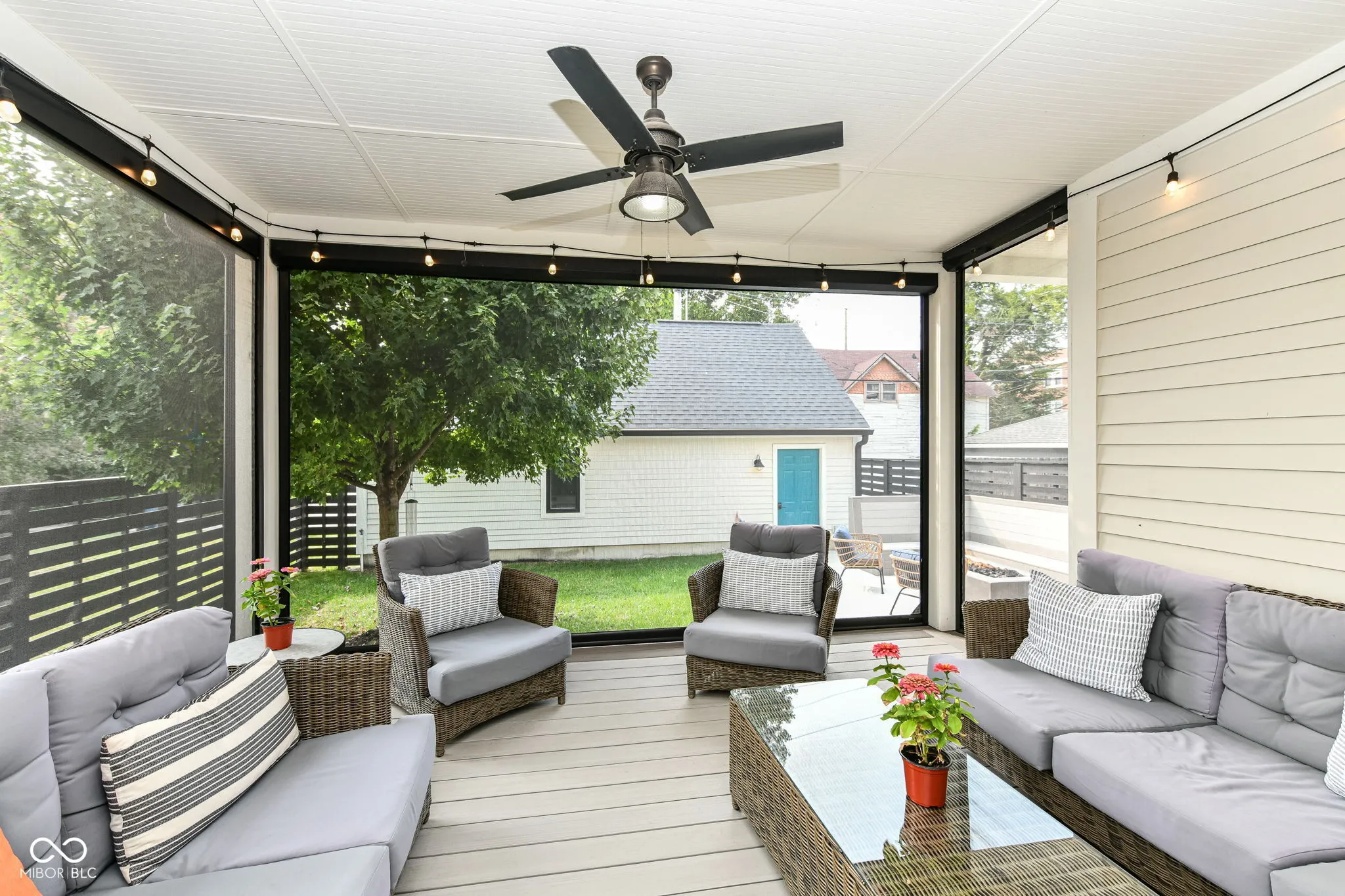 Check out this practically brand new and thoughtfully upgraded Golden Ratio built home in historical Herron Morton in Indianapolis. The sellers love this place and it shows. The covered front porch welcomes you to an open floor plan main level with gleaming hardwoods, custom cabinetry, quartz counters, large windows and a gourmet kitchen with attached pantry and mudroom. The office has a closet and can be a 5th bedroom if desired. Let’s go through the living room and out to the newly installed gas fire pit, gas built in grill, and covered back porch with retractable screens- with the push of a button- that you will love! All of which is surrounded by the fully fenced back yard. Upstairs is a spacious primary suite with walk in shower and large walk in closet. All the closets throughout the house have custom closet shelving. Two more bedrooms and a full bath plus a large laundry room round out the upper floor. The basement is fully finished with a fourth bedroom, full bath, storage, play room and utility room. The family room in the basement is rubber flooring. All of the work out equipment will be removed by sellers. The detached 3 car garage is insulated, heated, alarmed with security and an additional fully floored 600 sq/ft of attic storage.