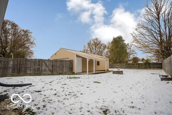 Cozy bungalow features 3 bedrooms and 1 full bath. Open living dining room and kitchen that includes electric stove microwave and refrigerator. Mechanical Room – Laundry Room includes washer and dryer. Replacement windows. New septic 2024; New AC motor 2025; New Water Heater 2025. Really nice metal pole barn garage (approx 28×26) with gravel drive; automatic door opener; cement floors; wood stove for heat and a cozy covered porch. Totally fenced in back yard.