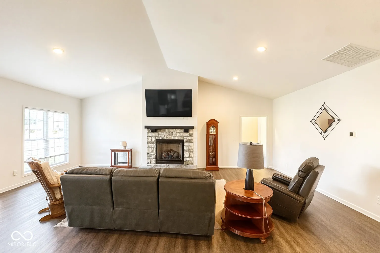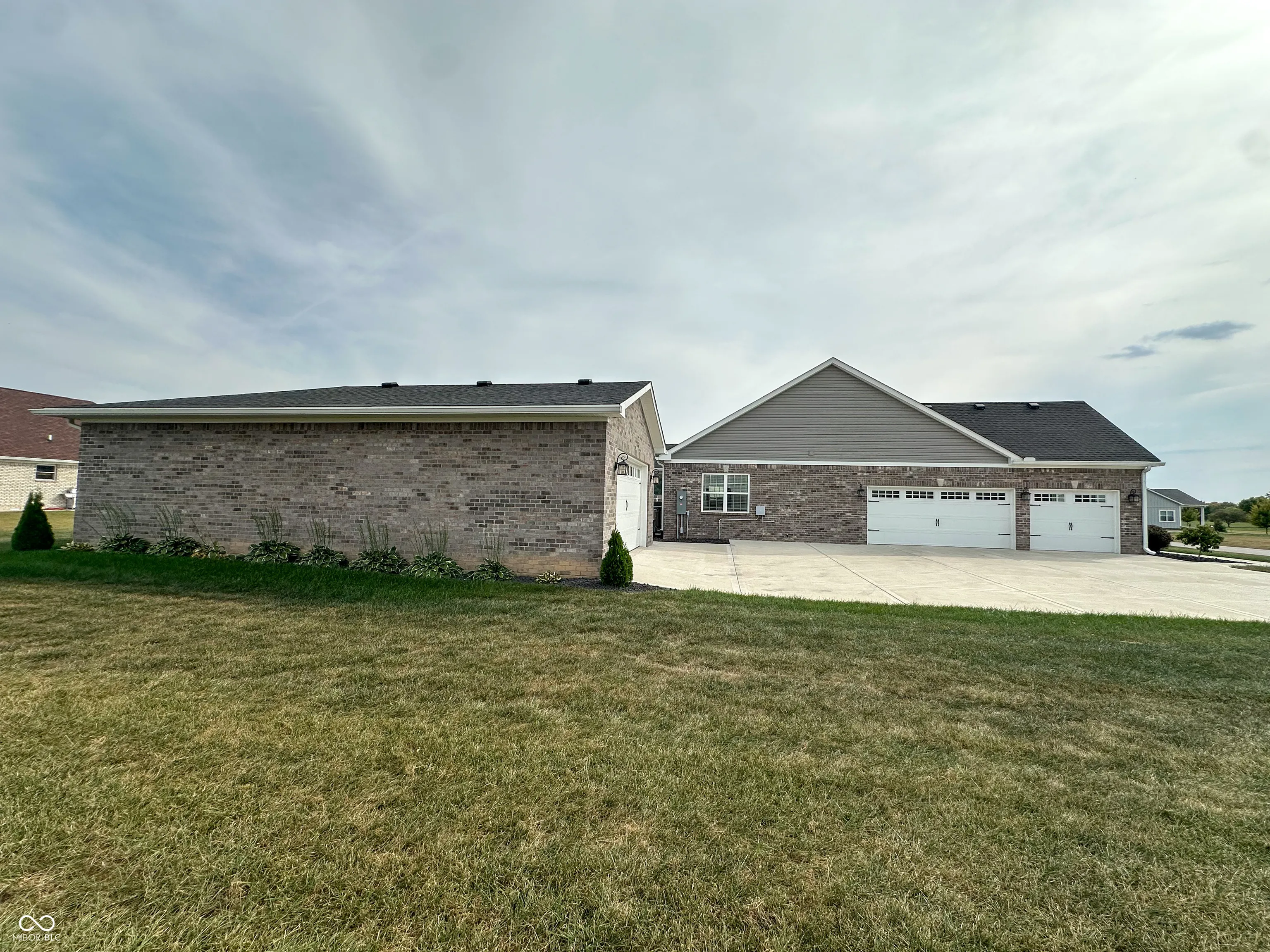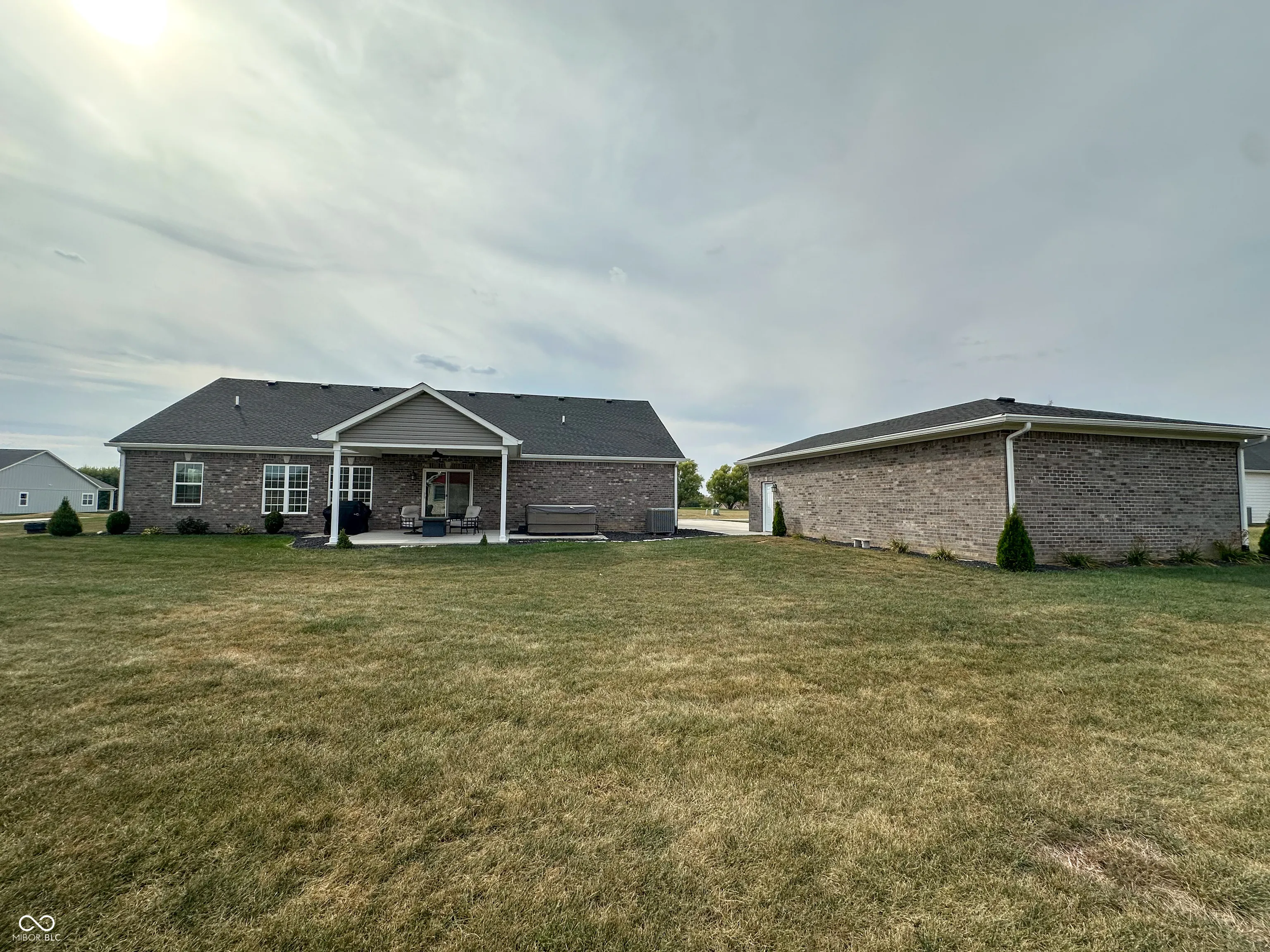Welcome to this beautiful 4-bedroom, 2.5-bath home offering 2,160 sq. ft. of open-concept living on a .5-acre lot. Built in 2021, this property blends modern design, thoughtful upgrades, and everyday functionality. Inside, a spacious foyer opens to the vaulted great room with a stone fireplace and abundant natural light. The kitchen is designed for both style and function with granite countertops, soft-close cabinetry, a walk-in pantry, and modern light fixtures. The dining area flows seamlessly into the living space, perfect for gatherings and entertaining. Off the kitchen, you’ll find a convenient half bath and laundry room leading to the attached 3-car garage. The split floor plan includes 3 guest bedrooms, each with walk-in closets, plus a full bath with shower/tub combination, and linen storage. The primary suite features dual walk-in closets, a spa-inspired bath with walk-in tile shower, granite countertops, and an additional linen closet. Bathrooms and kitchen are all finished with soft-close cabinetry for a refined touch. Additional features include vinyl plank flooring throughout, custom blinds, and neutral paint tones. The fourth bedroom is currently used as a home office, offering flexibility for work or guest space. Outdoor living is equally impressive with a covered patio, Bullfrog 8-person hot tub perfect for relaxing and entertaining. The curb appeal shines with thoughtful landscaping, upgraded stone accents, and a wide concrete driveway. A 24×40 detached brick garage with insulation and 100-amp service provides excellent storage and workspace. A water filtration system, and upgraded finishes, including tile in all baths and granite counters in both kitchen and baths add even more value. Enjoy golf course views and easy access to the cart path, clubhouse, and walking trail. The downtown square provides the perfect small-town charm with shops, dining and a welcoming local taphouse. *Select photos are virtually staged for visualization purposes only.