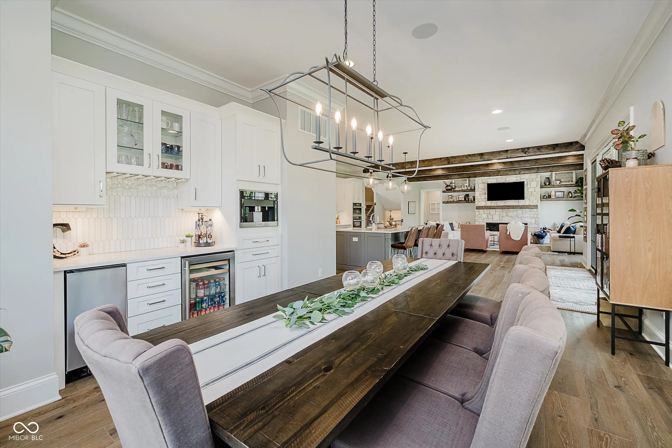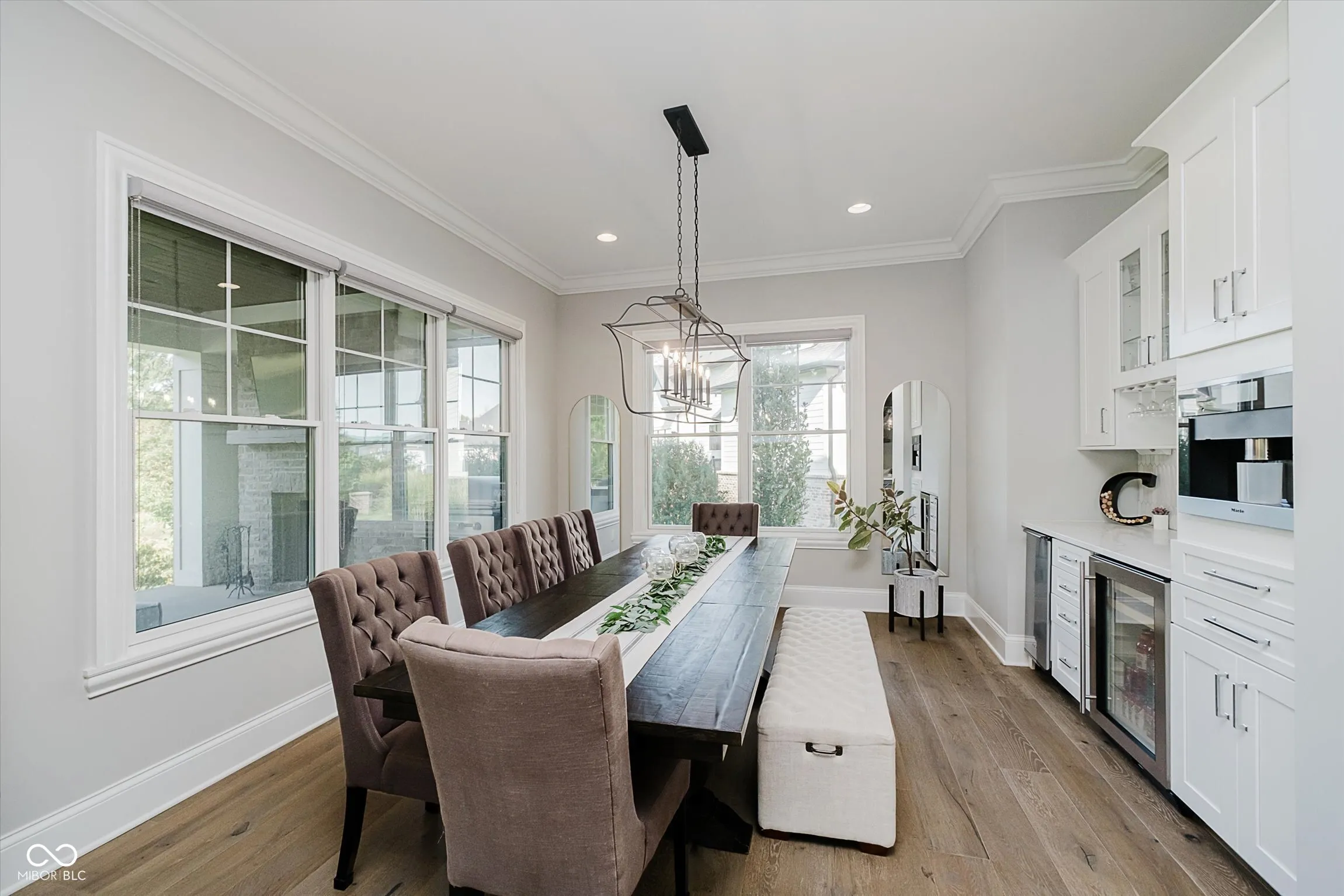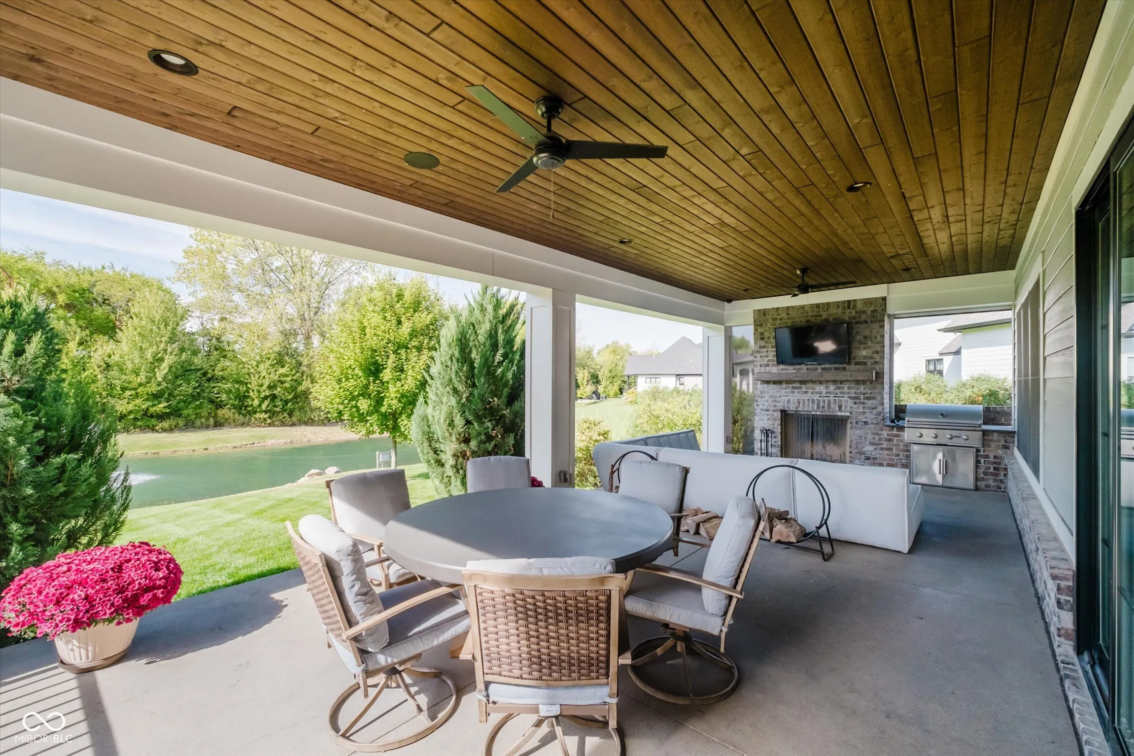 Welcome to this thoughtfully designed home in Chatham Hills, offering over 6,500 square feet of finished living space with 6 bedrooms and 4.5 baths. The home balances everyday comfort with unique custom features, making it ideal for both quiet living and entertaining. Inside, the open-concept layout showcases a large quartz kitchen island crafted from a single slab, prep kitchen area with 2nd sink, Miele appliances including a gas range w/ pot filler, steam oven, dual microwave, built-in coffee maker, and Electrolux fridge. A dedicated craft room, custom office built-ins, and a kids’ play nook under the stairs add functionality and charm. The lower level includes a bar with a serving window to the custom wine room, a spacious recreation area, and plenty of unfinished storage. The primary suite features a custom ceiling design, spa-like bath, and walk-in closet with quartz surfaces and convenient stacked washer and dryer. Additional details include Dolby Atmos 9.1 surround sound, an Elan home automation system with touch-screen controls, and built-in speakers throughout multiple zones. Dual HVAC systems provide three zones for energy-efficient comfort. The heated 4-car garage includes a basketball goal and space for year-round activity. Outdoors, the covered porch with retractable screens extends the living space, featuring areas for dining and relaxation by the fireplace and TV, alongside an outdoor kitchen for gatherings. The private backyard backs to a pond and tree line, creating a tranquil setting. Irrigation in front and back as well as an invisible dog fence. Upstairs, three bedrooms and a bonus room provide flexible living space, while thoughtful wall treatments and built-ins elevate the design. This home combines modern convenience with custom finishes, offering a setting that is both distinctive and livable within the vibrant Chatham Hills community.