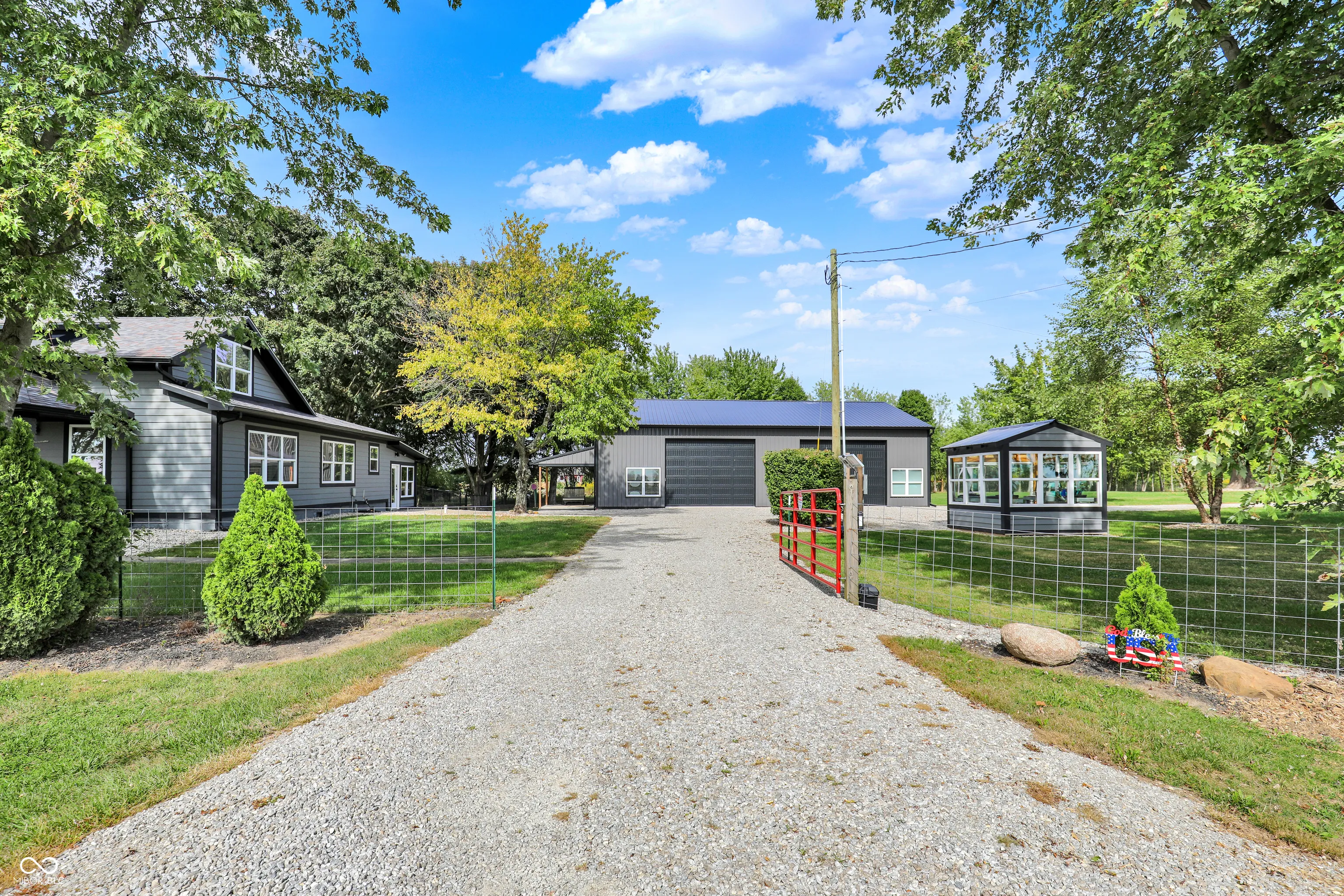 Set on 4.39 acres of peaceful countryside, this beautifully renovated home offers the best of modern comfort and country living. Rebuilt from the frame up in 2023, everything is brand new – including the roof, siding, windows, well, doors, electrical, plumbing, spray foam insulation, drywall, kitchen, baths and much more. You’ll enjoy the peace of mind of a new home with the character and charm of a country retreat. Inside, the open floor plan is bright and inviting with upgraded trim, stylish doors, and thoughtful finishes throughout. The kitchen is a showpiece with abundant cabinet space, soft-close doors and drawers, a pantry, and a large island perfect for gathering. The main level features two bedrooms, while the upstairs includes an additional bedroom and a versatile sitting room that could easily serve as a fourth bedroom or home office. A spacious laundry room makes everyday living easy. Outdoors, the property shines with a nearly new 40×60 pole barn (built in 2023) featuring 14′ ceilings, 12′ overhead doors, and an insulated metal ceiling – ideal for equipment, hobbies, or storage. You’ll also find a charming older barn with new metal siding and roof, a greenhouse, and even a unique grain bin gazebo for relaxing or entertaining. The acreage is mostly fenced with two gated driveways, including a convenient electric gate at the main entrance. With nearly 1,100 feet of road frontage and plenty of space between the home and outbuildings, you’ll have privacy, functionality, and room to grow. This property is more than a home – it’s a lifestyle. Ready for its next chapter, it’s truly a rare find in today’s market.
