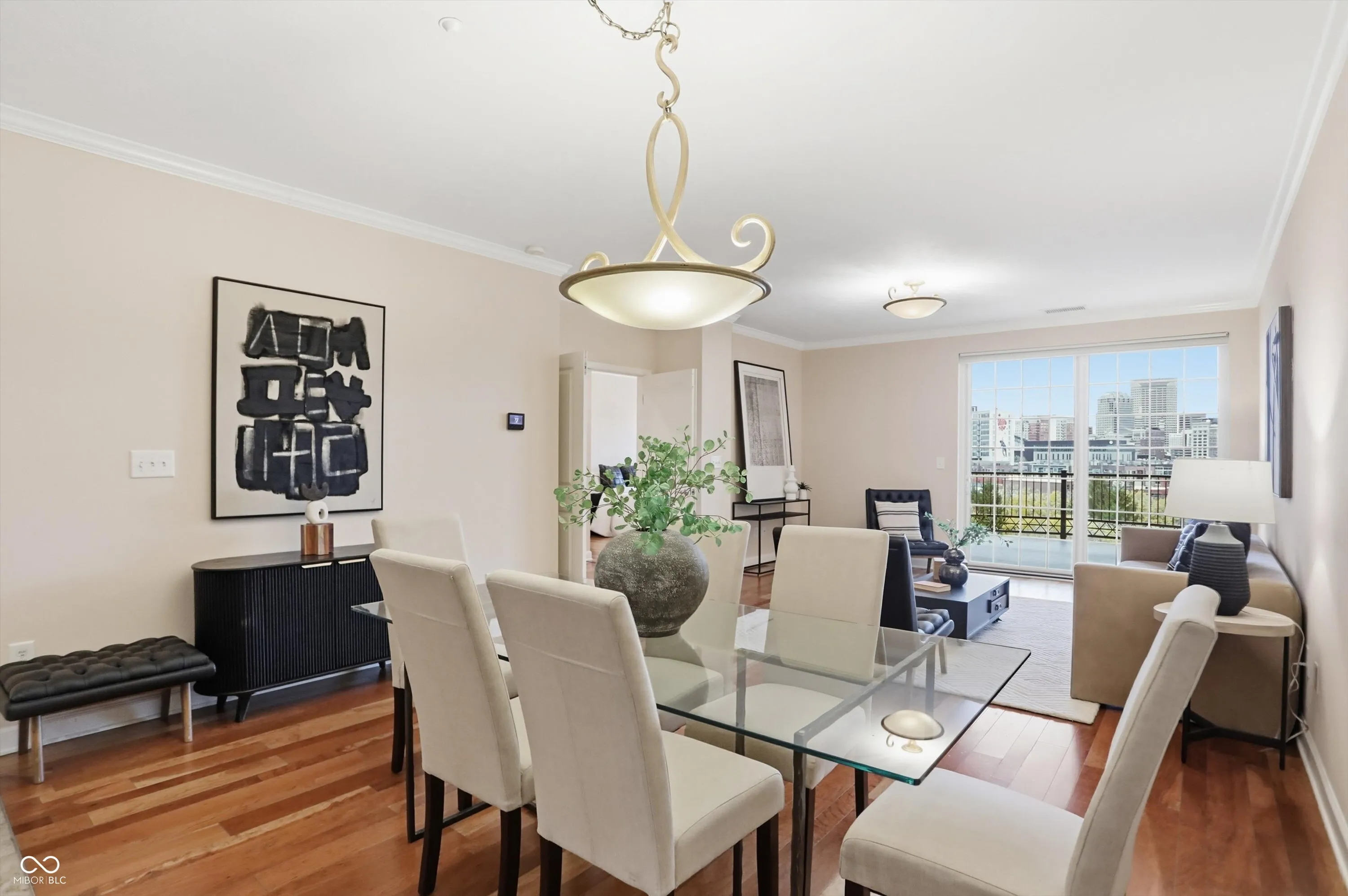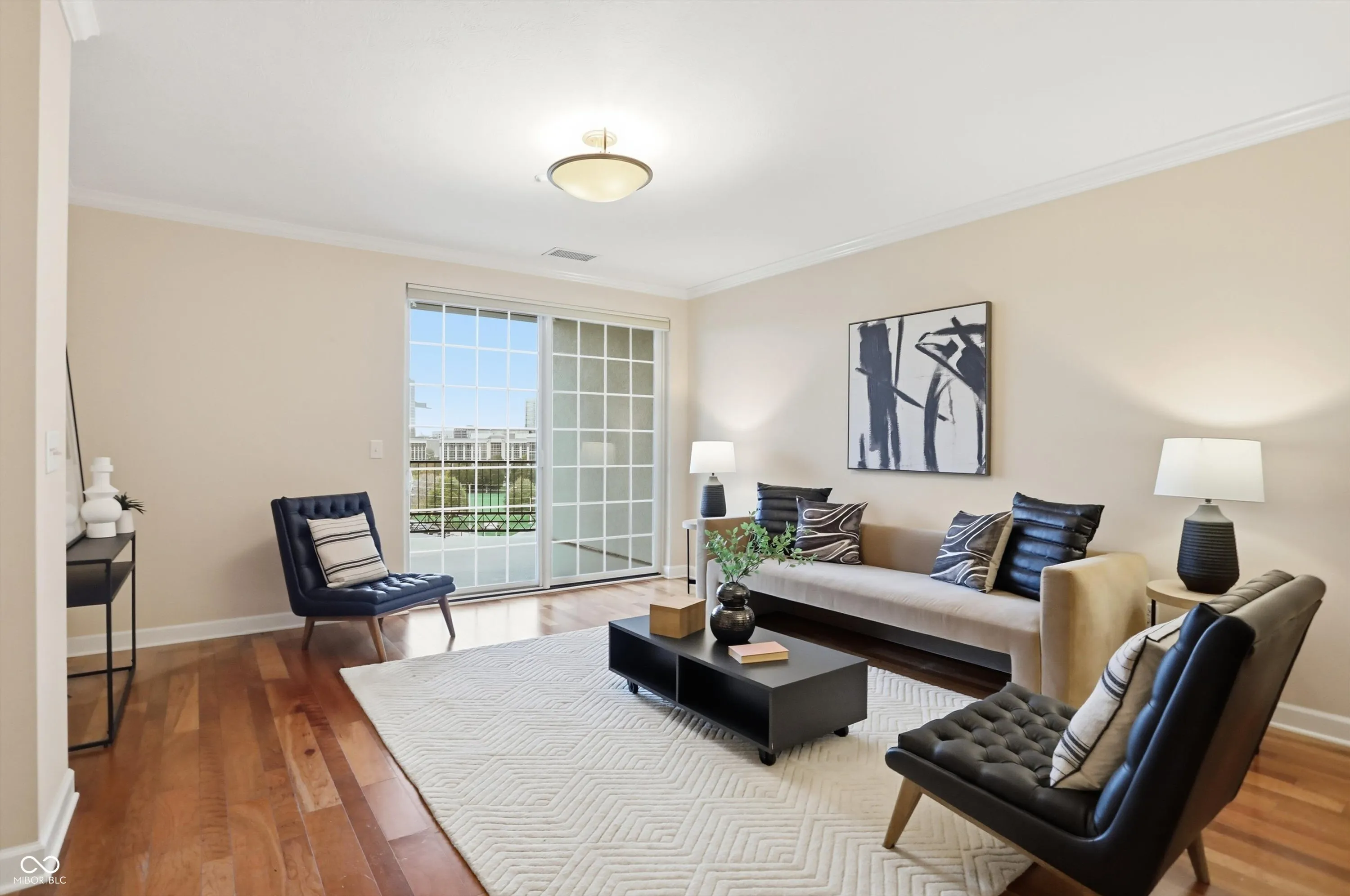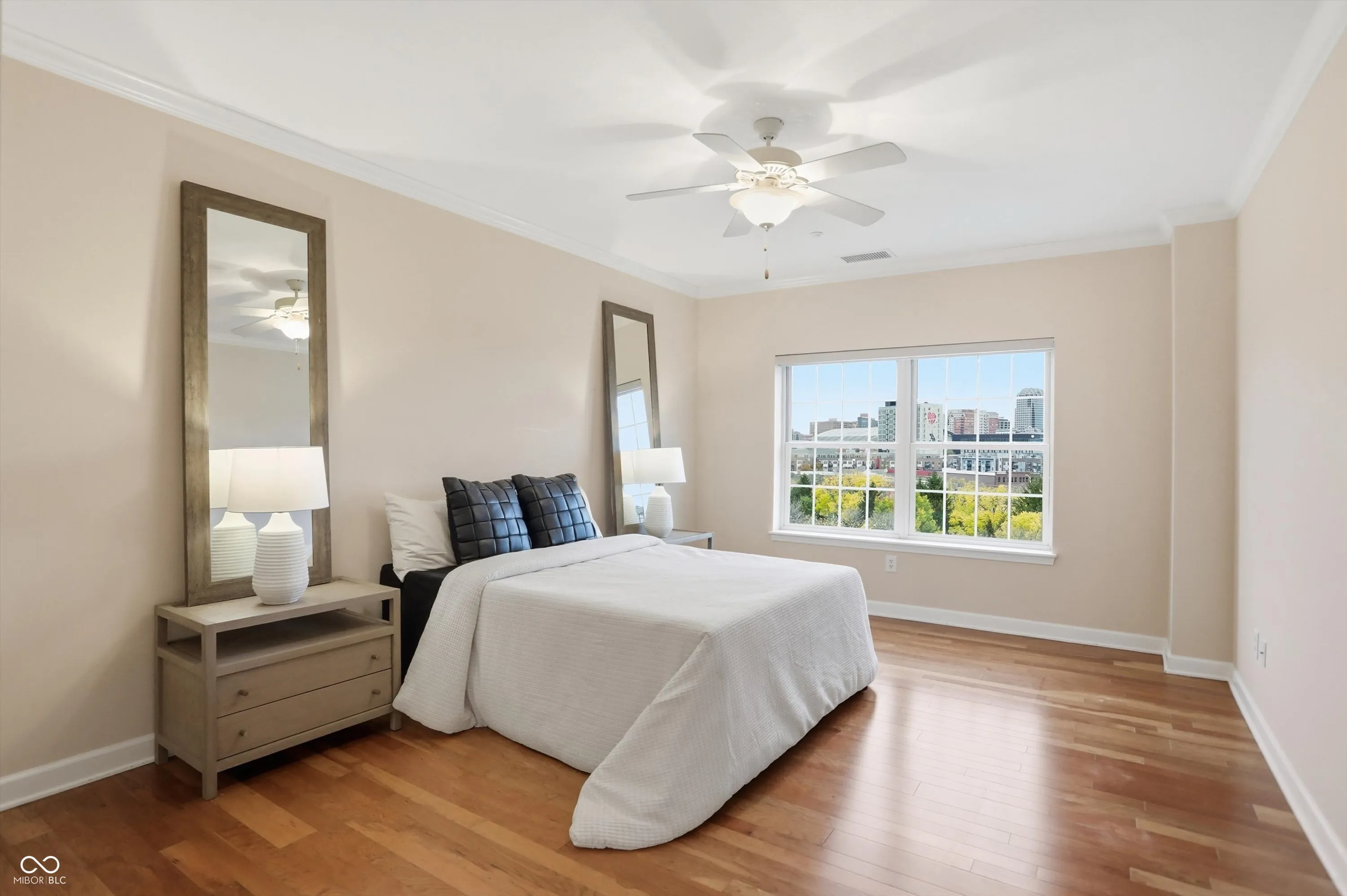 The views are amazing from here! Enjoy your beautiful condo downtown on the Cultural Trail, close to Lucas Oil, Gainbridge and all that downtown has to offer. One of the middle units has 3 bedrooms, 2 full baths, and a primary bedroom with spectacular windows to overlook the skyline. Hardwood floors throughout the living area and tile kitchen and bath floors. Walk in closets in two of the bedrooms. A large storage area with shelving located on the third floor next to the exit to your two parking spaces. Guest parking on the 4th floor. A fitness center on the 5th floor. Pick up and drop off dry cleaning located in the fitness center. Secure outdoor pool, hot tub and kitchen to enjoy. Spacious common areas. Hasuno restaurant, hair salon, dental office and Golo golf located on main level of this building. Protected mail room for all deliveries. Don’t miss the opportunity to see this great condo!