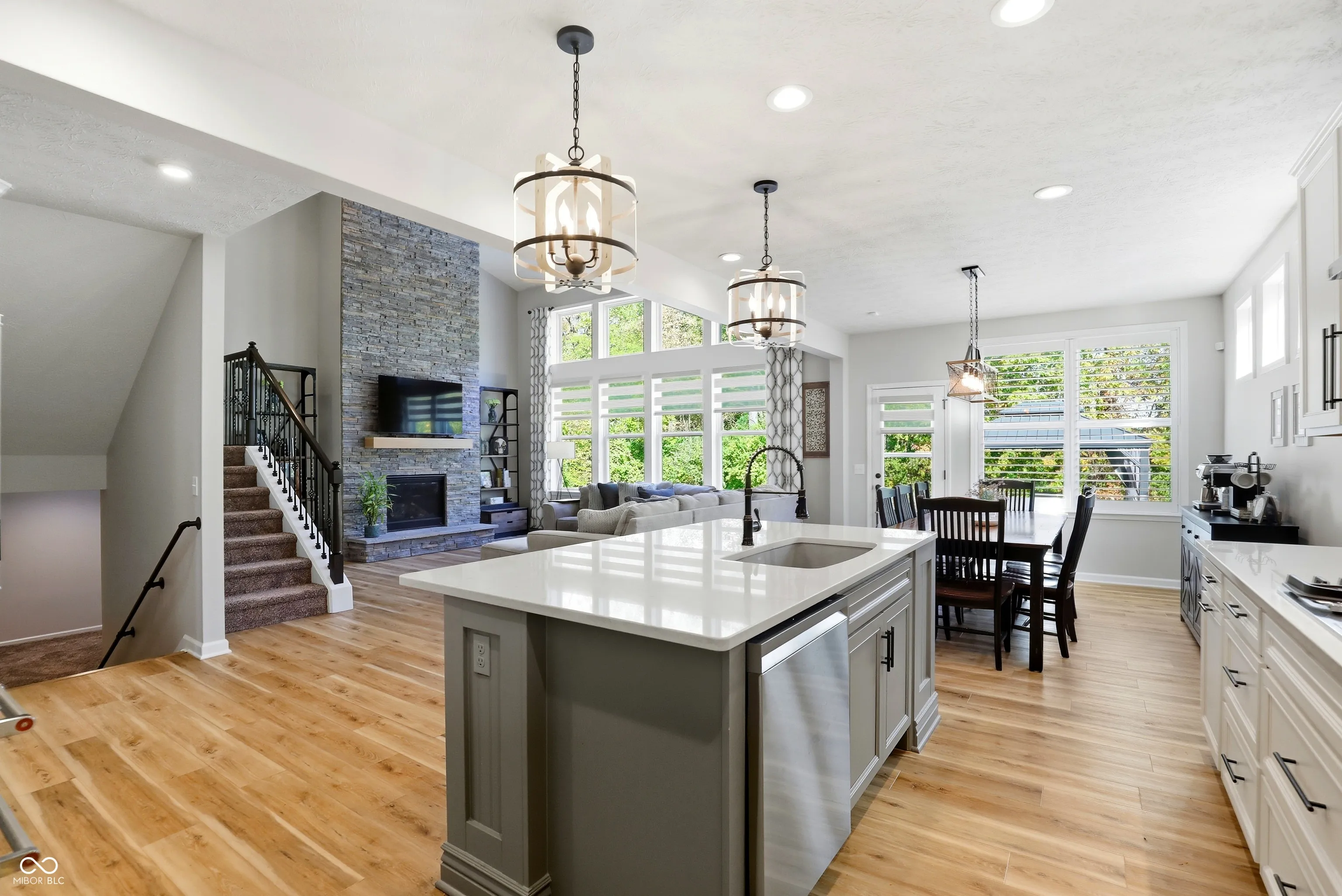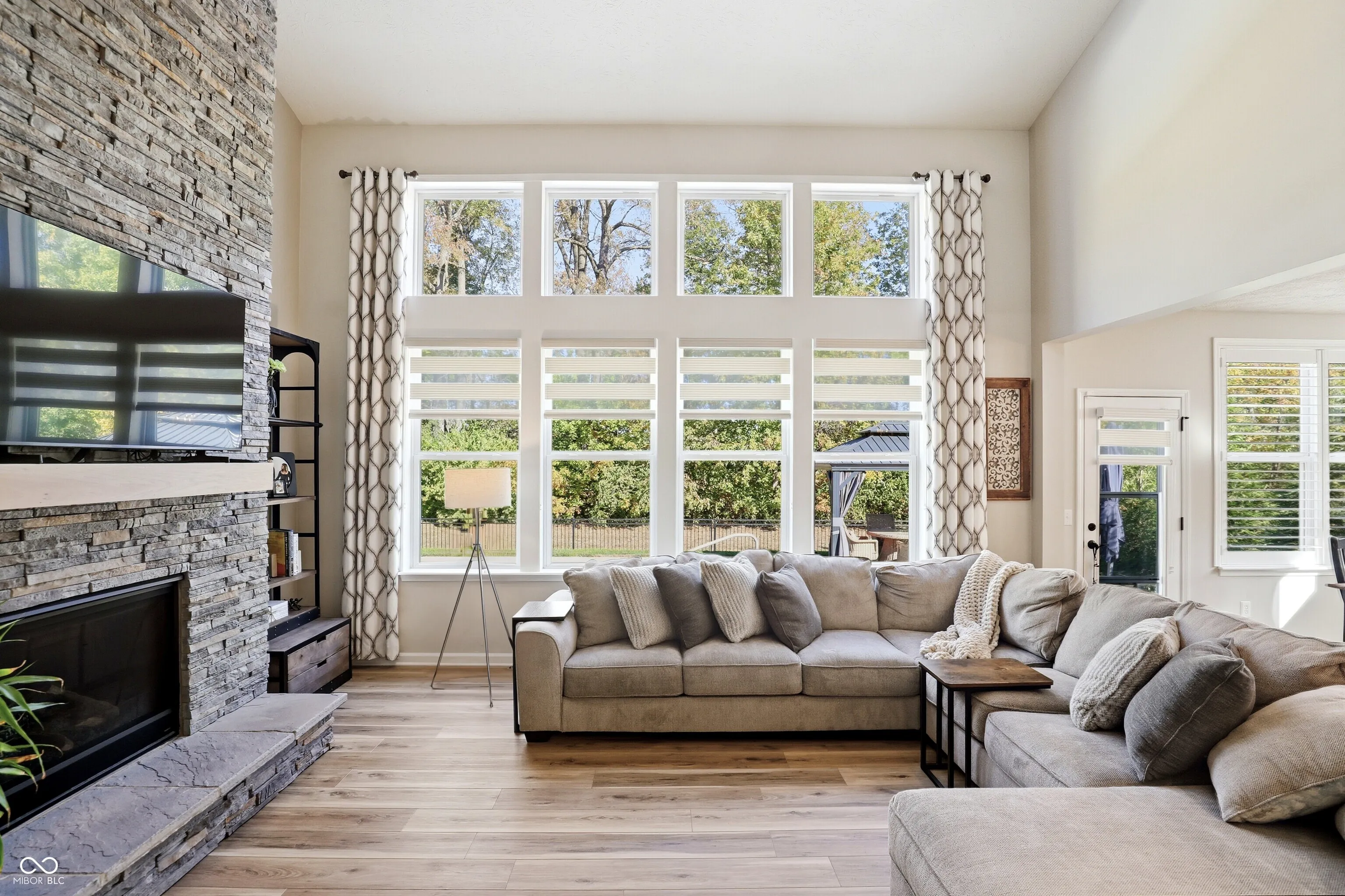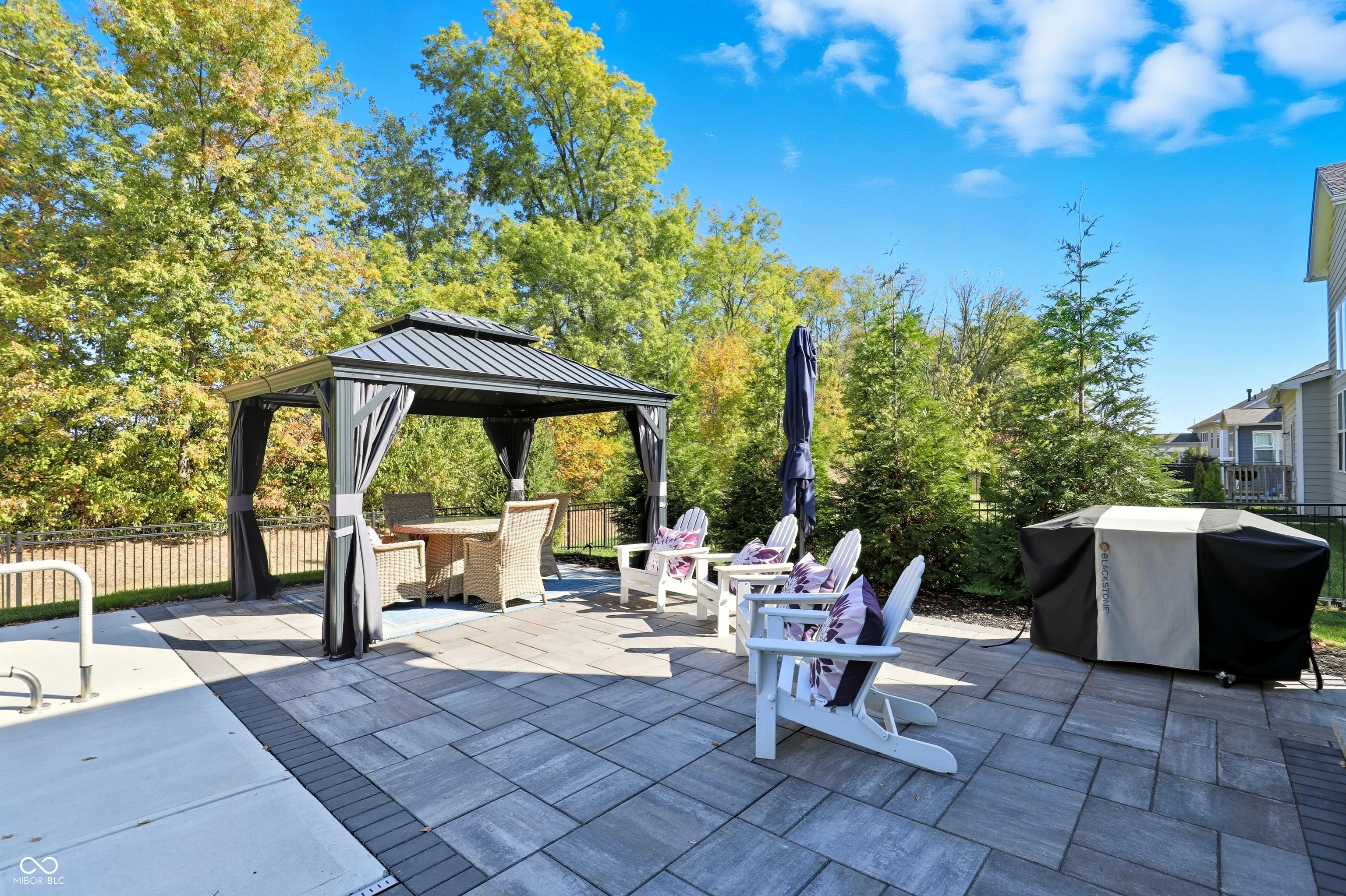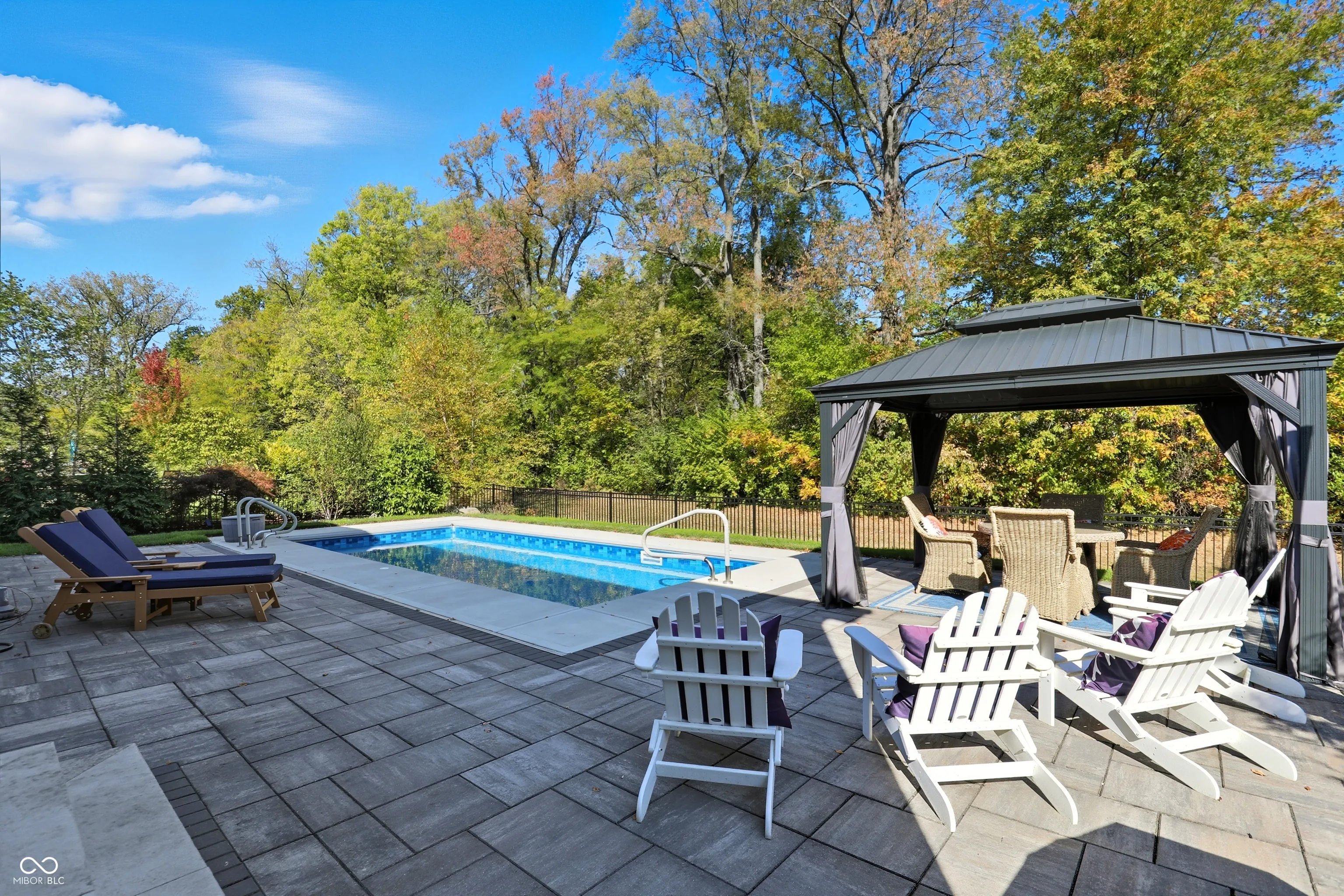 Tucked in Noblesville’s Wood Hollow community, this beautifully updated 4-bedroom, 3.5-bath home blends modern comfort, refined finishes, and exceptional outdoor living. Set on a quiet cul-de-sac and backing up to mature trees, it offers both privacy and a peaceful backdrop that enhances every view. The inviting open floor plan centers around a stunning 2-story great room with a floor-to-ceiling stone fireplace and walls of windows that fill the space with natural light. The gourmet kitchen features new countertops, sink, backsplash, and dishwasher, complemented by a large center island and adjoining dining area-perfect for everyday living and effortless entertaining. A flexible rec room adjoins the main living space, while the split floor plan provides privacy for the spacious primary suite, complete with a spa-like bath and custom closet system. The newly finished lower level expands the home’s functionality, offering a full wet bar, full bath, and generous living area ideal for guests, a home theater, or fitness space. Step outside to your private, fenced backyard retreat featuring a resort-style pool, paver patio, and elegant gazebo for shaded relaxation. Additional updates include new LVP and carpet, plantation shutters, cased windows, smart thermostat, Ring security system, and refreshed landscaping with added trees and lighting. With more than $250K in thoughtful improvements, this move-in ready home embodies modern comfort, timeless style, and an effortless sense of tranquility. Welcome home to Wood Hollow.