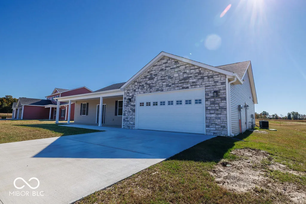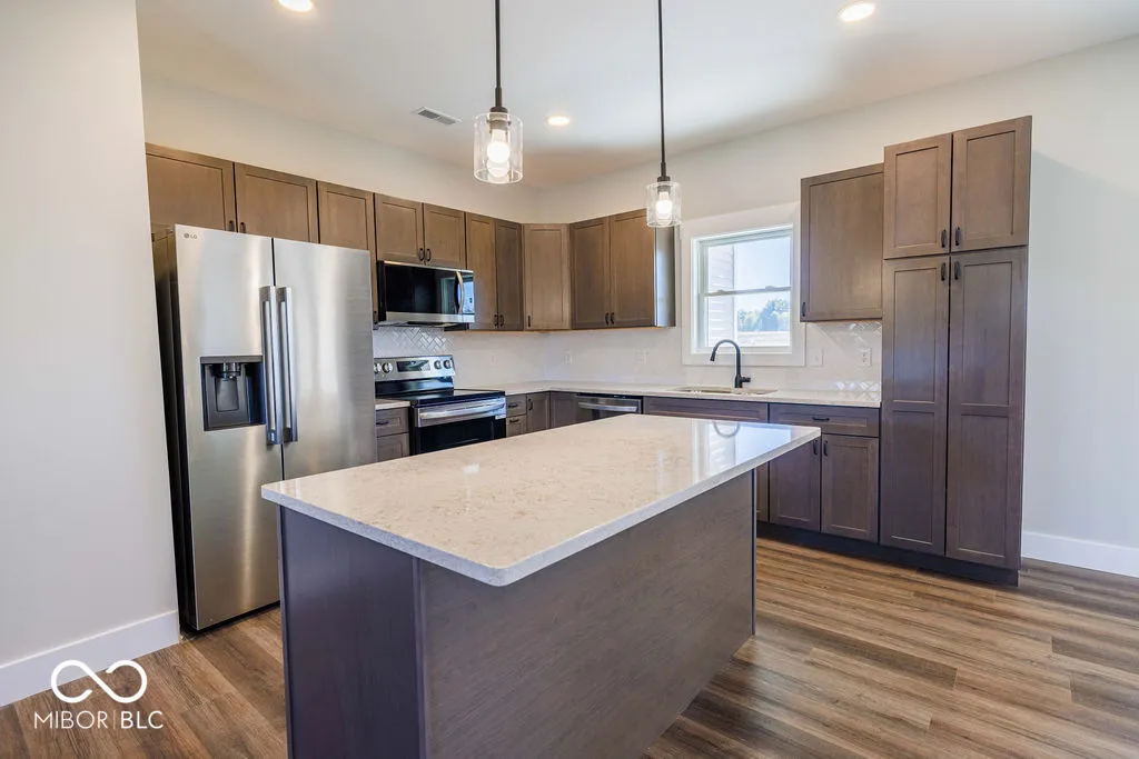 OPEN HOUSE, Sunday April 12, 1-3 pm. Welcome to The Lily, a thoughtfully designed 4-bedroom, 2-bath new construction home in the growing Four Oaks subdivision of Spencer, Indiana. The open-concept layout paired with a split-bedroom floor plan offers the perfect balance of connection and privacy. The kitchen is designed for both everyday living and entertaining, featuring a large island, solid wood cabinetry, stainless steel appliances, and durable quartz countertops. Sliding doors open to a covered porch, ideal for morning coffee, outdoor meals, or unwinding at sunset. The primary suite serves as a private retreat with a walk-in closet, dual-sink vanity, and a tiled walk-in shower. Throughout the home, luxury vinyl plank flooring adds style and easy maintenance, while the spacious 8×11 laundry/mudroom and 2-car attached garage add everyday convenience. A washer and dryer are included, making move-in effortless. Set in the Four Oaks community, residents enjoy small-town charm with a wide-open country feel, friendly neighbors, and peaceful surroundings, all just minutes from Spencer and a short drive to Bloomington’s shopping, dining, and entertainment. The Lily at Four Oaks brings together smart design, modern comfort, and the warmth of small-town living.