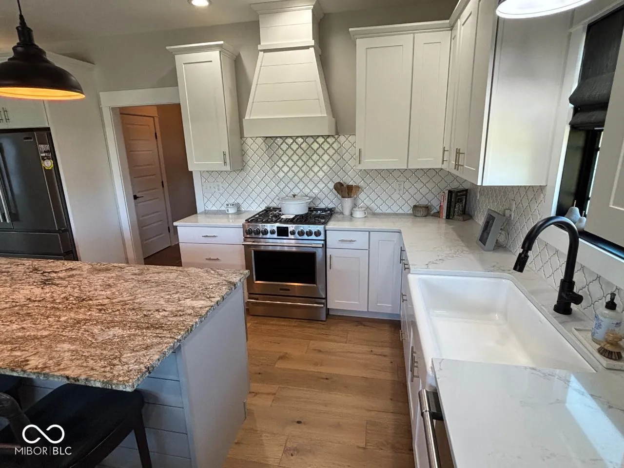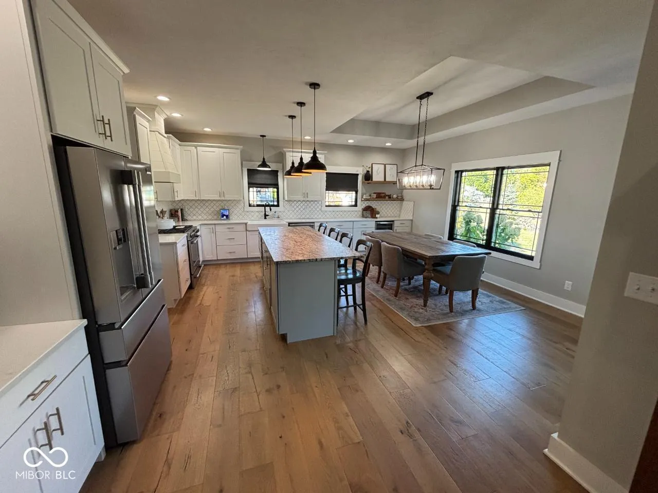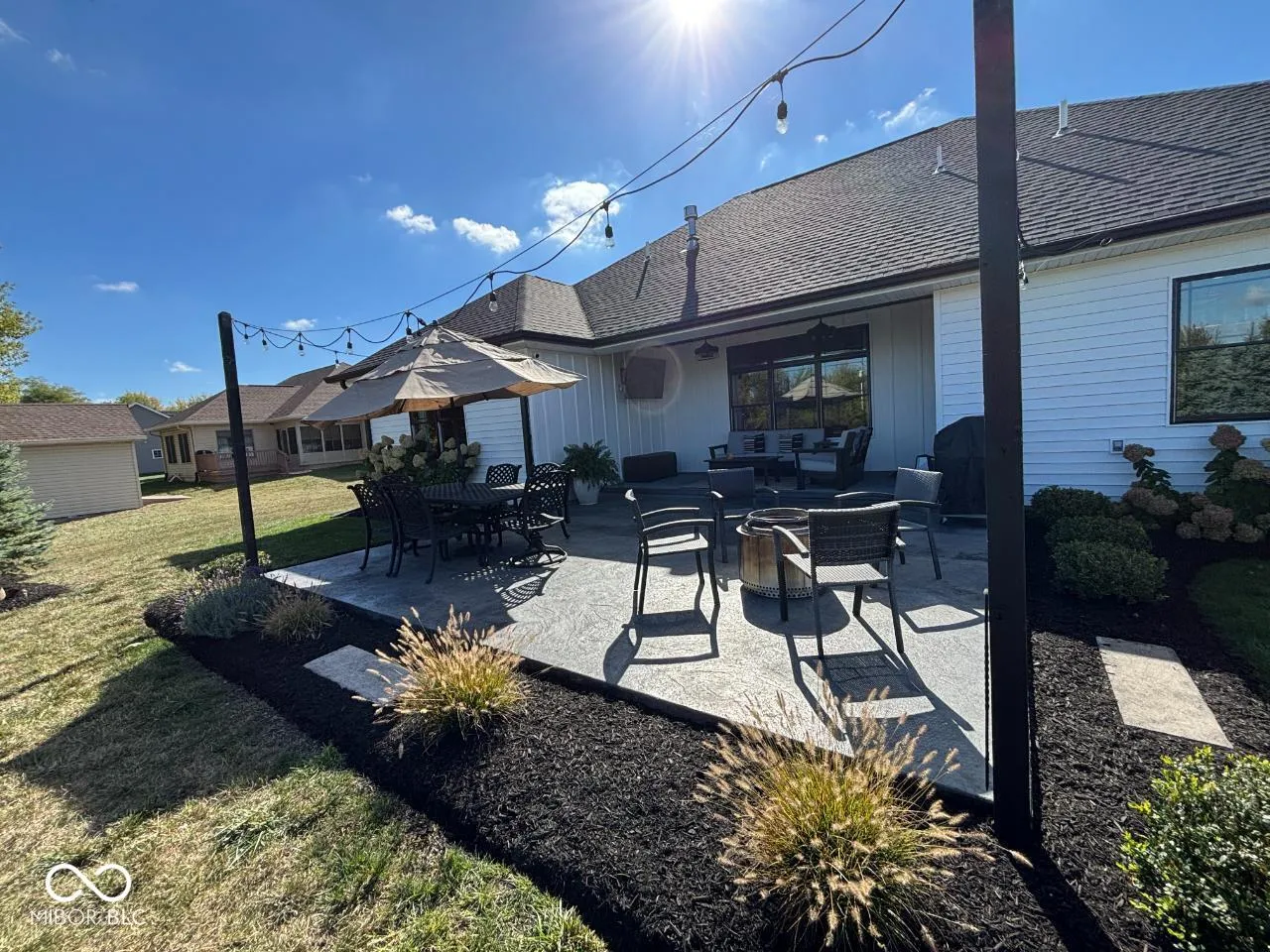 This stunning 3-bedroom, 2-bath modern farmhouse offers the perfect blend of style, comfort, and convenience! Step inside to a bright open layout with 11-foot ceilings, engineered wood flooring, and pond views from the great room, kitchen, and primary suite. The great room centers around a cozy gas-log fireplace, while the kitchen shines with quartz countertops, an 8-foot granite island with bar seating, soft-close cabinetry with roll-out shelves and built-in mixing stations, and a walk-in pantry. The primary suite features a tray ceiling, spacious walk-in closet, and a luxurious bath with a 5×7 full ceramic dual-head shower and double vanity. Enjoy peaceful pond views from the covered patio or the beautiful 20×23 stamped and stained concrete patio-perfect for entertaining or relaxing. Easy access to the Cardinal Greenway completes this exceptional property.