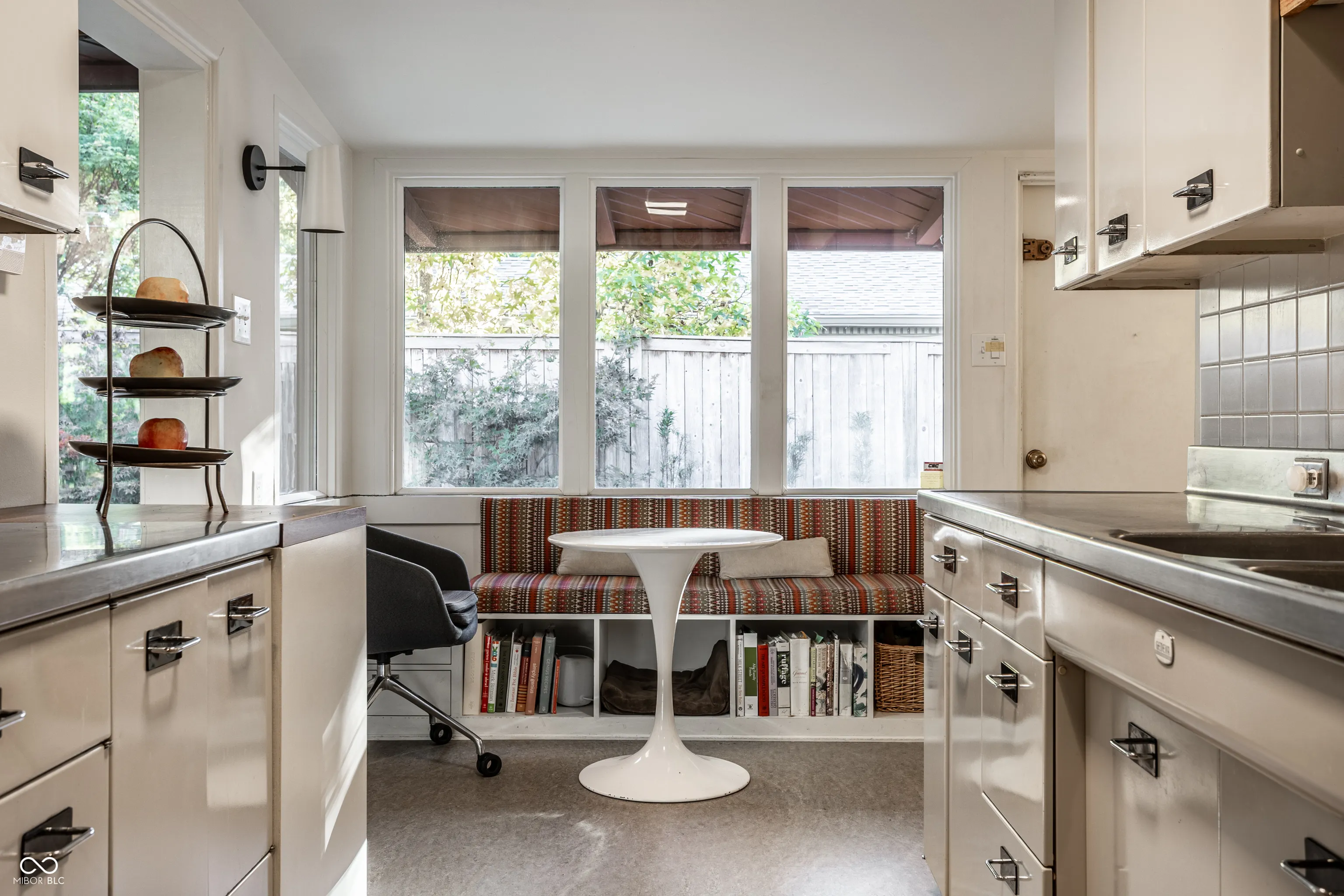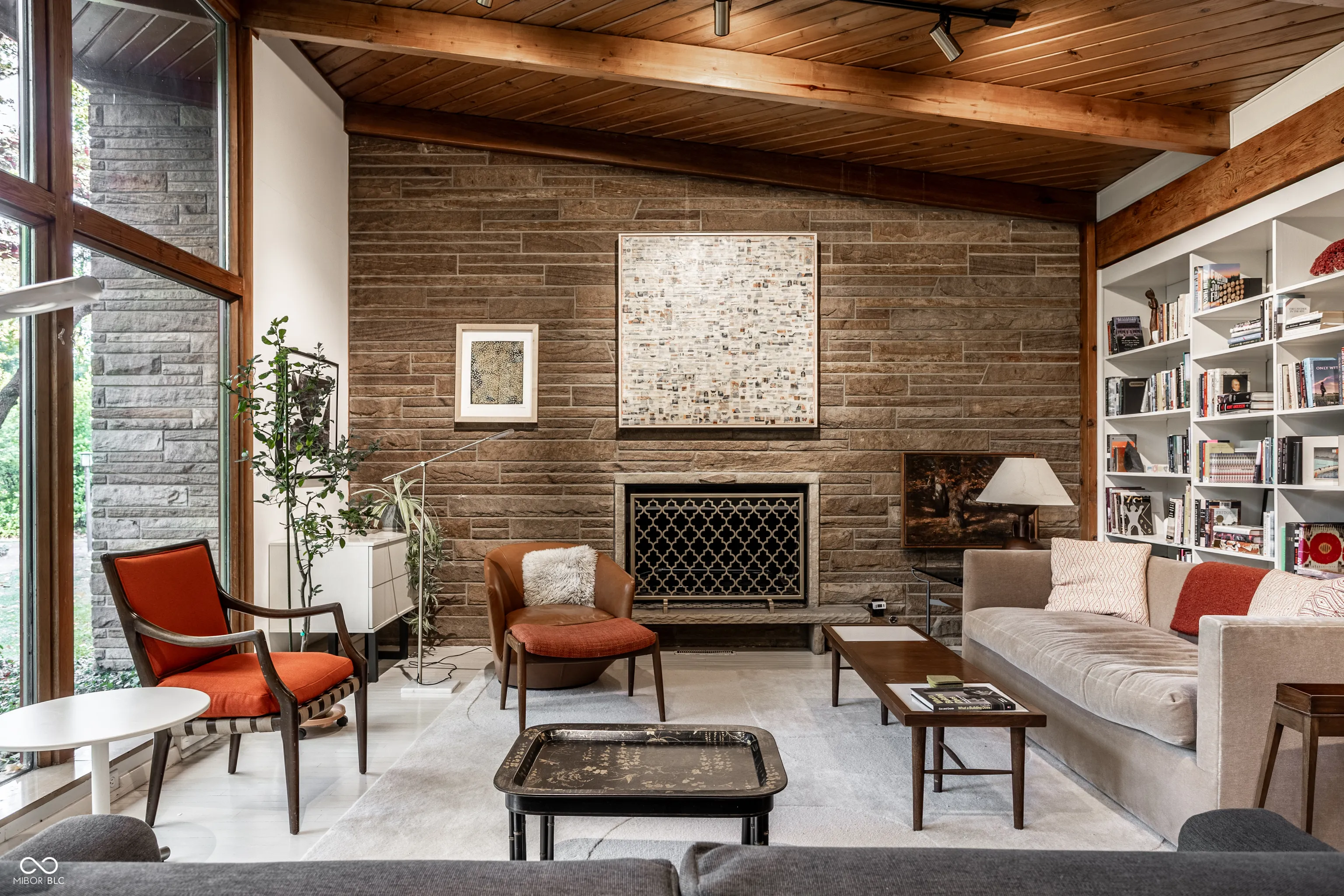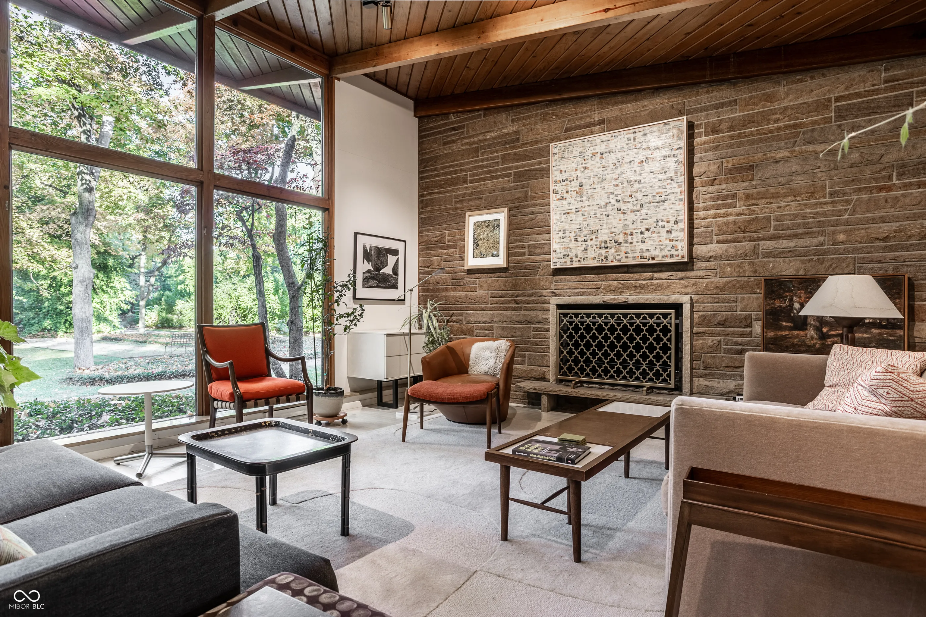 MID-CENTURY MODERN in heart of Meridian-Kessler; 3 BR/2.5 baths; 11-foot floor-to-ceiling windows overlook park-like front lawn with mature trees, Koi pond and bocce court; post-and-beam construction; light-filled house remains true to 1953 (original SS kitchen counters and cabinets, built-ins throughout house) but is also tastefully updated – with a significant addition (designed by Mark Demerly, built by Bly Bennett 2018), new membrane/commercial grade roof (2015), new HVAC system (2025), new kitchen appliances (2024). Backyard consists of a large, private, walled, professionally landscaped garden and patio designed for entertaining/dining.