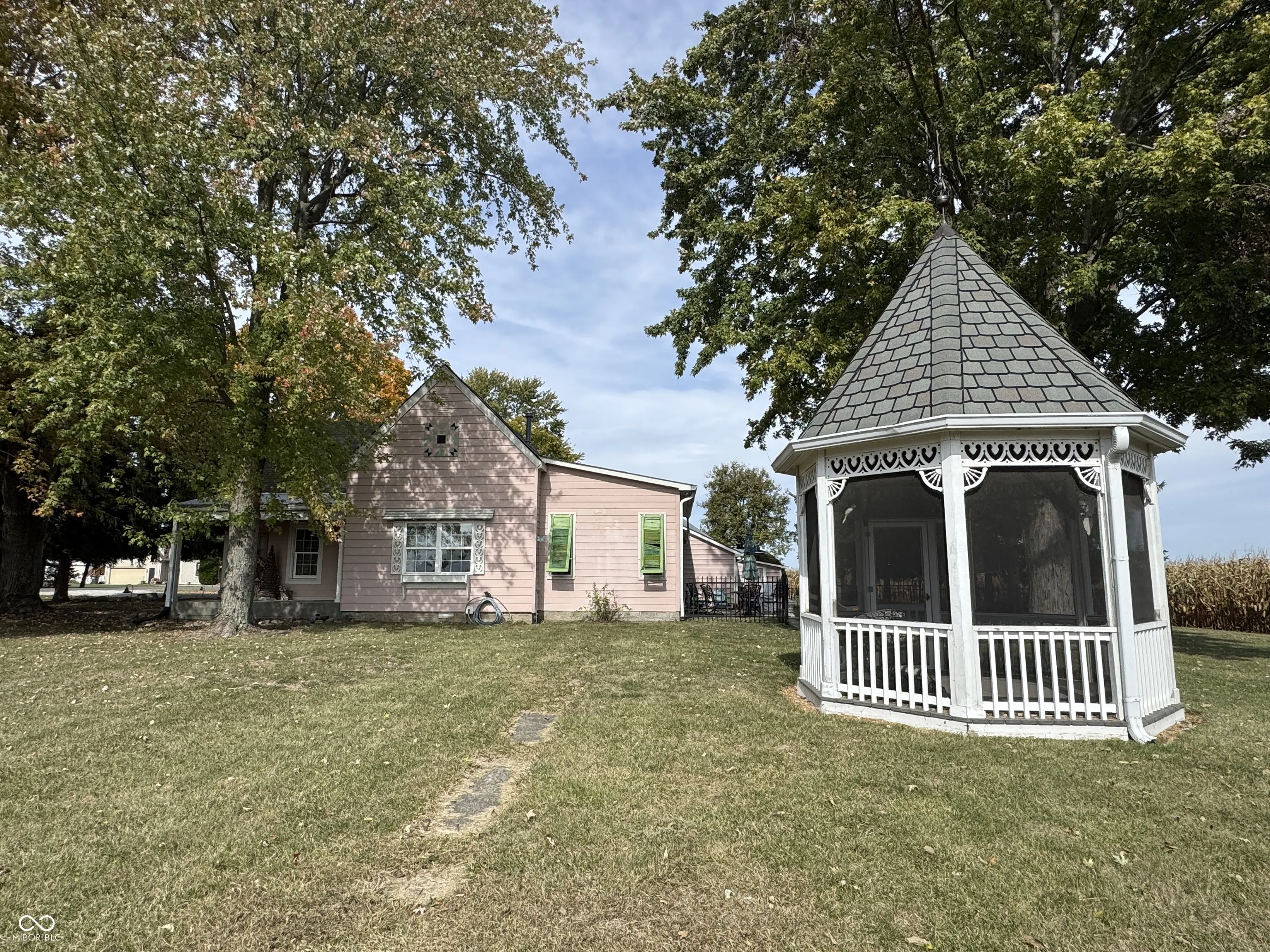 Quaint farmhouse nestled in the middle of cornfields in the western quadrant of Hancock County. Close to most everything. Perfect for the hobbiest who is looking for an abundance of shop/garage space. 25×30 tall workspace, 12×20 garage, 11×20 garage, 6×8 and a 7×5 breezeway AND lets not forget the old portion of a grain bin that is used for storage as well as a conversation piece. So many cute quirks to this home from the pink well house, grain bin, the covered porch on the back of the barn offering a ton of privacy, a gazebo and a backyard entertaining area. Home has had many updates that you will see while touring the home from some of the new floors, windows, bathroom and some kitchen upgrades. This home is full of charm from the pink exterior to the glass knobs on the doors. Home is a part of an estate and is still currently being cleaned out. Some items may remain. Sink in breezeway is excluded as is the light post of front. NO FHA offers. Water softener is leased through Frey. Buyer can either call and make arrangements or seller can have removed. Back on the market due to buyers financing.