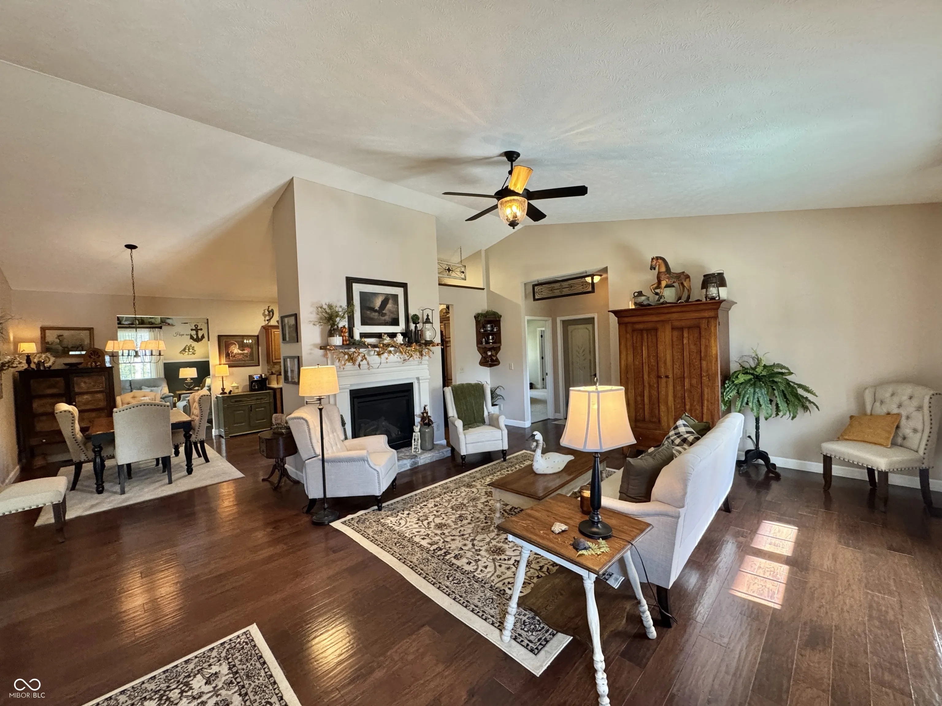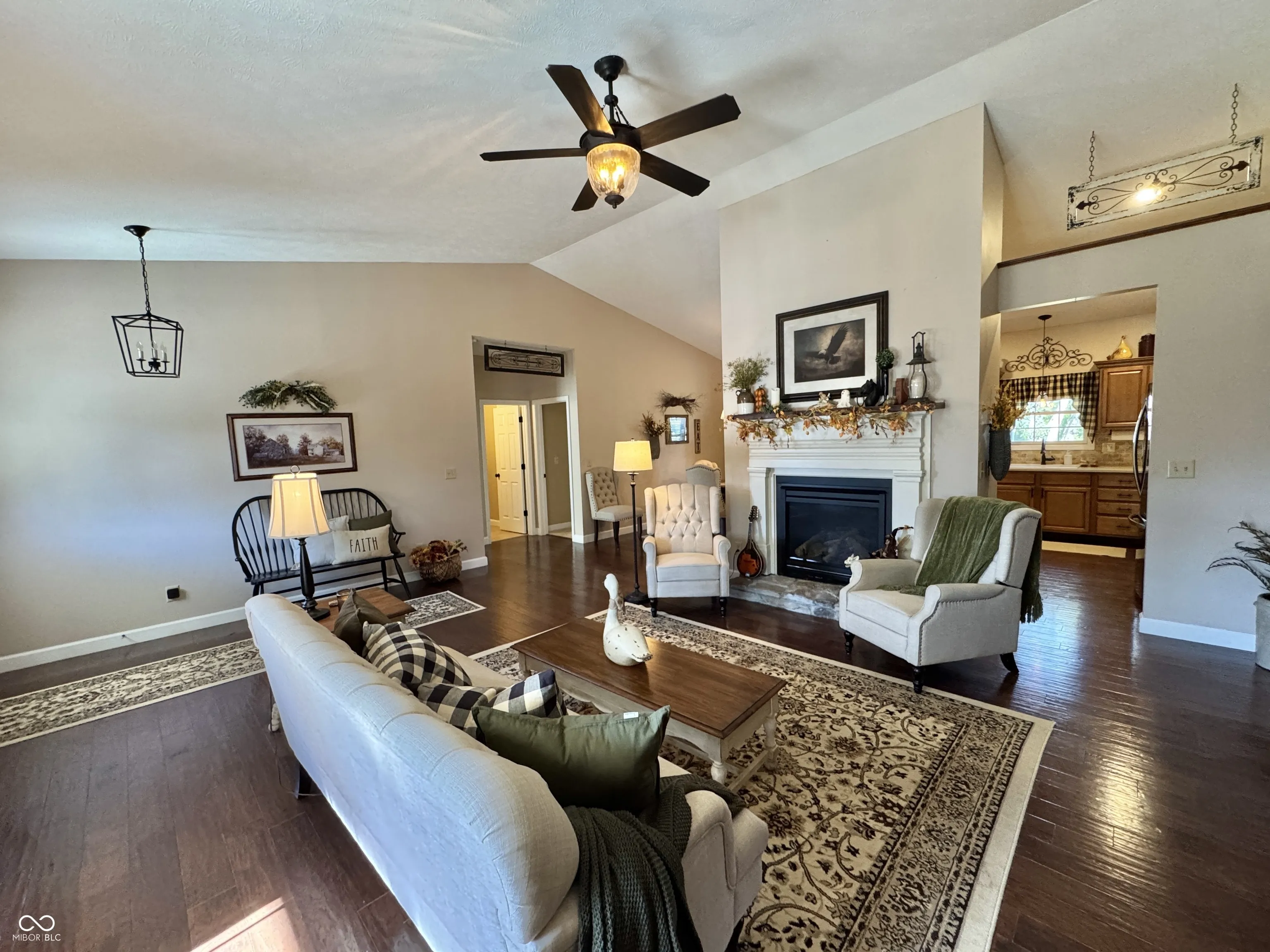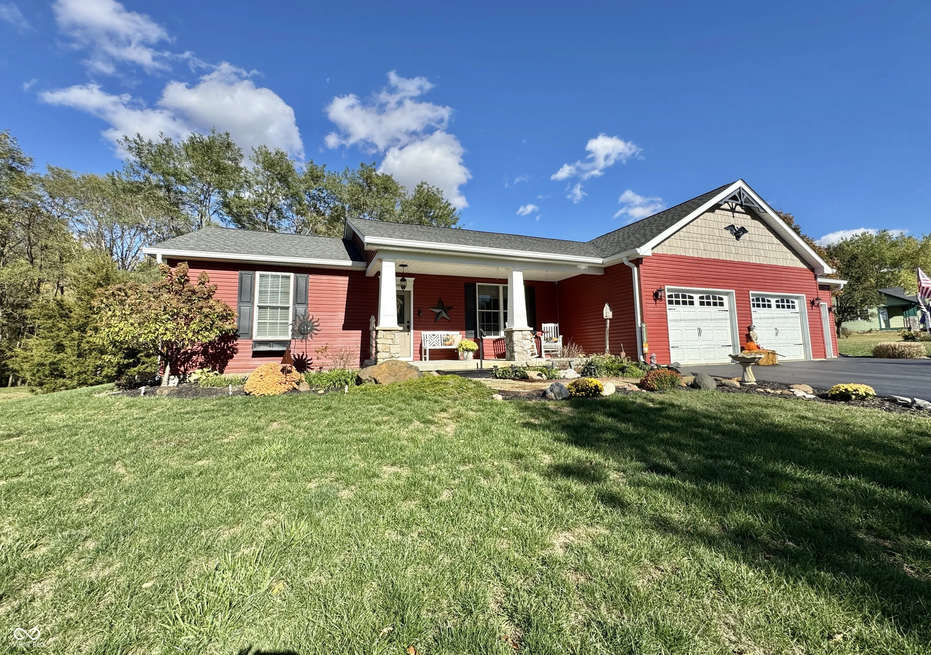 Nestled in a serene setting with breathtaking lake views, this 2014-built, 2,108 sq. ft., 3-bedroom, 2-bath home blends modern comfort with timeless charm. Step inside to discover hand-scraped engineered hardwood floors and fresh, plush & new carpeting throughout. The heart of the home is a gourmet kitchen featuring Shrock Amish cabinets, sleek quartz countertops, and a striking stone backsplash. All appliances stay, making this move-in ready gem even more appealing. Gather around the propane fireplace, framed by a remarkable 250-year-old mantle sourced from a historic farmhouse, adding a touch of rustic elegance. The guest bathroom is a showstopper with its 150-year-old dressing table, marble-top vanity, and classic tile floors. Beam in primary bath is 150 years old as well adding character and charm in every room. Unwind in the cozy sunroom or entertain on the covered rear patio, complete with built-in speakers and a porch swing that stays with the home. The owners suite is a true retreat, boasting a double vanity and a luxurious jetted tub. For added privacy and recreational enjoyment, this property backs up to the Clear Creek Conservancy district property, offering endless outdoor adventures. Nature park like setting with fire pit for those fall marshmallow smores! This property includes a double lot! Lot 124 is included in the purchase, ensuring extra seclusion. A blacktop driveway completes this inviting package with a heated 3 car garage with extended bay for full size vehicles!