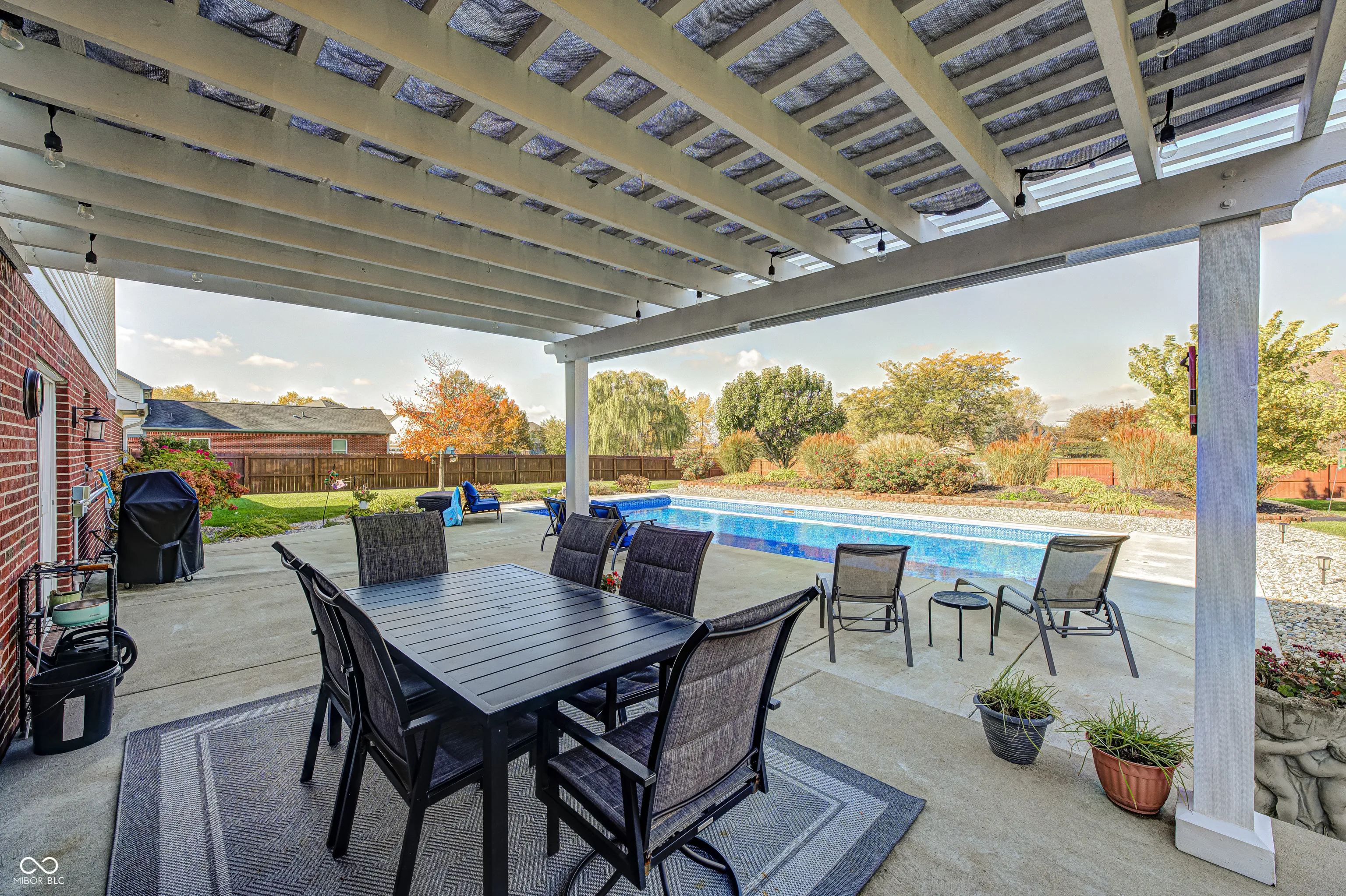 Very nice and spacious 4 Bedroom on a large lot in popular New Palestine! When you step in through the front door you are welcomed with the open main level spaces perfect for entertaining or maybe just unwinding. The living room invites relaxation and warmth, featuring a fireplace that promises cozy evenings and a comforting ambiance. In the kitchen, culinary dreams become reality amidst the solid surface counters with tile backsplash and stainless steel appliances. Upstairs the Primary Bedroom offers a private retreat with an ensuite bathroom, complete with a double vanity and a tiled walk-in shower, providing a spa-like experience every day. Step outside to discover a private pool, perfect for summertime relaxation and entertaining. The fenced backyard offers a secure space for recreation, while the patio and pergola create an inviting outdoor dining area for enjoying meals. Plenty of space in the attached 3 car garage for your vehicles and storage needs. All new carpeting upstairs, all new windows ’24. Pool new filter and salt cell this year, liner in ’24 and cover in ’23.
