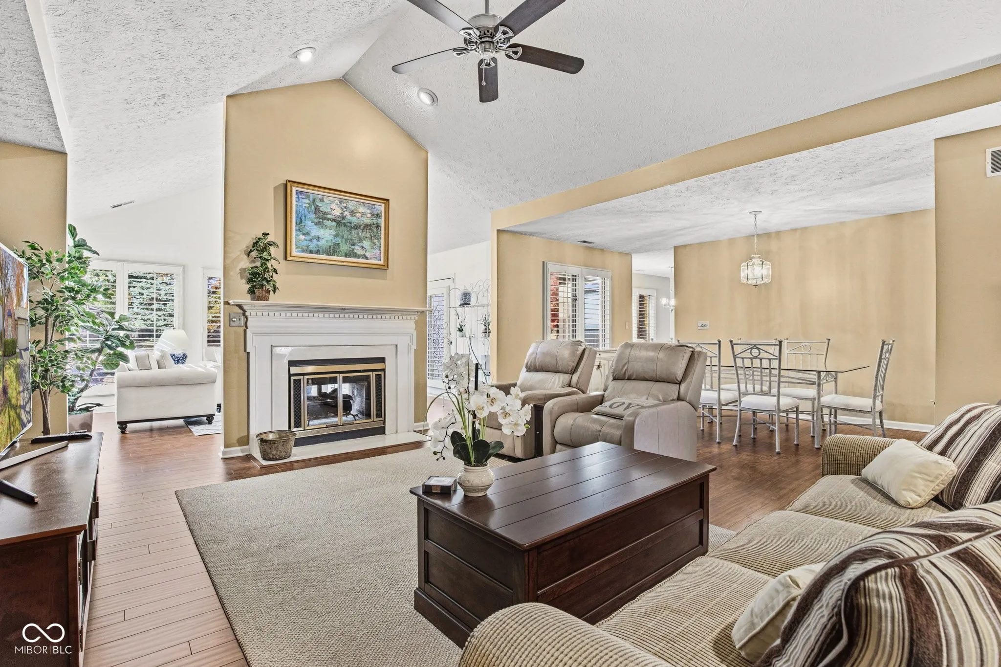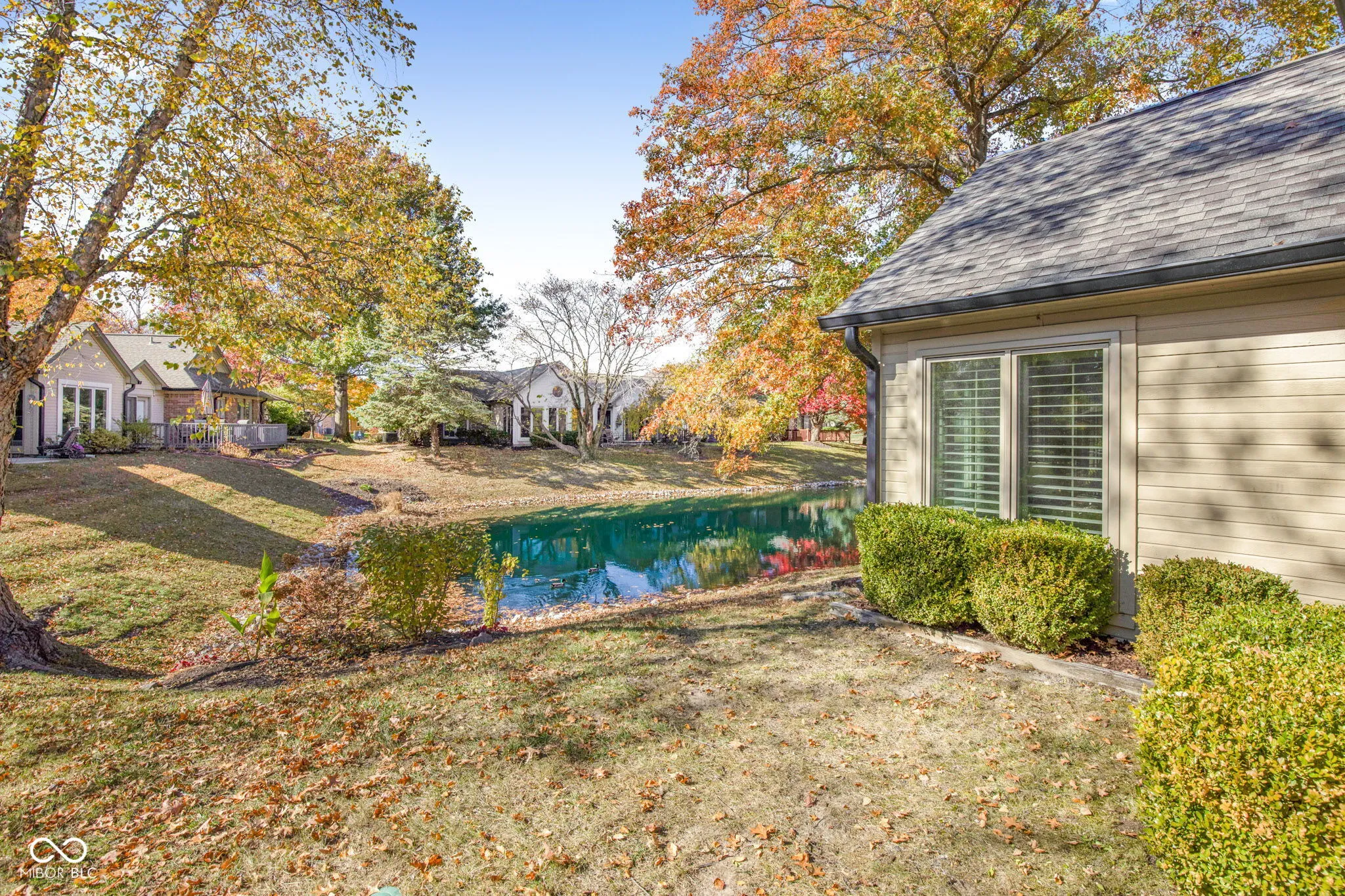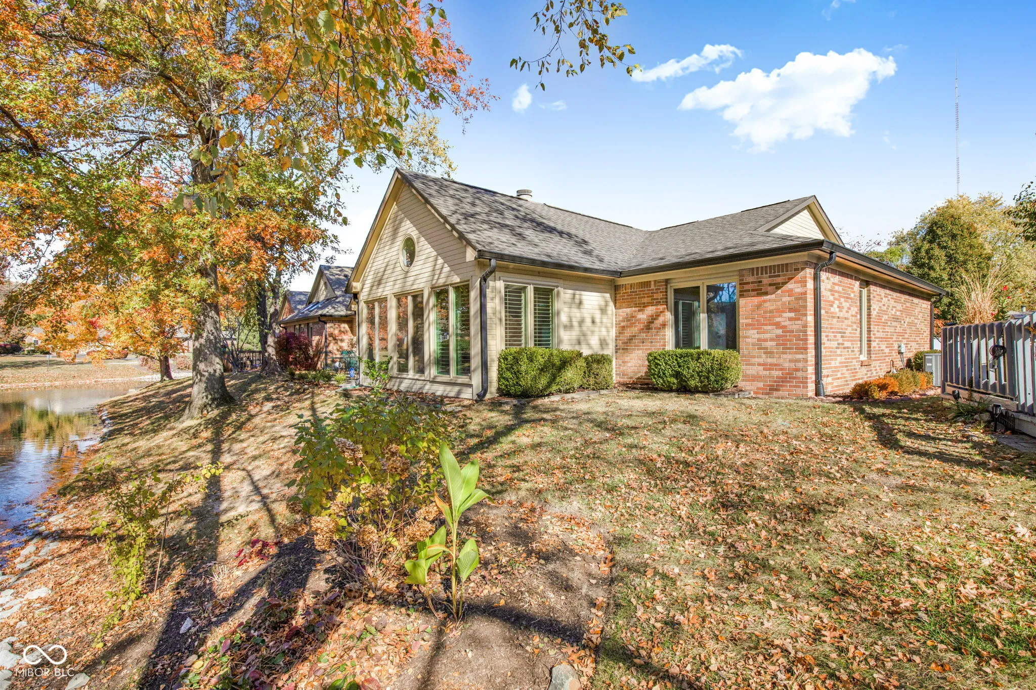 Step into 9556 Drakeford Drive, a stunning and move-in ready 2-bedroom, 2-bath single-family residence offering 1,847 sq ft of comfortable living in one of Indianapolis’s most desirable communities. This home seamlessly blends classic character with modern updates, providing a highly desirable low-maintenance lifestyle with a pond view from sunroom, breakfast room, kitchen, dining room and second bedroom. The open-concept living room is bathed in natural light from large windows, featuring vaulted ceilings and a cozy see through gas fireplace-the perfect setting for gatherings or quiet evenings. The spacious kitchen is a chef’s delight, boasting granite countertops, stainless steel appliances, and rich wood cabinetry. A convenient pantry and adjoining dining area showcase beautiful backyard views, enhancing your culinary experience. Retreat to the serene primary suite, complete with vaulted ceilings and an en-suite bath that offers dual vanities and a large mirror. A second well-sized bedroom and a full guest bath ensure comfort and privacy for everyone. Outside, the brick exterior and mature trees provide timeless curb appeal, paired with a well-maintained yard and an attached 2-car garage for convenience and extra storage. Perfectly situated in a quiet area, this location offers ultimate convenience, just minutes from hospitals, dining, shopping centers, parks, and schools. The community is supported by a required HOA fee of $376/month, ensuring the home’s low-maintenance appeal. This home checks all the boxes for comfort, convenience, and style!