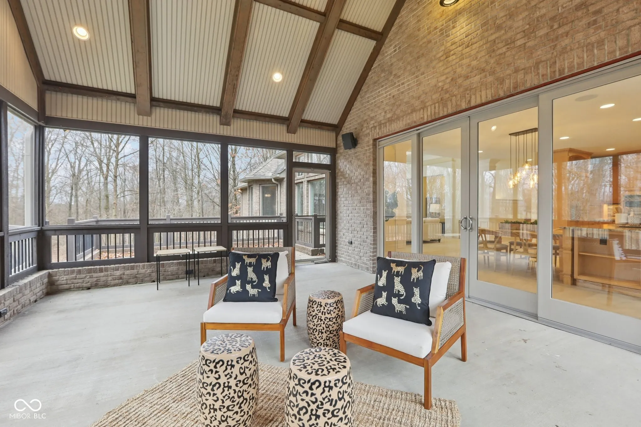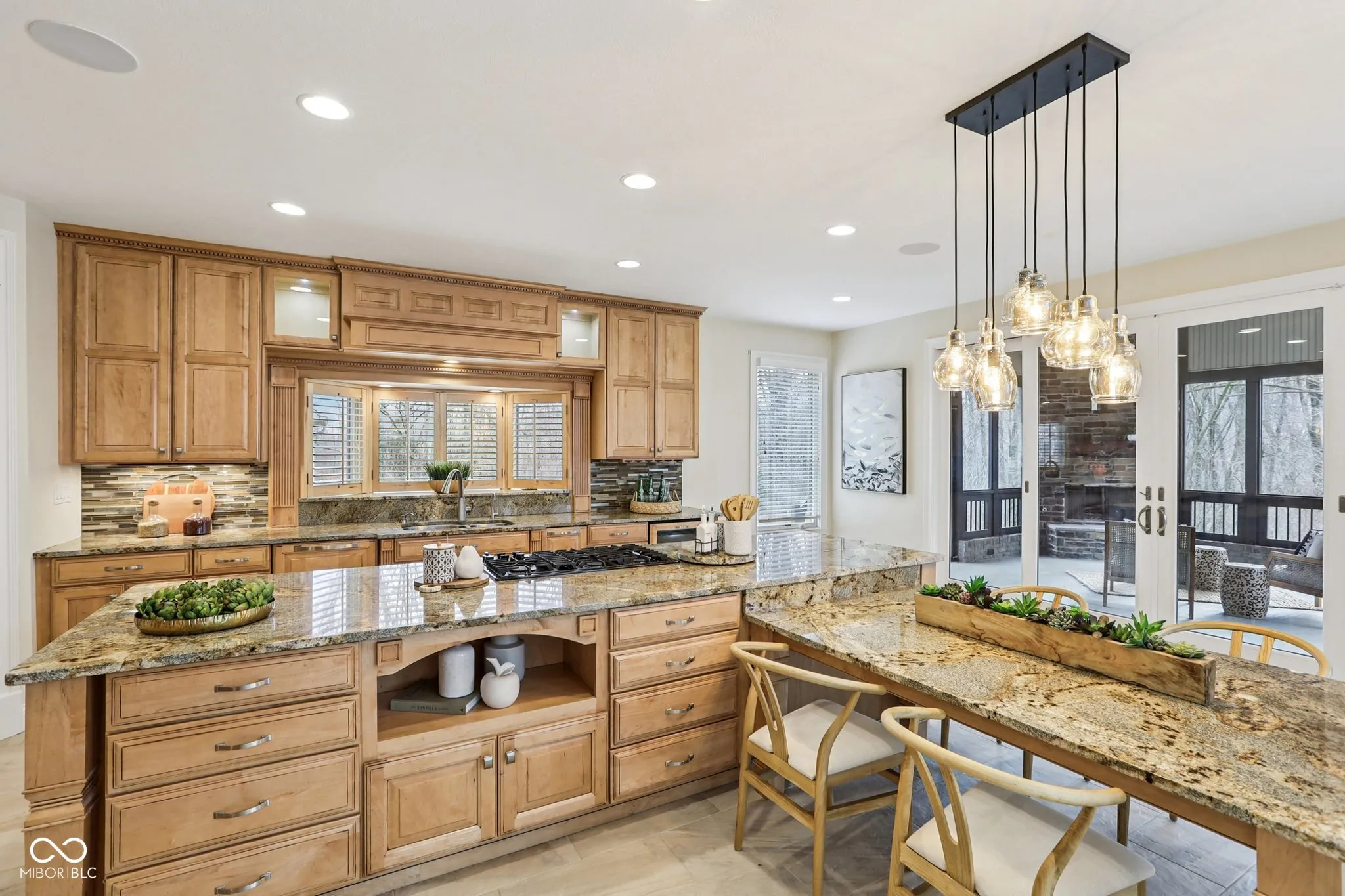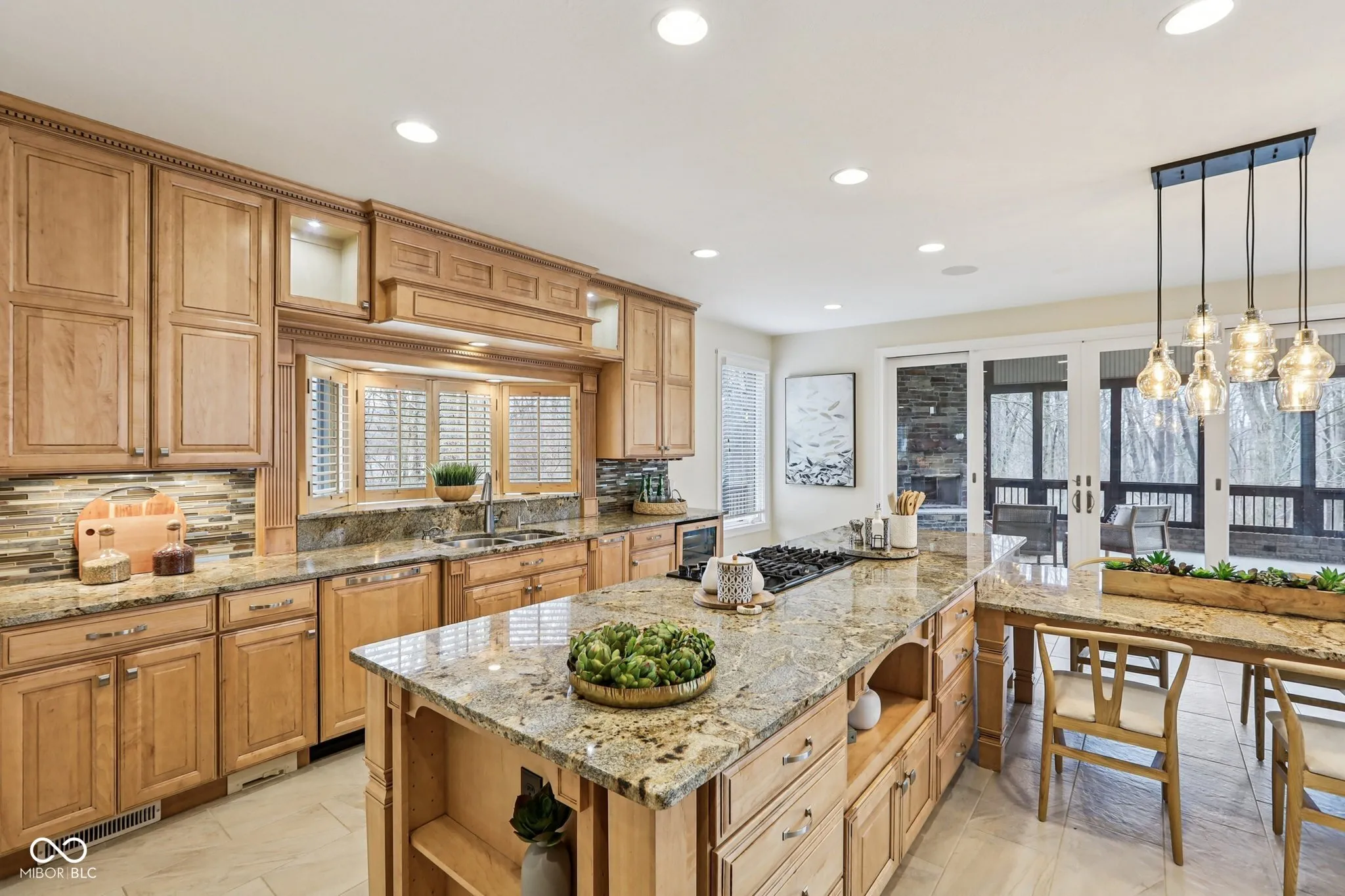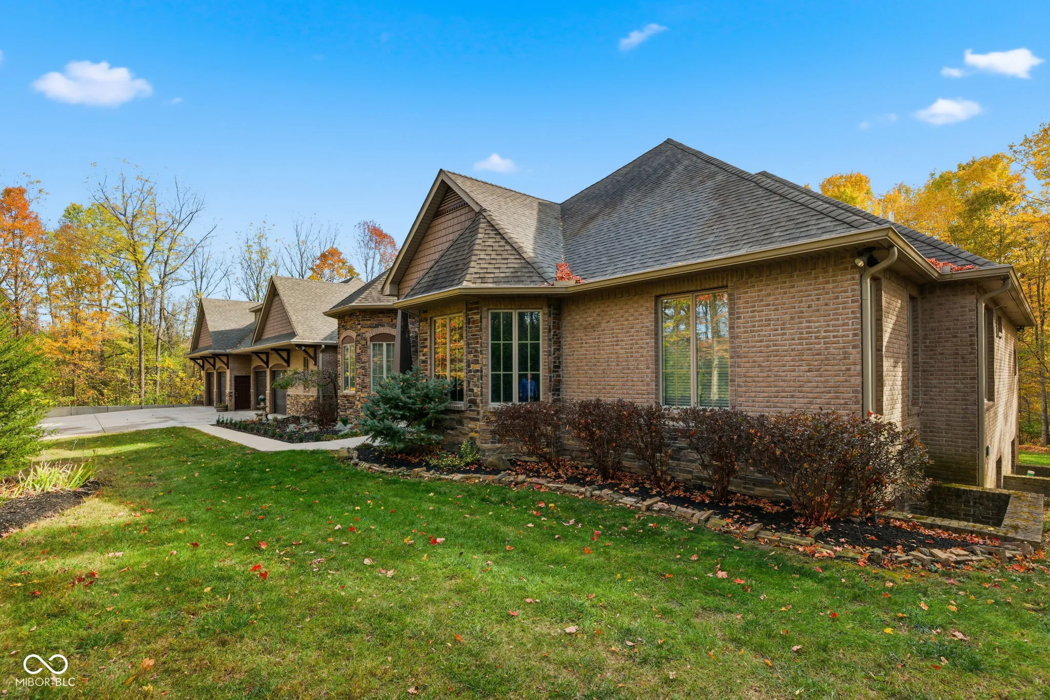 Nestled on nearly 3 wooded acres at the end of a private drive, this custom-built luxury ranch offers seclusion, sophistication, and comfort in one of Zionsville’s most sought-after settings. Surrounded by mature trees, the home’s brick and stone exterior opens to a warm, refined interior built for both everyday living and entertaining. The main level features an open great room with coffered ceilings, built-ins, and a hand-stacked stone fireplace. Just off the great room sits a gourmet kitchen with limited-edition granite, custom maple cabinetry – complete with soft close, slide out shelving & spice racks, built-in Thermador refrigerator/freezer, JennAir cooktop with downdraft exhaust, double oven, dishwasher, trash compactor and a large island with built in table extension designed for gathering. Just off the kitchen, the screened porch with its own wood-burning fireplace and adjoining patio creates a perfect space for relaxing or entertaining outdoors. The main level also includes a formal dining room, private office/library with French doors, mudroom, half bath, and three bedrooms. The primary suite offers dual walk-in closets and a spa-inspired bath with dual vanities, a skylight, and a tile-and-glass shower with dual heads. A private elevator or oversized stairwell connects to the lower level, where you’ll find a spacious recreation room with a full wet bar, designated areas for billards, ping pong, foosball, darts, or anything else, theater area w/ surround sound, & daylight windows, plus a fourth bedroom, full bath, exercise room, safe room, storage areas, and a dedicated server/mechanical room. Additional features include a backup generator, whole-home audio, geothermal heating/cooling, whole home tray vacuum system, shed, an oversized 4-car garage. Combining thoughtful craftsmanship with modern convenience, this property offers rare privacy & wooded beauty just minutes from Zionsville’s village, top-rated schools, and easy highway access.