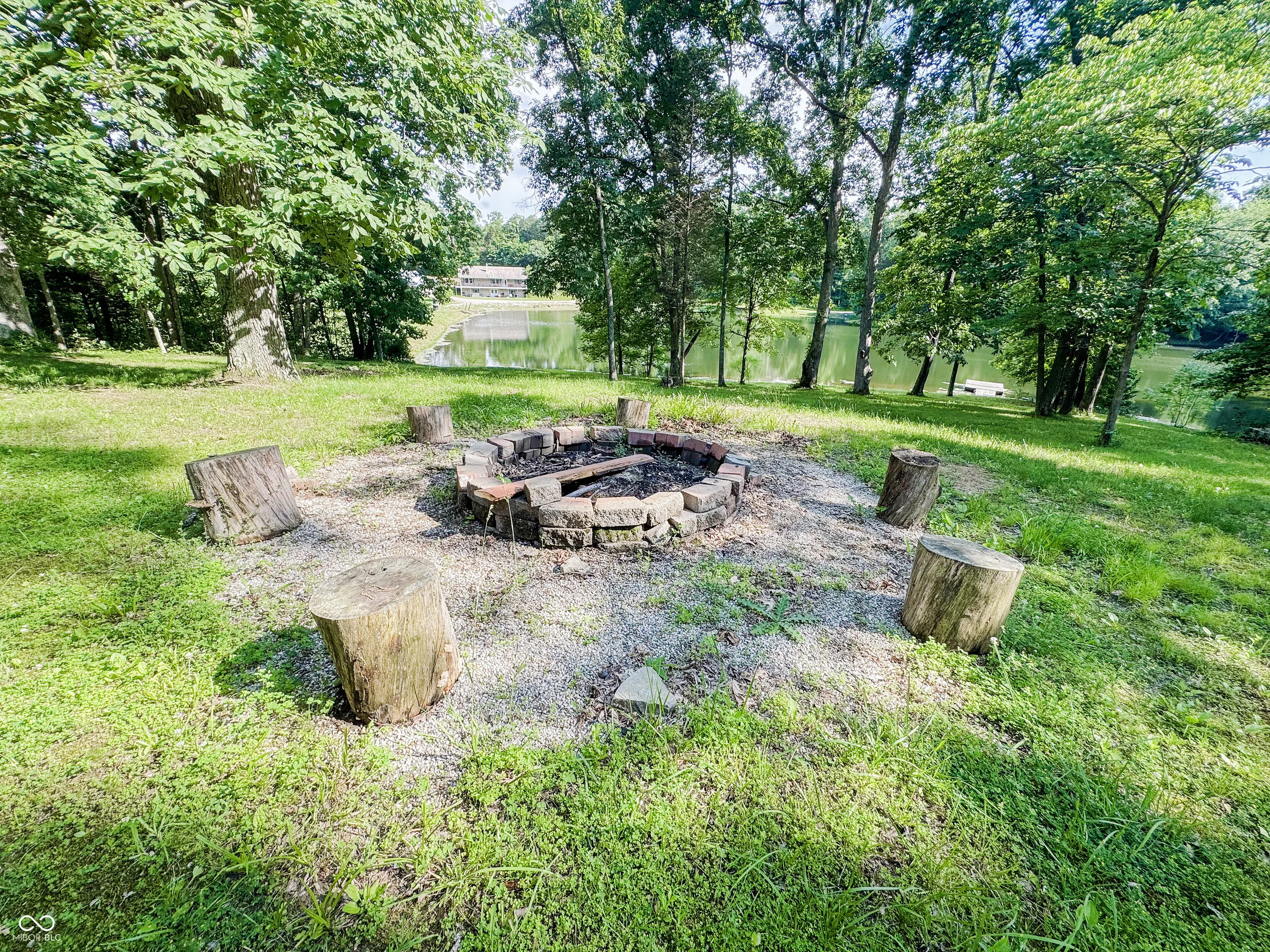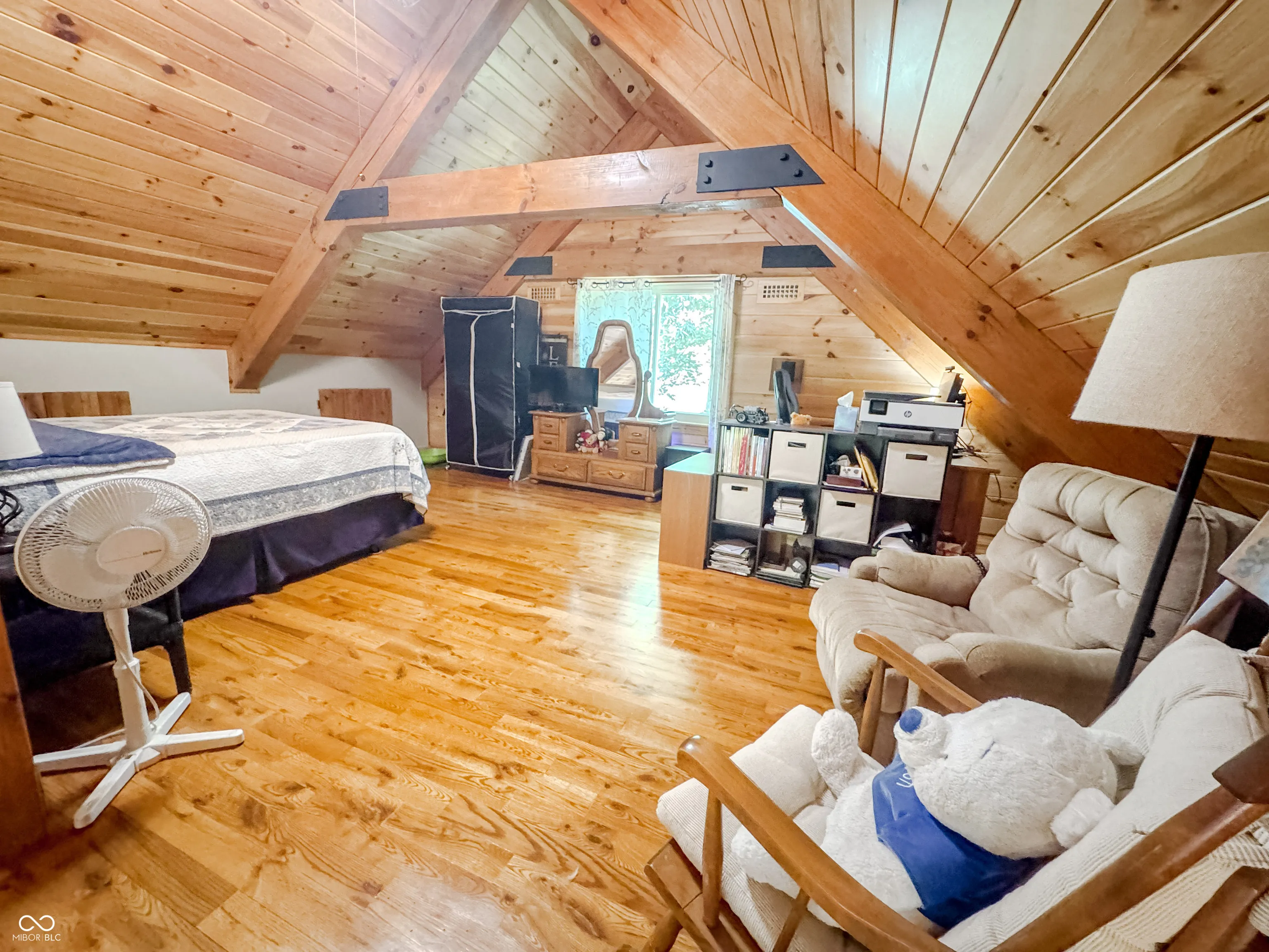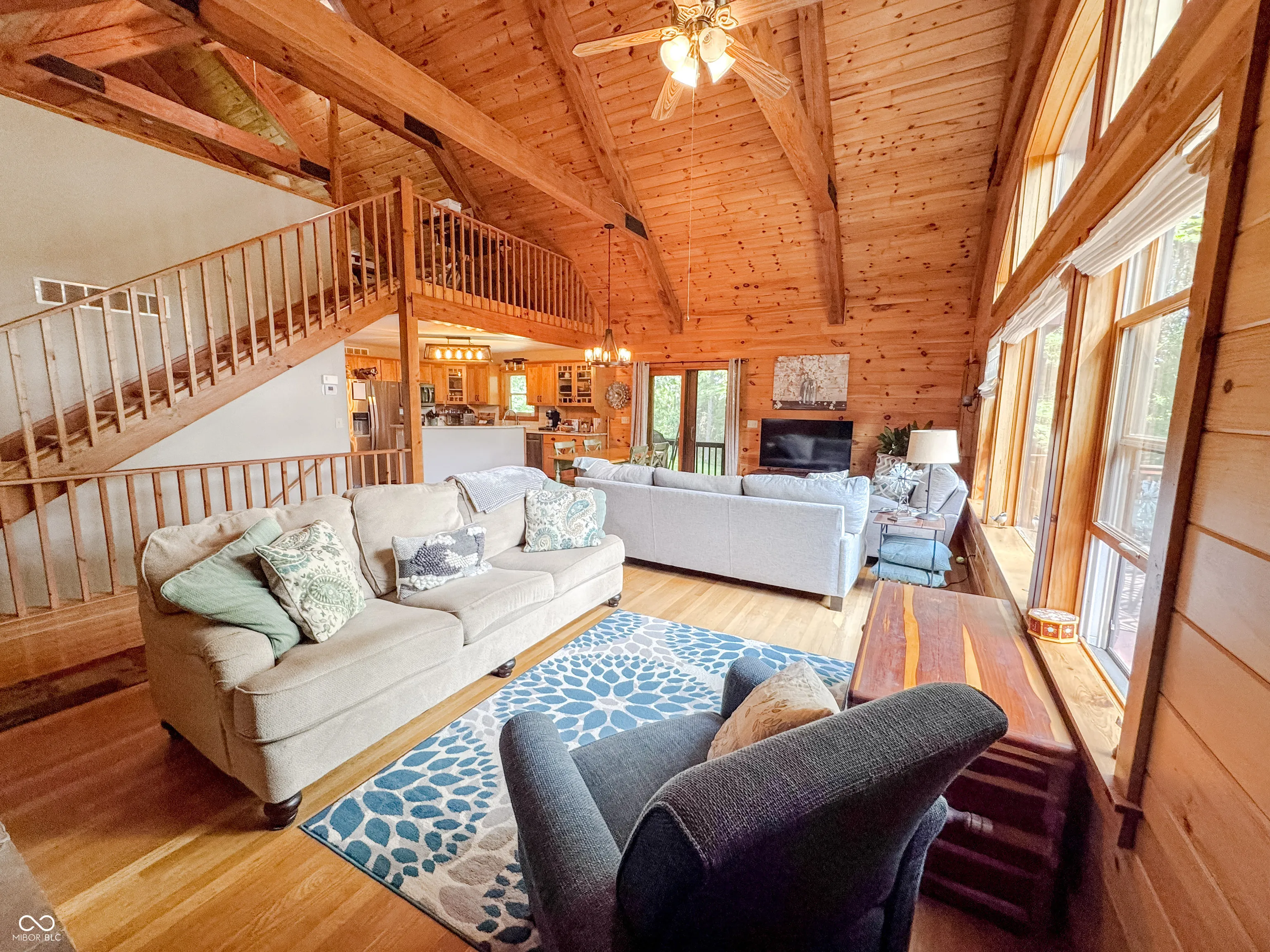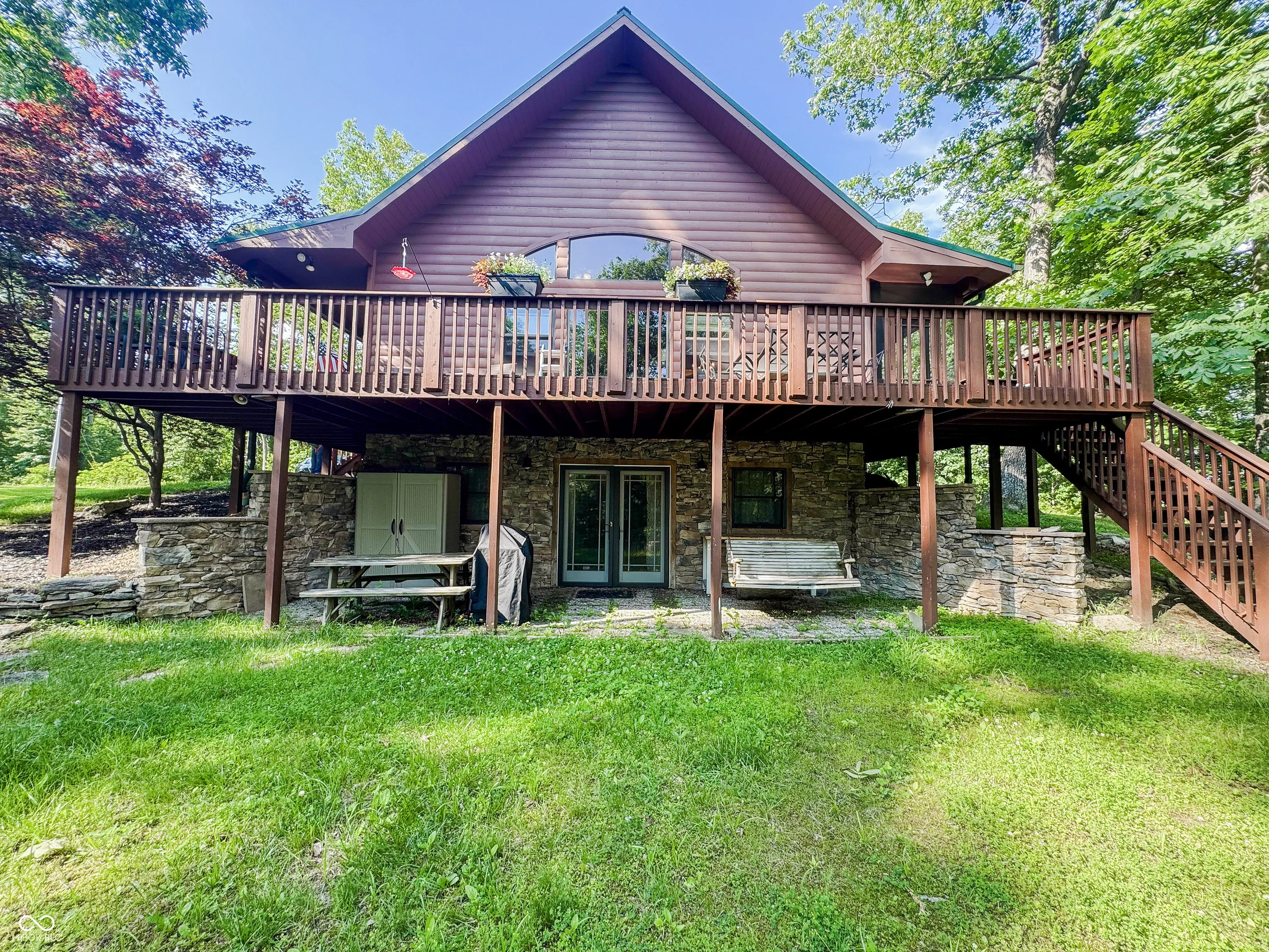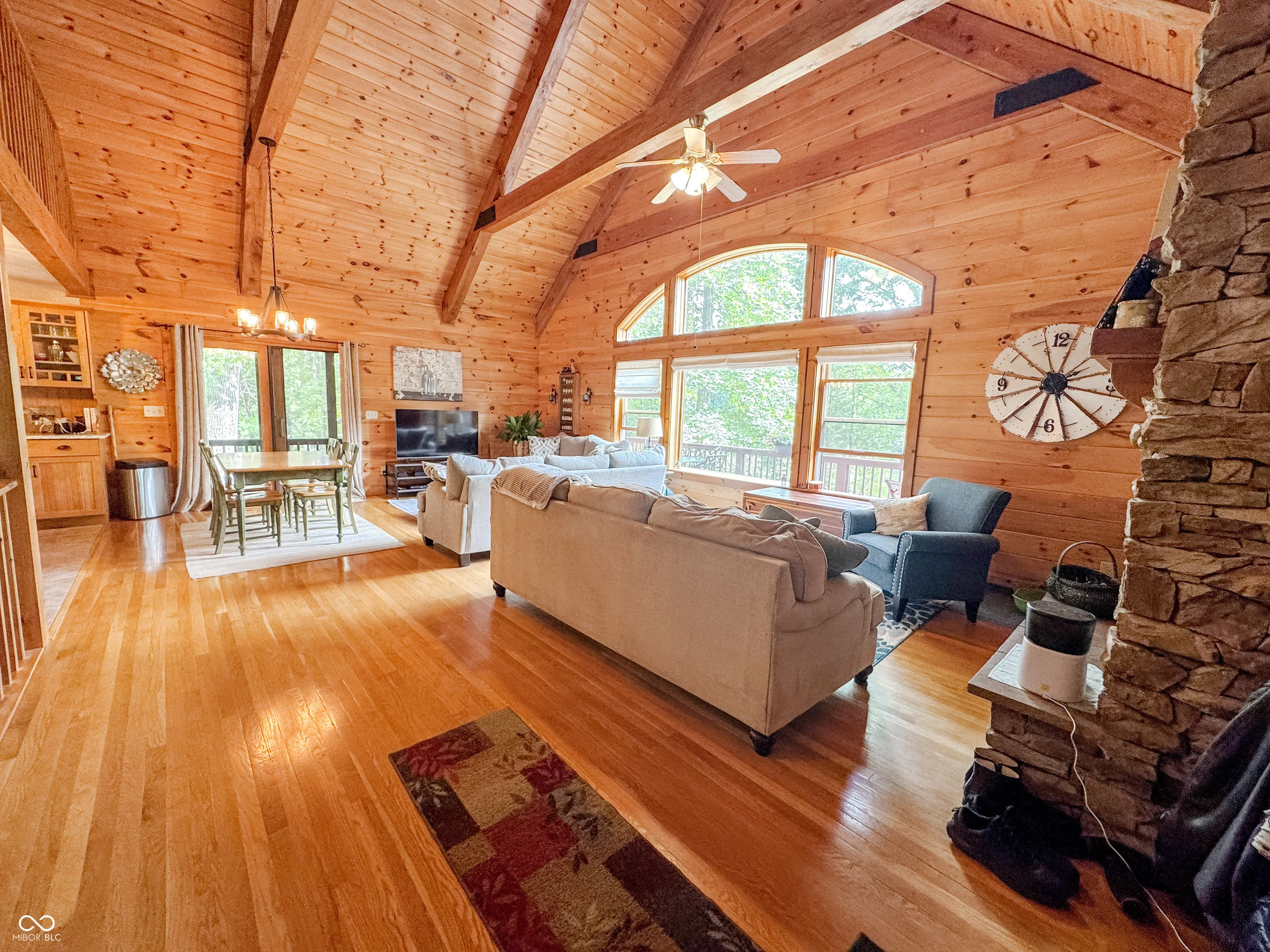 Welcome to this stunning log cabin on 5.9 acres over looking a 4 acre stocked lake in Vevay. Starting on the exterior there is a large detached garage, large wrap around porch, walk out basement, fire pit, mature trees, generator, and new roof 2025. Heading inside to vaulted ceilings, large open windows, hard wood flooring. This house is packed with features. The living room has a stone fireplace with a great view of the lake. The kitchen features stainless steel appliances, center island, and stone countertops. Heading down the hall to the recently updated bathroom. Spacious main bedroom across the hall from the bathroom with hardwood flooring. Heading upstairs to a spacious additional room currently being used as a guest room and office space. This flex space has many possibilities. Heading down to the walk out basement this space features a wet bar and plenty of space for entertaining. There is an additional full bathroom in the basement. No HOA! Nature lovers paradise with plenty of deer and other animals. Full access to the lake.