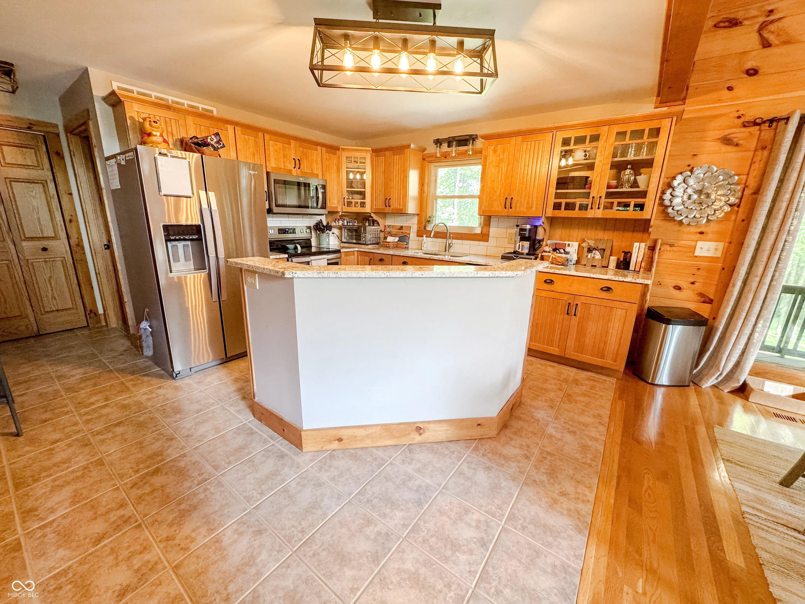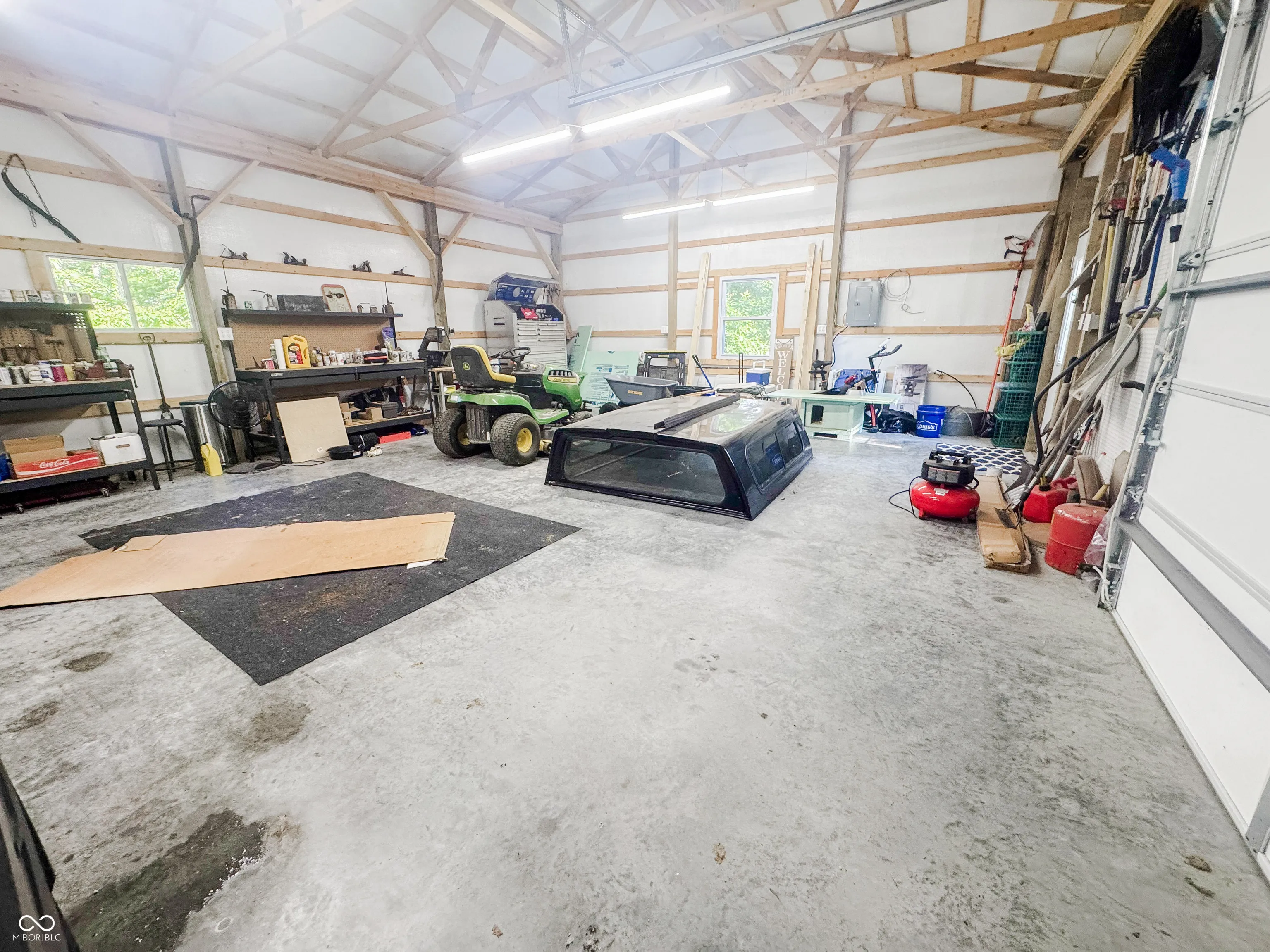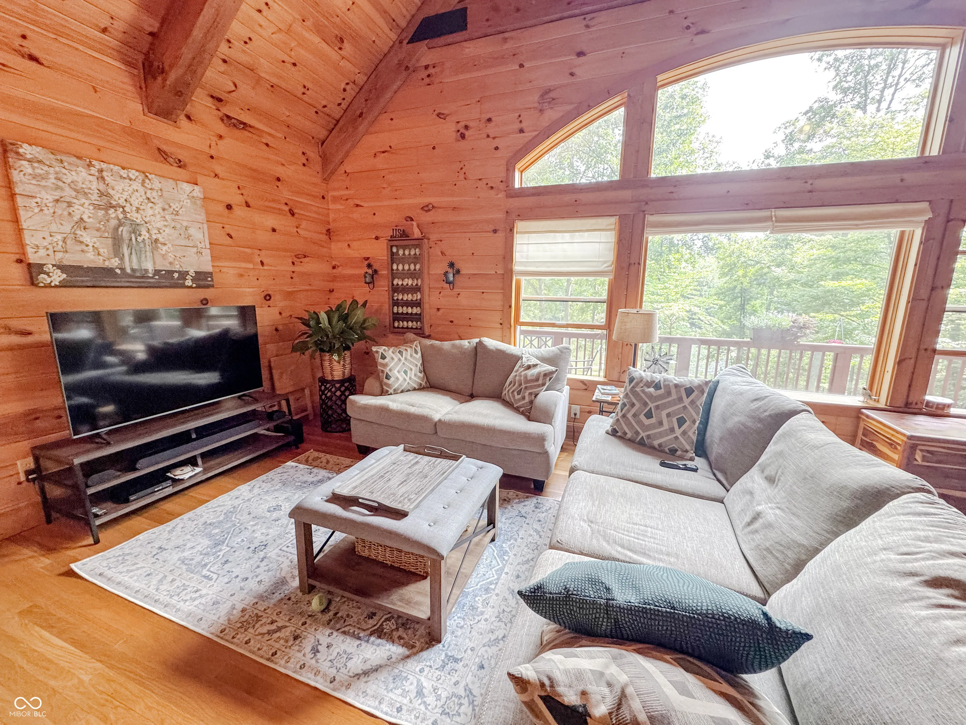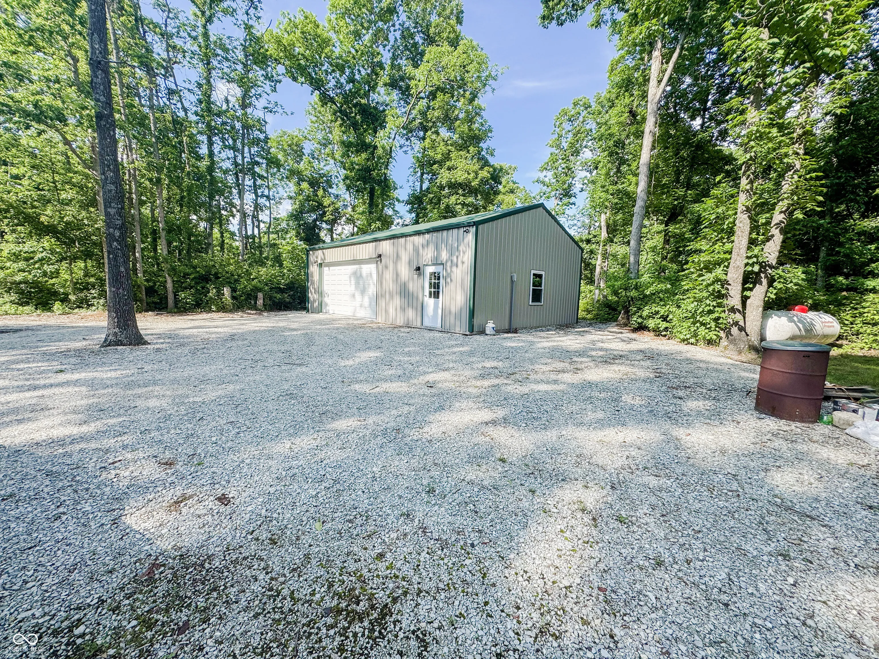 Welcome to this stunning log cabin on 5.9 acres over looking a 4 acre stocked lake in Vevay. Starting on the exterior there is a large detached garage, large wrap around porch, walk out basement, fire pit, mature trees, generator, and new roof 2025. Heading inside to vaulted ceilings, large open windows, hard wood flooring. This house is packed with features. The living room has a stone fireplace with a great view of the lake. The kitchen features stainless steel appliances, center island, and stone countertops. Heading down the hall to the recently updated bathroom. Spacious main bedroom across the hall from the bathroom with hardwood flooring. Heading upstairs to a spacious additional room currently being used as a guest room and office space. This flex space has many possibilities. Heading down to the walk out basement this space features a wet bar and plenty of space for entertaining. There is an additional full bathroom in the basement. No HOA! Nature lovers paradise with plenty of deer and other animals. Full access to the lake.