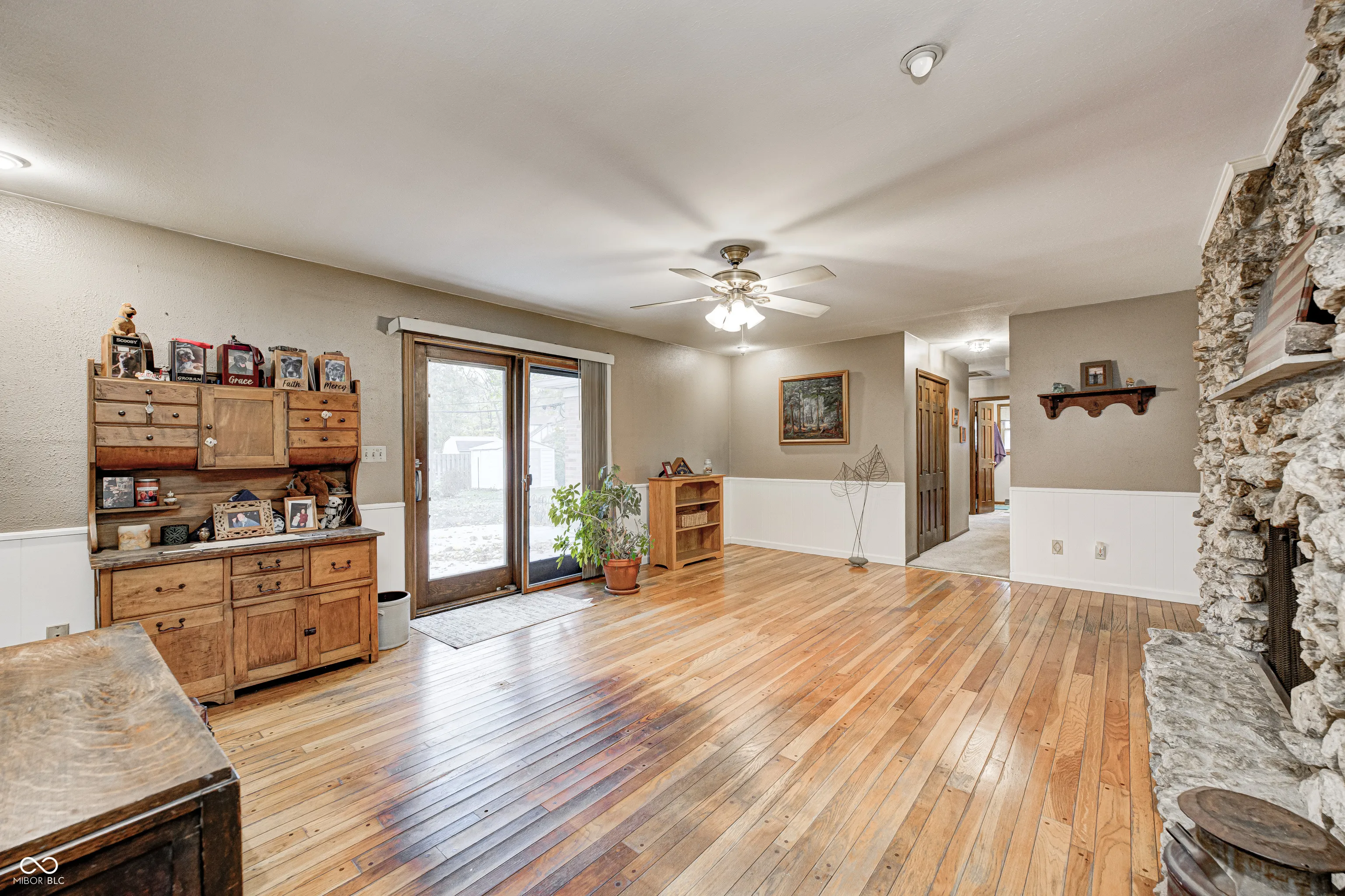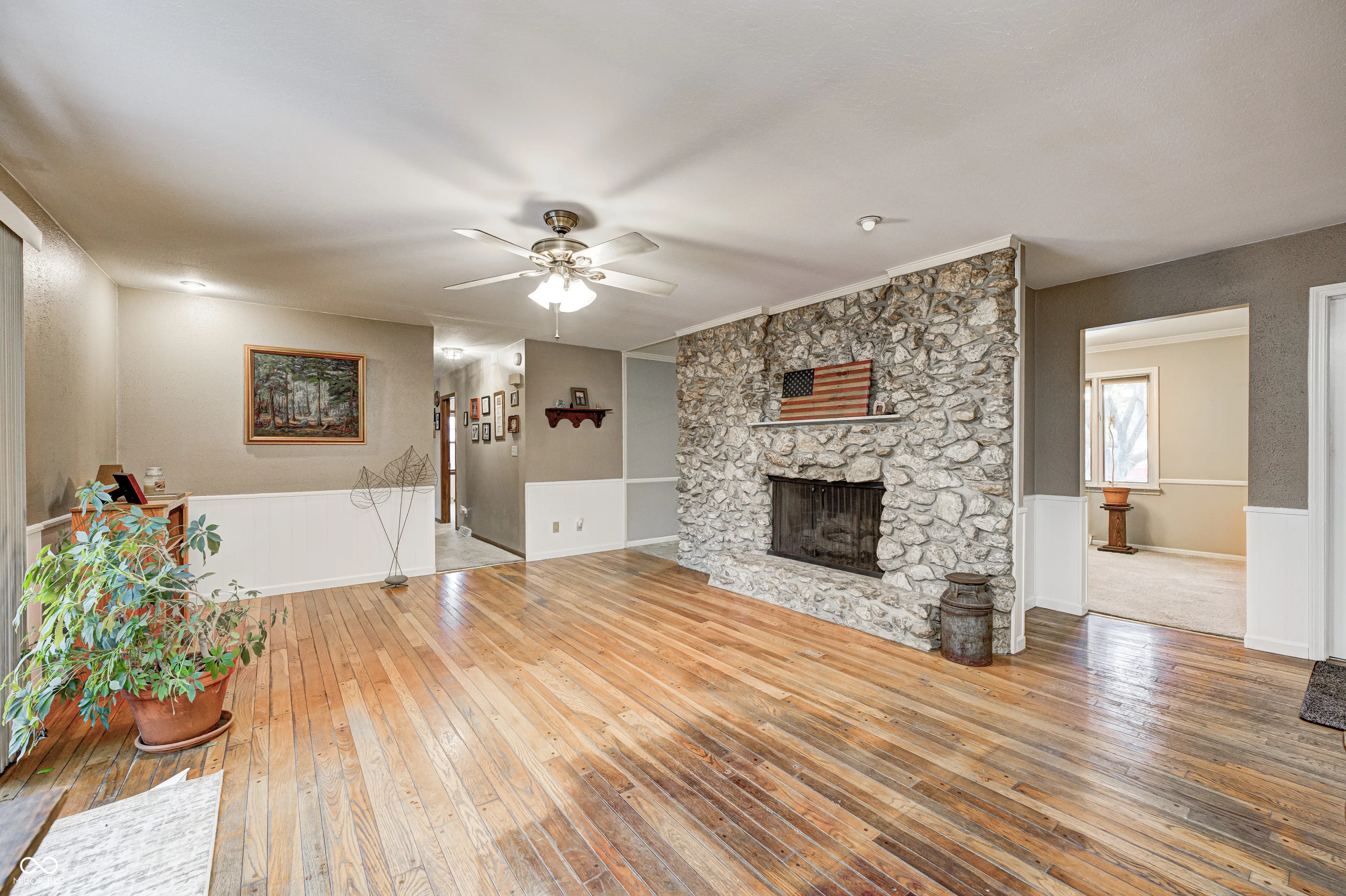 Well cared for 3 Bedroom, 2 Bath, Brick Ranch with basement in Plainfield. To the right of the large foyer is the Living Room, to the left, the Formal Dining Room (convert to an office or craft space if needed). The Kitchen (with pantry and all appliances remain) connects with the Breakfast Nook (large enough to accommodate a large table). The large Family Room has pegged hardwoods and a woodburning fireplace (which has not been used in years and is not warranted) and connects to the L.A.R.G.E fenced back yard (with concrete patio and storage shed). Main level Laundry has a permanent stairway to the attic. Primary Suite has walk-in-closet and full shower. Two additional bedrooms and full bath round out the main level. Unfinished basement is a blank canvas awaiting conversion to a movie room/rec room/cool hang out space. The utility room is in a dedicated area and also provides extra storage. This great location delivers easy walkable access to downtown Plainfield, the library, and some schools, and of course, you can bike to the trails too. Information deemed reliable but not guaranteed.