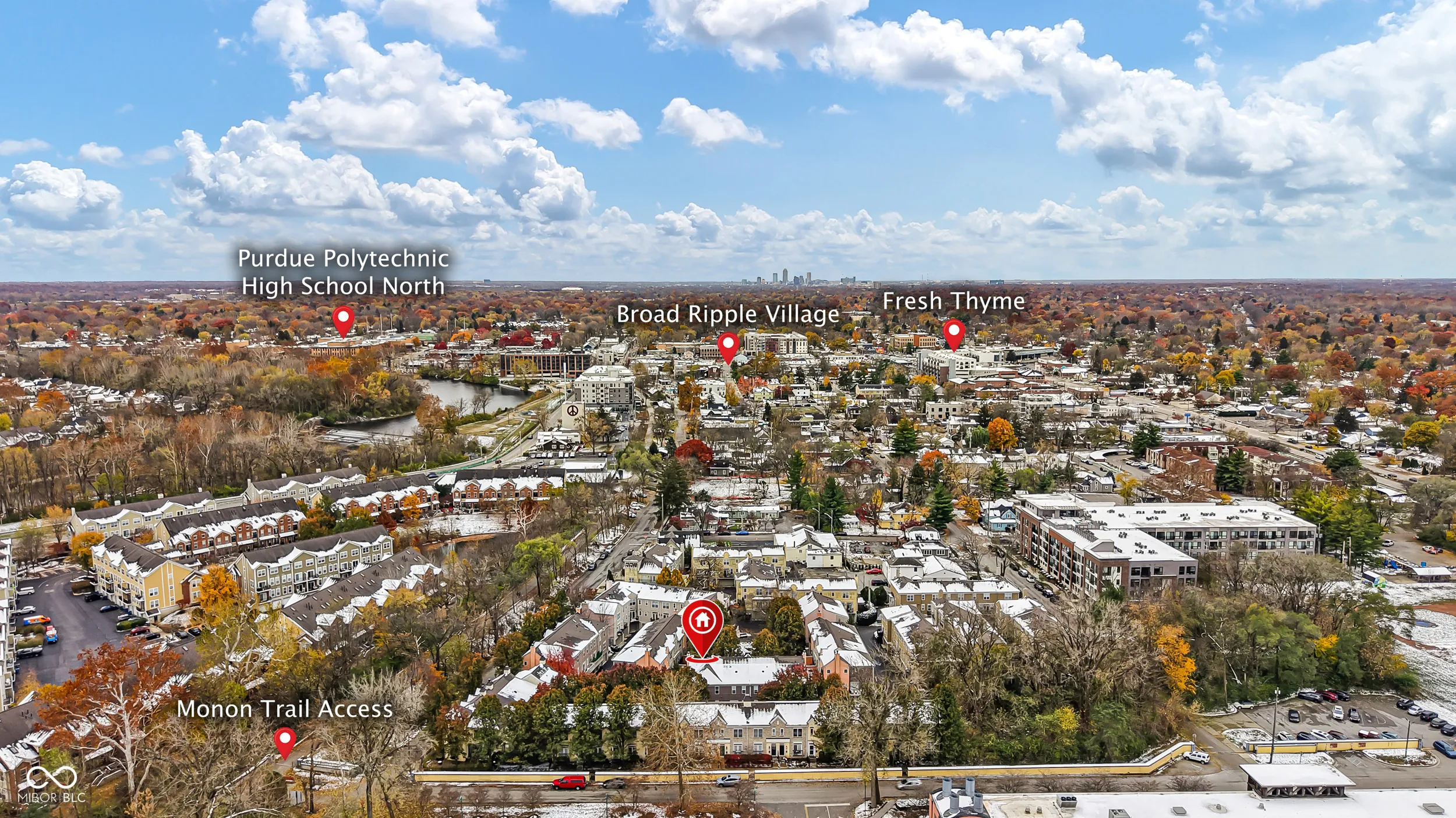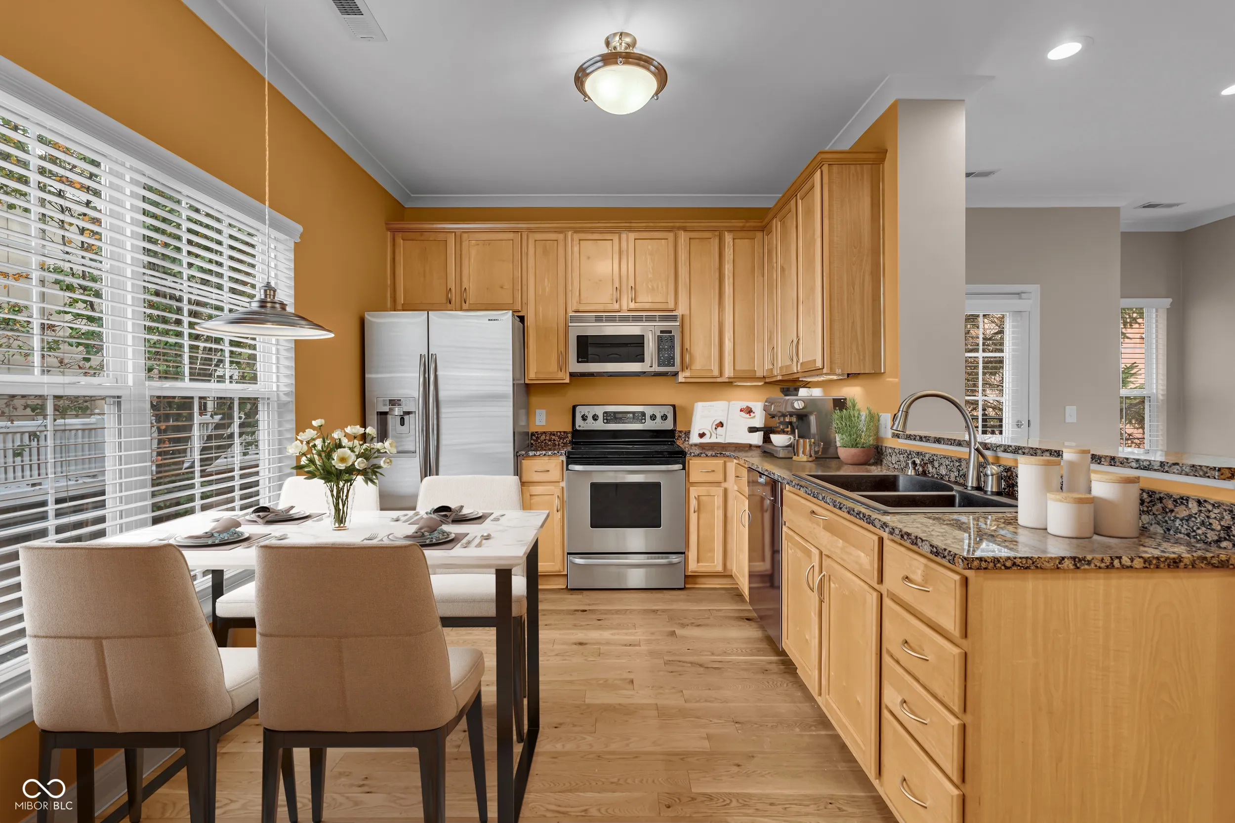 Welcome to this stunning three-level Italian-style townhome, featuring elegant details and modern comfort throughout. The main level boasts gleaming hardwood floors, a cozy wood-burning fireplace, and not one-but two balconies. The spacious kitchen shines with granite countertops, stainless steel appliances, and plenty of storage including a pantry. A convenient half bath and laundry area (washer and dryer included) complete this floor. Upstairs, you’ll find a spacious primary suite with a large walk-in closet, dual-sink vanity, and walk-in shower. The second bedroom-perfect for guests or a home office-also includes a generous closet. This unit has an abundance of natural daylight that comes with being an end unit that also faces the park and fountain. The community features Italian-inspired architecture adding a touch of European elegance to everyday living. An oversized heated garage with room for 3+ vehicles, a water softener, and direct access beneath the unit make this home as practical as it is beautiful. Walk to Broad Ripple for dining and nightlife, and enjoy being close to shopping, services and everything you need!
