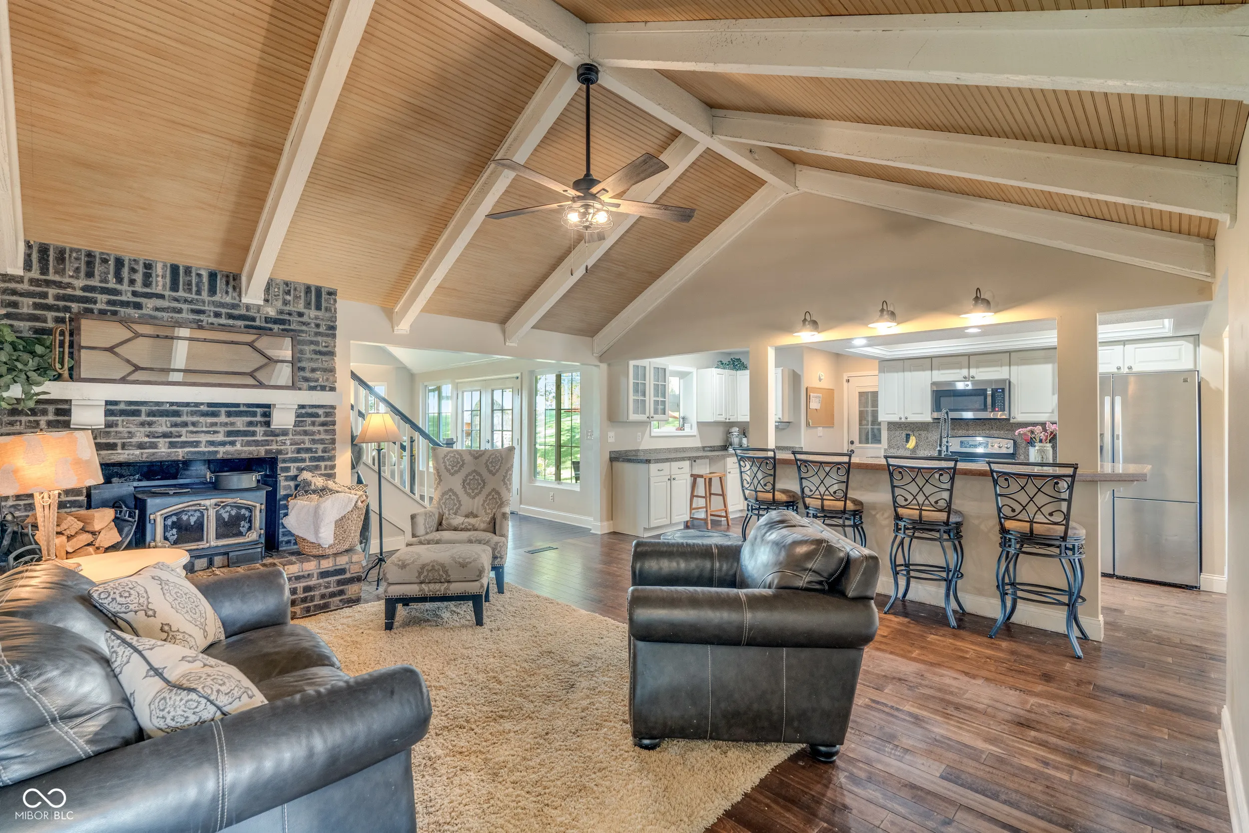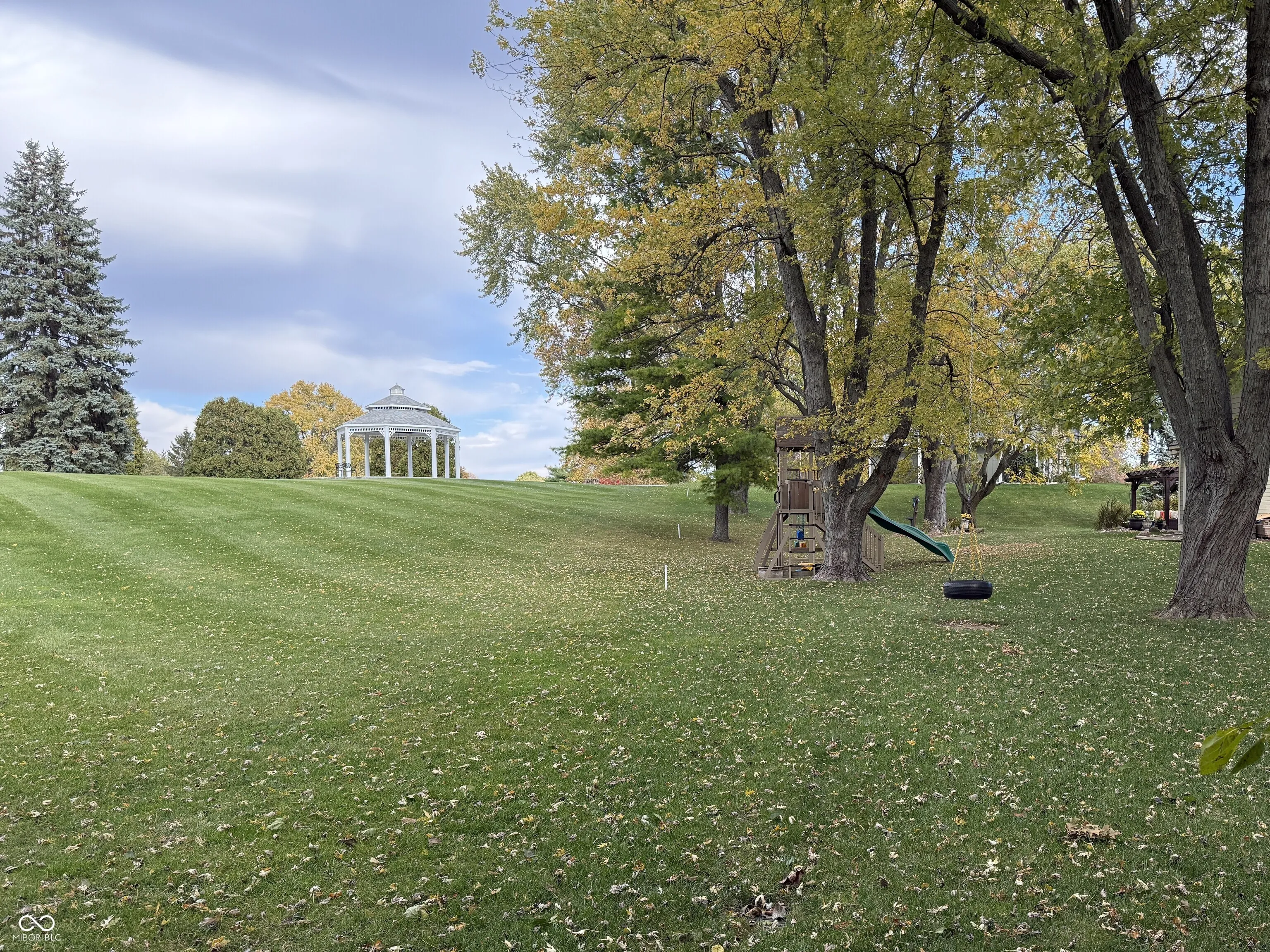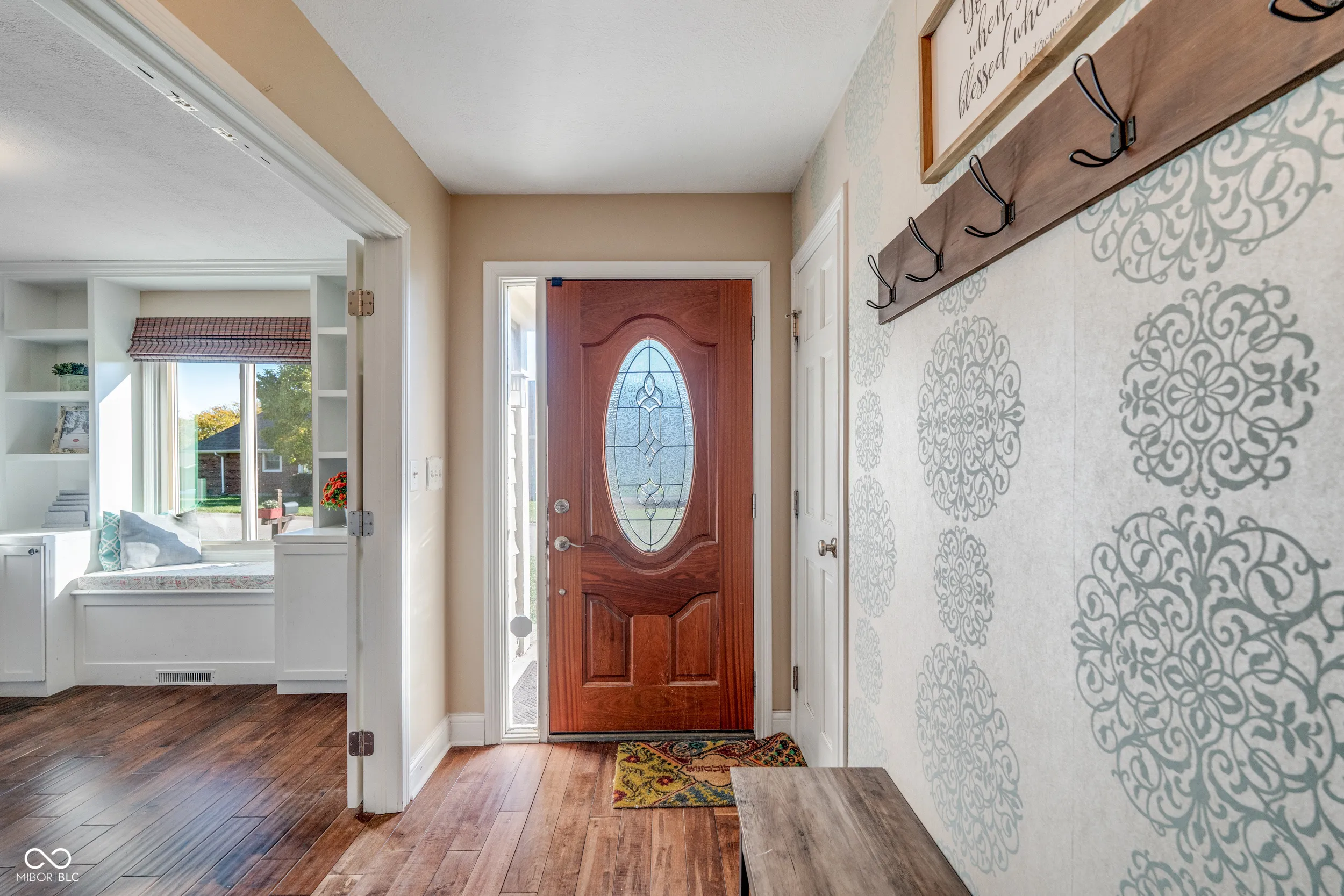 Perfectly located on hole one of Valle Vista Golf Course, this 4 bed/2 bath home on .49 acre is designed for comfortable living and entertaining. The main level features hand-scraped maple hardwood floors, cathedral ceilings, and an open floor plan. The kitchen layout is great for cooking, baking, and gatherings with plenty of buffet space, a dining room, and breakfast bar. Work from home in your own office with custom built-ins. The loft overlooking the two-story great room is perfect for an additional office or play space. The primary suite includes a walk-in closet, dual vanities, and a walk-in tile shower. Bedrooms 2 and 3 feature custom built-in beds designed for functionality and charm. A 4th bedroom with walk-in closet and egress window was added to the now fully-finished basement. The open basement space w/ vinyl plank flooring is great for movie nights or epic dance battles. The laundry room is a dream! Other home features include six-panel doors, crown molding, central vacuum, laundry chute, stainless appliances, dimensional roof, NEW main electrical panel, remodeled hall bath, updated lighting, water heater (2021), encapsulated crawl space, and two A/C and furnace systems (detailed list available upon request). The 2-car garage includes extra storage and pull-down attic stairs. Don’t forget the outdoor space! The custom patio, pergola w/ hanging wisteria, perennial gardens, and large shade trees create a dreamy oasis. Relive your childhood on the tire swing, take a nap in your hammock, or roast marshmallows over the fire. Enjoy endless possibilities for relaxing or gathering with friends and family – like watching the annual Freedom Fest fireworks from your own back yard. Just steps away is the Craig Parrk Art on the Trail Path, offering a connection to numerous festivals and activities in Greenwood. This little slice of heaven is only 20 minutes from downtown Indy and presents an ideal blend of functional spaces, entertaining areas, and natural beauty.