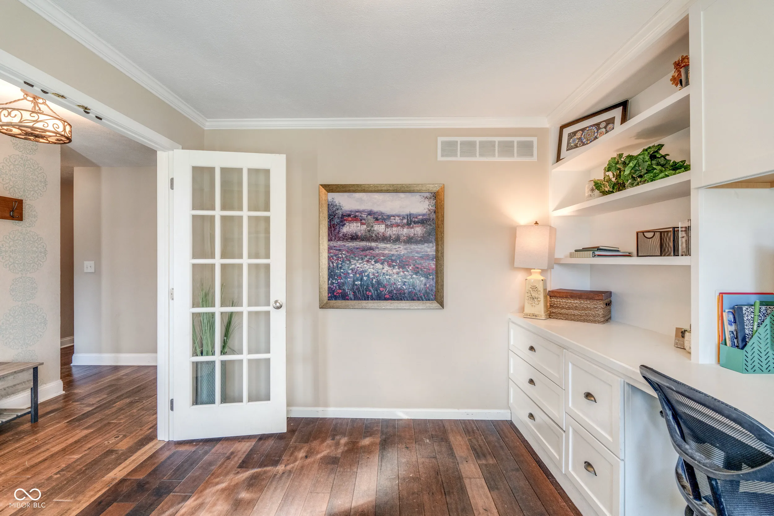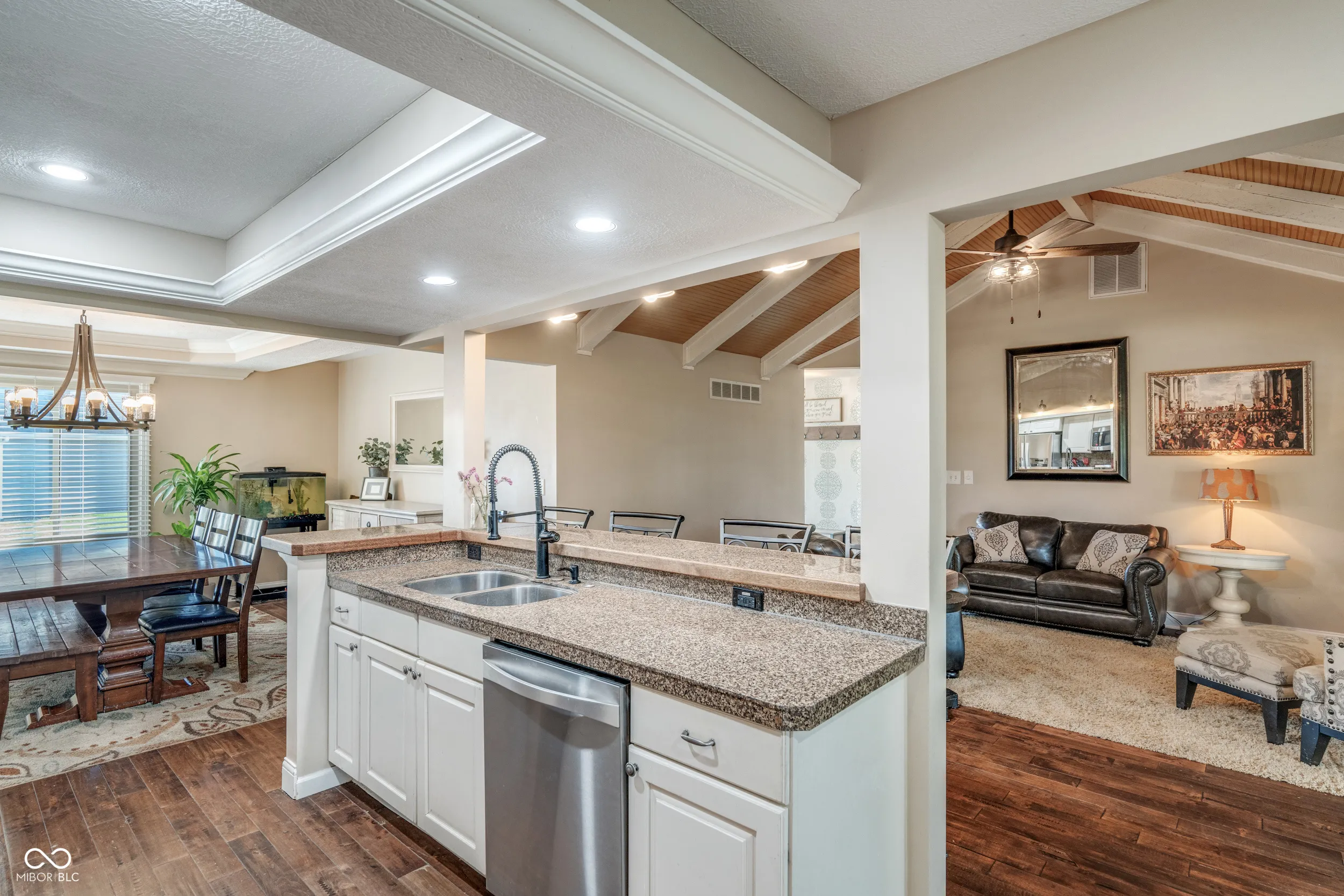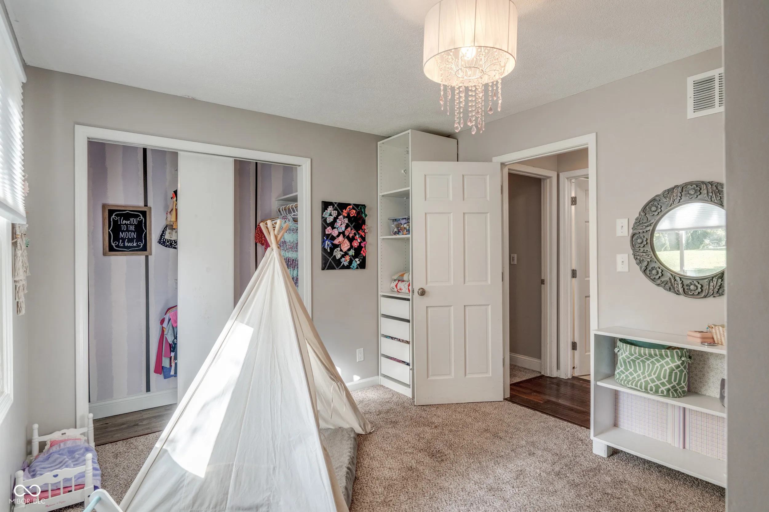 Perfectly located on hole one of Valle Vista Golf Course, this 4 bed/2 bath home on .49 acre is designed for comfortable living and entertaining. The main level features hand-scraped maple hardwood floors, cathedral ceilings, and an open floor plan. The kitchen layout is great for cooking, baking, and gatherings with plenty of buffet space, a dining room, and breakfast bar. Work from home in your own office with custom built-ins. The loft overlooking the two-story great room is perfect for an additional office or play space. The primary suite includes a walk-in closet, dual vanities, and a walk-in tile shower. Bedrooms 2 and 3 feature custom built-in beds designed for functionality and charm. A 4th bedroom with walk-in closet and egress window was added to the now fully-finished basement. The open basement space w/ vinyl plank flooring is great for movie nights or epic dance battles. The laundry room is a dream! Other home features include six-panel doors, crown molding, central vacuum, laundry chute, stainless appliances, dimensional roof, NEW main electrical panel, remodeled hall bath, updated lighting, water heater (2021), encapsulated crawl space, and two A/C and furnace systems (detailed list available upon request). The 2-car garage includes extra storage and pull-down attic stairs. Don’t forget the outdoor space! The custom patio, pergola w/ hanging wisteria, perennial gardens, and large shade trees create a dreamy oasis. Relive your childhood on the tire swing, take a nap in your hammock, or roast marshmallows over the fire. Enjoy endless possibilities for relaxing or gathering with friends and family – like watching the annual Freedom Fest fireworks from your own back yard. Just steps away is the Craig Parrk Art on the Trail Path, offering a connection to numerous festivals and activities in Greenwood. This little slice of heaven is only 20 minutes from downtown Indy and presents an ideal blend of functional spaces, entertaining areas, and natural beauty.