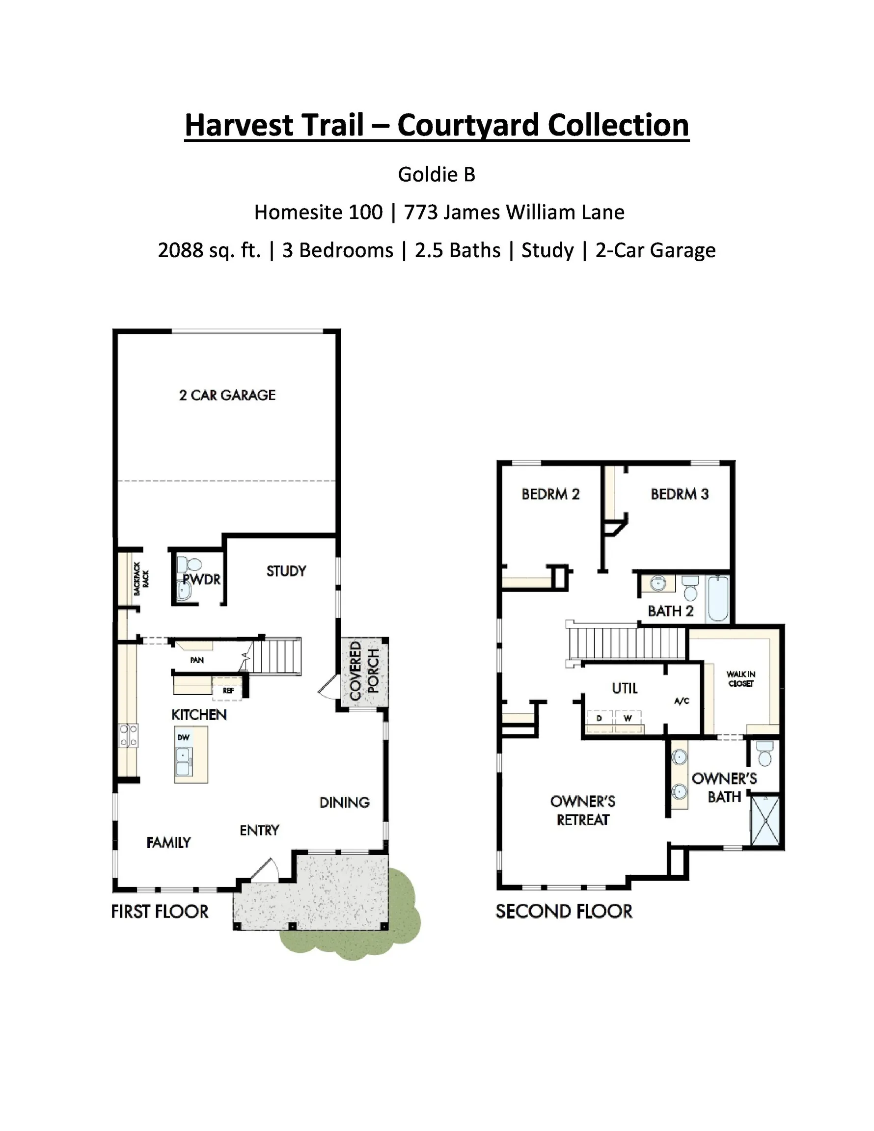 Welcome to the beautifully designed Goldie Plan, a thoughtfully crafted two-story home that combines style, comfort, and smart use of space. This 3-bedroom, 2.5-bath gem features a unique layout with a secluded study tucked away at the back of the main floor-perfect for focused work or creative pursuits. Step into an inviting main level adorned with rich gray laminate wood flooring and enjoy open-concept living that flows seamlessly from the living room to a kitchen that’s both elegant and functional. Cook with ease on a gas range surrounded by crisp white cabinetry, all bathed in natural light thanks to an abundance of windows throughout the home. Upstairs, you’ll find cozy carpeted bedrooms, including the luxurious owner’s retreat with a tray ceiling that adds a touch of sophistication. The light and bright bathrooms feature white cabinets, white counter tops, and continued gray laminate wood flooring for a fresh, modern feel. A pocket office is at the top of the stairs offers additional space for productivity, learning, or hobbies-whatever suits your lifestyle. This home strikes the perfect balance between open living and private retreats, making it ideal for both everyday life and entertaining