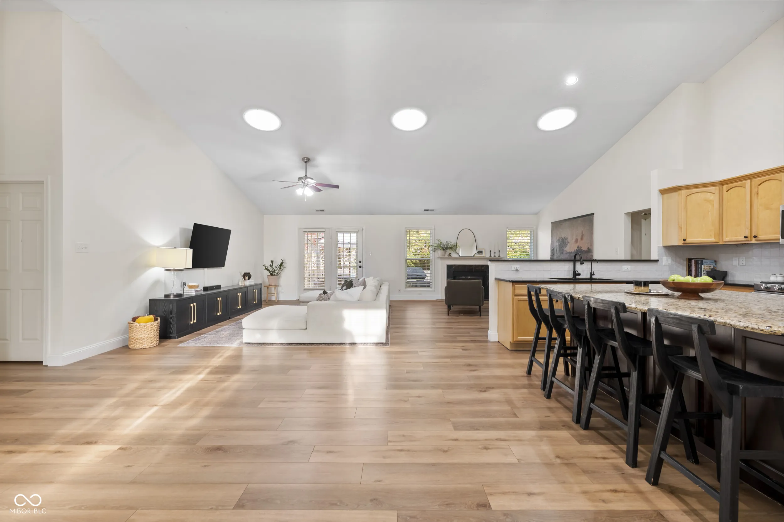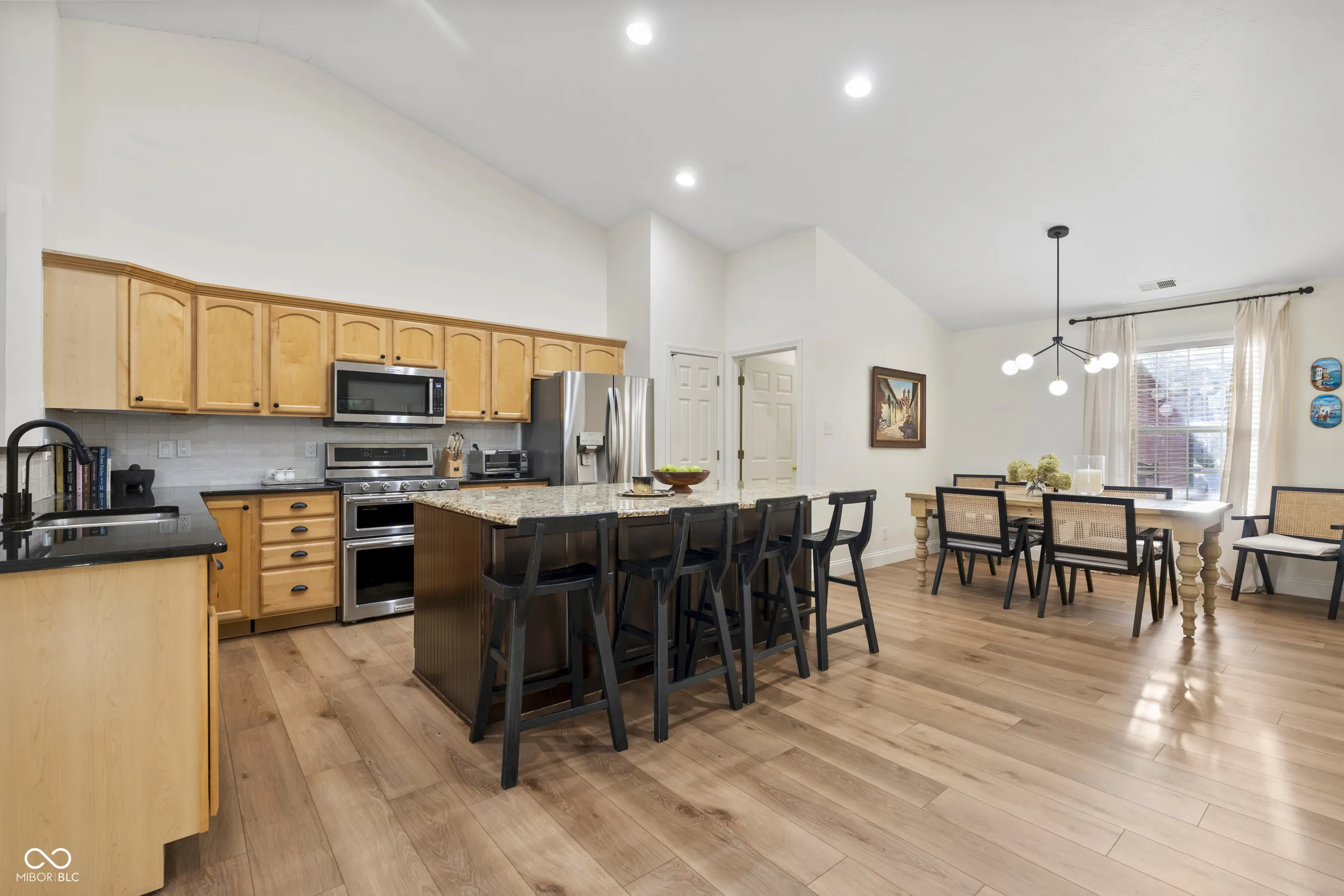 Looking for a ranch in Fishers? This one is a must-see! Step inside and be wowed by the truly open floor plan featuring vaulted ceilings and beautiful luxury vinyl planks that highlight the spacious great room, hearth room, dining area, and kitchen. The kitchen is designed to impress with maple cabinets, granite countertops, a HUGE custom granite island, a new and updated tile backsplash, and all recently upgraded appliances (including a double oven). The primary suite is filled with natural light and offers two closets, an updated walk-in shower, and a relaxing garden tub. Three additional bedrooms share an updated full bath, with the fourth bedroom currently used as a home office (but use it how you like!). A large laundry area provides extra convenience, while outside you’ll find a stamped concrete patio and fenced backyard-perfect for entertaining or relaxing. Ideally located near the newly constructed Fishers Event Center, Nickel Plate District, shopping, restaurants, and more, this home combines comfort, style, and a prime Fishers location!