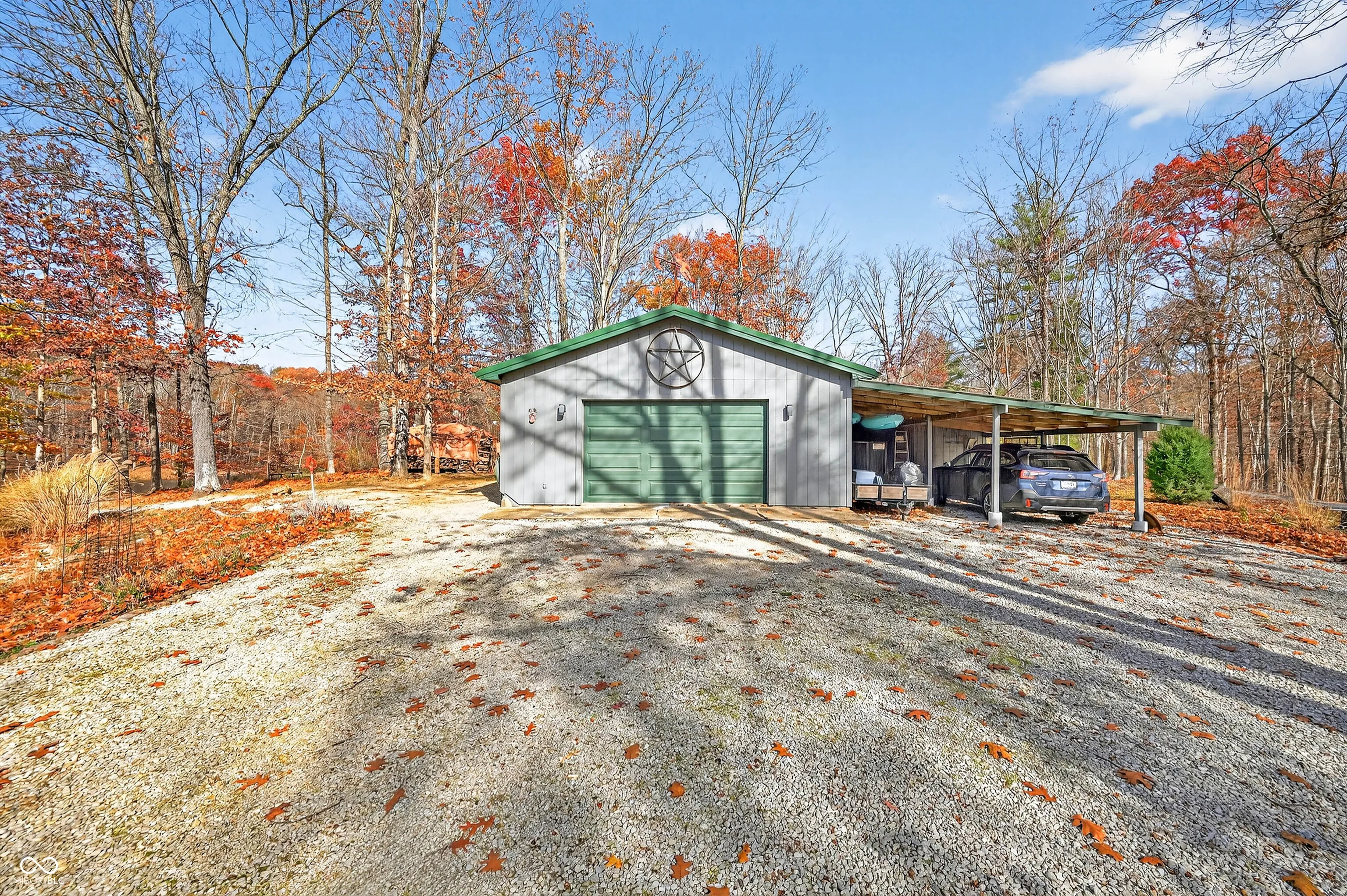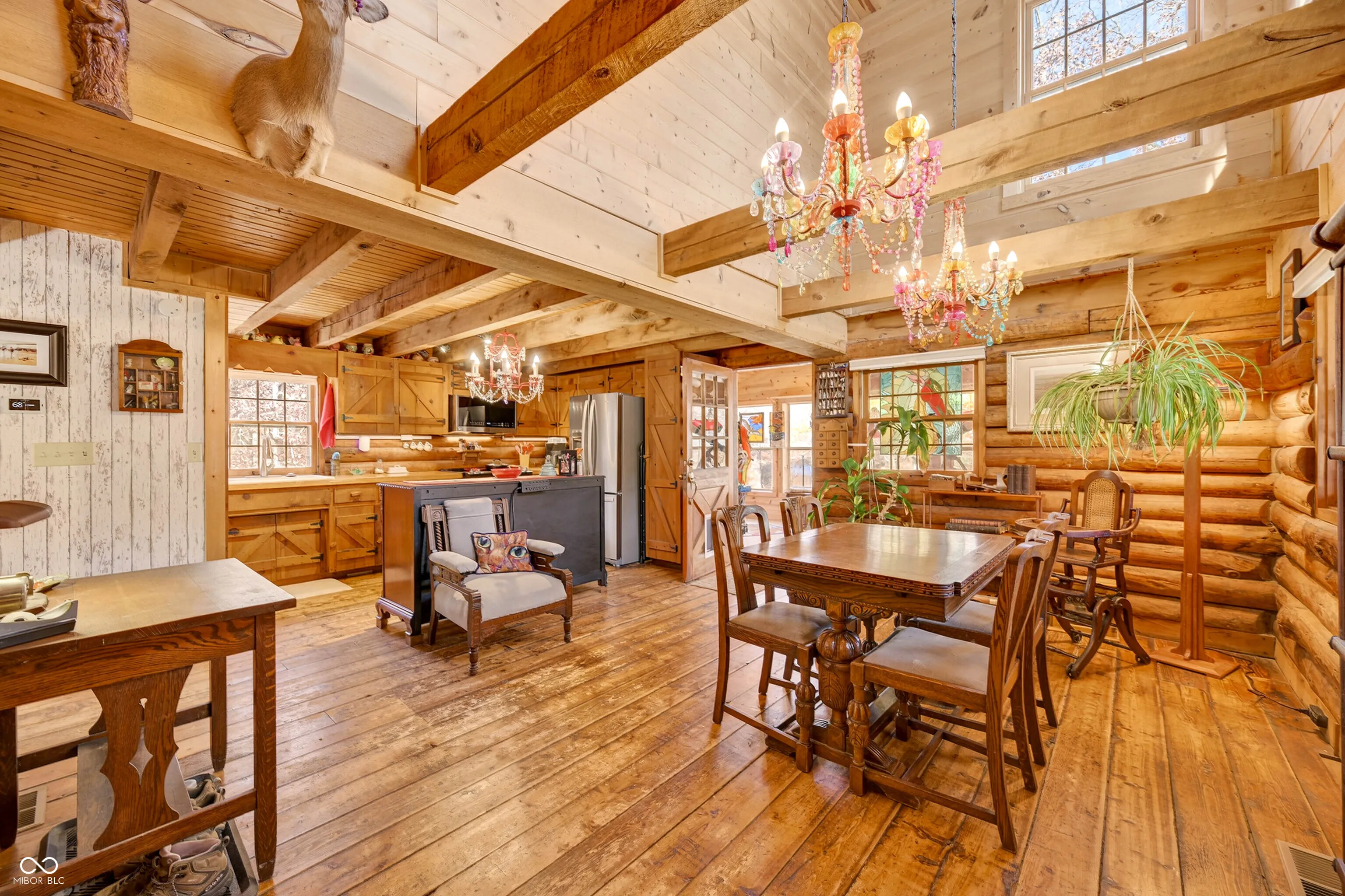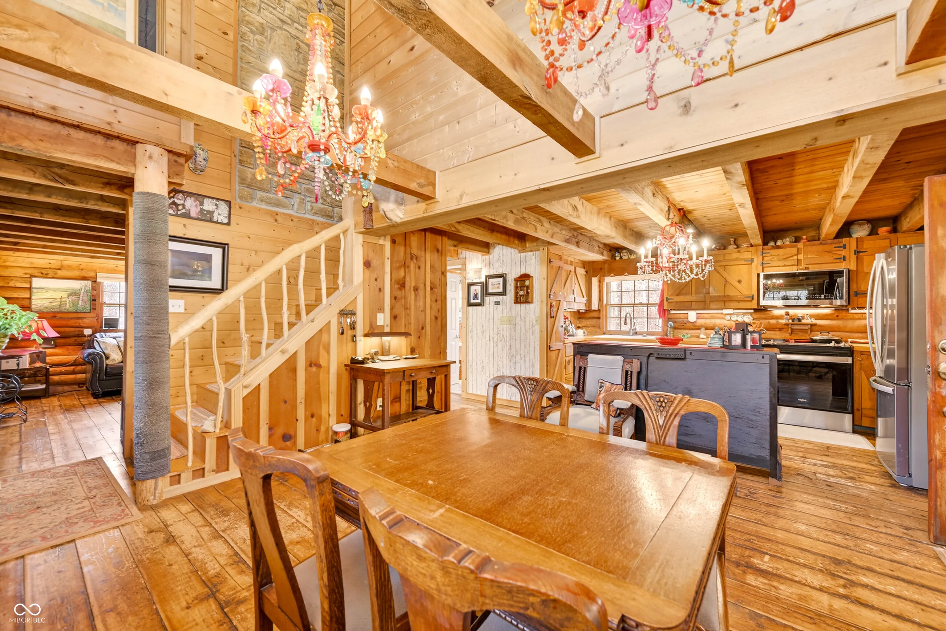 Discover rustic hilltop living at this charming log cabin that includes 2 bedrooms, 2.5 baths, featuring a custom second-level bathroom, plus a versatile loft area great for storage or a kids’ indoor “treehouse.” The open-concept kitchen and dining room provide a functional central gathering space. Enjoy two Brown County stone fireplaces-a wood-burning fireplace in the living room and a second in the lower level ready for a new damper or a fitted ventless gas log setup for added efficiency. The walkout basement offers additional functionality with a family room, full bath and a large partially finished room ideal for hobbies, crafts, a workshop, plus laundry facilities, along with direct access to a large open patio. Additional living spaces include a 3-seasons room overlooking the neighboring lake and a covered front porch. An insulated 2-car detached garage with workshop space, attached carport, and storage shed provide ample space for vehicles, tools, and outdoor equipment. The property is nicely landscaped and set on a quiet country road with convenient access to State Road 45 and Helmsburg Road. Designed for functionality, charm, and comfort, this home offers abundant usable space in a peaceful Brown County setting.