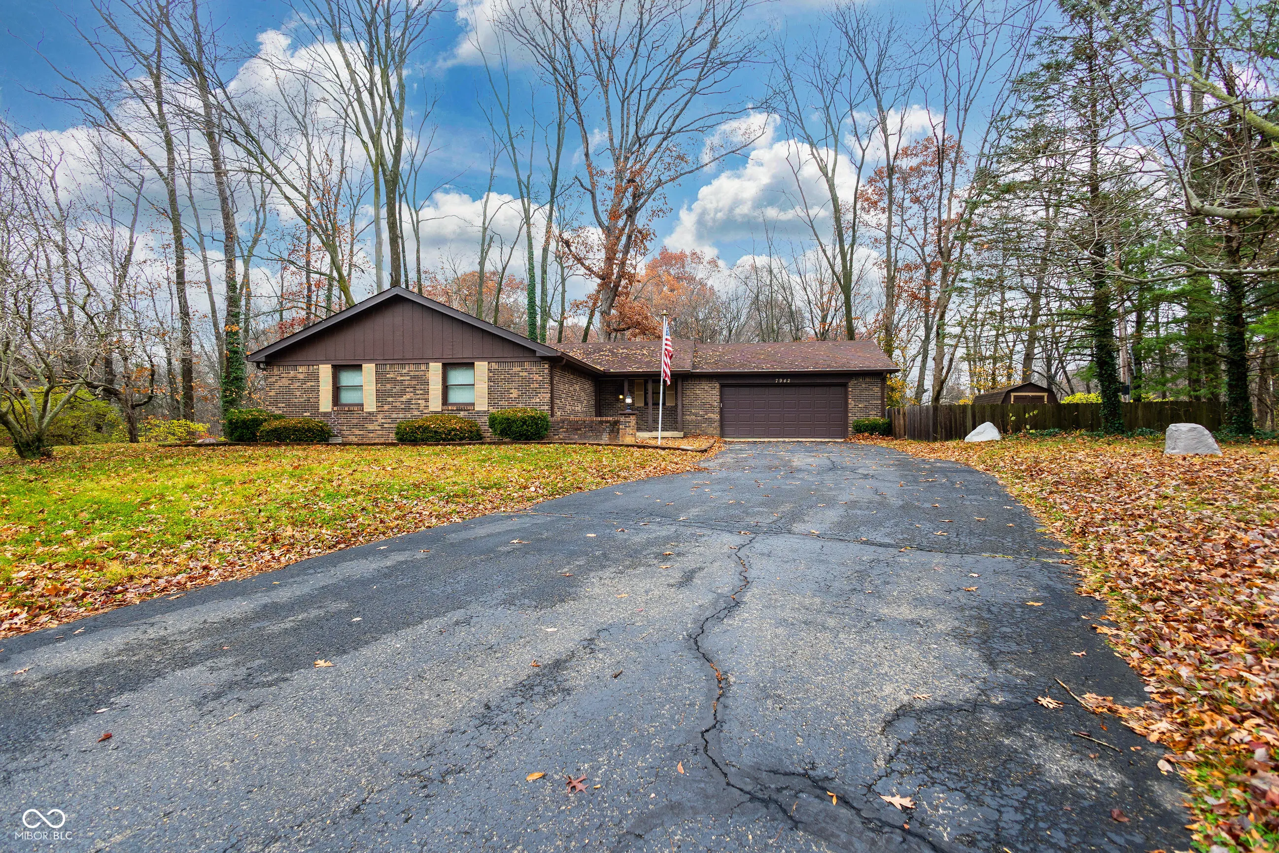 Spectacular view of the woods from your private deck is where you will want to be! Brick ranch on over a half an acre. No HOA! Three bedrooms, two bath. Primary suite with hard wood floors and bath with large vanity space and walk in shower. Great room with wood beams, cathedral ceiling, stunning hardwood floors, and stone fireplace with views of the gorgeous wooded back yard. Large bright kitchen with huge island, large dining area, ceramic tile, and sliding doors to the deck. Spacious fenced in yard offers a mini barn, Plenty of open space, and again a view of those breathtaking woods! Finished two car garage with lots of storage space!