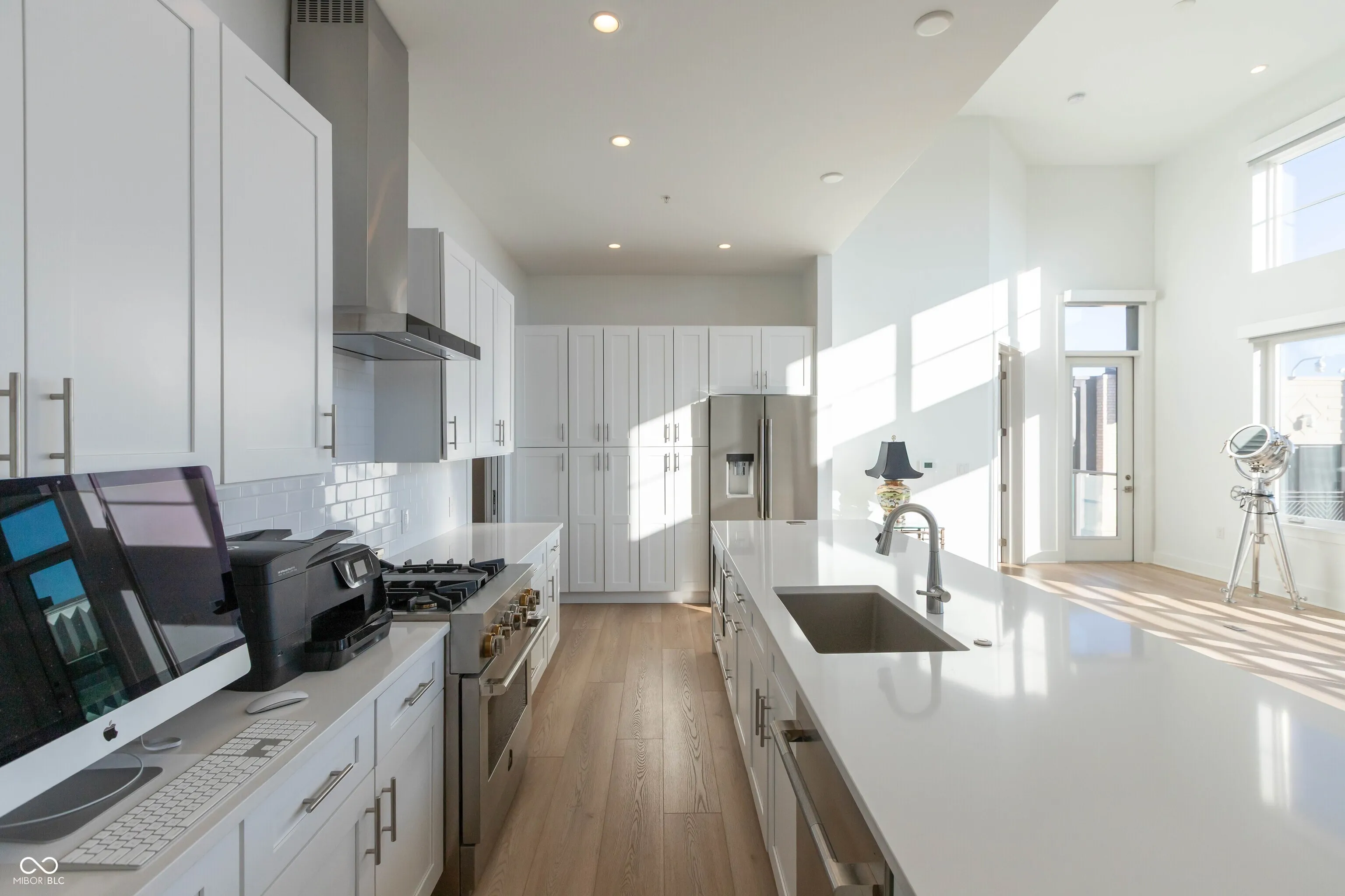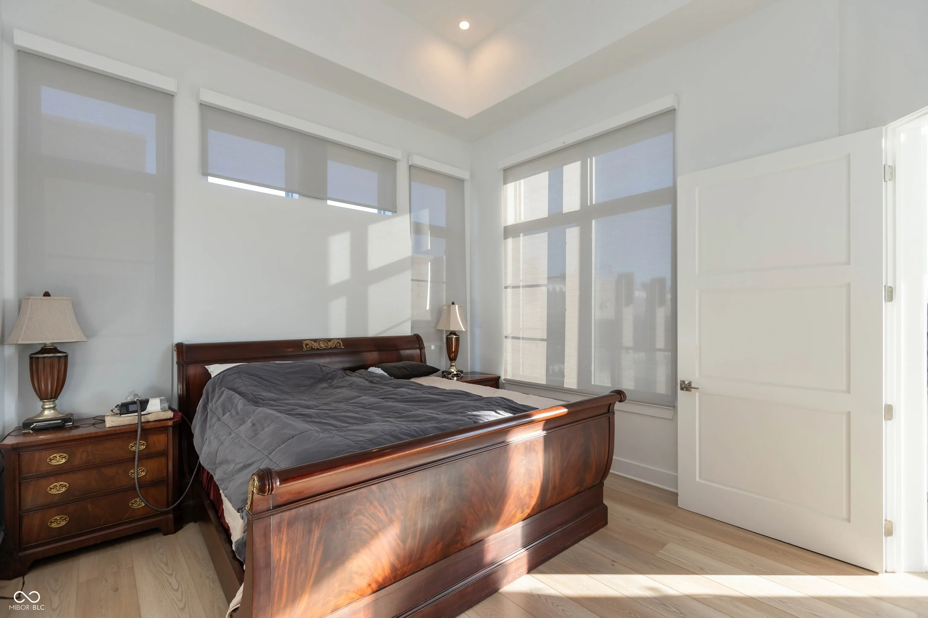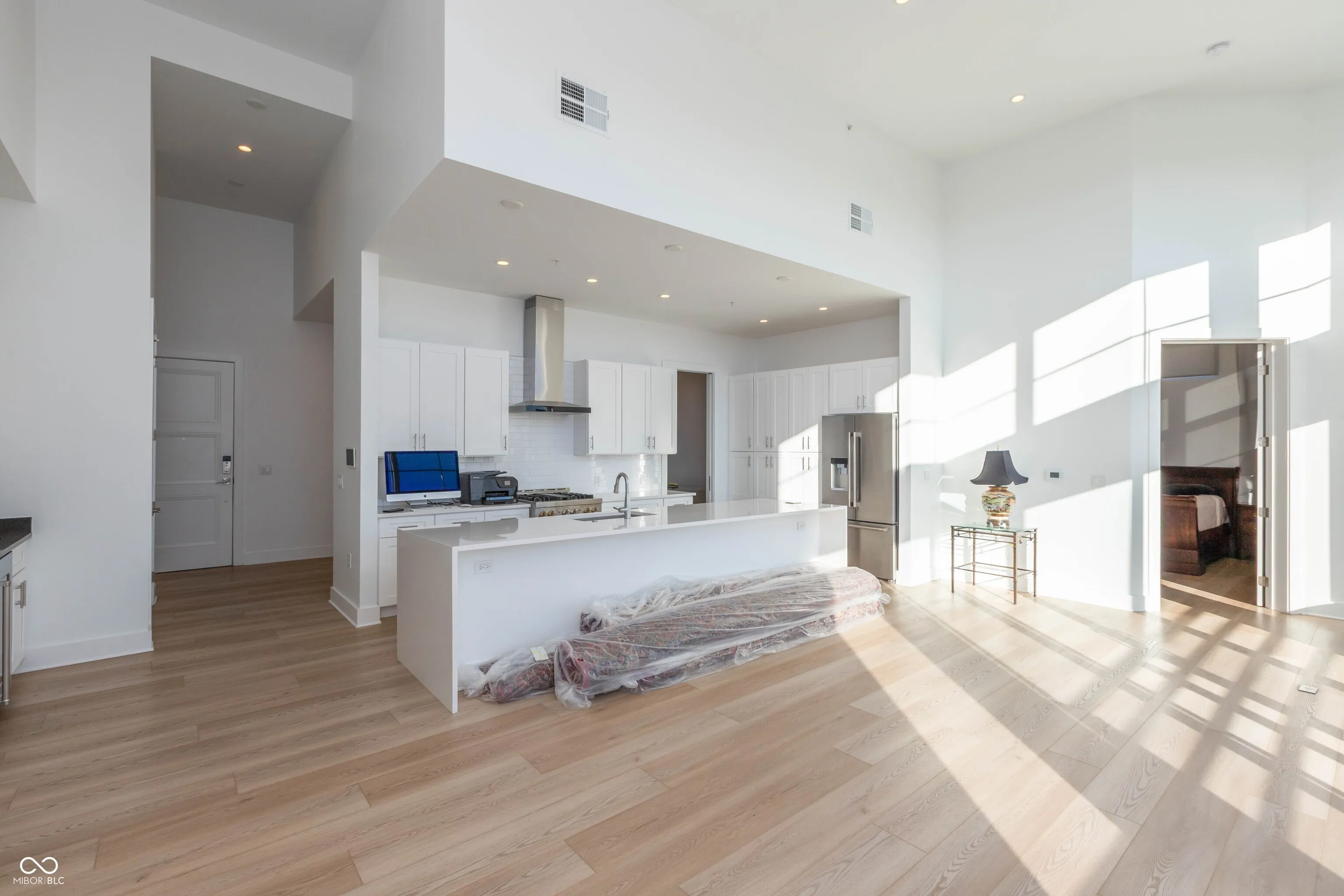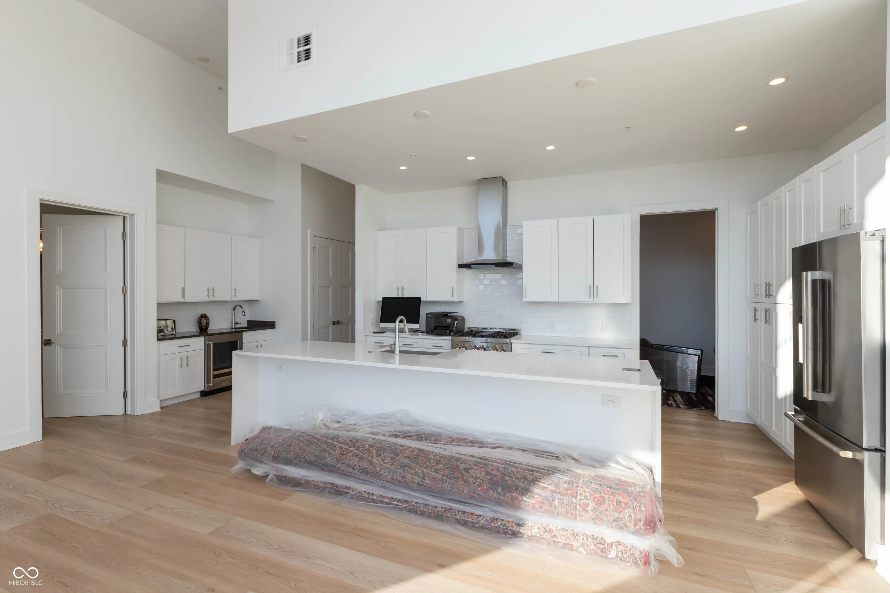 Seller is open to rent with commitment to purchase. One of the best units at REV at Proscenium! Top floor with views overlooking the park to the south! Floor to ceiling windows with automatic blinds. Gorgeous white kitchen with marble countertops , tiled backsplash and waterfall center island is open to great room with 14 foot ceilings! Stainless steel appliances including gas cooktop, refrigerator, dishwasher, oven, microwave and wine refrigerator in wet bar! Hardwood flooring. Two bedrooms each with their own full bath plus a powder room for guests. Closets feature tons of custom built ins. Private office/den. Fire sprinkler in unit and alarm system. Laundry room. Balcony to enjoy outdoor views and watch the sunset. Immaculate condition! Private underground parking (with two spaces for this unit), fitness center, individual storage lockers, mail room, package delivery area, bicycle storage room plus clubhouse area with access to grilling area, outdoor community pool and firepit. Easy walk to grocery, restaurants, bank, barbershop, ice cream store and more! This unit is in the heart of the Carmel Arts and Design District! Convenient access to the Monon Trail and walkable to the Palladium/City Center!