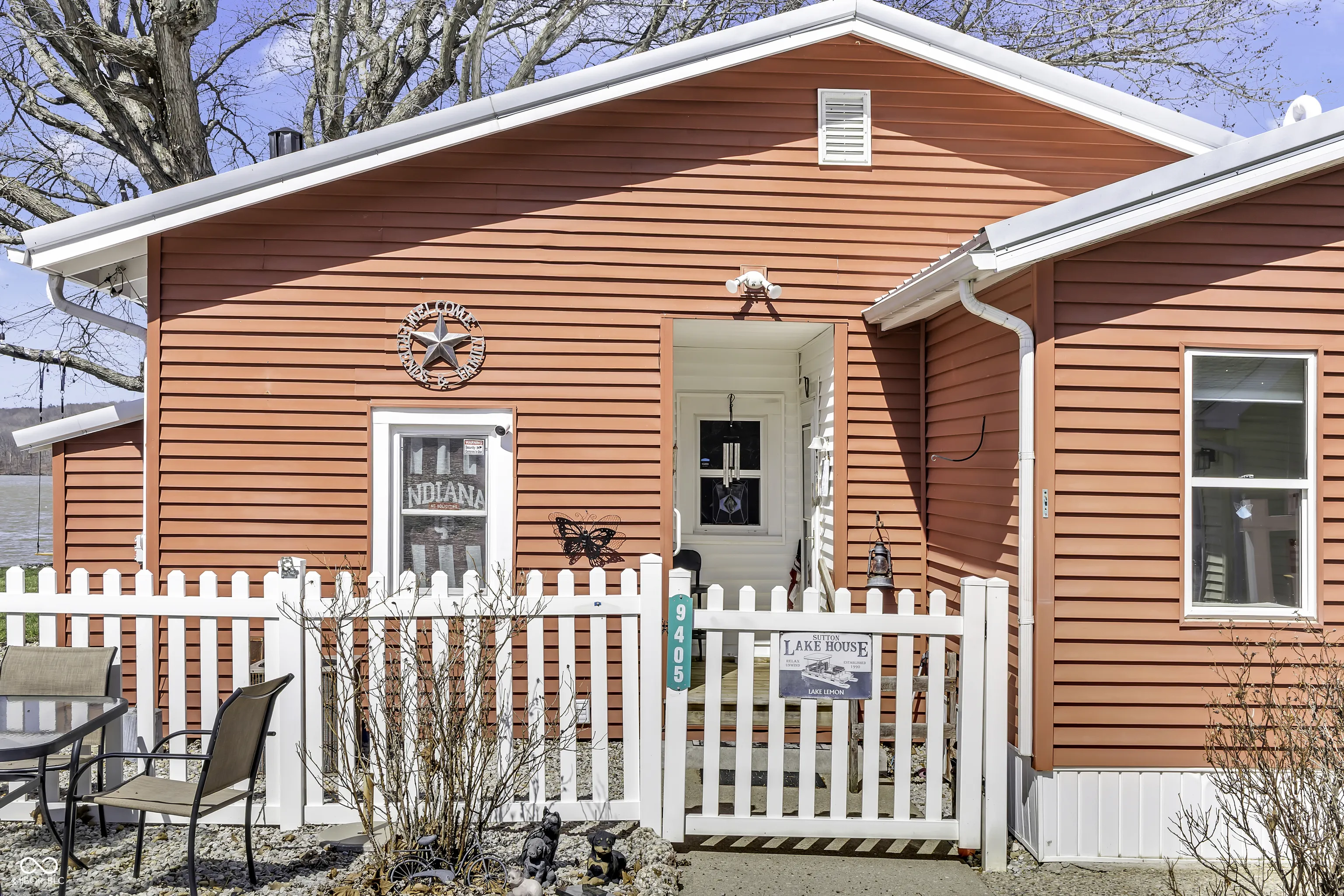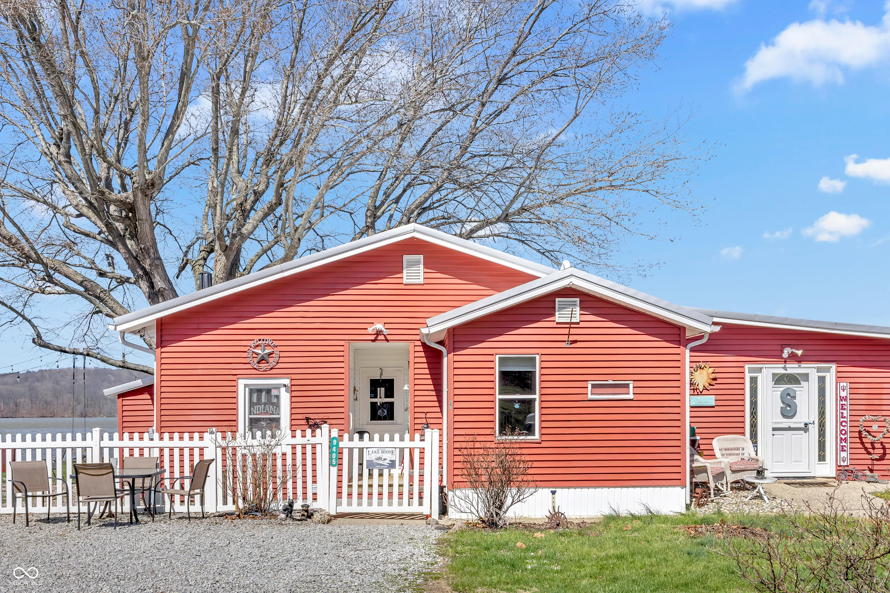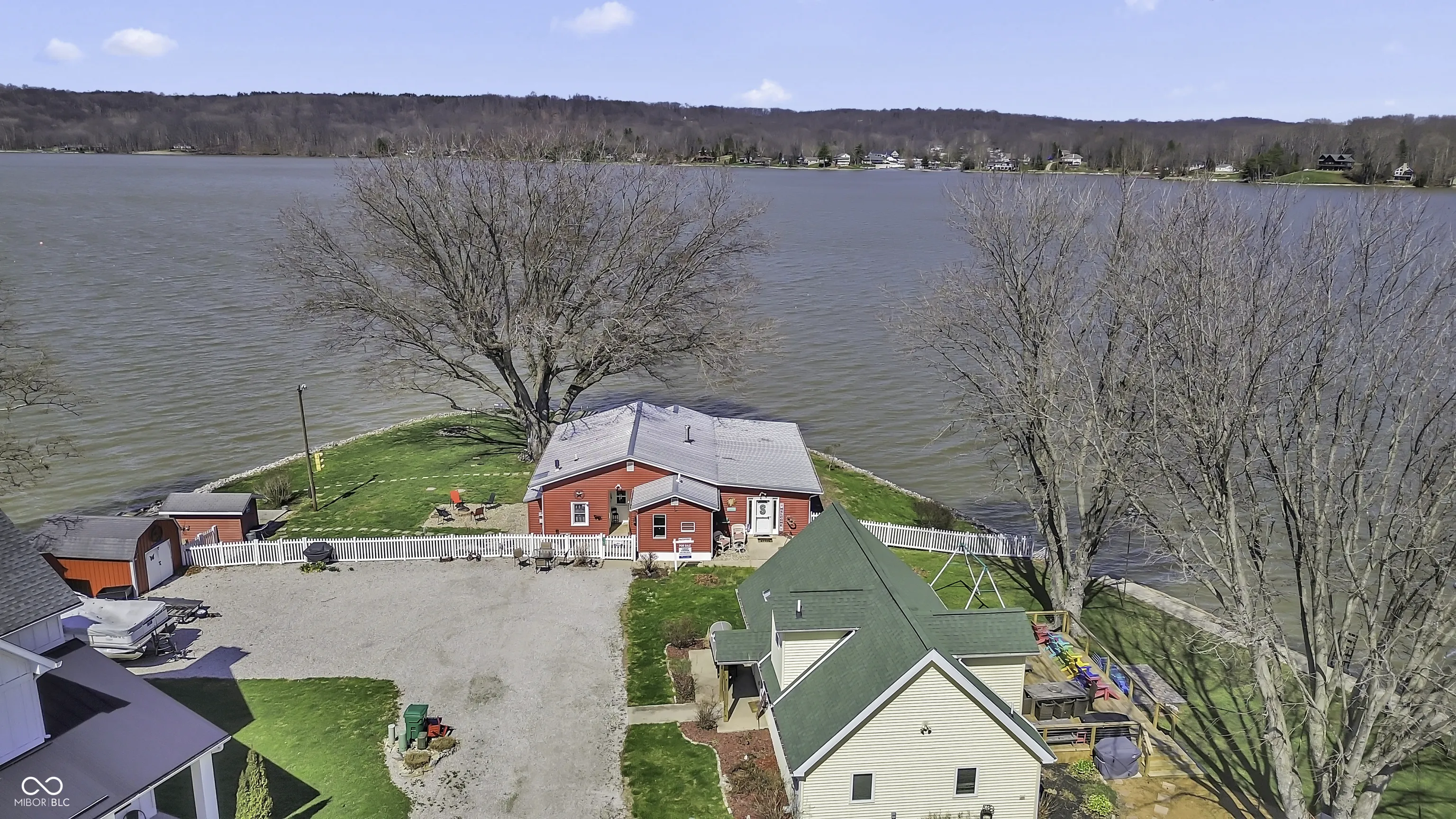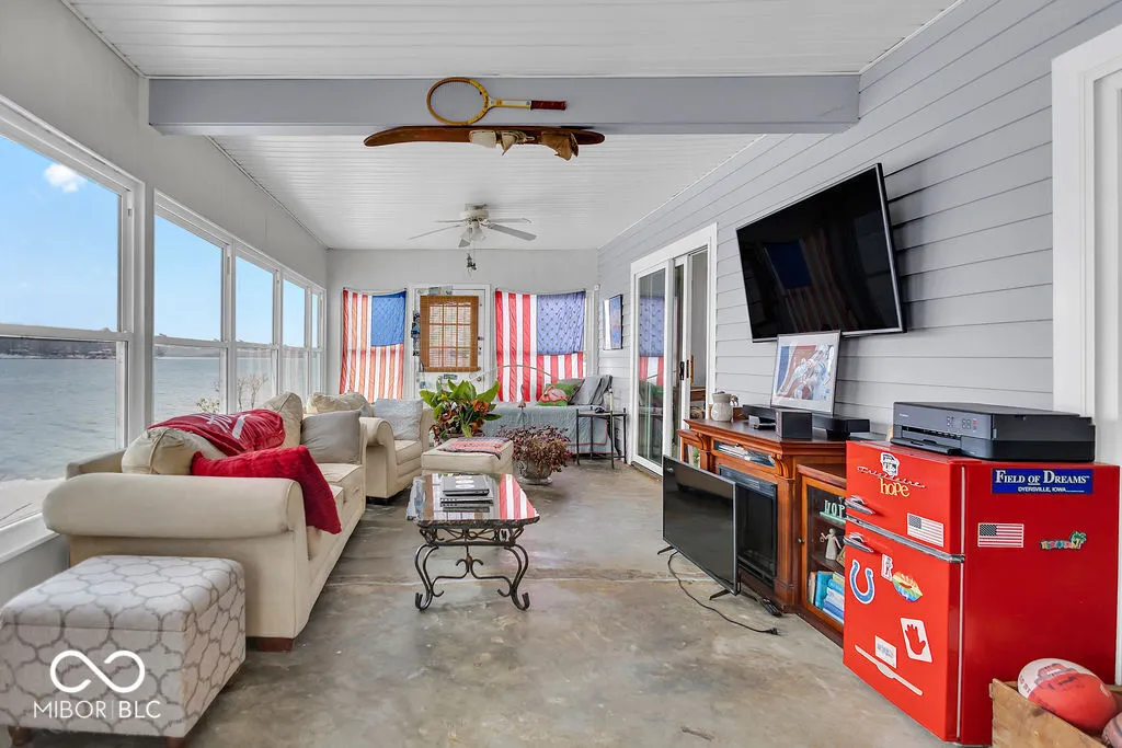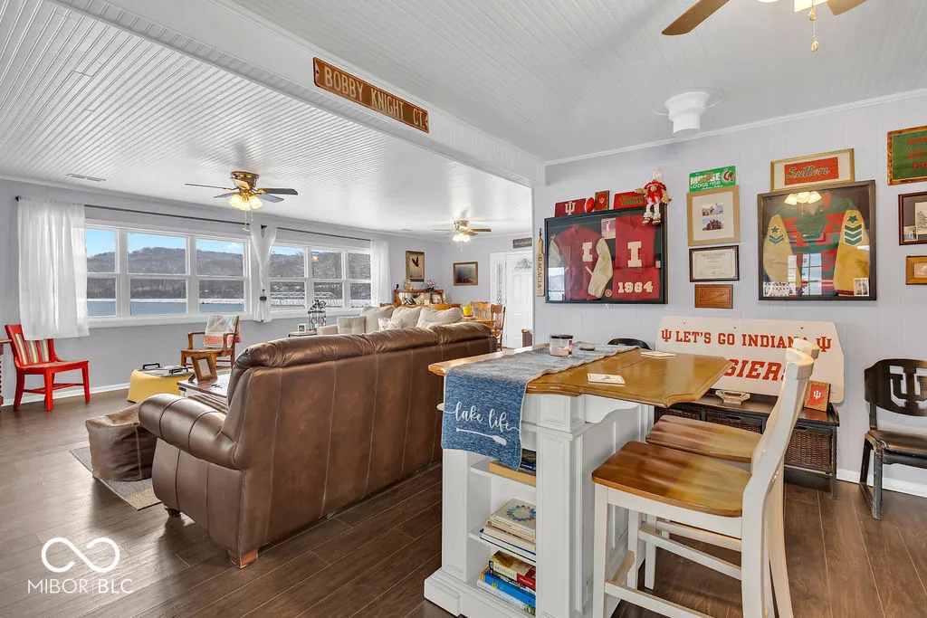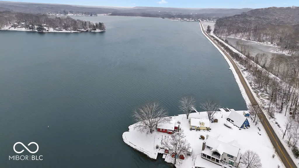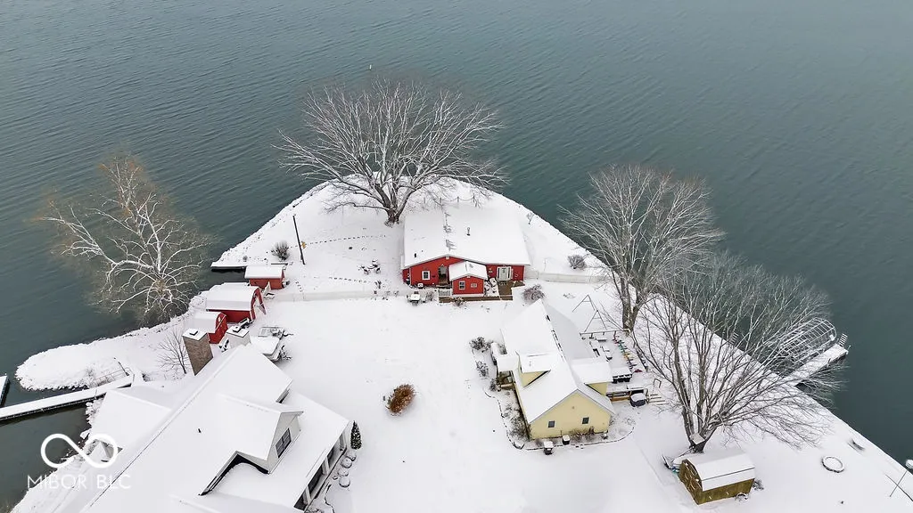 PRICE REDUCED! Experience true lakefront living on Lake Lemon, a 1650 acre lake in southern Indiana located just minutes from Bloomington. This waterfront cottage is positioned on a rare peninsula with panoramic 180 degree lake views and approximately 350 feet of deeded shoreline. Enjoy year round views of Lake Lemon from the living room, kitchen, dining area, and both bedrooms. Relax in the three seasons room or step out onto the spacious deck for outdoor entertaining. The property offers direct access to a swimming dock from the yard along with a private dock area that includes a concrete pad and a storage shed for boating and lake equipment. The home features two bedrooms with a shared Jack and Jill full bathroom along with a second full bathroom located off the kitchen. Updates include new flooring and paint in 2022 and a metal roof added in 2018. Additional amenities include an RV hookup and two extra storage sheds in the large driveway. This lakefront property offers one of the best lots on Lake Lemon and provides an exceptional opportunity to enjoy the lake lifestyle this spring.
