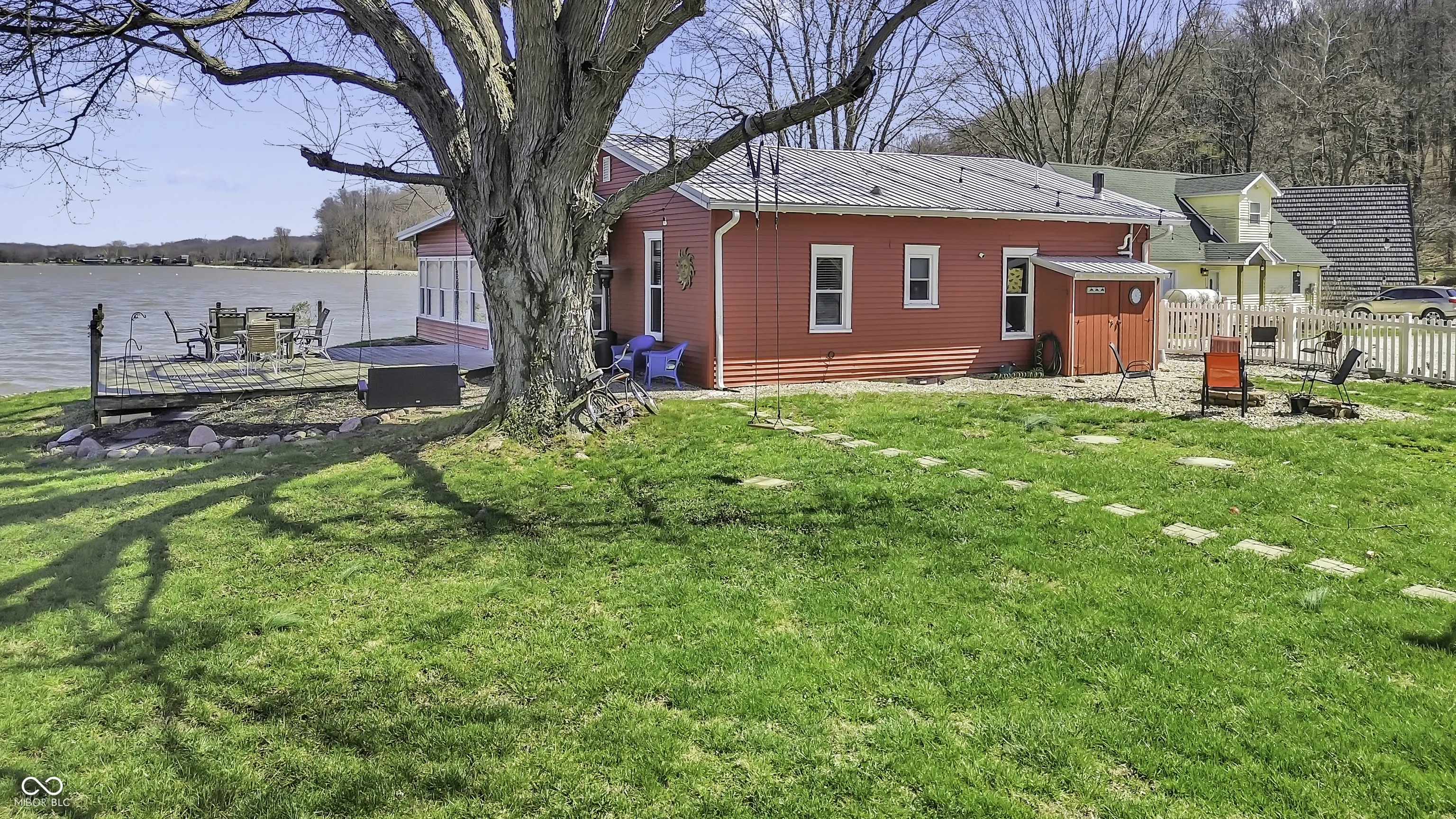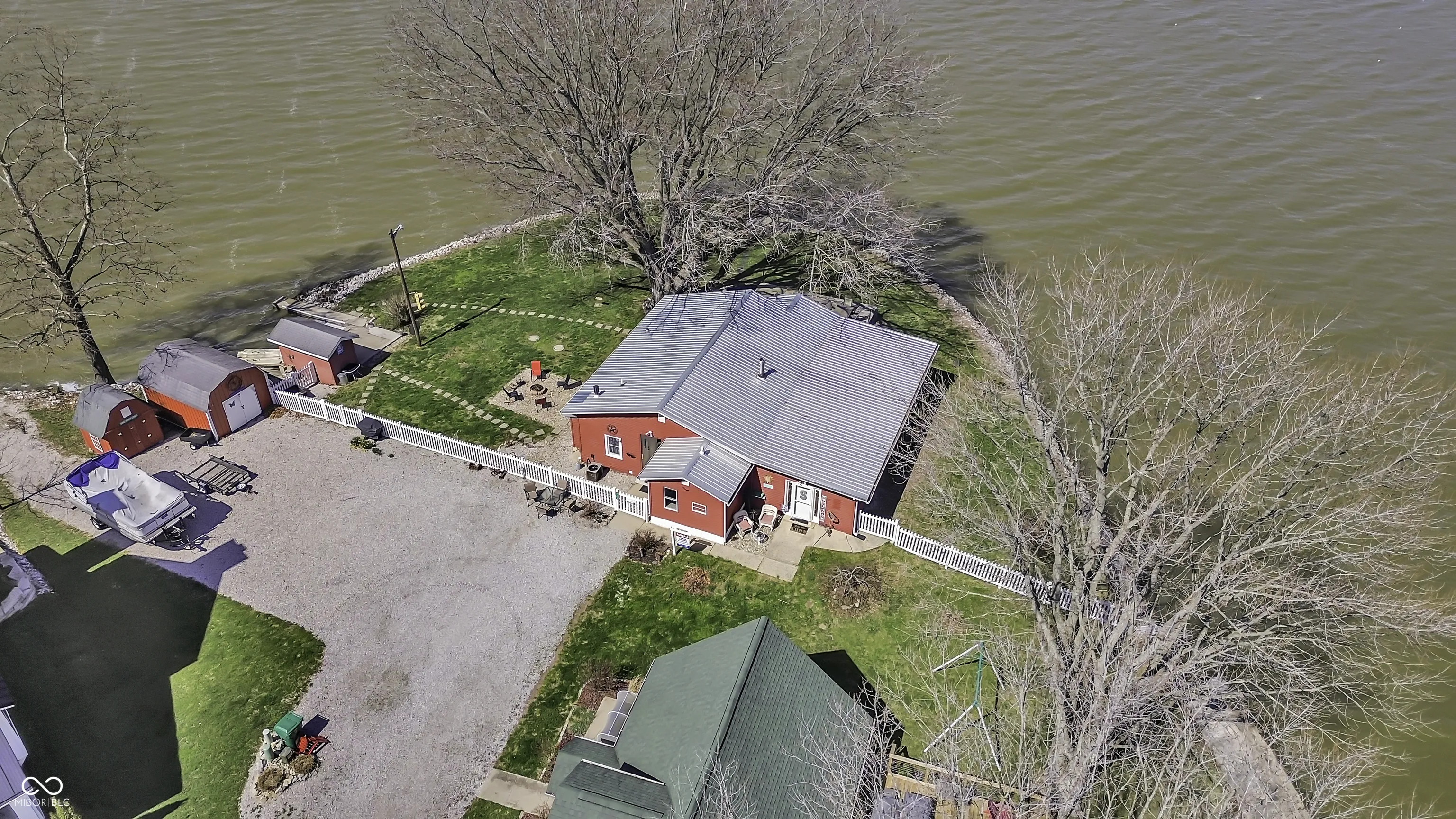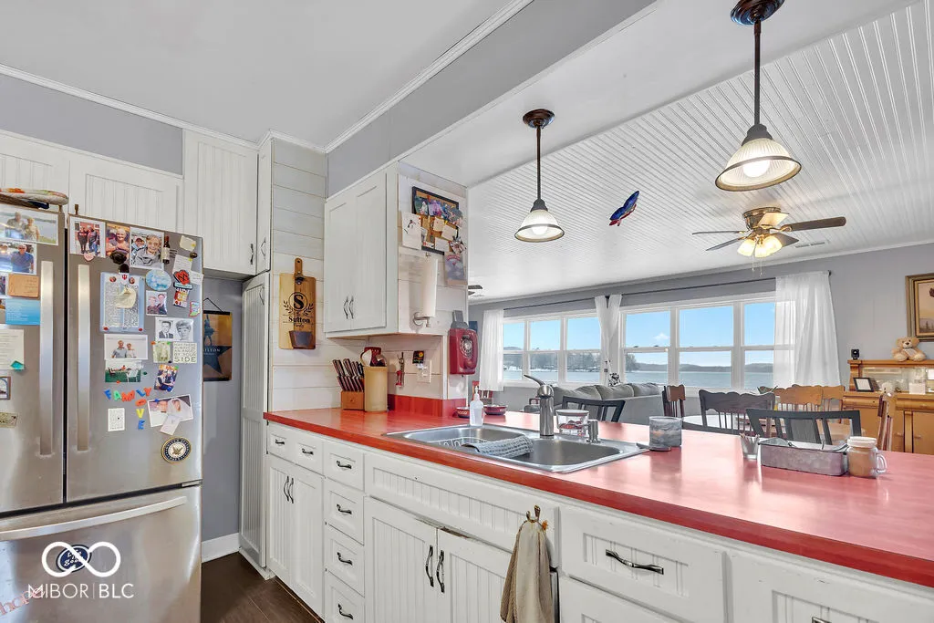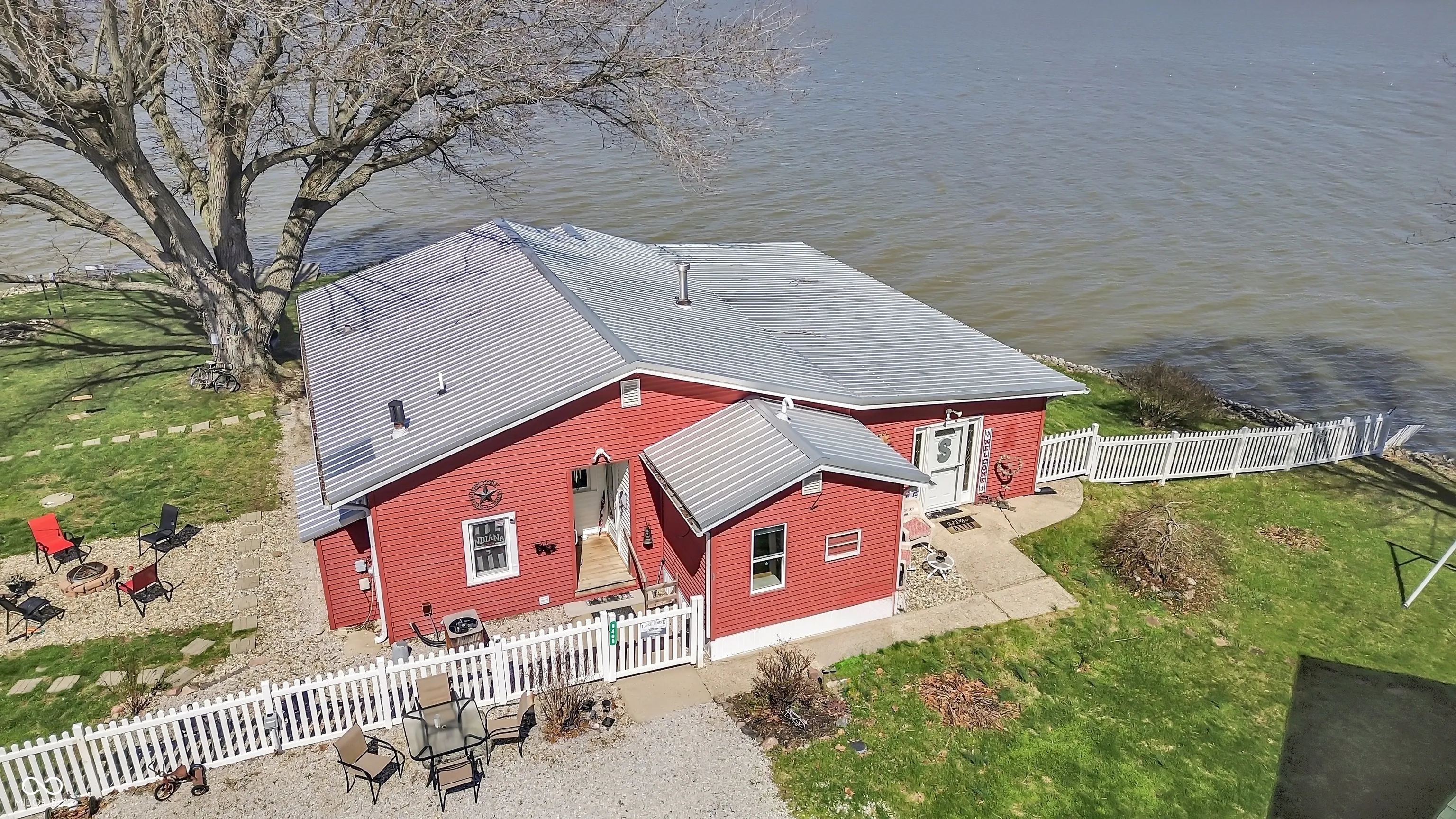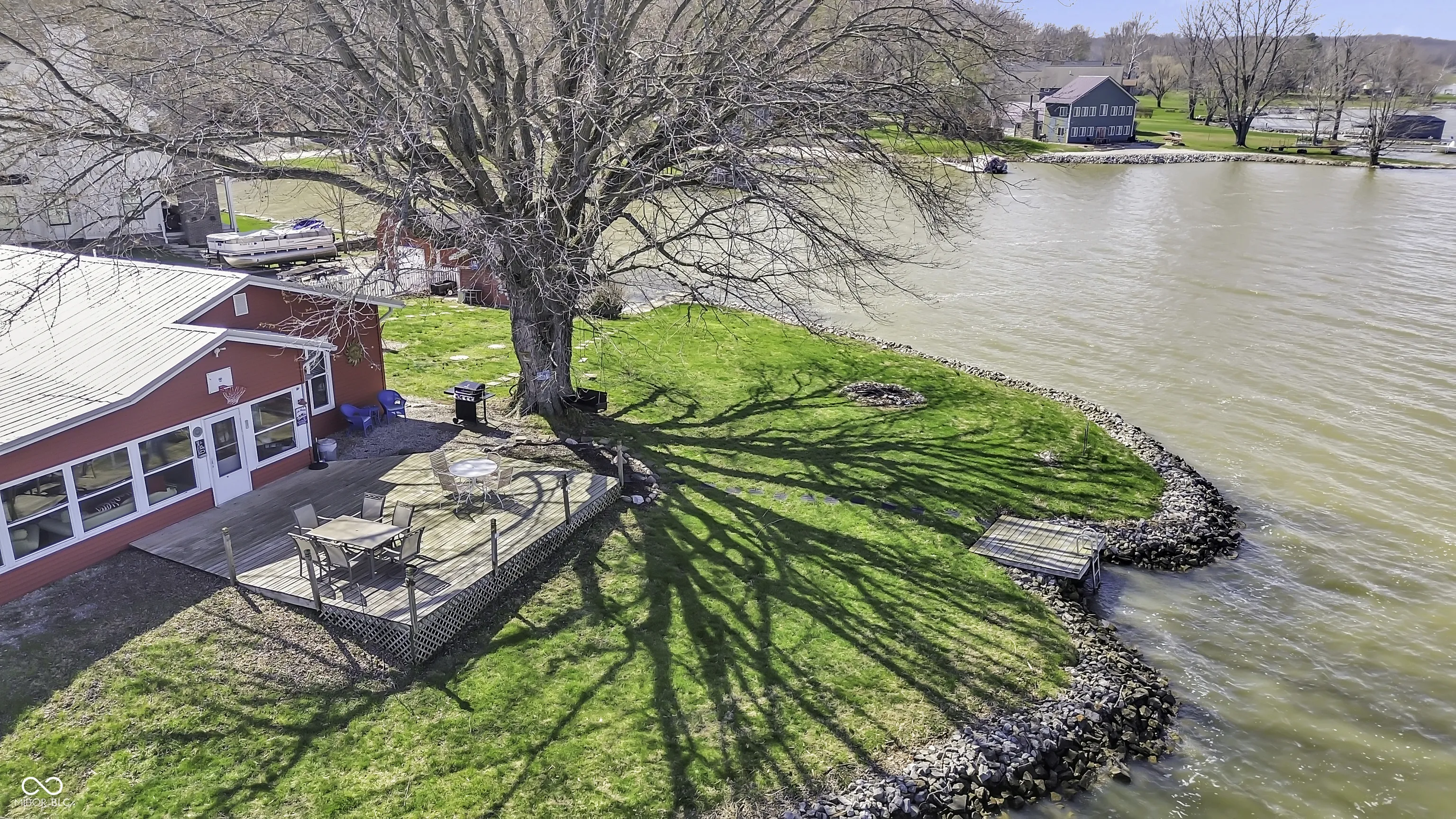 PRICE REDUCED! Experience true lakefront living on Lake Lemon, a 1650 acre lake in southern Indiana located just minutes from Bloomington. This waterfront cottage is positioned on a rare peninsula with panoramic 180 degree lake views and approximately 350 feet of deeded shoreline. Enjoy year round views of Lake Lemon from the living room, kitchen, dining area, and both bedrooms. Relax in the three seasons room or step out onto the spacious deck for outdoor entertaining. The property offers direct access to a swimming dock from the yard along with a private dock area that includes a concrete pad and a storage shed for boating and lake equipment. The home features two bedrooms with a shared Jack and Jill full bathroom along with a second full bathroom located off the kitchen. Updates include new flooring and paint in 2022 and a metal roof added in 2018. Additional amenities include an RV hookup and two extra storage sheds in the large driveway. This lakefront property offers one of the best lots on Lake Lemon and provides an exceptional opportunity to enjoy the lake lifestyle this spring.