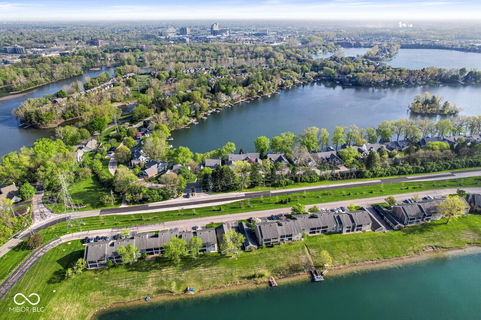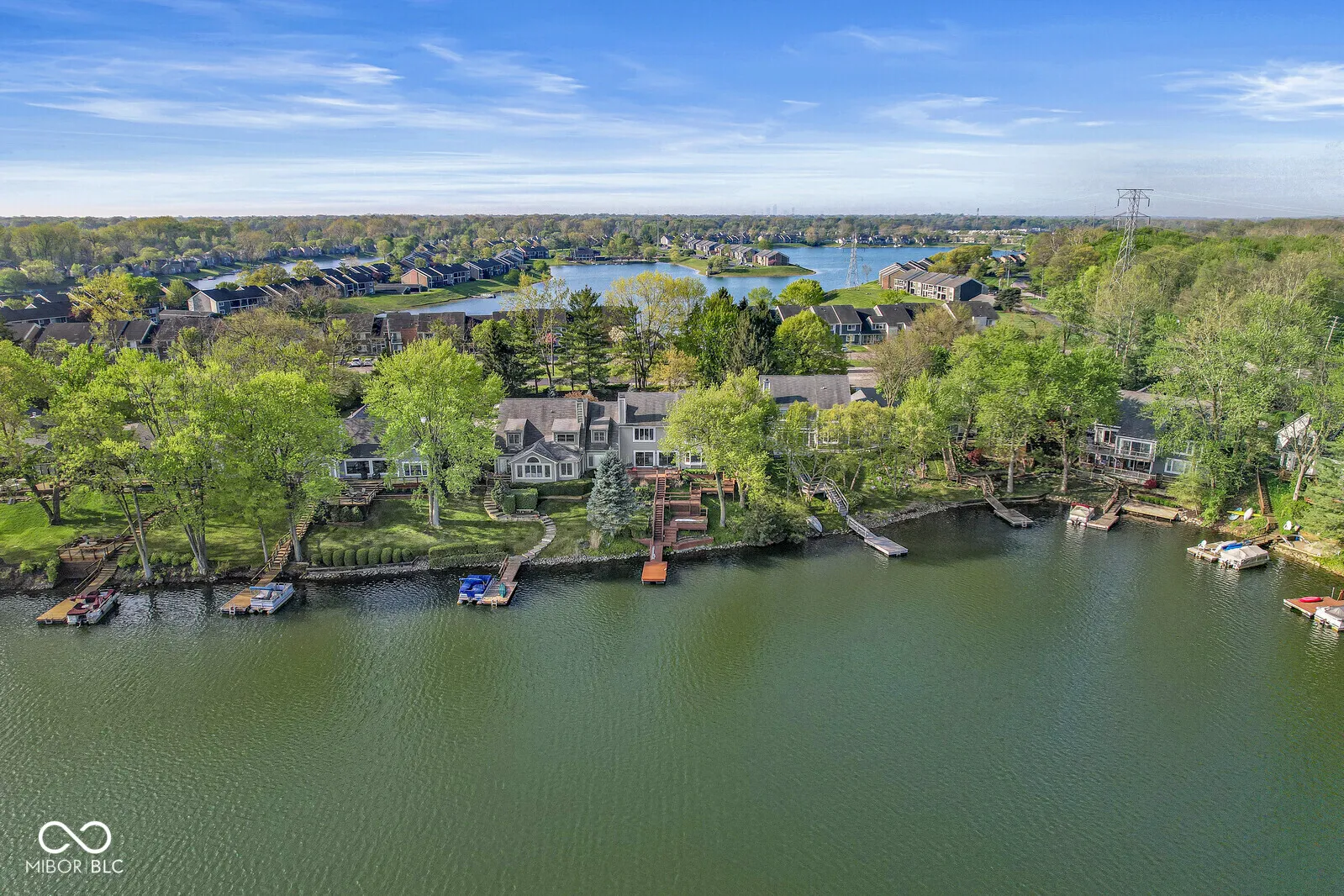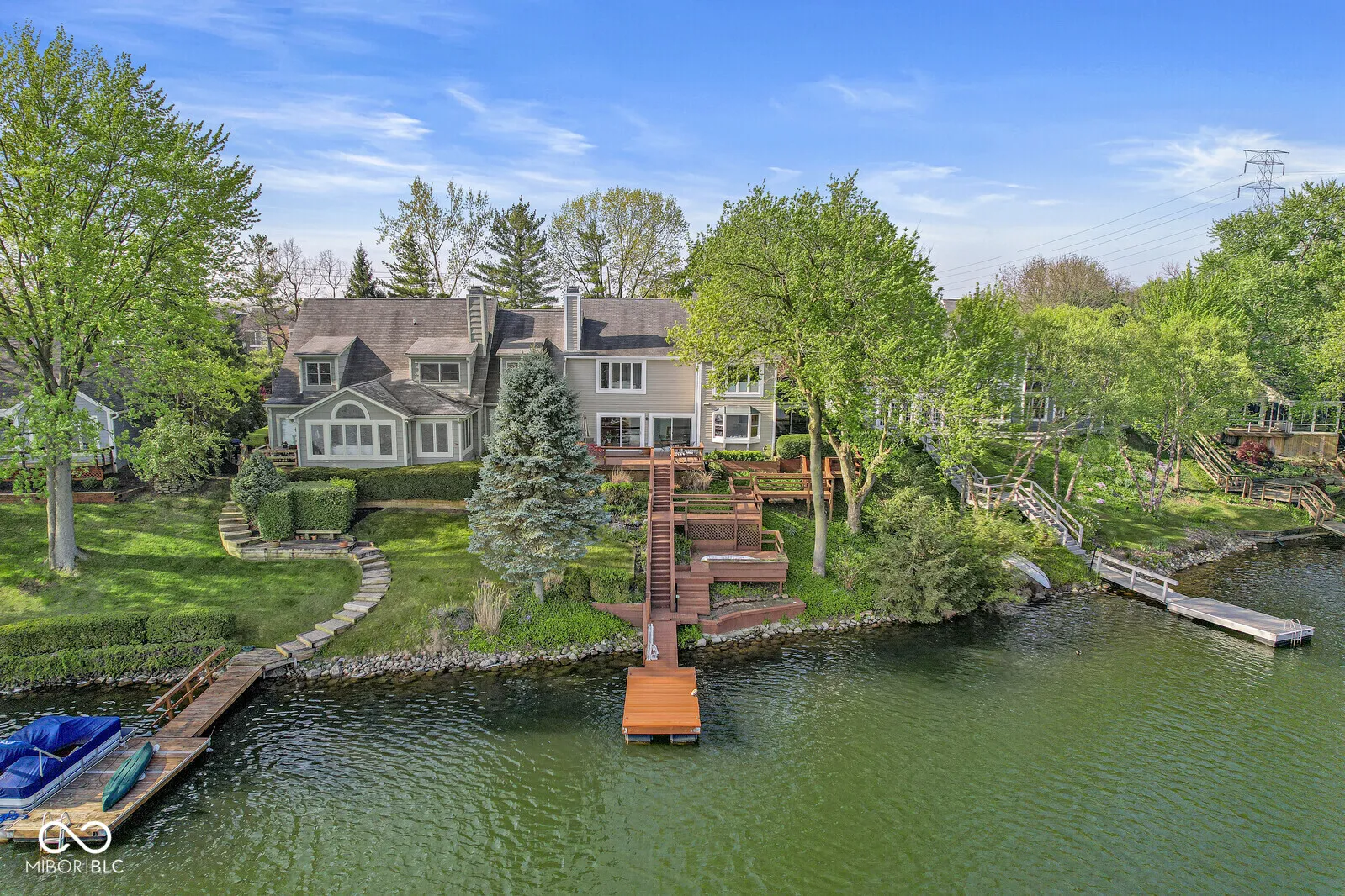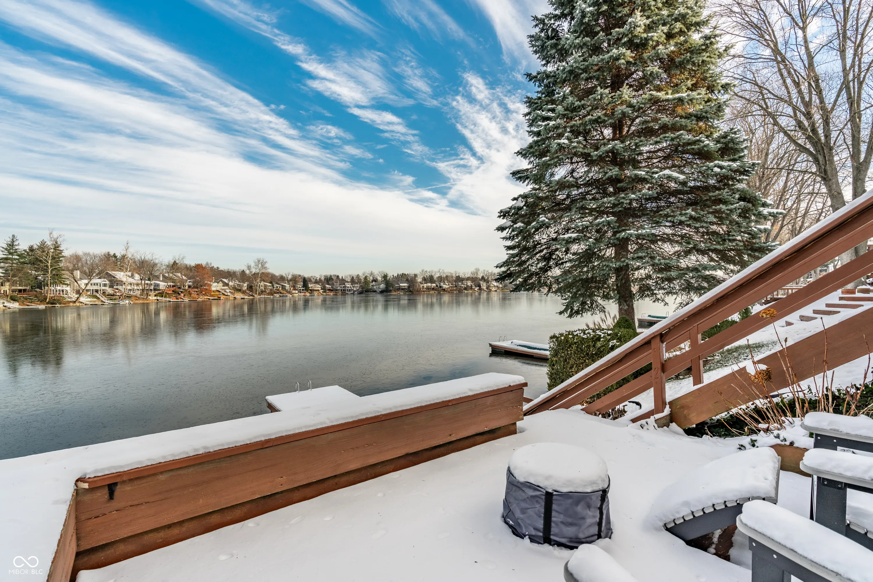 Welcome to Nantucket Bay! This spacious 3-bedroom, 2.5-bath home offers breathtaking water views from nearly every window, showcasing the stunning 50+ acre, spring-fed, tree-lined lake-stocked with over 20 species of fish. The living room with its fireplace is perfect for family movie nights or entertaining guests. Enjoy the sparkling lake right from your living room, complete with sliding glass doors that open to one of three private decks and your own boat dock. Step inside to a warm and inviting foyer with hardwood floors. Just off the entry is a cozy den/library built-in bookshelves, and French doors-an ideal retreat or home office. The open kitchen, equipped with stainless steel appliances flows seamlessly into the dining room and a charming sitting area & coffee bar with serene lake views. Upstairs, you’ll find the primary suite with a walk-in closet and shower stall, as well as two additional spacious bedrooms, all with newer carpet. The updated hall bathtub features a stunning remodel completed by Dream Baths by Bee (Bee Window). The neighborhood offers fantastic amenities including a tennis/pickleball court and quiet streets perfect for walking. Experience the tranquility of lakeside living every day while still being just minutes from Keystone at the Crossing, top restaurants, and shopping. Enjoy a low-maintenance lifestyle with more time to relax, travel, or entertain family and friends by the lake.