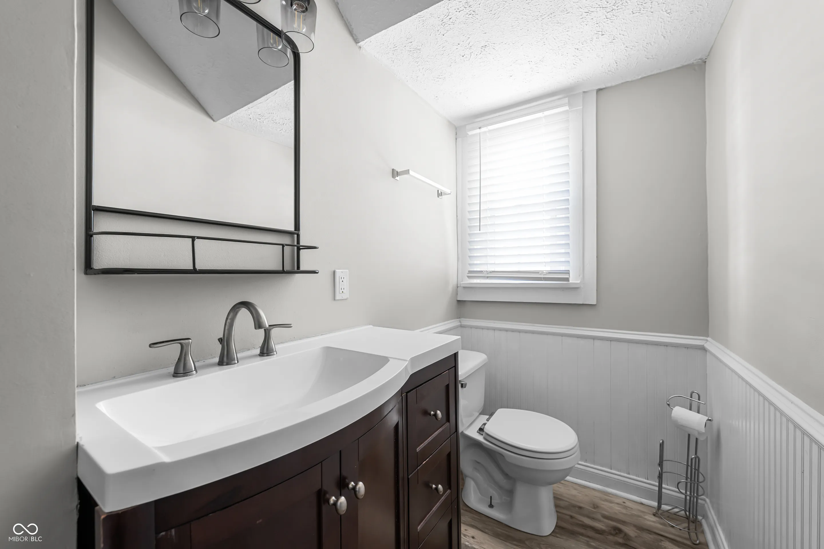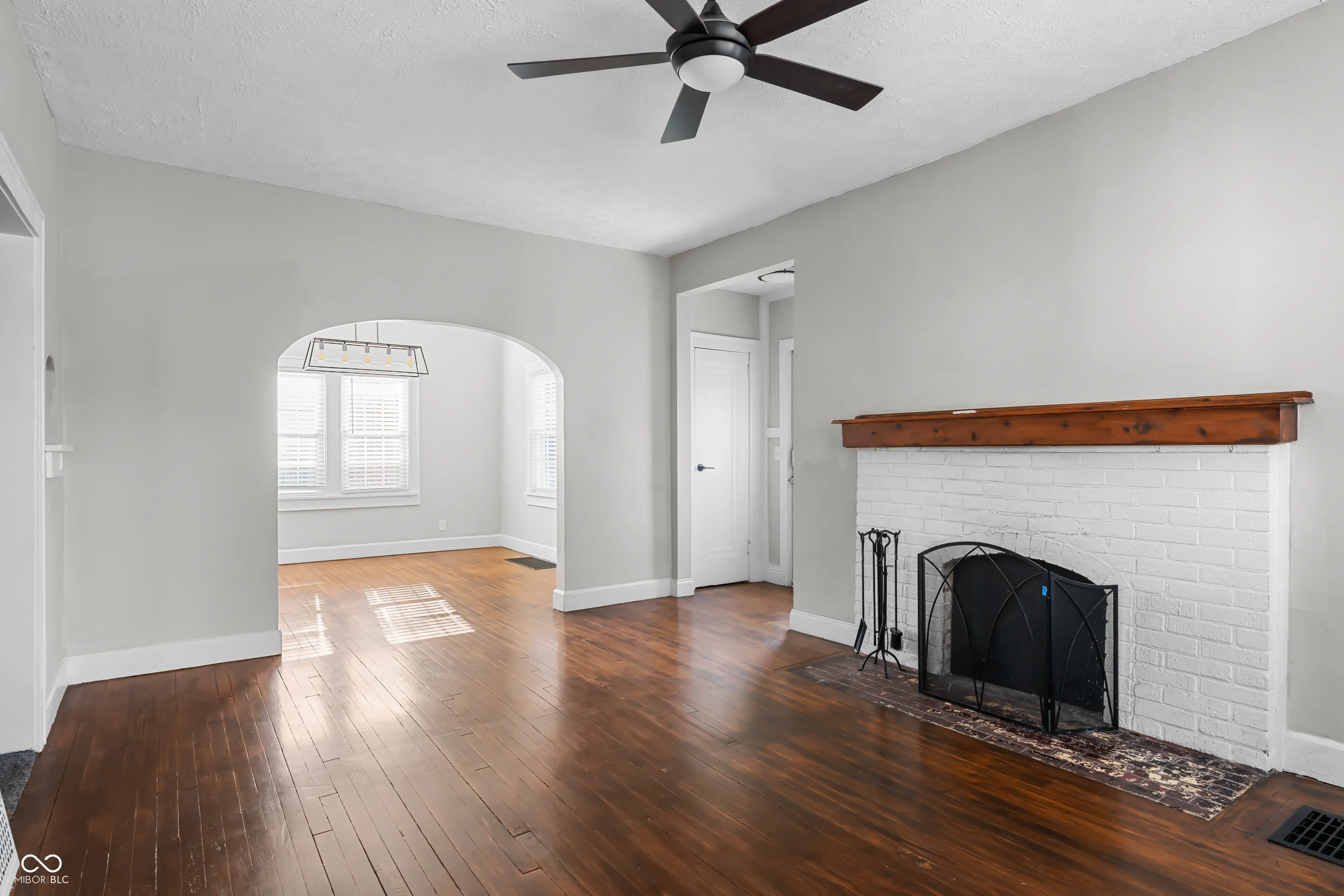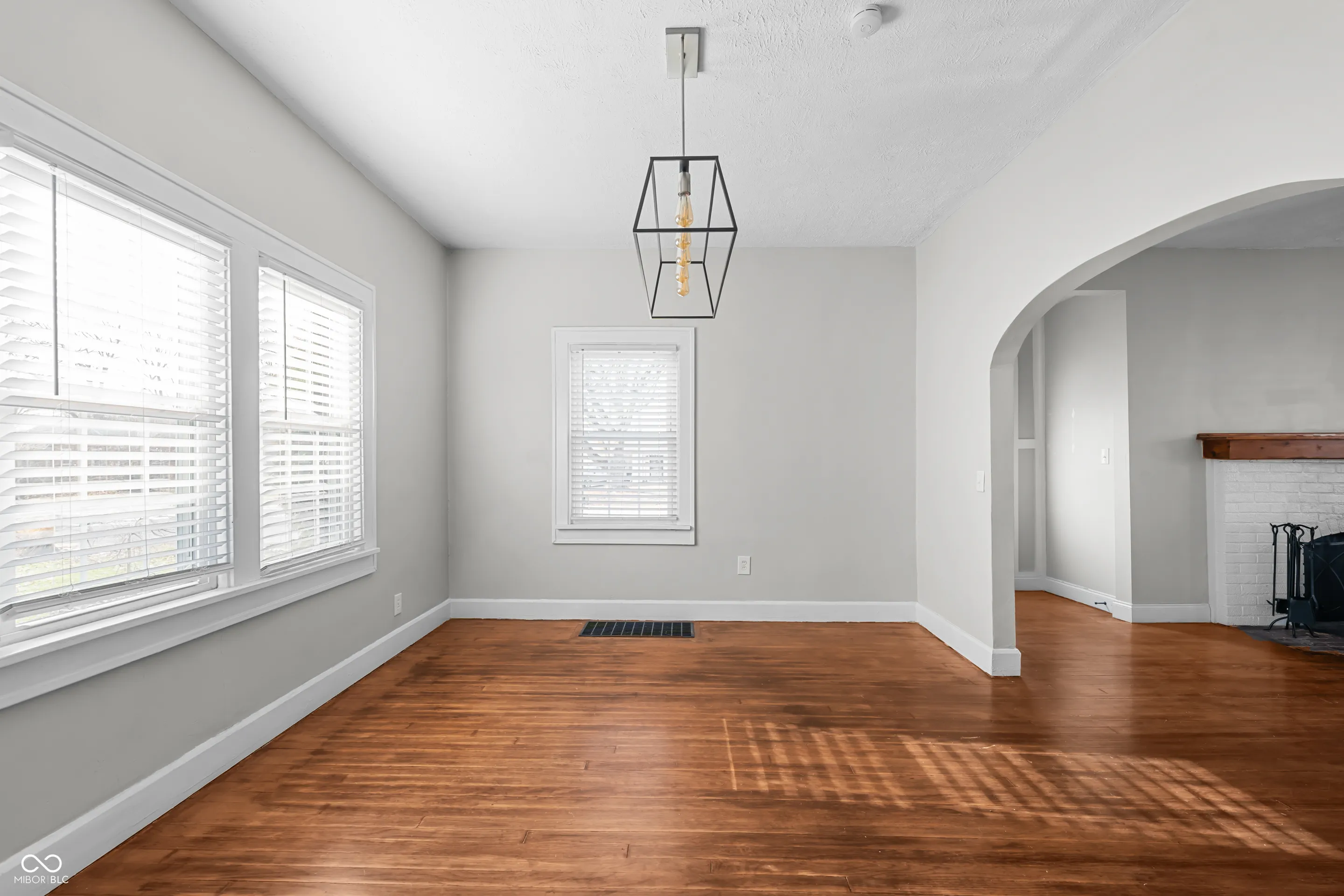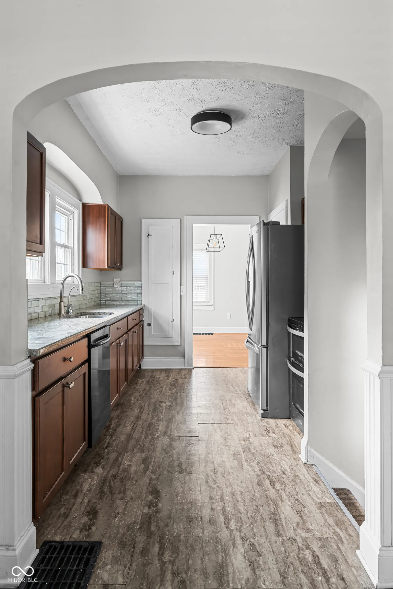 Classic Tudor charm awaits in this inviting home on a quiet street with easy access to I-465 and downtown Indianapolis. This house has original charm mixed with updated finishes throughout- flooring, lights, fans, outlets, door hardware, security system. The spacious living room features a wood-burning fireplace, abundant natural light from newer thermal windows, 10-foot ceilings, and hardwood floors. A flex room connects seamlessly to the kitchen and living area, making it ideal for a dining room or office space. The galley kitchen offers granite countertops, tile backsplash and newer appliances. Off the kitchen is a cute nook that would be perfect for a breakfast, reading, or wine nook. Main floor primary suite and two bedrooms upstairs. Enjoy the two remodeled bathrooms. Full basement that can be finished if you choose has a workshop or office space. Outside, relax in the private, fenced yard with a paver patio. A two-car garage completes the whole property. Newer hot water heater and water softener. Washer and dryer included.