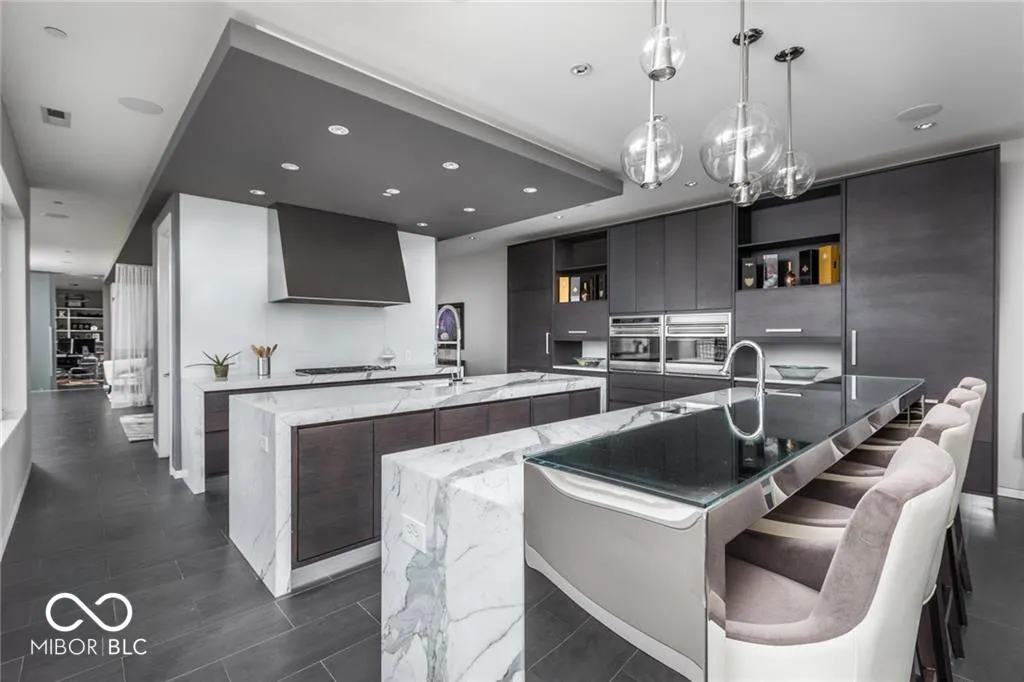 Experience the pinnacle of Modern Elegance with this luxury 3 Bedroom/3.5 Bath Penthouse Condo in the Heart of Mass Ave! Featuring extraordinary 180 degree views of the Downtown Indy Skyline from it’s 1300 sq ft terrace. This rare residence offers floor to ceiling windows of doors that flood the space with natural light, connecting indoor & outdoor living. Discover over 4,300 sq ft of artfully designed luxury living with 3 Bedrooms and 3.5 Baths. Crafted with exquisite detailing throughout. Spacious Chef’s Kitchen features twin marble islands, meticulously designed cabinetry, high end Wolf, Miele & Sub Zero Appliances, twin dishwashers & even an Nespresso machine, all alongside a spacious Butler’s Pantry. State of the Art amenities include media room with Epsm projector & Stewart drop down screen. Spacious Great Room, Dining Area & Media Room with unparallel views of the skyline. Primary Suite offers an intimate retreat with private balcony, spa inspired walk-in shower & water cube area & designer dressing areas with luxury built-ins. Secondary bedrooms and baths continue the theme of luxury & sophistication. Convenience is abundant with private access to the rooftop gardens & patio, 4 parking spots in the garage and 3 storage areas. Just steps to the shopping, restaurants and events along Mass Ave!