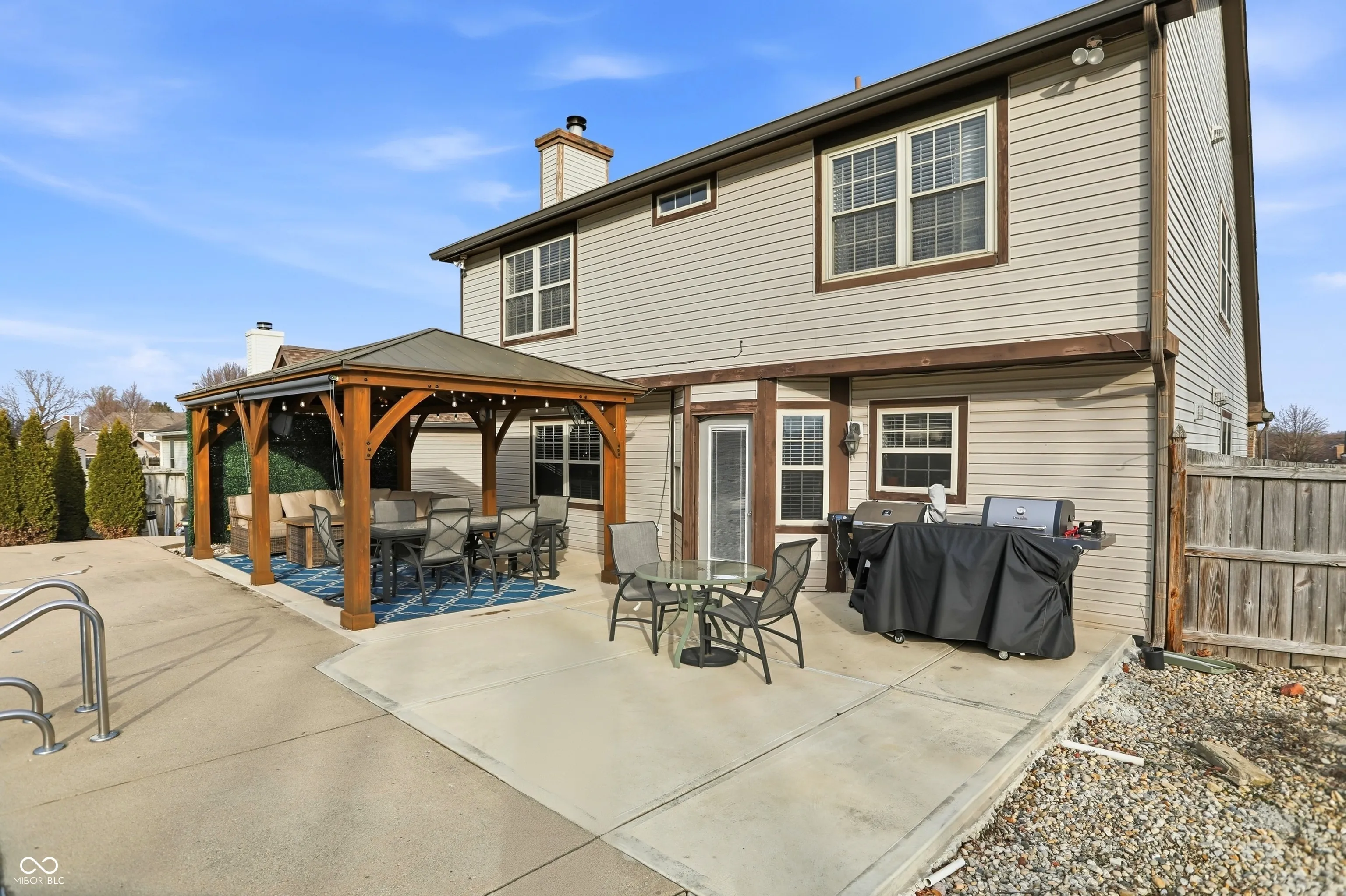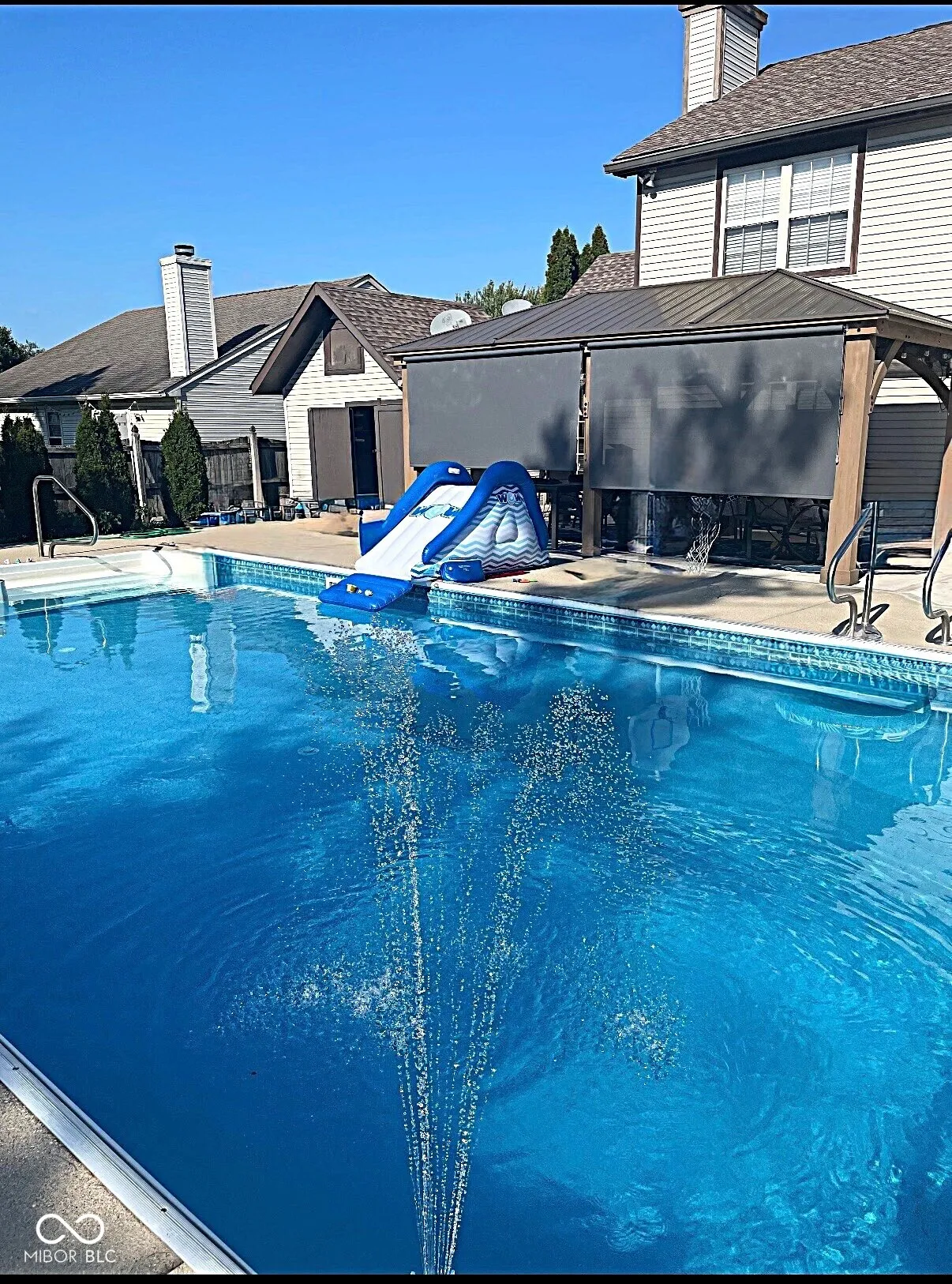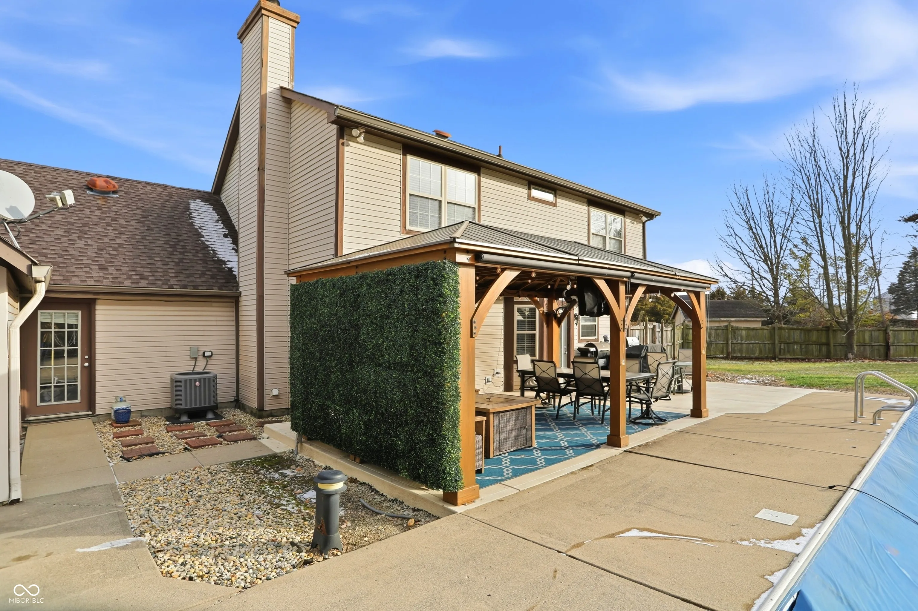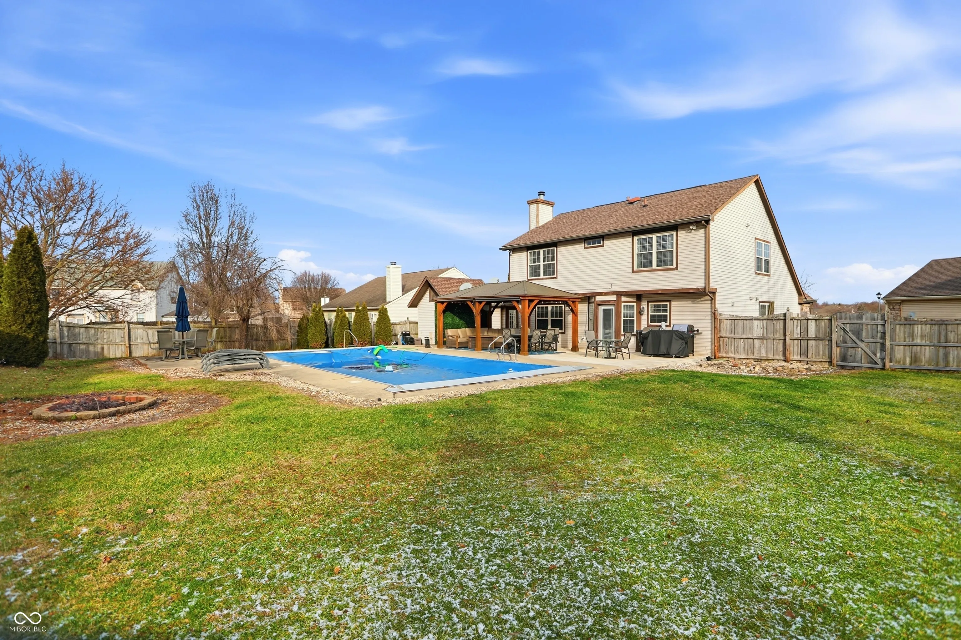 Welcome to this beautifully updated three-bedroom, two-and-a-half-bath home with an in-ground pool, ideally located in the heart of Greenwood. Thoughtfully refreshed inside and out, this home offers a perfect blend of comfort, style, and functionality. Upon entry, you are welcomed by soaring vaulted ceilings and a light-filled living room that seamlessly flows into the dining area, creating an inviting space for everyday living and entertaining. The well-appointed kitchen showcases ceramic tile flooring, granite countertops, stainless steel appliances, a center island, and a breakfast bar, and opens directly to the warm and welcoming family room, complete with a gas fireplace for cozy winter evenings. Upstairs, the spacious primary suite provides a true retreat, featuring a spa-inspired bathroom with a double vanity topped with granite countertops, a custom tiled walk-in shower, and a beautifully tiled soaking tub. Over the past two to five years, numerous updates have been completed, including new luxury vinyl plank flooring throughout the upper level, a new water heater and AC unit, updated toilets, lighting, faucets, and fresh paint in many interior spaces. The only carpet in the home is on the stairs, replaced in 2022. Outdoor living is equally impressive, with recent enhancements such as a large concrete patio, gazebo, pool cover, pool pump, and pool heater. The backyard offers a private oasis with an 18×36 in-ground pool, expansive patio, new gazebo, fire pit, storage shed, and a six-foot privacy fence-ideal for relaxing or entertaining. This exceptional home is truly move-in ready and not to be missed.