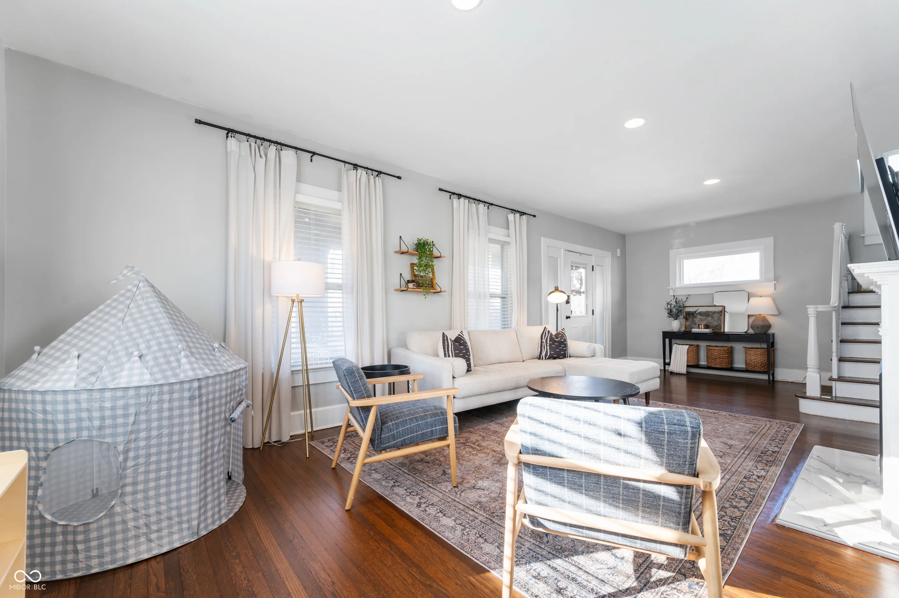 Stylishly updated and move-in ready 3-bedroom/2.5-bath home w/basement located in the heart of Meridian Kessler! All-new interior paint, beautifully detailed trim, and stunning refinished hardwood floors throughout. A warm and inviting entry opens into a spacious front living room, anchored by a newly refinished fireplace with an electric fireplace insert. The open floor plan flows seamlessly into a generous dining room with updated lighting and French doors that lead to the back deck. The remodeled kitchen features a gas range, stainless steel appliances (brand-new dishwasher!), solid surface countertops, and an eat-in breakfast nook with custom built-in bench seating. A stylish half bath completes the main level. Upstairs, you’ll find three bedrooms and two full bathrooms. All bedrooms include ceiling fans and the primary suite boasts two closets. One full bath offers a walk-in shower with tile flooring and vanity, while the second features a tub/shower combo with beadboard accent walls. The additional bedrooms are generously sized and move-in ready with neutral, calming tones. A large basement adds valuable living space, ideal for a rec/play/exercise room along with a dedicated laundry area and storage. Outside, the fully fenced backyard offers privacy and room to run and play. The oversized 24×23 garage-accessed from the alley-comfortably fits two SUVs and includes space for a workshop. Enjoy multiple outdoor living areas including the back deck, patio, and a spacious covered front porch. Additional highlights include a new water heater, reverse osmosis system, water softener, alarm system, and carbon monoxide detectors. Located just minutes from Newfields, the Children’s Museum, and within walking distance of Blue Mind Coffee, the public library, and Saint Joan of Arc School. The unfinished attic offers 784 sf of potential and could be finished to create a third-floor bonus room. This home blends classic charm, modern updates, and an unbeatable location!