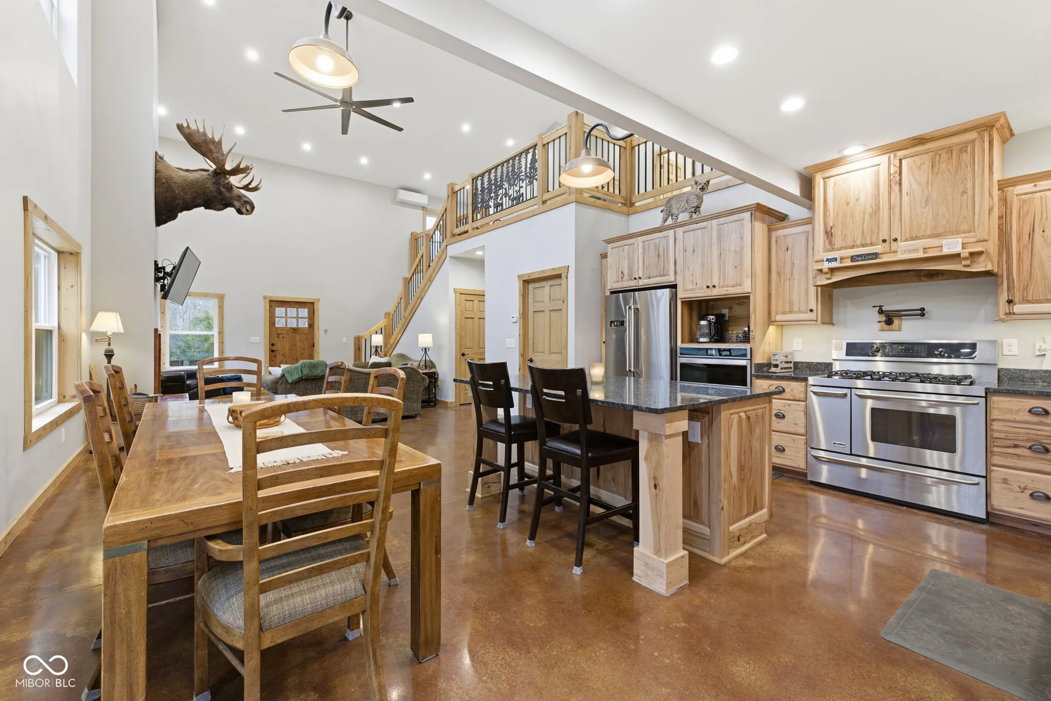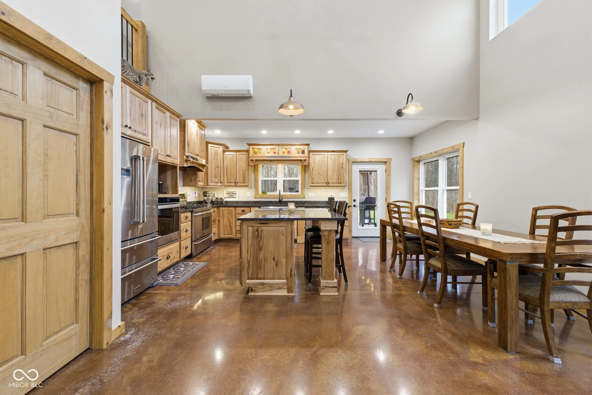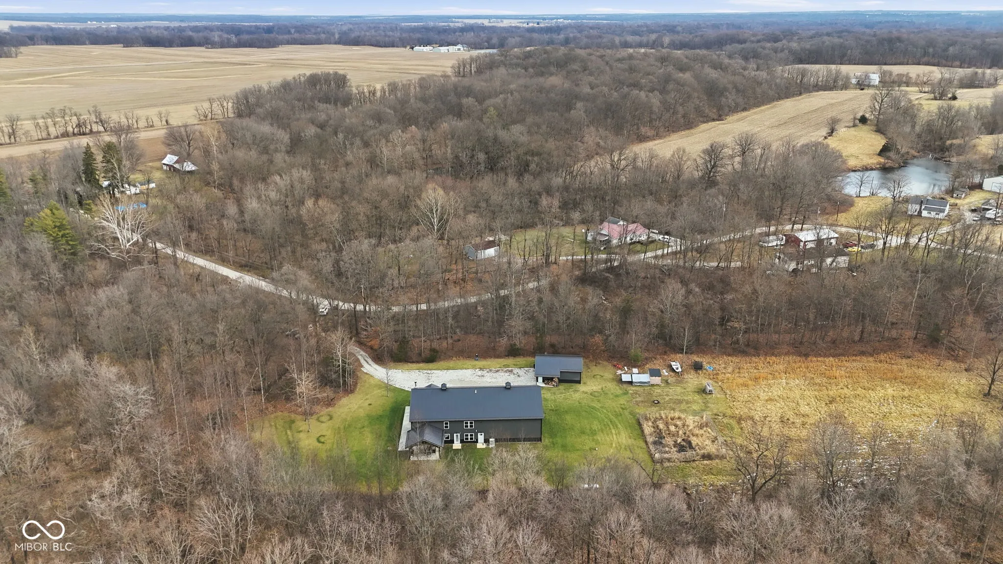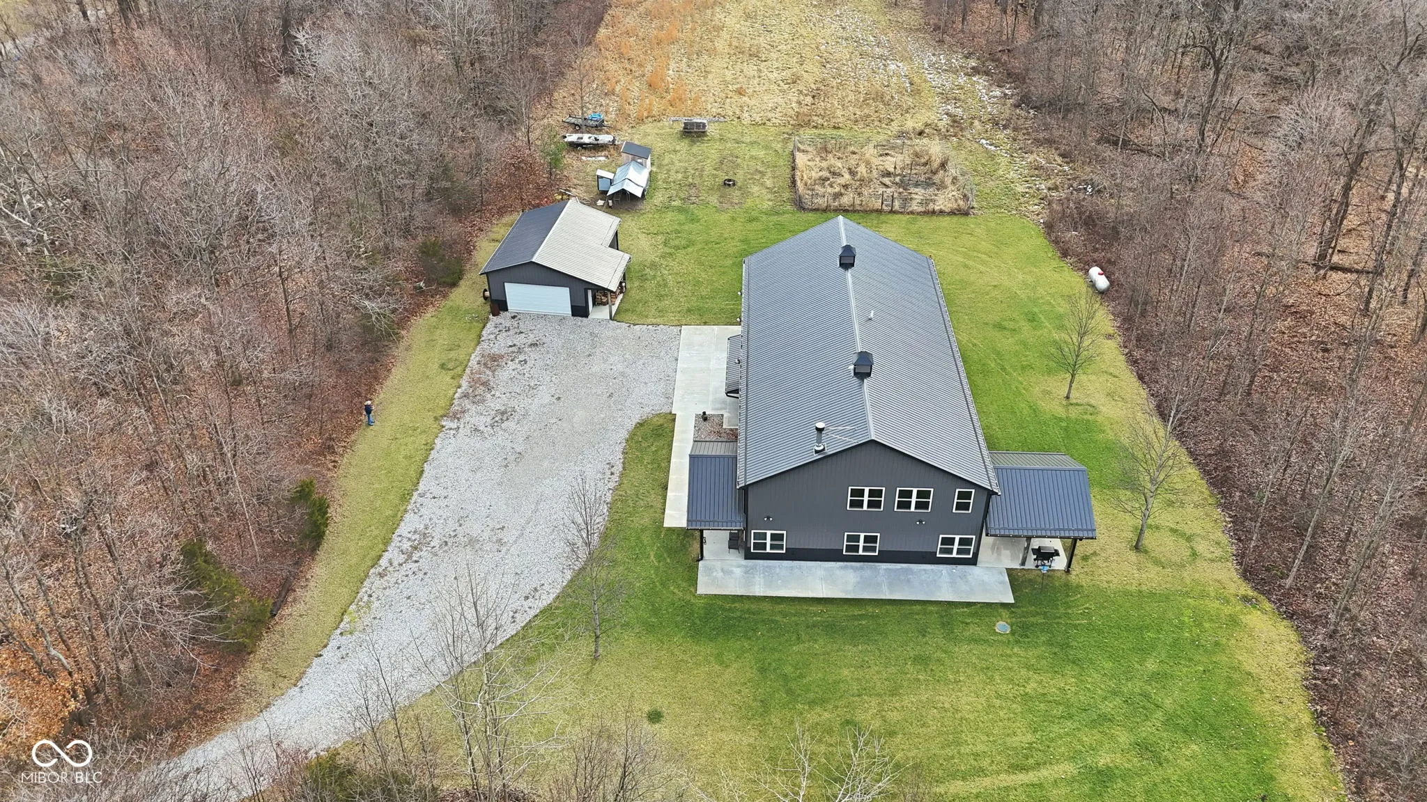 Tucked away at the end of a long private drive, this stunning 2023 barndominium welcomes you with a perfect blend of countryside charm and modern design. From the moment you arrive, the craftsmanship and attention to detail are impossible to miss. Inside, the home opens to a breathtaking two-story great room featuring soaring ceilings, rich wood accents, and an abundance of natural light. Heated polished concrete floors run throughout the main level, adding both style and comfort. The kitchen is thoughtfully designed with custom Amish-built cabinetry, offering distinctive character along with everyday functionality. Upstairs, a spacious loft overlooks the main living area and provides a unique perspective of the home’s open layout and cozy wood-burning fireplace. With five generously sized bedrooms-including two conveniently located on the main floor-this home offers flexibility for families, guests, or work-from-home needs. Car enthusiasts and hobbyists will appreciate the impressive 1,600 sq. ft. attached garage, large enough to store a camper, boat, or multiple vehicles, complete with an upper-level loft for additional storage or a private retreat. A separate detached two-car garage adds even more space for equipment, tools, or recreational use. Set on 7.29 acres, the property offers privacy, scenic views, and frequent wildlife sightings, making it ideal for those who enjoy the outdoors or are looking to create their own hunting or recreational space. Designed for both comfort and versatility, this one-of-a-kind property offers the space, features, and setting to truly make it your own.