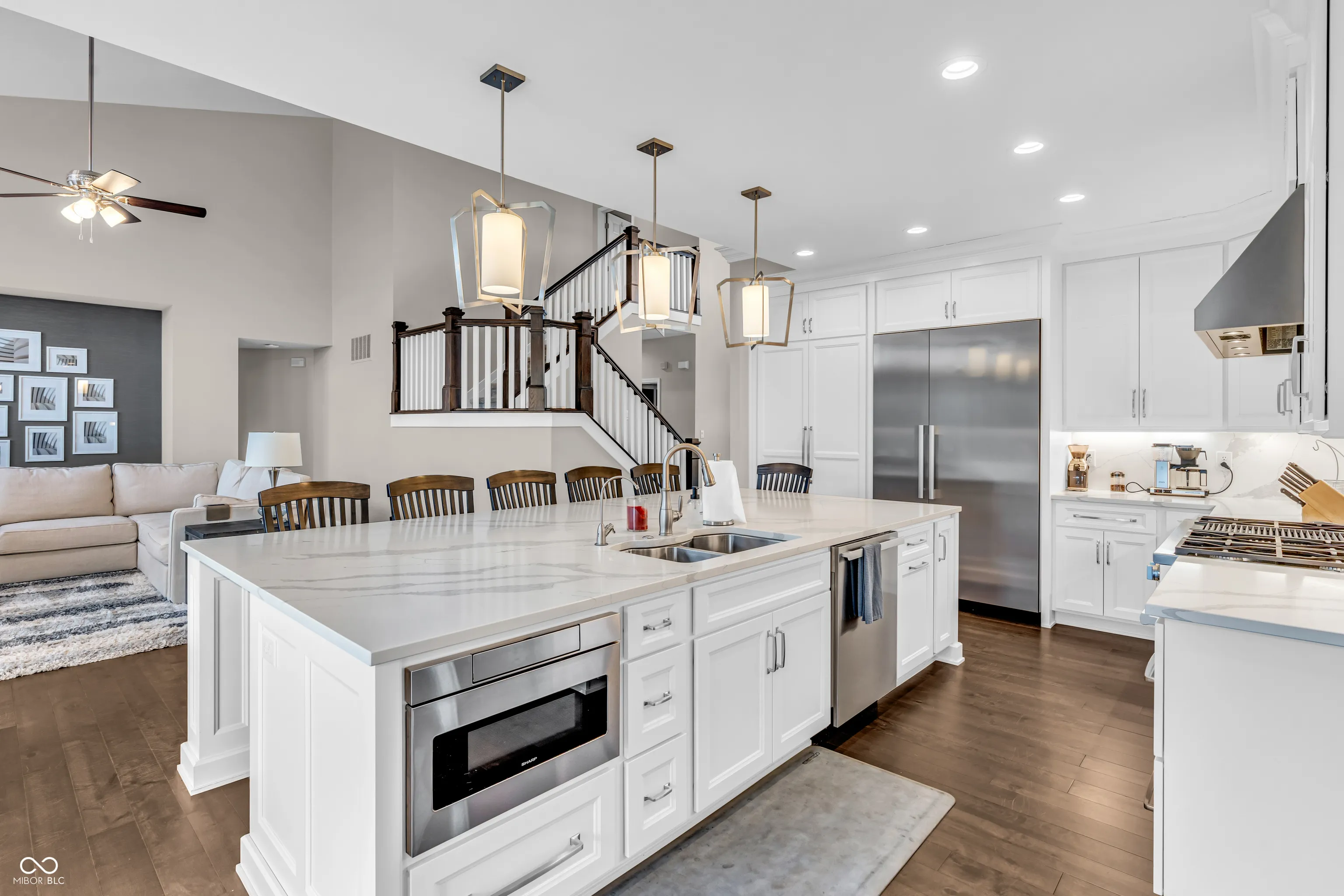 This stunning 4,360sqft 4 Bed, 3.5 bath home is perfectly situated on a 1/3+ acre corner lot, just 5 min from Center Grove HS & MS and features many upgrades & updates! Step inside to a dramatic two-story foyer and great room, accented by hardwood floors & a gas fireplace surrounded by many windows that let in plenty of sunlight. The chef-inspired kitchen features quartz countertops, brushed nickel pendant lighting, an expansive island with abundant storage, pantry, & top-of-the-line stainless steel Miele appliances – including a large refrigerator, double oven & six-burner gas range with grill & pot-filler. Just off the kitchen, the inviting hearth room offers built-in shelving, another gas fireplace, & serves as the perfect dining and gathering space. The main-level primary suite is a retreat with vaulted ceilings and a spa-like ensuite bath boasting dual vanities, a tiled walk-in shower with rain showerhead, and a walk-in closet with custom shelving. Also on the main floor is a beautiful home office/den/library with custom built-in cabinetry, shelving, & lighting. The oversized laundry room features a built-in drop zone, quartz countertops, laundry storage, large ceramic utility sink, & washer and dryer are included. Upstairs, you’ll find three spacious bedrooms, a full bath, & access to a large attic storage space above the garage. The finished basement expands the living space with a dedicated gym area (which could be used as a 5th bedroom), a full bathroom, recreation/family room (pool table included), & a full kitchenette equipped with refrigerator, dishwasher, and microwave. Additional upgrades include a tankless water heater, whole-house water filtration system, water softener, Guardian security system, & Ring cameras. Outside, enjoy a fully fenced backyard with a large private paver patio, hot tub, & gas hookup for the included grill plus note the wrap around covered front porch. A three-car garage completes this exceptional property. Welcome Home!