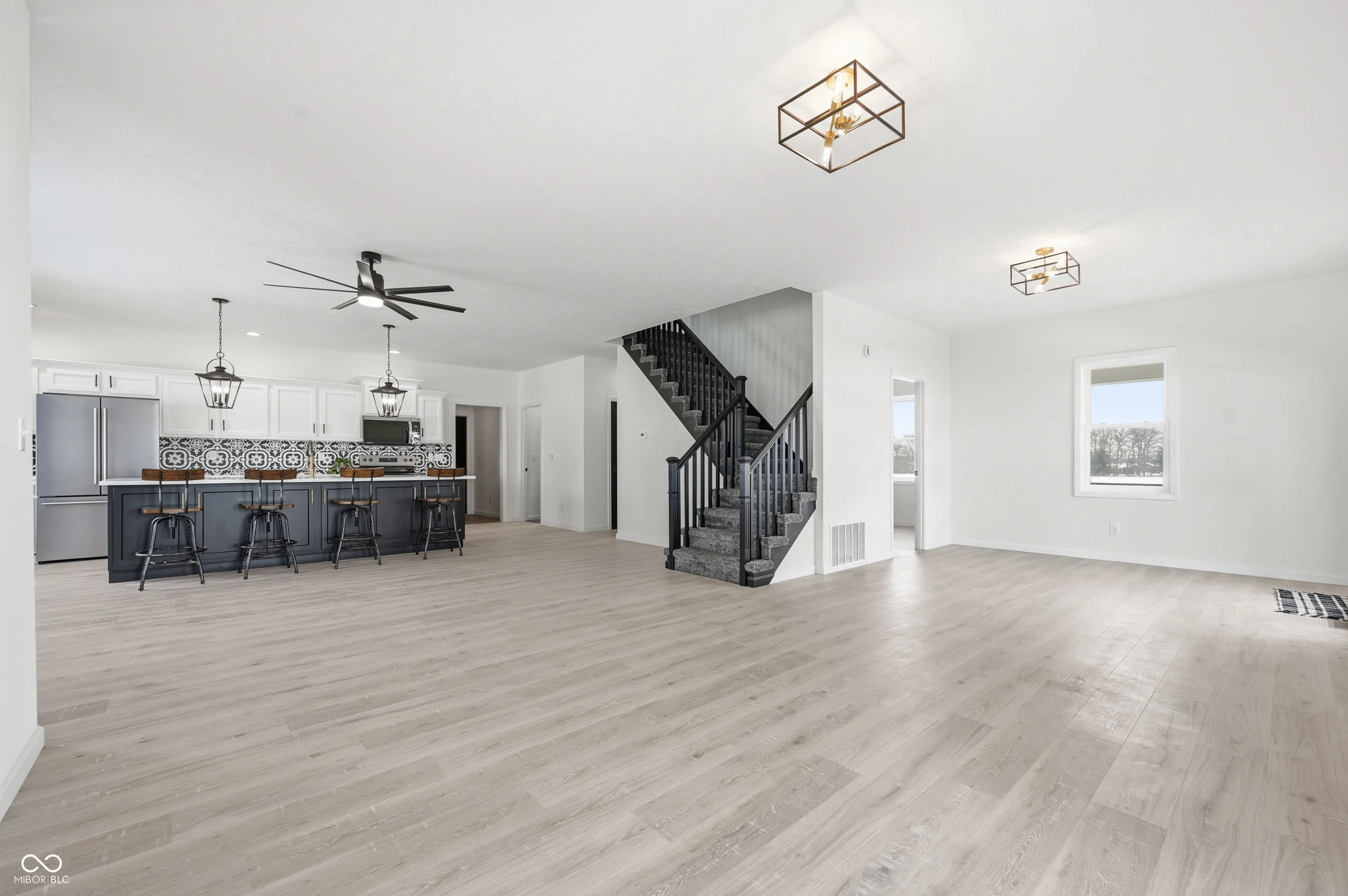 This completely remodeled home sits on 1.13 acres and features an open floor plan. The large eat-in kitchen includes a spacious work island and breakfast bar. The main level offers a family room, den, and mudroom, while the master suite features a private bath with a soaking tub, ceramic tile flooring, a stand-up shower, a double vanity, and a walk-in closet. Upstairs, you will find three additional bedrooms, each with a large closet, and a full bathroom. Outside, the property includes a front porch and a pole bar, surrounded by a farm field. Nearly every component of this home is brand new, including the metal roof, vinyl siding, windows, subflooring, studs, plumbing, electrical, well pump, and two high-efficiency furnaces and central air units. Interior updates include all new flooring, kitchen and bathroom cabinets, faucets, light fixtures, and doors. This property is a must-see.