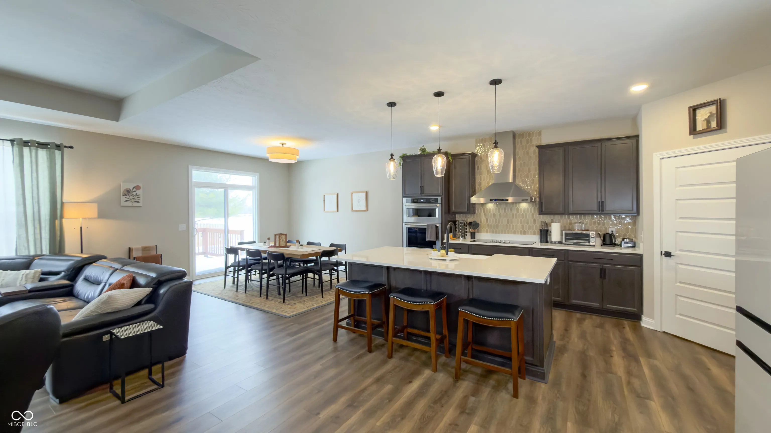 Welcome to this beautifully crafted custom ranch in Fortville, built in 2023 by Davis Homes and still under the builder’s warranty-no wait required. This thoughtfully designed home offers the convenience of main-level living with the added flex space of a partially finished basement. Step into a spacious foyer with a raised ceiling that opens seamlessly into the great room, where a cozy wood-burning fireplace and large windows fill the space with natural light. The open-concept layout flows into the expansive kitchen and dining area, perfect for everyday living and entertaining. The kitchen features quartz countertops, a stylish new backsplash, white apron sink, soft-close cabinetry, built-in oven and microwave, electric cooktop with vent fan, smart refrigerator, and a generous walk-in pantry. Just off the main living area, you’ll find a brand-new half bath and a functional mudroom leading to the oversized three-car garage, extended by two feet and equipped with a car charging outlet. The private primary suite is located on one side of the home and includes a large tiled shower, linen closet, and walk-in closet with direct access to the laundry room for added convenience. A separate hallway houses a dedicated office with French doors, two additional bedrooms, and a full bathroom with double sinks. The partially finished basement offers incredible flexibility, featuring a large family room or potential fourth bedroom with an egress window, a third full bathroom, and an unfinished area ideal for a home gym, workshop, or theater room. Plumbing access is already in place for a future kitchenette, making this space perfect for extended family living. Out back, enjoy peaceful evenings on the extended 20×10 deck, surrounded by quiet and privacy. Important documents, including the survey and building layouts, are available in the attachments. This is truly a must-see home-move-in ready, modern, and thoughtfully designed. Make it yours today!