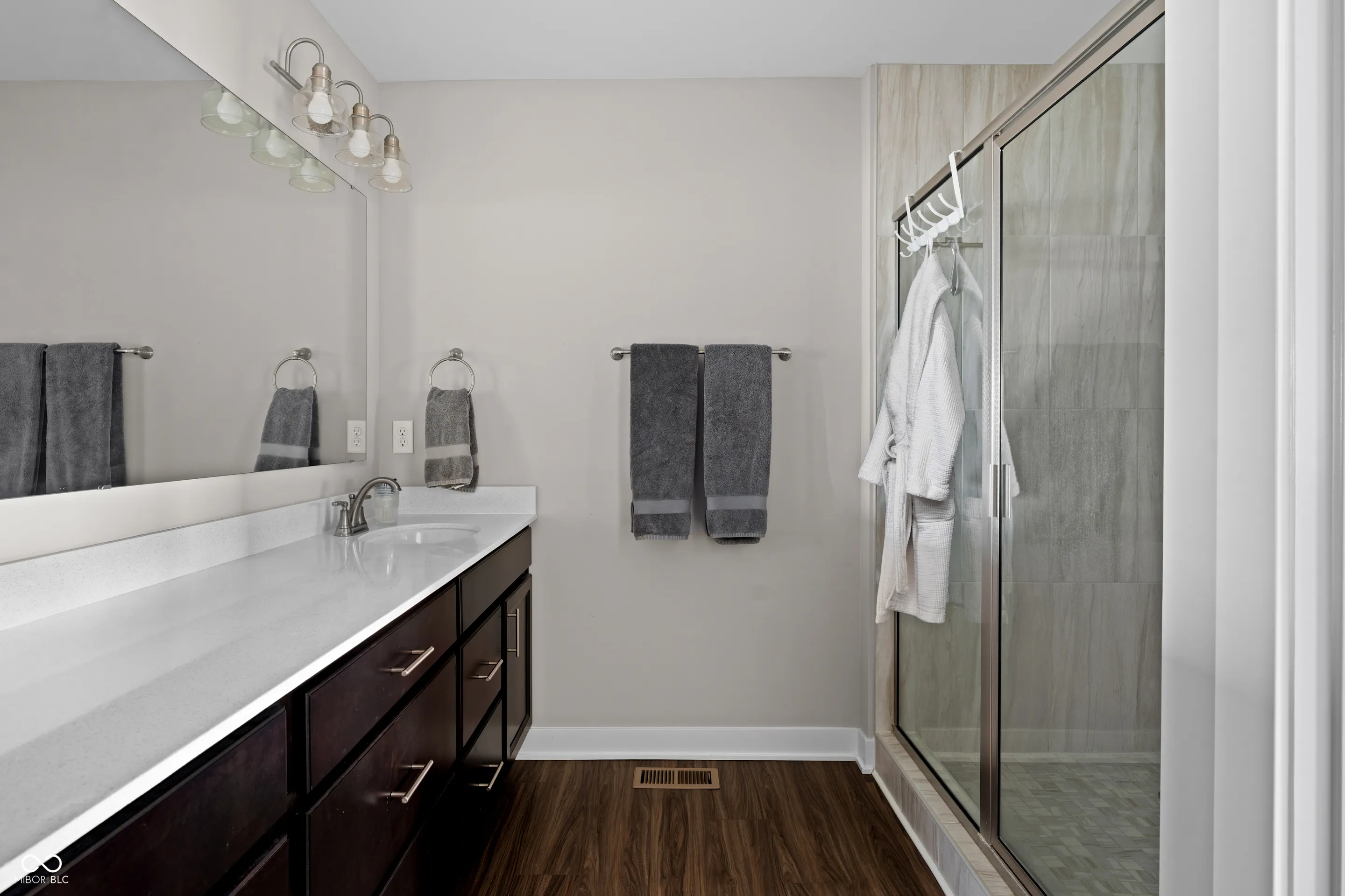 This beautiful home is better than new, featuring new refrigerator, washer, dryer, water softener, reverse osmosis system, TV mount and wall sconces framing the fireplace, built-in shelving in the laundry and dining rooms, and a durable epoxy garage floor – thoughtful additions that save you time and money! The main level offers an open, functional layout with a flexible front room for living, dining, or office space. The kitchen features a large center island, granite countertops, stainless steel appliances, oak cabinetry, and pantry, opening to a spacious living room with a walk-out balcony. Upstairs, two primary suites each offer a private en-suite bath and walk-in closet, providing flexibility for guests, family, or shared living arrangements. The lower level adds a large recreation room and access to the attached two-car garage. Low-maintenance living at its finest, located within walking distance to schools and the new McCordsville downtown area, McCord Square. Easy access to highways, shopping, dining, parks and award-winning schools.